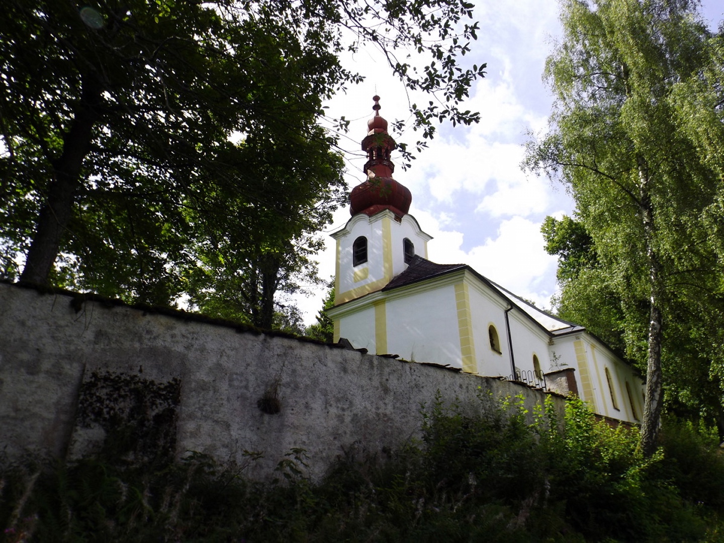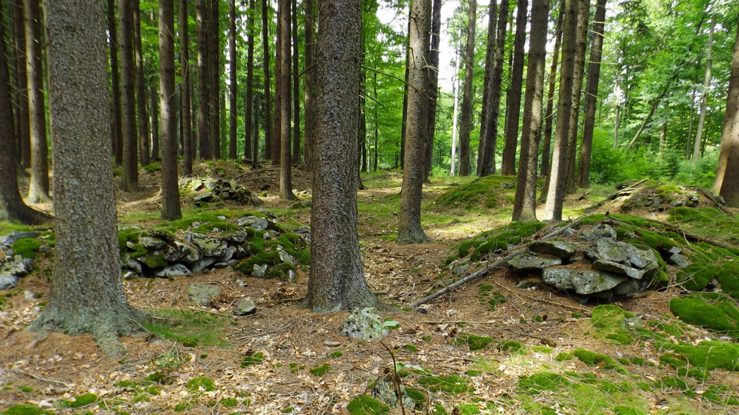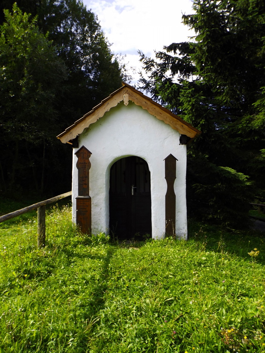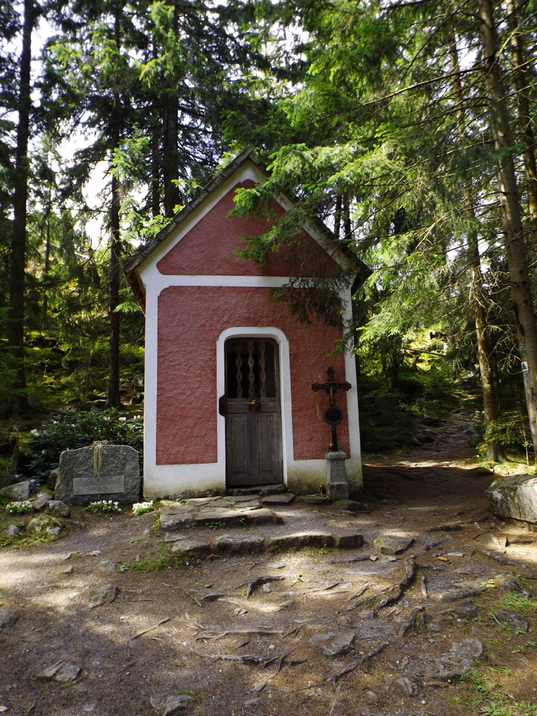 Auf der dem Parkplatz gegenüberliegenden Straßenseite führt eine Forststraße an einem Ziegengehege vorbei nach Westen, die später noch eine Rolle spielen sollte. Der von mir geplante Weg nach Karlov ist natürlich auch angeschrieben, er führt fast rechtwinklig dazu über die angrenzende Wiese und an ihrem Ende in den Wald hinein. Dort geht es gleich einmal richtig bergab und an einer Abzweigung rechts weiter. Das alles ist wie im Šumava gewohnt hervorragend markiert, in diesem Fall in weiß-gelb-weiß. Ab dieser Abzweigung wurde es etwas unangenehm, weil extrem matschig. Da waren wohl in den vergangenen Tagen die Harvester richtig aktiv. Glücklicherweise konnte ich meistens am Wegrand auf dem sauberen Waldboden gehen, so dass ich mein Vorhaben, mit sauberer Hose einzukehren, halbwegs umsetzen konnte. Nach 20 Minuten war der alte Gutshof Karlov erreicht und die Baustelle dort sorgte für einige Verwirrung bei mir. Denn ich übersah die Markierungen für den richtigen Weiterweg und folgte stattdessen der Zufahrtsstraße und landete eine halbe Stunde und diverses Auf und Ab später bei der Kreuzung mit Kapelle Hamižná. Da ich sowieso das Naturschutzgebiet gleichen Namens auf dem Themenpfad durchqueren wollte, war das nicht allzu tragisch, insbesondere weil dieser Themenpfad nicht erst am Punkt Peklo zur Schleife abzweigt, sondern bereits auf halbem Weg dorthin mitten im Wald. Ich ging jedoch hinunter nach Peklo, stellte fest, dass es sich hier um den tiefsten Punkt der Runde handelte und machte mich fröhlich auf den Weg hinauf nach Hartmanice. Dieser Abschnitt verläuft wieder auf einer Fahrstraße, bietet aber als Entschädigung dafür wunderbare Blicke hinaus Richtung Svatobor und Petrovice. In Hartmanice hätte ich noch reife Johannisbeeren ernten können, wenn der Streifen zwischen Straße und Gartenzaun nicht so zugewuchert wäre. Aber sie sahen zumindest lecker aus. Am Dorfplatz bog ich rechts ab und stieg am Cafe 27 vorbei wieder hinauf nach Hamižná, wo ich jetzt links dem zweiten Teil des Themenpfades auf den Hügel gleichen Namens folgte. Hier steht noch ein Skilift, ob er im Winter auch in Betrieb ist, weiß ich nicht, jedenfalls ist die Piste aus dem Naturschutzgebiet herausgelöst. Von hier ist Sušice gut erkennbar, während Hrad Kašperk und der Kamm zum Javorník von ein paar Baumreihen am rechten Pistenrand verdeckt werden. Der Gipfelfelsen ist dank Gestrüppkampfklasse 4 nicht wirklich zugänglich, deswegen verzichtete ich trotz langer Hose auf einen Versuch in seine Richtung und begnügte mich damit, das Lifthäuserl einmal zu umrunden und wieder zum Lehrpfad zurückzukehren. Dieser umrundet anschließend den Berg fast komplett und mündet kurz vor der mittlerweile hinlänglich bekannten Kreuzung in den blau markierten Wanderweg nach Dobra Vodá. Dieser führt in leichter Steigung über den Sattel zwischen Hamižná und Jakubice, bevor er rechts abknickt und an einem Wanderparkplatz kurz vor Dobra Vodá herauskommt. Von diesem aus kann man die Umrundung des Křemelná starten, es gibt aber auch eine deutlich erkennbare Fortsetzung geradeaus, auf der ich innerhalb von zehn Minuten die kleine, aber hochinteressante Siedlung Dobrá Voda erreichte. Sie war nicht nur zwischen 1949 und 1990 Namensgeberin des Militärgeländes, sondern beherbergt neben einer nicht ganz unbedeutenden Kirche und einer Herberge auch ein Museum. Neben der Kirche plätschert in einem Brunnen die Guntherquelle vor sich hin, dazwischen windet sich ein kleiner Pfad den Hang hinauf. Ihm folgte ich 700 Meter durch den Wald bis zum Abzweig Pustina, wo ich rechts abbog und mich bereits an den Schildern nach Rovina orientieren konnte. Dazwischen liegt allerdings noch der Abzweig Březník, von dem aus es ein halber Kilometer zur Guntherkapelle und dem Guntherfelsen, wie der Gipfel des Březník auch genannt wird. Der Aufsteig zum Felsen ist eine mit Holzgeländer gesicherte, in den Stein geschlagene Treppe, die bei Nässe etwas unangenehm sein kann. Oben angekommen, zeigte sich, dass der Felsen zwei „Gipfelchen“ hat, von denen der südliche ein paar Zentimeter höher ist, der nördliche aber von Westen her besser gesehen wird. Deshalb wurde das Gipfelkreuz irgendwann vom südlichen auf den nördlichen verlegt. Nach einer kleinen Pause stieg ich wieder hinunter zum Hauptweg und folgte diesem bis zum Ausgangspunkt. An diesem steht das Hotel Rovina mit Restaurace, es war 13 Uhr und ich hatte Hunger, also genoss ich ein Dunkles und eine Portion Hirschbraten, die beide genauso gut schmeckten wie sie aussahen. Jetzt wäre es durchaus nachvollziehbar gewesen, wenn ich mich nach dem Essen ins Auto gesetzt hätte und in die Kerzenwelt nach Bodenmais gefahren wäre, wo ich etwas mitnehmen wollte. Ich war aber der festen Meinung, dass diese an Samstagen bis 17 Uhr geöffnet hat und ich noch zwei Stunden Zeit für einen weiteren Gipfel hätte. Hier kommt der Forstweg vom Anfang des Berichtes ins Spiel, er führt nämlich zum Vysoký hřbet, laut Wegweiser sind es auch nur 2,5 Kilometer. Leider war diese Ecke nicht mehr auf dem ausgedruckten Kartenabschnitt, sonst hätte ich gesehen, dass auf dem Wegweiser nicht der Gipfel gemeint ist, sondern ein etwa 1,5 Kilometer vor dem Gipfel liegender Abzweig. An diesem schlug ich mich links auf eine Forstspur und folgte ihr 600 Meter bis zu einer Lichtung, ab der ein Weiterkommen etwas schwierig war. da ich nicht wusste, wie weit es noch zum höchten Punkt ist, ließ ich es hier gut sein, schoß ein Foto von der möglichen Gipfelregion und kehrte zurück zum Auto. Es war jetzt 15.30 Uhr, also kein Grund zur Hektik, so dass ich gemütlich die Schuhe auszog, die Ausrüstung im Kofferraum verstaute und über Brennes nach Bodenmais fuhr, wo ich um 16.10 Uhr ankam. Das böse Erwachen war, dass die Kerzenwelt samstags um 16 Uhr schließt, ich also nichts mehr bekam und mich über die wenig lohnende Verlängerung der Tour noch richtig ärgern durfte.