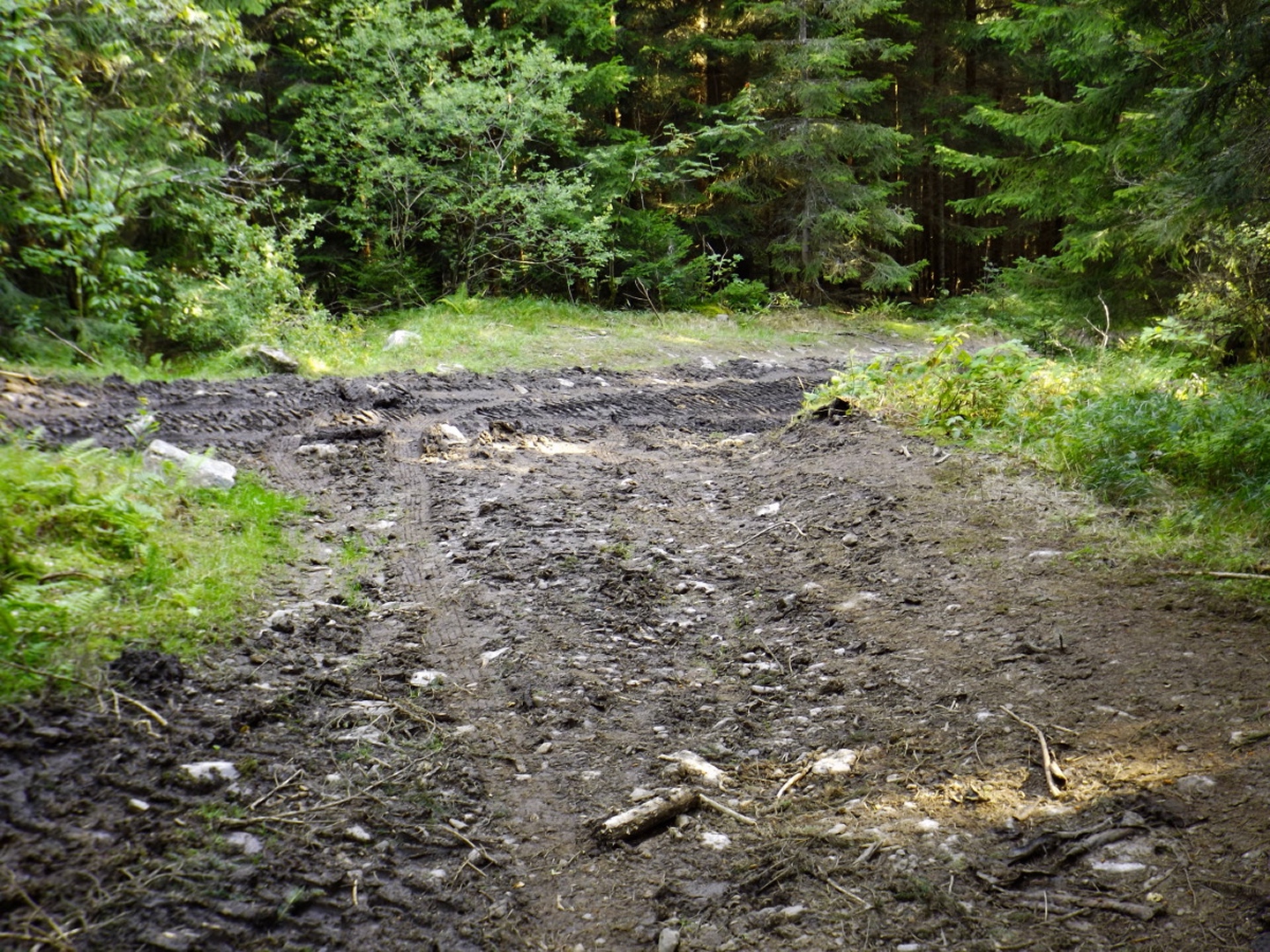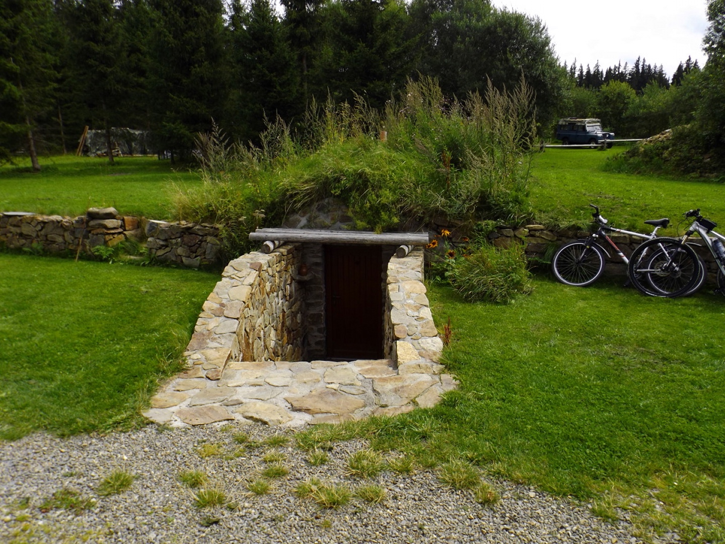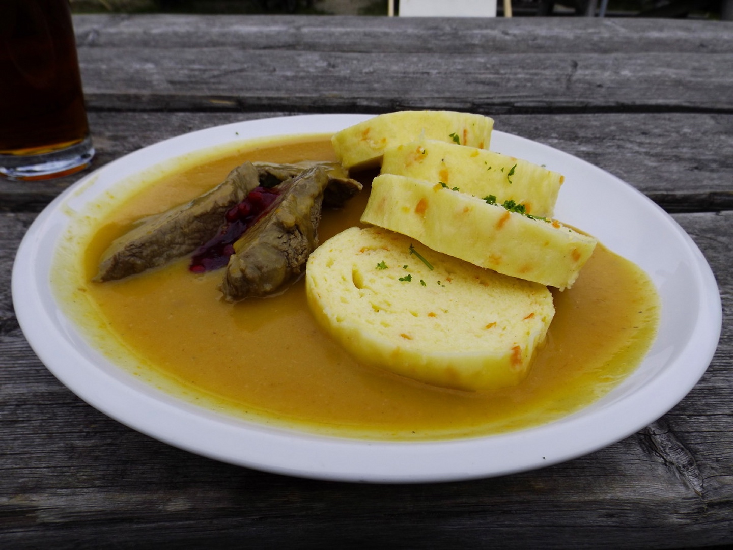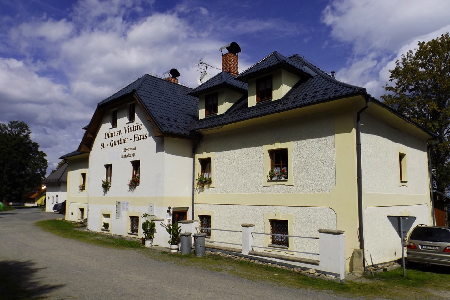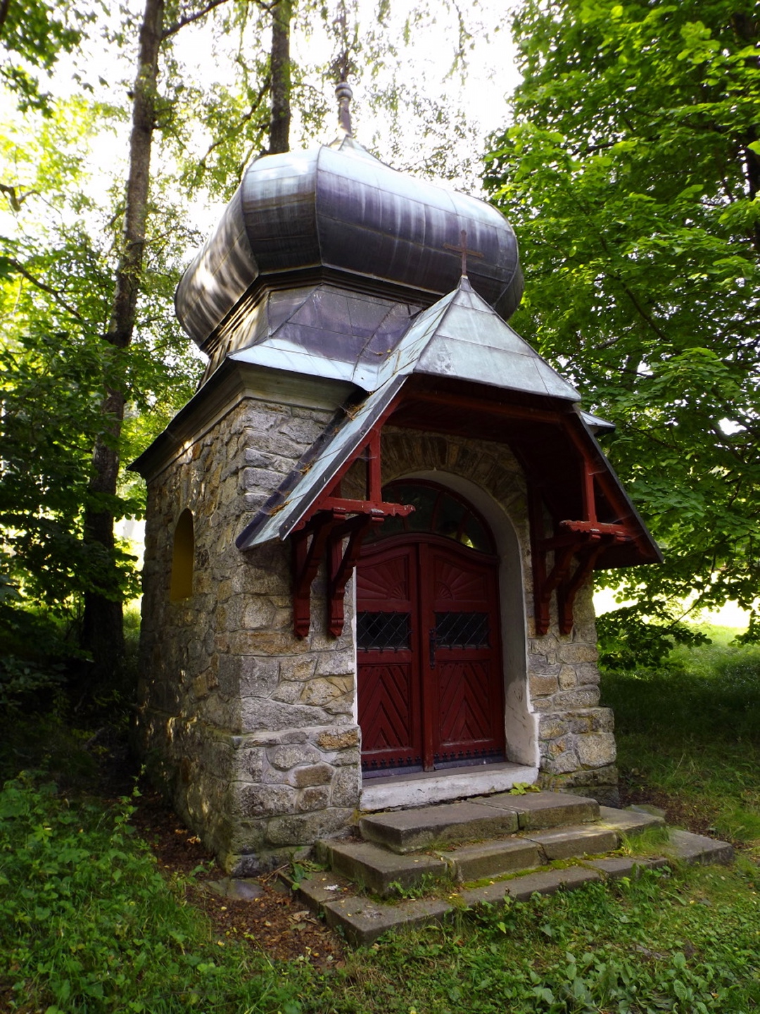 Auf der dem Parkplatz gegenüberliegenden Straßenseite führt eine Forststraße an einem Ziegengehege vorbei nach Westen, die später noch eine Rolle spielen sollte. Der von mir geplante Weg nach Karlov ist natürlich auch angeschrieben, er führt fast rechtwinklig dazu über die angrenzende Wiese und an ihrem Ende in den Wald hinein. Dort geht es gleich einmal richtig bergab und an einer Abzweigung rechts weiter. Das alles ist wie im Šumava gewohnt hervorragend markiert, in diesem Fall in weiß-gelb-weiß. Ab dieser Abzweigung wurde es etwas unangenehm, weil extrem matschig. Da waren wohl in den vergangenen Tagen die Harvester richtig aktiv. Glücklicherweise konnte ich meistens am Wegrand auf dem sauberen Waldboden gehen, so dass ich mein Vorhaben, mit sauberer Hose einzukehren, halbwegs umsetzen konnte. Nach 20 Minuten war der alte Gutshof Karlov erreicht und die Baustelle dort sorgte für einige Verwirrung bei mir. Denn ich übersah die Markierungen für den richtigen Weiterweg und folgte stattdessen der Zufahrtsstraße und landete eine halbe Stunde und diverses Auf und Ab später bei der Kreuzung mit Kapelle Hamižná. Da ich sowieso das Naturschutzgebiet gleichen Namens auf dem Themenpfad durchqueren wollte, war das nicht allzu tragisch, insbesondere weil dieser Themenpfad nicht erst am Punkt Peklo zur Schleife abzweigt, sondern bereits auf halbem Weg dorthin mitten im Wald. Ich ging jedoch hinunter nach Peklo, stellte fest, dass es sich hier um den tiefsten Punkt der Runde handelte und machte mich fröhlich auf den Weg hinauf nach Hartmanice. Dieser Abschnitt verläuft wieder auf einer Fahrstraße, bietet aber als Entschädigung dafür wunderbare Blicke hinaus Richtung Svatobor und Petrovice. In Hartmanice hätte ich noch reife Johannisbeeren ernten können, wenn der Streifen zwischen Straße und Gartenzaun nicht so zugewuchert wäre. Aber sie sahen zumindest lecker aus. Am Dorfplatz bog ich rechts ab und stieg am Cafe 27 vorbei wieder hinauf nach Hamižná, wo ich jetzt links dem zweiten Teil des Themenpfades auf den Hügel gleichen Namens folgte. Hier steht noch ein Skilift, ob er im Winter auch in Betrieb ist, weiß ich nicht, jedenfalls ist die Piste aus dem Naturschutzgebiet herausgelöst. Von hier ist Sušice gut erkennbar, während Hrad Kašperk und der Kamm zum Javorník von ein paar Baumreihen am rechten Pistenrand verdeckt werden. Der Gipfelfelsen ist dank Gestrüppkampfklasse 4 nicht wirklich zugänglich, deswegen verzichtete ich trotz langer Hose auf einen Versuch in seine Richtung und begnügte mich damit, das Lifthäuserl einmal zu umrunden und wieder zum Lehrpfad zurückzukehren. Dieser umrundet anschließend den Berg fast komplett und mündet kurz vor der mittlerweile hinlänglich bekannten Kreuzung in den blau markierten Wanderweg nach Dobra Vodá. Dieser führt in leichter Steigung über den Sattel zwischen Hamižná und Jakubice, bevor er rechts abknickt und an einem Wanderparkplatz kurz vor Dobra Vodá herauskommt. Von diesem aus kann man die Umrundung des Křemelná starten, es gibt aber auch eine deutlich erkennbare Fortsetzung geradeaus, auf der ich innerhalb von zehn Minuten die kleine, aber hochinteressante Siedlung Dobrá Voda erreichte. Sie war nicht nur zwischen 1949 und 1990 Namensgeberin des Militärgeländes, sondern beherbergt neben einer nicht ganz unbedeutenden Kirche und einer Herberge auch ein Museum. Neben der Kirche plätschert in einem Brunnen die Guntherquelle vor sich hin, dazwischen windet sich ein kleiner Pfad den Hang hinauf. Ihm folgte ich 700 Meter durch den Wald bis zum Abzweig Pustina, wo ich rechts abbog und mich bereits an den Schildern nach Rovina orientieren konnte. Dazwischen liegt allerdings noch der Abzweig Březník, von dem aus es ein halber Kilometer zur Guntherkapelle und dem Guntherfelsen, wie der Gipfel des Březník auch genannt wird. Der Aufsteig zum Felsen ist eine mit Holzgeländer gesicherte, in den Stein geschlagene Treppe, die bei Nässe etwas unangenehm sein kann. Oben angekommen, zeigte sich, dass der Felsen zwei „Gipfelchen“ hat, von denen der südliche ein paar Zentimeter höher ist, der nördliche aber von Westen her besser gesehen wird. Deshalb wurde das Gipfelkreuz irgendwann vom südlichen auf den nördlichen verlegt. Nach einer kleinen Pause stieg ich wieder hinunter zum Hauptweg und folgte diesem bis zum Ausgangspunkt. An diesem steht das Hotel Rovina mit Restaurace, es war 13 Uhr und ich hatte Hunger, also genoss ich ein Dunkles und eine Portion Hirschbraten, die beide genauso gut schmeckten wie sie aussahen. Jetzt wäre es durchaus nachvollziehbar gewesen, wenn ich mich nach dem Essen ins Auto gesetzt hätte und in die Kerzenwelt nach Bodenmais gefahren wäre, wo ich etwas mitnehmen wollte. Ich war aber der festen Meinung, dass diese an Samstagen bis 17 Uhr geöffnet hat und ich noch zwei Stunden Zeit für einen weiteren Gipfel hätte. Hier kommt der Forstweg vom Anfang des Berichtes ins Spiel, er führt nämlich zum Vysoký hřbet, laut Wegweiser sind es auch nur 2,5 Kilometer. Leider war diese Ecke nicht mehr auf dem ausgedruckten Kartenabschnitt, sonst hätte ich gesehen, dass auf dem Wegweiser nicht der Gipfel gemeint ist, sondern ein etwa 1,5 Kilometer vor dem Gipfel liegender Abzweig. An diesem schlug ich mich links auf eine Forstspur und folgte ihr 600 Meter bis zu einer Lichtung, ab der ein Weiterkommen etwas schwierig war. da ich nicht wusste, wie weit es noch zum höchten Punkt ist, ließ ich es hier gut sein, schoß ein Foto von der möglichen Gipfelregion und kehrte zurück zum Auto. Es war jetzt 15.30 Uhr, also kein Grund zur Hektik, so dass ich gemütlich die Schuhe auszog, die Ausrüstung im Kofferraum verstaute und über Brennes nach Bodenmais fuhr, wo ich um 16.10 Uhr ankam. Das böse Erwachen war, dass die Kerzenwelt samstags um 16 Uhr schließt, ich also nichts mehr bekam und mich über die wenig lohnende Verlängerung der Tour noch richtig ärgern durfte.
