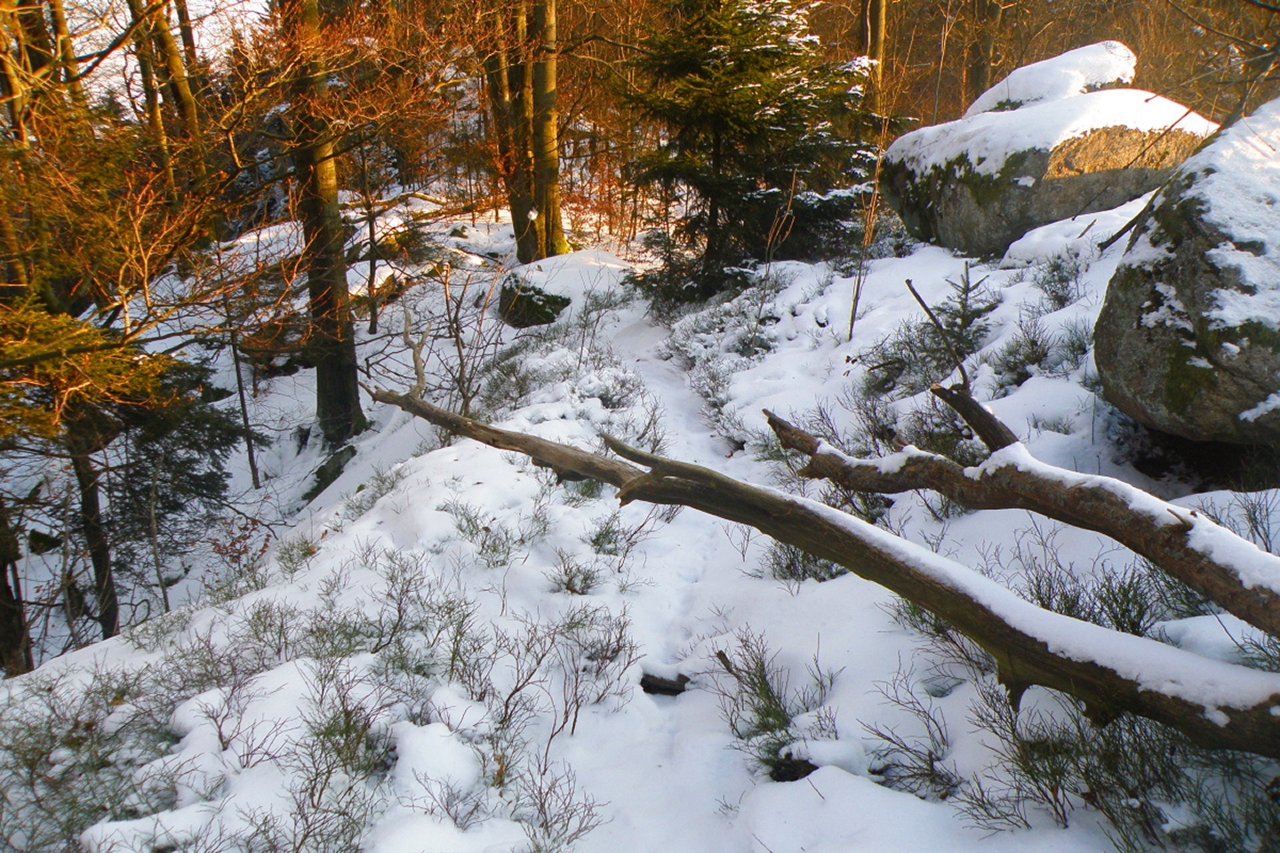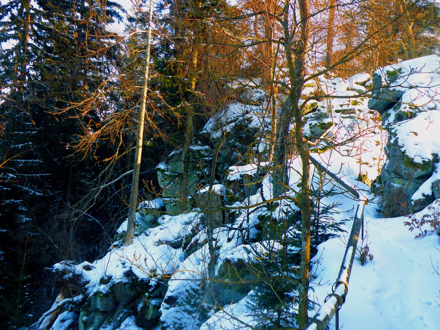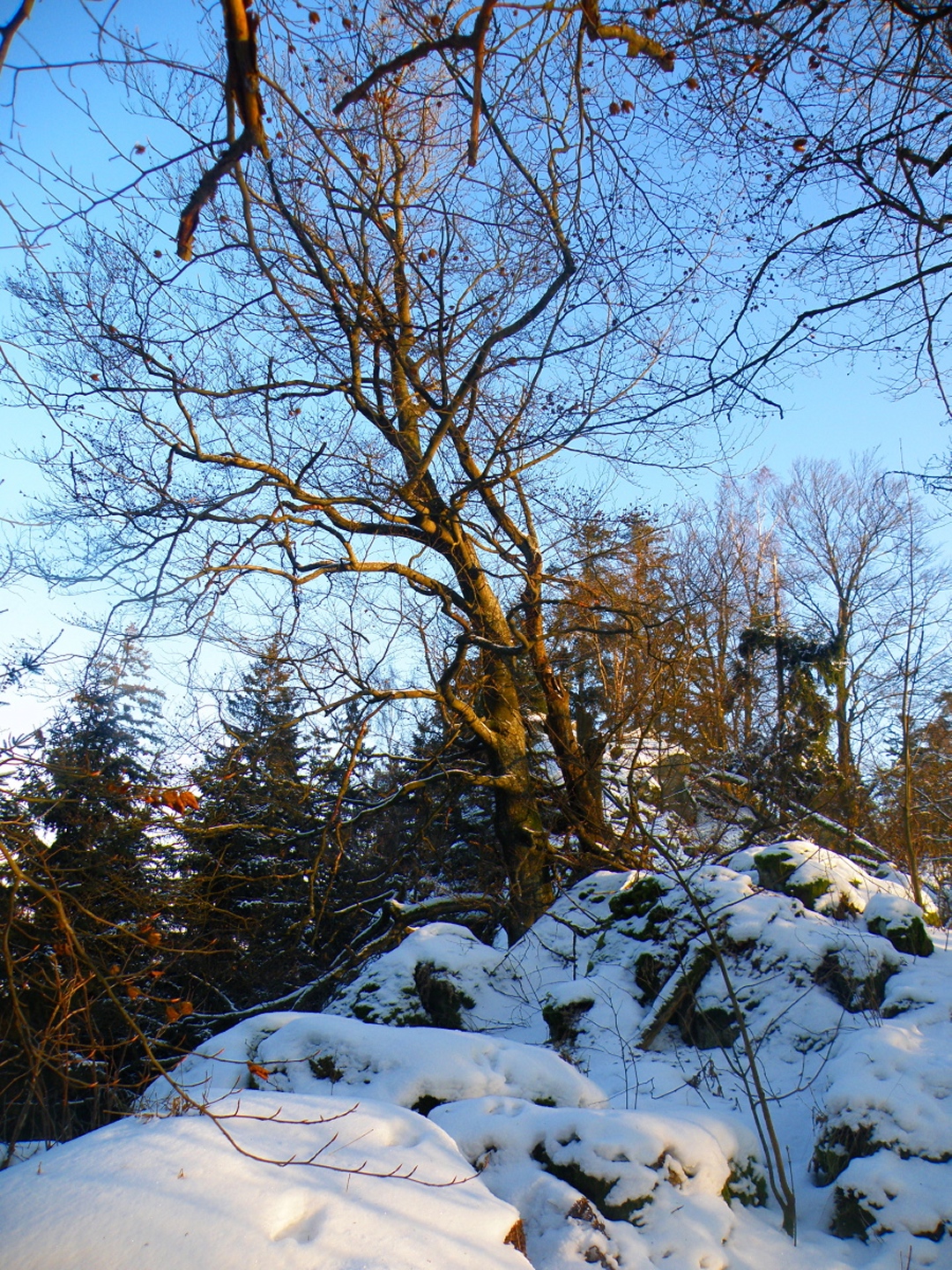 Vom Wanderparkplatz ging es zunächst die Straße am Hotel Bergfried vorbei entlang, bis nach etwa 200 Metern links eine Forstautobahn abbiegt, die die Schwarzwihrbergrunde darstellt. Dieser folgte ich bis zur zweiten Kreuzung bei der Sattelhütte. Dort bog ich zunächst rechts ab, um es zunächst am Eibenstein zu versuchen, jedoch wurde mir bereits nach wenigen Metern klar, dass es zu mühsam und zeitraubend werden würde. Gegenüber der Sattelhütte geht der ebenfalls verschneite, aber gut markierte Pfad zur Burg auf dem Schwarzwihrberggipfel hoch, erst noch flach, später aufsteilend. Nach etwa einem halben Kilometer gabelt sich der Weg. Rechts kann man auf dem bequemen Weg weitergehen, während es links über die Steinerne Wand hochgeht. Im Sommer kein Problem, da gut mit Holzgeländern versichert, bei der Schneelage war es an einigen Stellen aber grenzwertig. Die Nordostabstürze der Steinernen Wand sehen durchaus kletterbar aus, allerdings ist mir nicht bekannt, ob es erlaubt ist. Etwa 200 Meter unter der Burg vereinigen sich die Wege wieder, kurz darauf stößt von links noch die Forststraße von Bauhof hinzu. Nach einem kleinen Abstecher ohne Fotos auf die Burg und der Feststellung, dass alle Schänken geschlossen waren, wählte ich für den Rückweg den kleinen südseitigen Steig hinab zum Wanderparkplatz, was ebenso wie der Mut zum schwierigeren Aufsteigsweg mit einigen netten Fotos belohnt wurde. Auf diesem waren sogar Mountainbikespuren sichtbar, keine Ahnung was diese Personen da geritten hat.