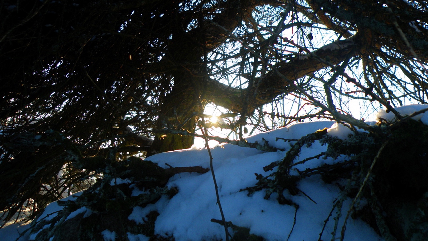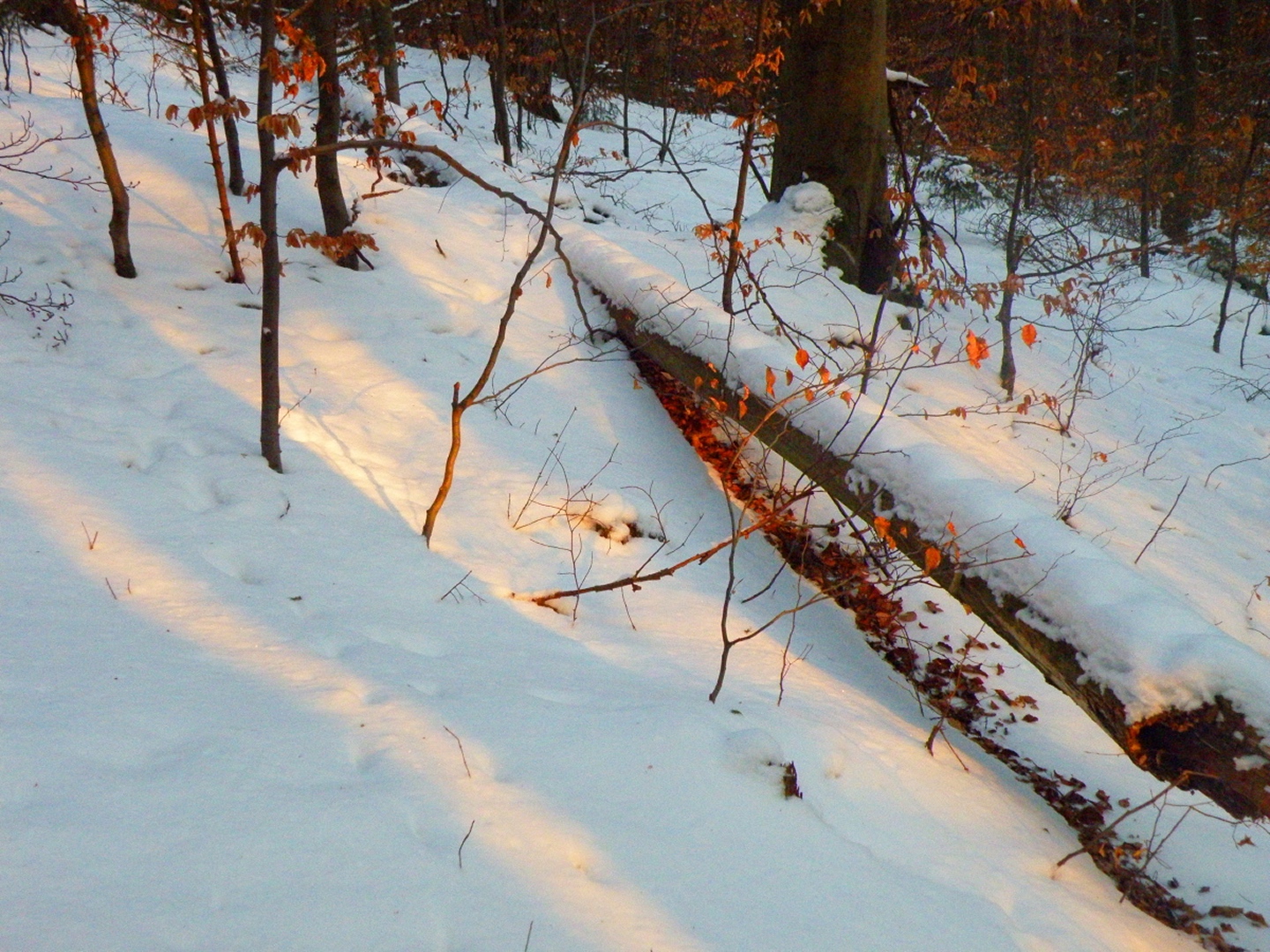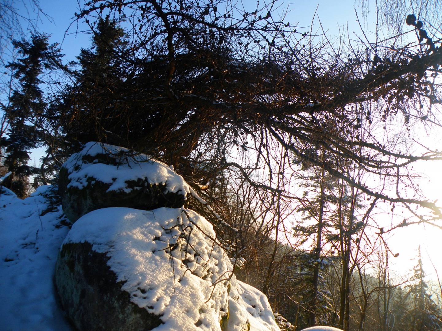 Vom Wanderparkplatz ging es zunächst die Straße am Hotel Bergfried vorbei entlang, bis nach etwa 200 Metern links eine Forstautobahn abbiegt, die die Schwarzwihrbergrunde darstellt. Dieser folgte ich bis zur zweiten Kreuzung bei der Sattelhütte. Dort bog ich zunächst rechts ab, um es zunächst am Eibenstein zu versuchen, jedoch wurde mir bereits nach wenigen Metern klar, dass es zu mühsam und zeitraubend werden würde. Gegenüber der Sattelhütte geht der ebenfalls verschneite, aber gut markierte Pfad zur Burg auf dem Schwarzwihrberggipfel hoch, erst noch flach, später aufsteilend. Nach etwa einem halben Kilometer gabelt sich der Weg. Rechts kann man auf dem bequemen Weg weitergehen, während es links über die Steinerne Wand hochgeht. Im Sommer kein Problem, da gut mit Holzgeländern versichert, bei der Schneelage war es an einigen Stellen aber grenzwertig. Die Nordostabstürze der Steinernen Wand sehen durchaus kletterbar aus, allerdings ist mir nicht bekannt, ob es erlaubt ist. Etwa 200 Meter unter der Burg vereinigen sich die Wege wieder, kurz darauf stößt von links noch die Forststraße von Bauhof hinzu. Nach einem kleinen Abstecher ohne Fotos auf die Burg und der Feststellung, dass alle Schänken geschlossen waren, wählte ich für den Rückweg den kleinen südseitigen Steig hinab zum Wanderparkplatz, was ebenso wie der Mut zum schwierigeren Aufsteigsweg mit einigen netten Fotos belohnt wurde. Auf diesem waren sogar Mountainbikespuren sichtbar, keine Ahnung was diese Personen da geritten hat.