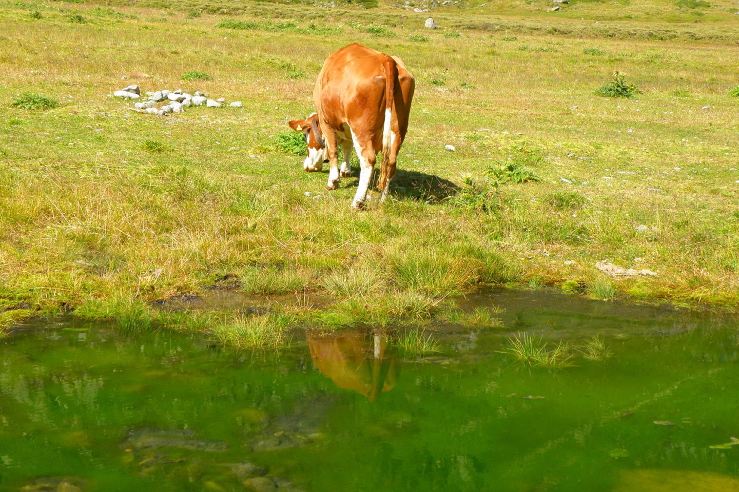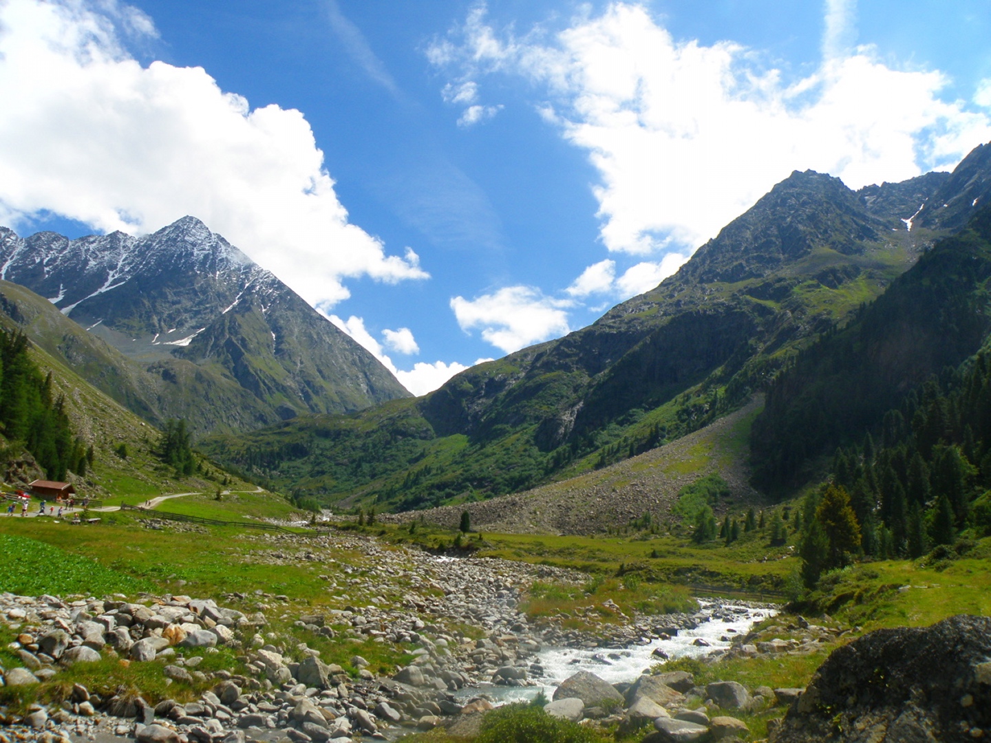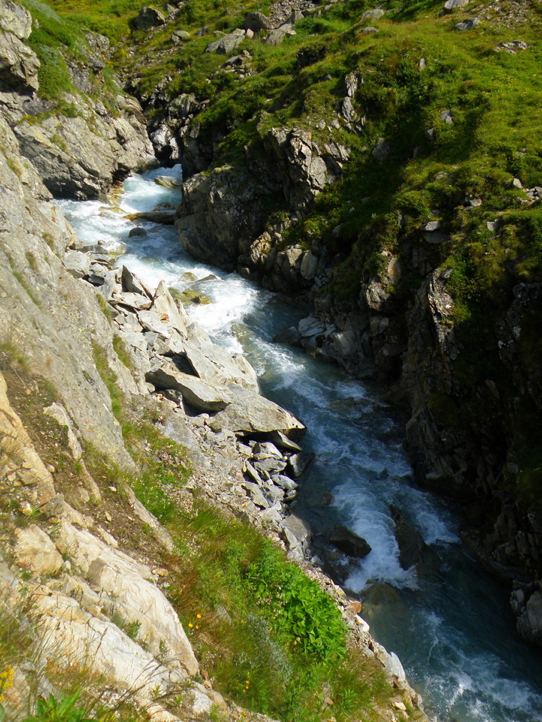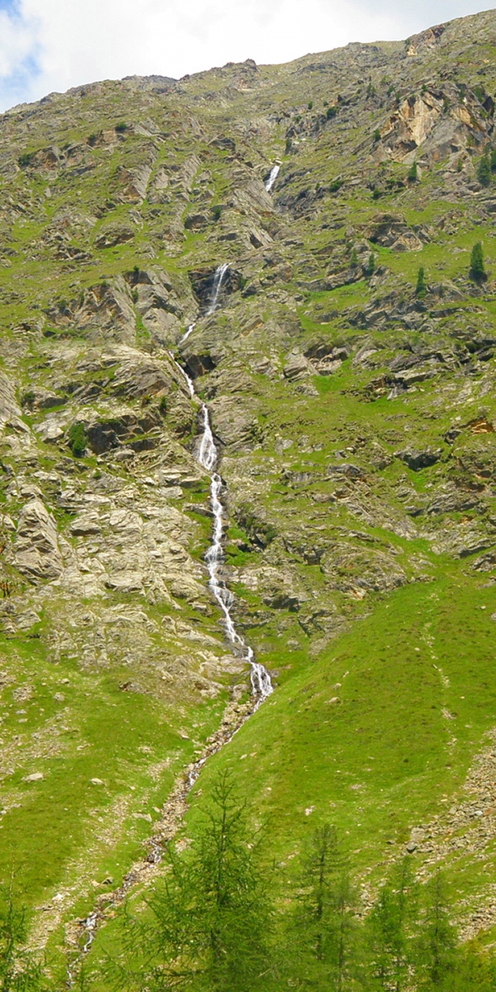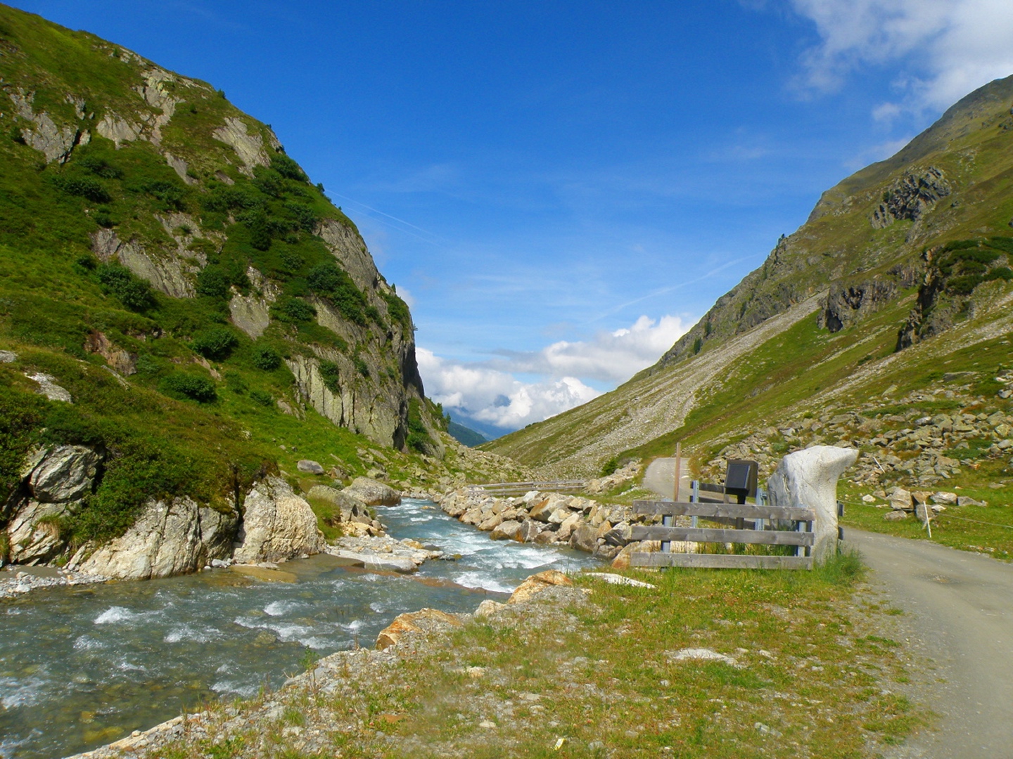 Zur Wahl standen die Nisslalm, die Winnebachseehütte oder einfach nur ein Spaziergang in der Sulz mit anschließendem direkten Abstieg nach Gries. Leider ließen meine Knie nur Variante 3 zu. Was heißt leider? Das AKW ermöglichte mir dadurch, zumindest einen Teil der Fotos nachzuholen, die das eher miese Wetter am Vortag verwehrt hatte. Ich ging etwa 1,5 Kilometer hinauf in die Sulz, vorbei am Lausbichl bis zu dem Punkt, an dem es steiler Richtung Sulztalferner geht. Dort fand ich an einem der vielen Wasserfälle einen schönen Meditationsplatz, blieb 20 Minuten dort sitzen und machte mich dann auf den Weg hinunter. Beim Einkehrschwung auf der Unteren Sulztalalm gab es noch einen Apfelstrudel und einige witzige Holländer, aber leider keine Murmeltiere oder Gämsen mehr zu sehen.