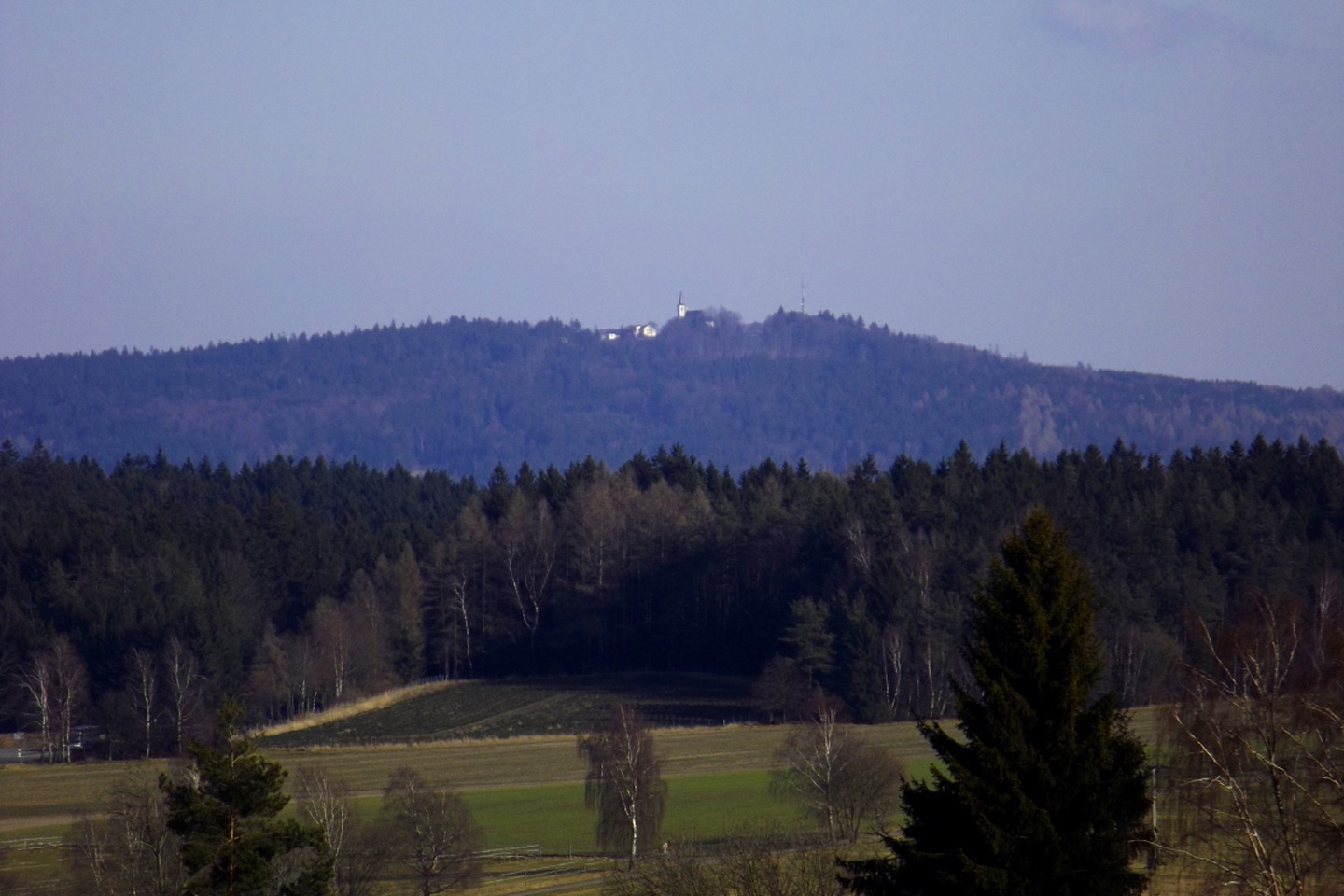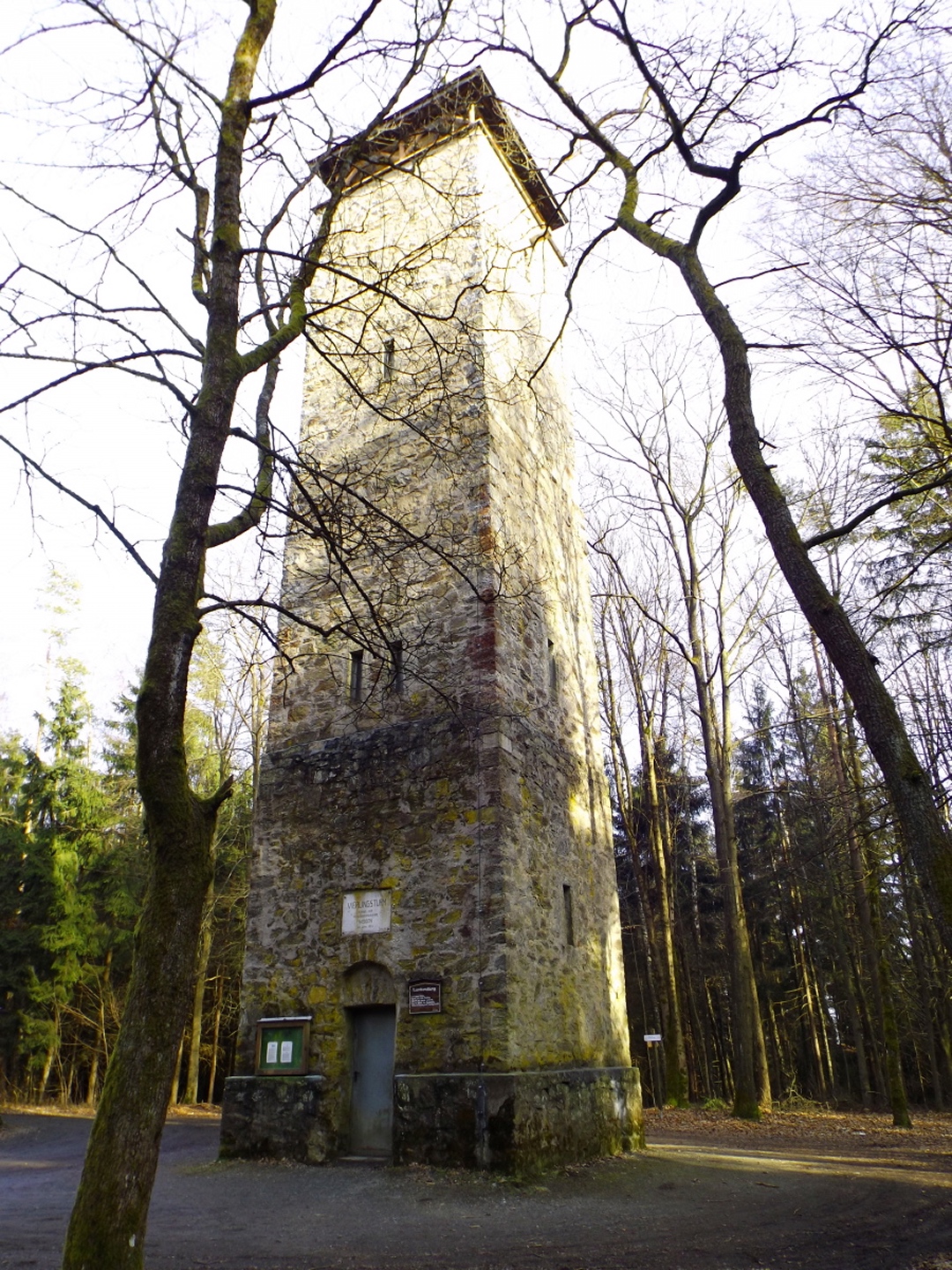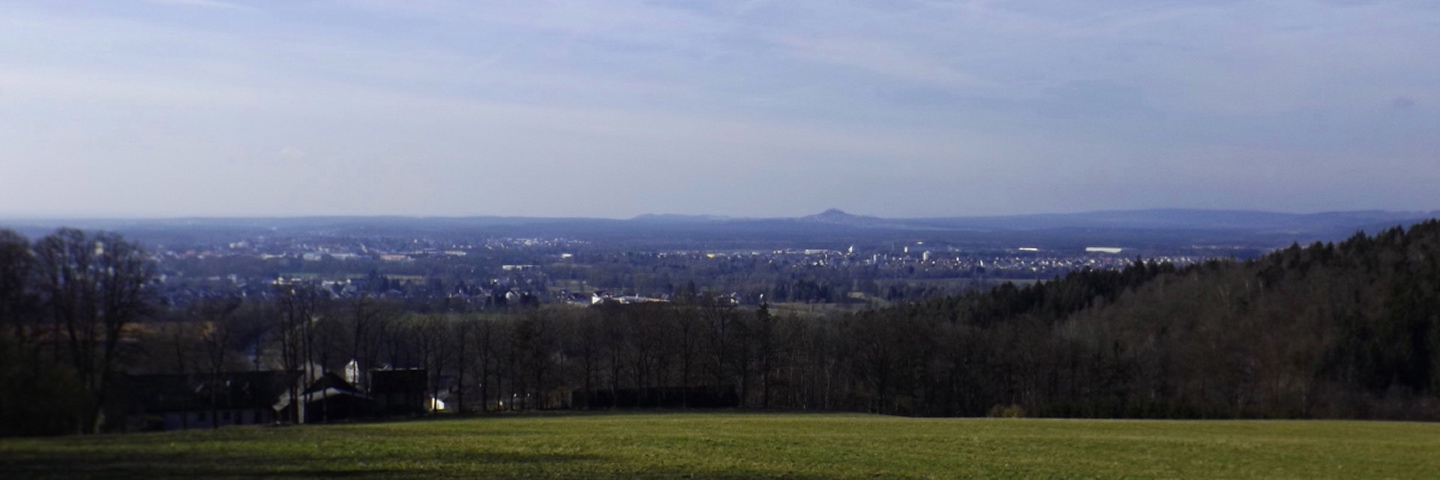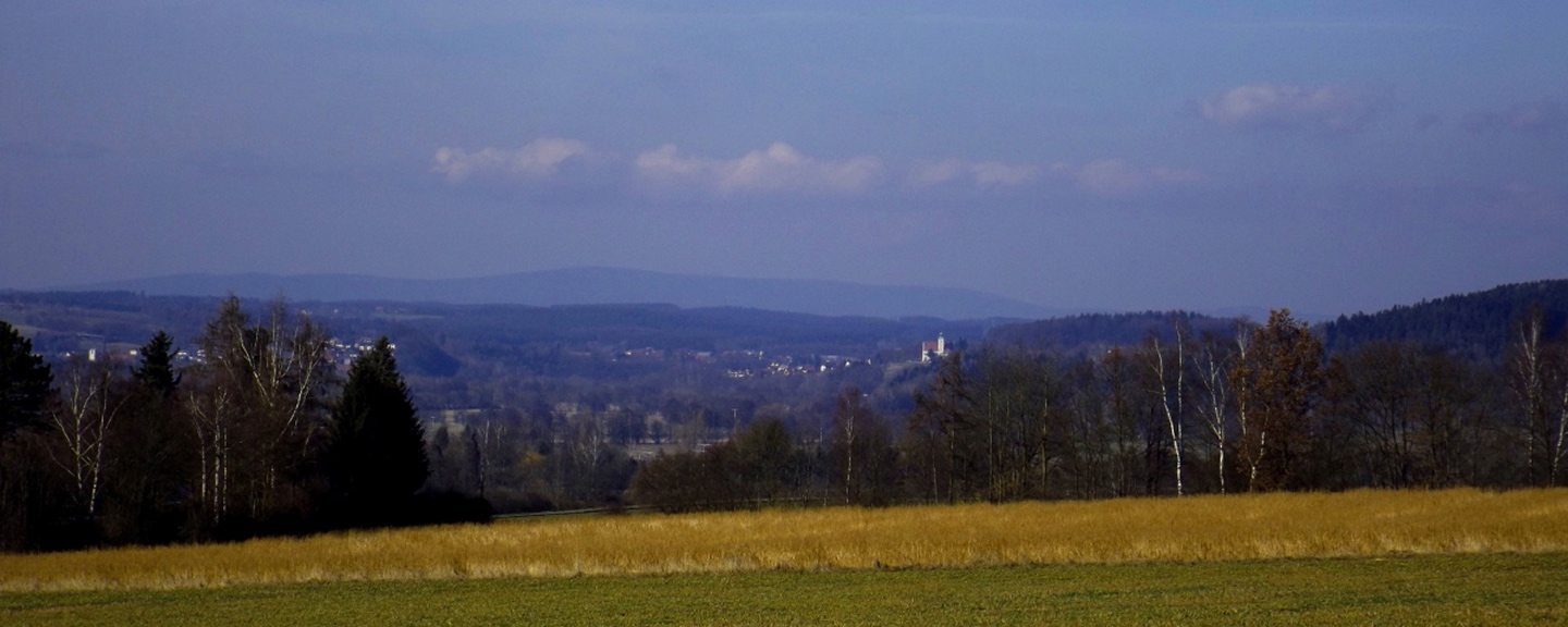 Von den vielen möglichen Ausgangspunkten wählte ich den Wanderparkplatz am Ende des Hopfenweges, weil er doch ein bisserl Gehstrecke erlaubte, ich aber nicht erst quer durch die Stadt oder Wohnsiedlungen musste. Von hier aus wählte ich den linken der drei geschotterten Wege, um zunächst hinaus nach Tröglersricht zu kommen. Während der rechte Weg ebenfalls ein Wanderweg ist, auf dem ich am Ende der Runde zurückkam, führt der mittlere nur zu ein paar Schrebergärten. In Tröglersricht angekommen, geht es zunächst unter der Kapelle vorbei nach links und nach einem Anwesen rechts hinauf, dem roten Dreieck folgend. Ab jetzt wird es ein kleines bisserl steiler, nach ein paar Minuten führt der Weg auch in den Wald hinein. Zunächst überquerte ich eine Forststraße, bevor man rechts zur Strobelhütte und somit auch dem Westgipfel abbiegen kann. Ich ging jedoch geradeaus weiter bis zum Ende des Waldes, wo man einen schönen Blick auf Letzau und die östlichen Hügel Richtung Grenze zu Böhmen hat. Ab hier folgt man auf einer Forststraße links hinunter sogar dem Goldsteig, der nach knapp 100 Metern die Forststraße nach rechts verlässt und auf einem sehr schönen Pfad am Waldrand entlang hinauf führt Richtung Ostgipfel. Kurz vor diesem trifft man auf die Zufahrtsstraße zum Fernsehturm, auf der die letzten 100 Meter absolviert werden. Der höchste Punkt ist eher ein kleines Plateau, das halb umzäunt und halb verwuchert ist, so dass ich mich mit einem Punkt etwa 20 Höhenzentimeter unterhalb begnügte. Nach einem Schluck aus der Trinkflasche ging es auf dem gleichen Weg zurück bis zu der Abzweigung, an der ich den Goldsteig betreten hatte. Von hier aus kann man auf einem kleineren Waldpfad zum Westgipfel abkürzen, was ich auch tat. Dort dann die einzige kleine Enttäuschung des Tages: Die Strobelhütte hat nur Mittwoch und Samstag nachmittags sowie Sonntag ganztags geöffnet, und auch der Vierlingsturm ist nur zu ihren Öffnungszeiten zugänglich. Also leider keine Panoramafotos von oben. Für den Rückweg folgte ich der Markierung weiß-rot-weiß (senkrecht) nach Süden, bis dieser Pfad auf die Forststraße vom Aufstieg trifft. Dieser folgte ich nach rechts für etwa 200 Meter, dort zweigt wieder ein Pfad nach links in den Wald hinein. Dieser berührt in einer sanft abschüssigen Linkskurve eine Wiese, von der aus noch einmal gute Fotos von Weiden und der westlichen Umgebung möglich sind. Hier hatte ich etwas Glück: So gut meine neue Kamera ist, ihr Tragriemen ist um Lichtjahre schlechter und weniger zuverlässig als derjenige der alten. Prompt löste er sich auf einer Seite und die Kamera landete auf dem trockenen, aber weichen Waldboden. Da muss ich mir noch etwas einfallen lassen. Bald tauchte vor mir ein Weiler auf, der in der Kompass-Karte als Zollhaus vermerkt ist. Von hier aus kann man geradeaus einer für Kraftfahrzeuge gesperrrten Schotterstraße folgen, die irgendwann auf den Aufsteigsweg trifft. Ich bog jedoch am Ortsende noch einmal links auf einen Flurbereinigungsweg ab, der nach einer Doppelkurve und einer kleinen Wiesenpassage auf den Wanderweg W trifft, auf dem ich mich rechts hielt und zum Auto zurückkehrte.