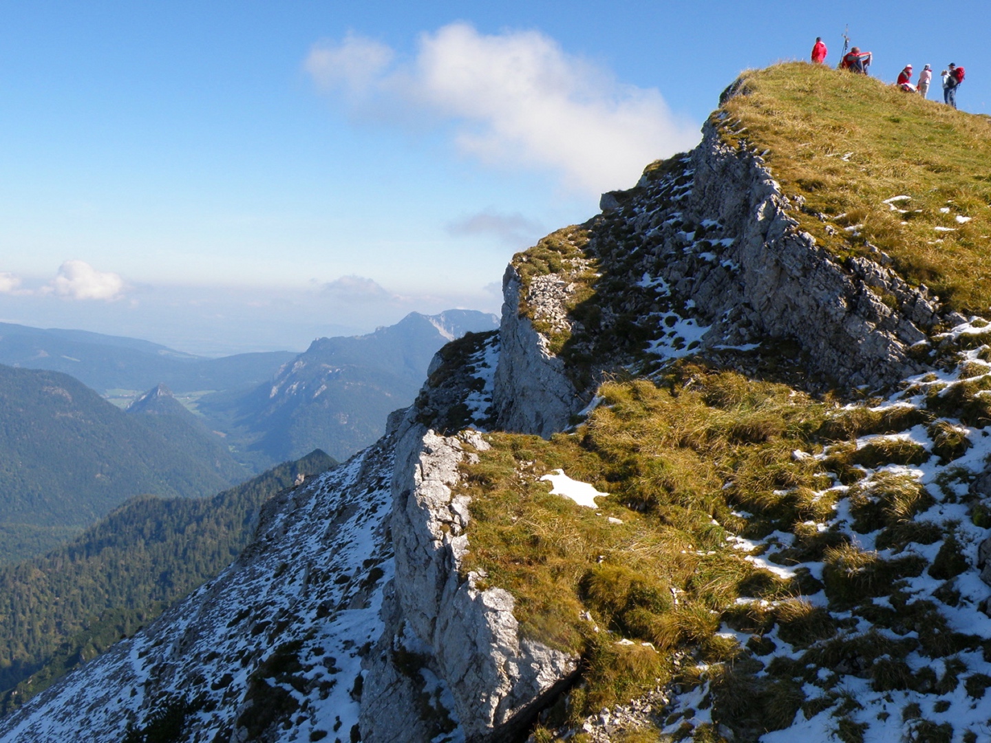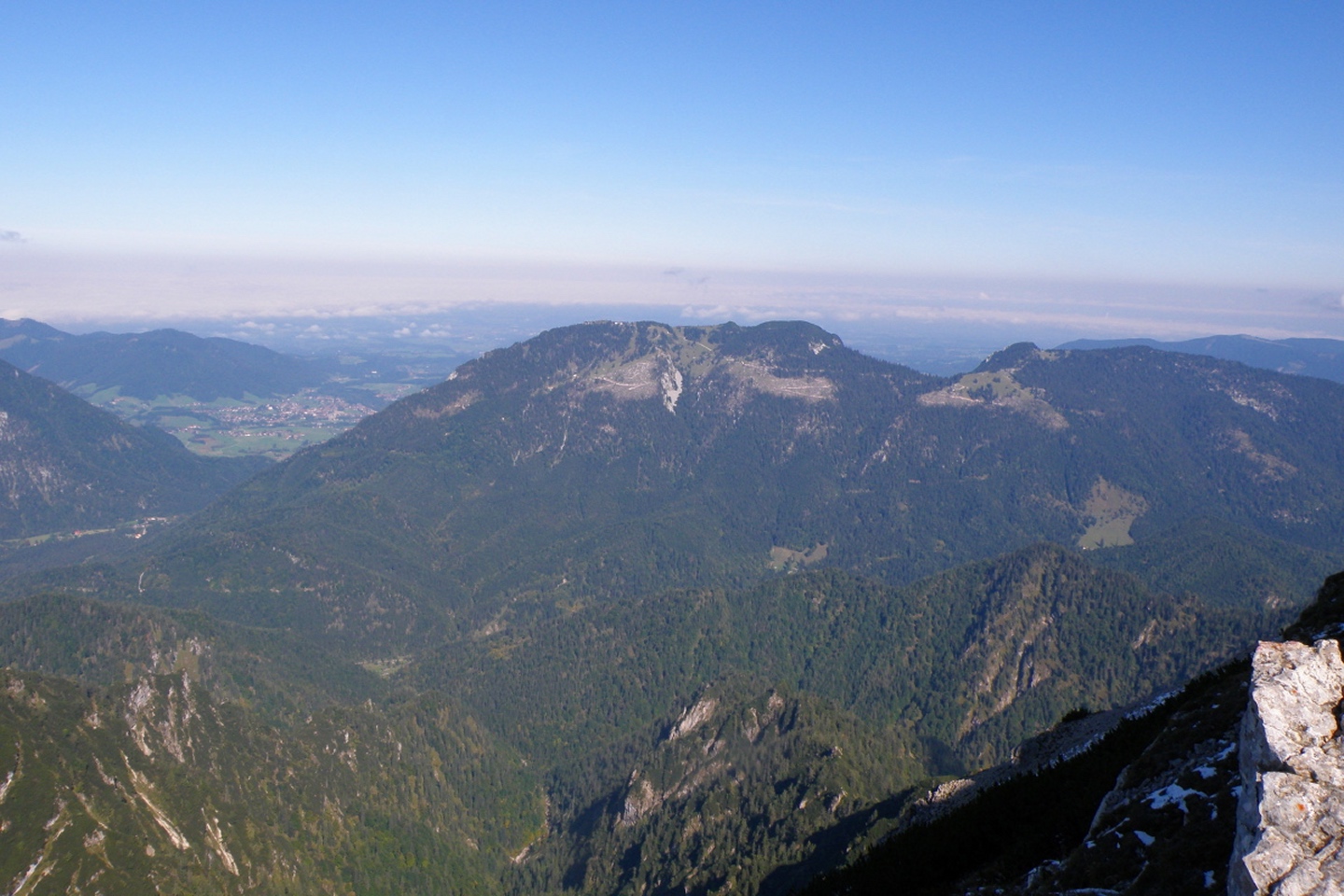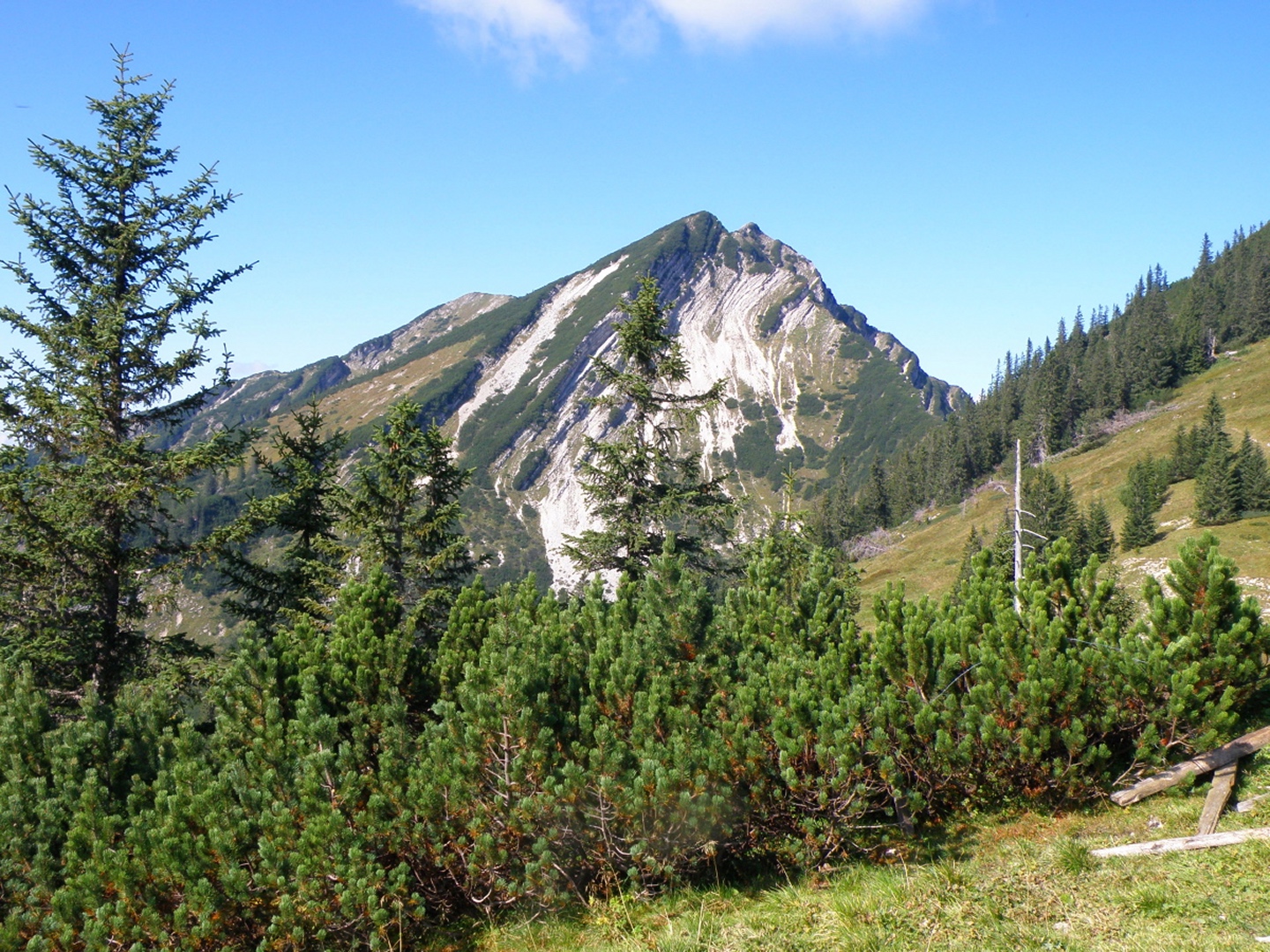 Wir gingen den Gipfel von der Südseite an. So wie es die meisten tun, aber ich traute mir den langen Talhatscher von Laubau aus nicht ganz zu. Das Auto wurde nicht ganz hinten im Heutal abgestellt, sondern vorne auf Parkplatz 2, was zwar erst einmal eine langweilige Forststraße bedeutete, aber immerhin weniger andere Leute mit dem gleichen Ziel. An der Hochalm vorbei folgten wir dem Abzweig bei der Kapelle, wo Coco nach 250 Höhenmetern auf einmal verschwunden war. „Wird nicht weit sein“ dachte ich mir und setzte mich erst einmal zur Brotzeit, und tatsächlich dauerte es nicht lange, bis ein paar Schafe an mir vorbei bergab rannten, Coco hinterher. Etwa fünf Minuten später kam dann Coco allein zurück und legte sich auf meine Füße: „Beschütz mich!“ Ihre Vorderpfote wurde von einer langen blutenden Wunde geziert. Scheinbar hatte der Leithammel nicht verstanden, dass Coco doch nur rennen und spielen wollte und ihr eine kräftige Watschn verpasst. Von mir gabs erst einige böse Worte und die ganz kurze Leine (was in diesem Bereich ohne Absturzgefahr möglich war) und erst mit etwas Verzögerung Wasser. In den Latschen hab ich sie dann wieder losgelassen, weil ich mir im holprigen Gelände keine Bänder reißen wollte, wenn sie zog. Sie hatte auch scheinbar genug und blieb immer brav in Sichtweite. Auf dem Gipfel war dann wie fast immer Vollversammlung, eine AV-Gruppe war mit Dackel da, den Coco aber nach kurzem Beschnuppern in Ruhe ließ, es war ihr doch etwas zu voll für Spielereien. Abwärts nahm ich sie im kritischen Bereich wieder an die Leine und wählte außerdem den etwas längeren Weg über den Roßkarsattel, bevor wir ausgiebig in der Hochalm einkehrten. Auch hier: Überfüllung hoch zehn. Der Abstieg über die Forststraße verlief dann bis auf eine weitere Begegnung mit ziemlich faulen Hunden absolut ereignislos und ich schaffte es noch, rechtzeitig in Piding ins Wahllokal zu gehen.