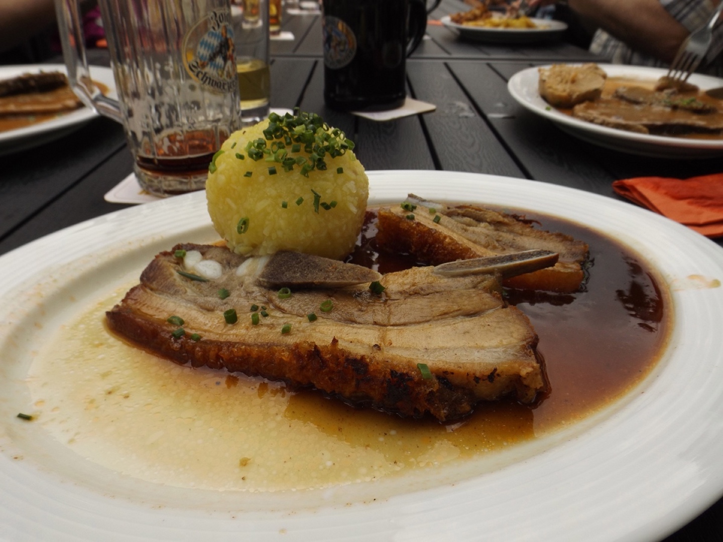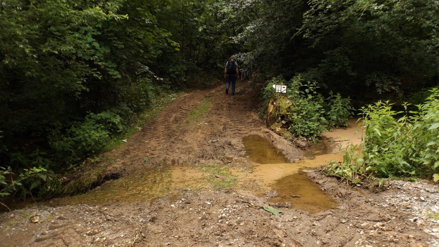 Dafür wartete bei meiner Ankunft am Ausgangspunkt außer Heinz niemand unter der Autobahnbrücke. Ein paar Minuten später kamen unsere Hersbrucker und Nürnberger Freunde den Wanderweg aus Richtung Bahnhof herauf, und das war es. Traurig für den OWV. Die nächste Überraschung war, dass dieses Mal niemand vorne wegrannte. Das lag aber nicht daran, dass die Rennsemmeln nicht dabei waren, nein, sie hielten sich brav zurück. Im Waldstück zwischen Etzenricht und Hannersgrün passierte es sogar, dass sie stehenblieben, ein paar Eierschwammerln abschnitten, einpackten und dem Rest der Gruppe hinterherrannten. Ja, ihr habt richtig gelesen, Eierschwammerln. Einen Kilometer vorher stolperte ich fast über eine Gruppe Wiesenchampignons, hatte aber nichts zum Einpacken dabei, sonst wären die nicht stehengeblieben. Keine Überraschung war hingegen die Qualität des Essens bei der Einkehr in Etzenricht, der Krustenbraten war gewohnt exzellent, nur das Leberknödel der Vorspeise hätte etwas mehr Suppe und damit eine größere Suppentasse vertragen. Richtig wild wurde es dann am Ortsende von Hannersgrün: Wir dachten, mit der Überquerung der Staatsstraße die gefährlichste Stelle hinter uns gebracht zu haben, als plötzlich vier verwegene Gestalten in mittelalterlicher Gewandung aus dem Gebüsch sprangen und uns mit ihren Hellebarden bedrohten. Meine Kamera bekam davon fast einen Herzinfarkt und konnte deshalb keine scharfen Beweisfotos machen. Es stellte sich aber bei näherem Hinsehen heraus, dass Schuhwerk, Hosen und Armbanduhren nicht zum Mittelalter passten und die Halunken doch nur Freunde vom OWV Kohlberg waren, die auch schnell die Absicht wechselten und uns jetzt bis zum Ziel in ihrem Heimatort geleiteten, wo wir die Tagestour bei Kaffee bzw. Tee und Kuchen ausklingen ließen. Bald brachten ein Kleinbus und Heinz im PKW die fränkischen Freunde zum Bahnhof nach Weiherhammer, bevor Heinz mich zurück zum Auto nach Weiden fuhr und auch die nächste Etappe der Goldenen Straße über die Runden gebracht war.