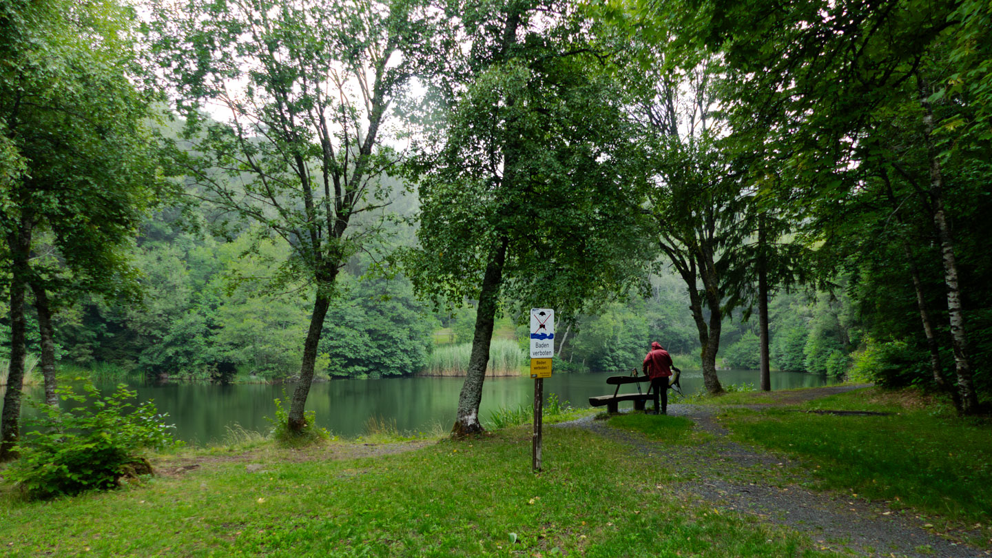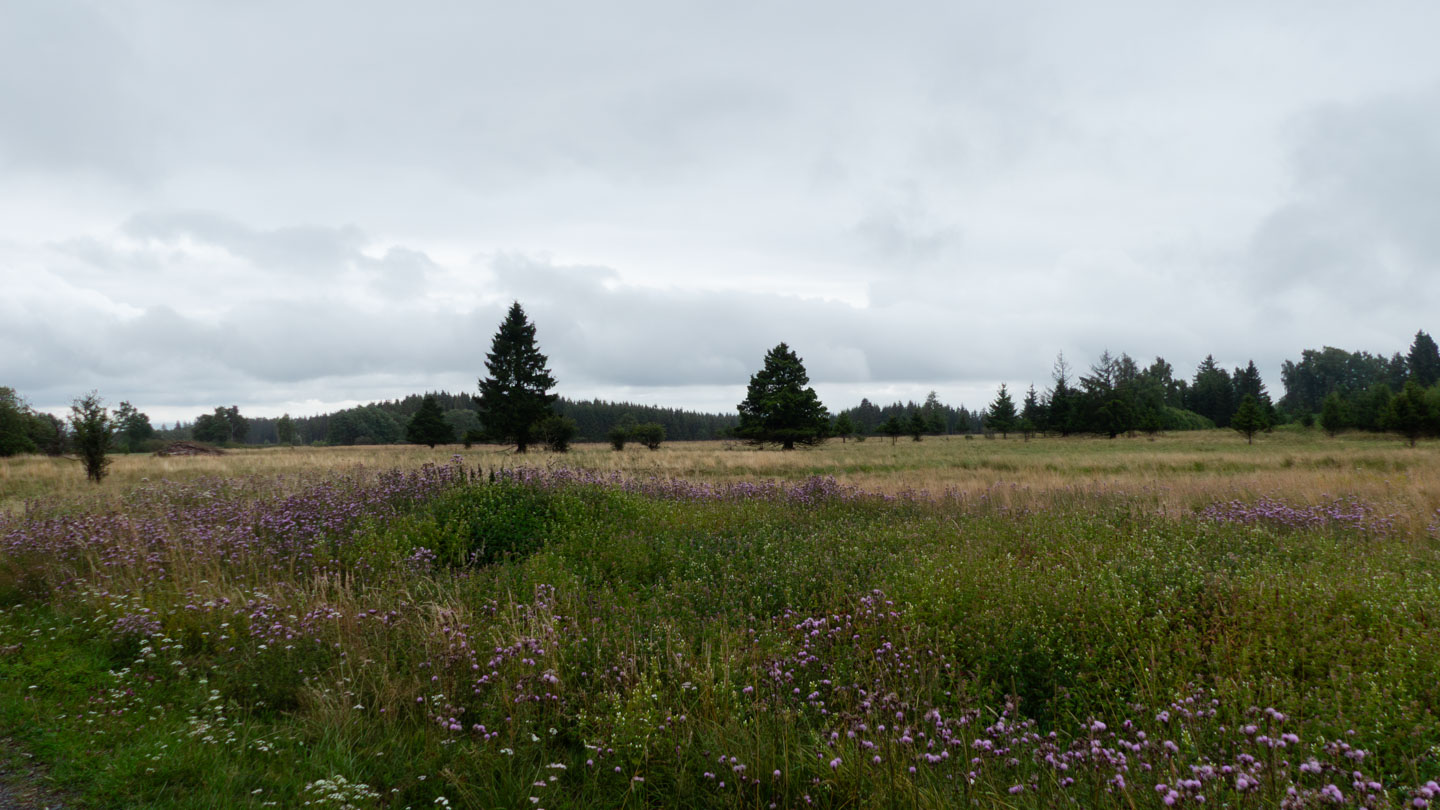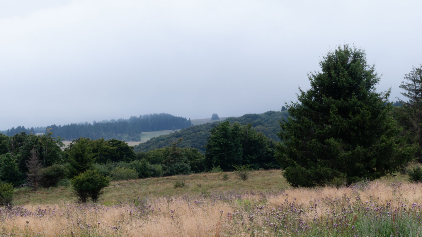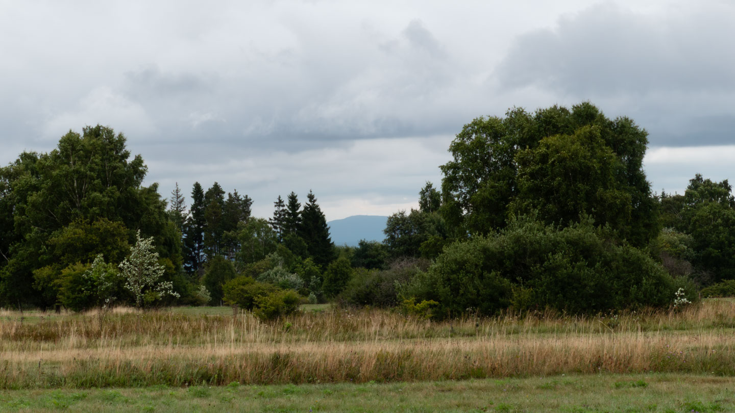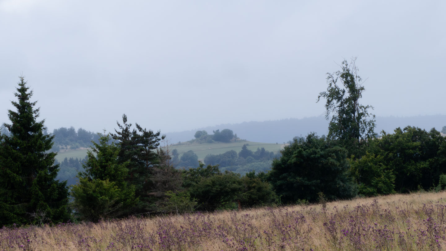 Der Sonntag war regnerisch, also war eine Runde angesagt, bei der der Hauptreiz nicht im Panorama lag. Wir entschieden uns für den Gangolfsberg mit seiner Basaltprismenwand und wollten noch die Rother Kuppe und den Rother Berg mitnehmen, weil auf letzterem der Silbersee liegt. Vormittags blieb es sogar bis auf einen kleinen Schauer ganz am Anfang sogar trocken, so dass doch einige Fotos entstanden. Ab zwölf Uhr wurde es aber dann doch etwas ungemütlicher und wir sparten uns die Rother Kuppe und den Silbersee. Bei der Ankunft an der Thüringer Hütte kam es dann zur Katastrophe: Ich wollte die Hütte von außen fotografieren und hatte im Sucher statt der Hütte ein Rauschen wie früher beim Sendersuchlauf im Fernsehen. Irgendwie war entgegen dem Attribut „spritzfest“ doch ein Wassertropfen ins Kamerainnere gedrungen und das wars halt dann. Beim nächsten Einschaltversuch ging gar nix mehr und das änderte sich auch in den folgenden Tagen nicht mehr wirklich. Da Wandern ohne Fotografieren zwar möglich, aber völlig sinnlos ist (Ausnahme meine eigenen Führungen, bei der ich mich auf die Gruppe konzentriere), war richtig Frust angesagt. Auch gibt es logischerweise vom Rest der Woche keine eigenen Berichte, weil die ohne Bilder erst Recht sinnlos sind. Deshalb folgen jetzt noch ein paar Gedanken zum Rest der Woche:
