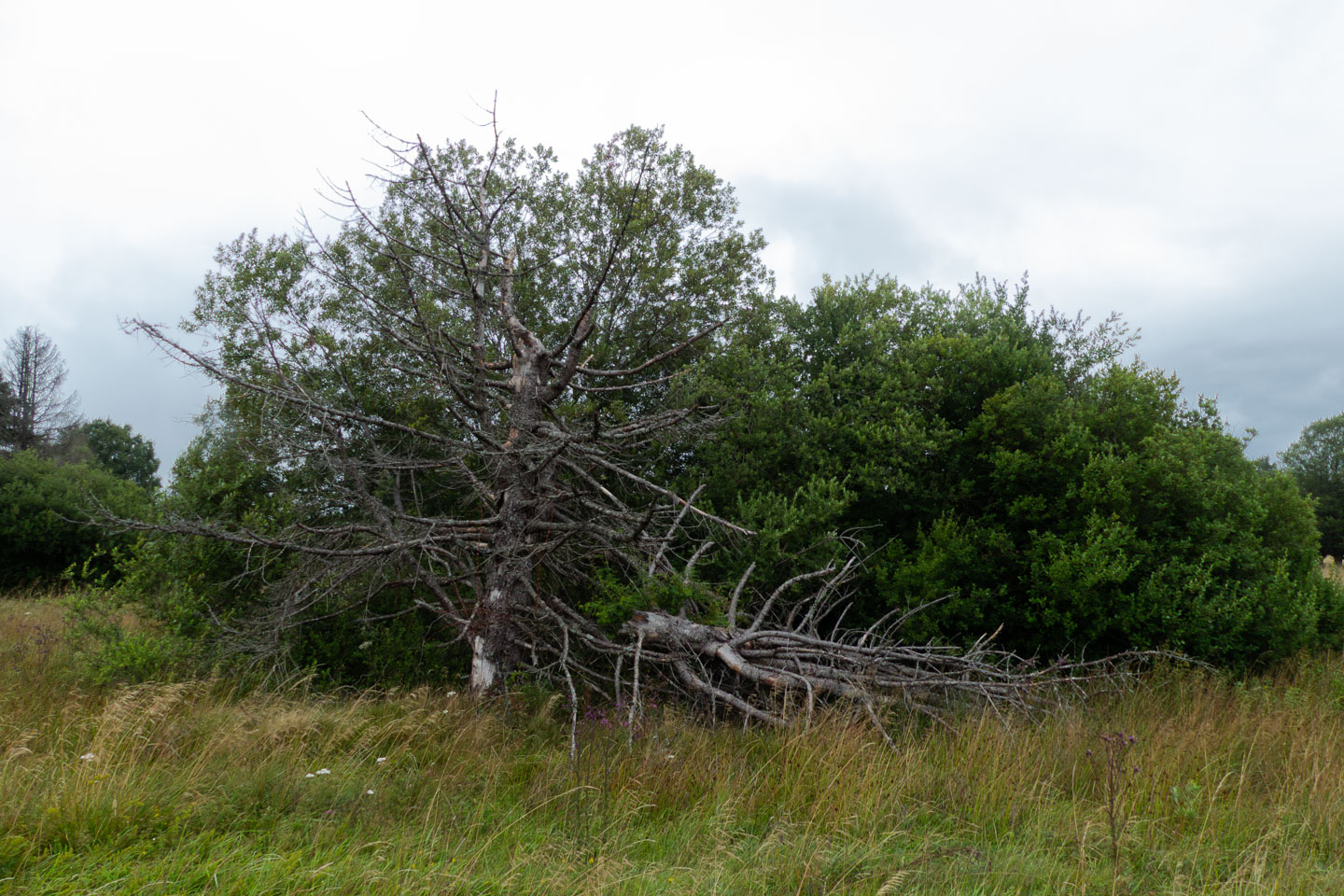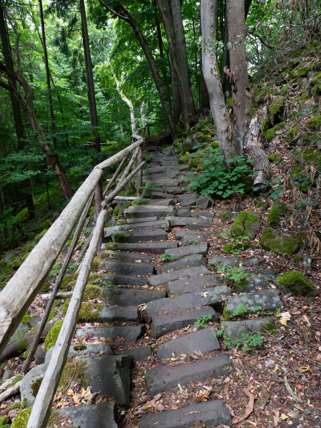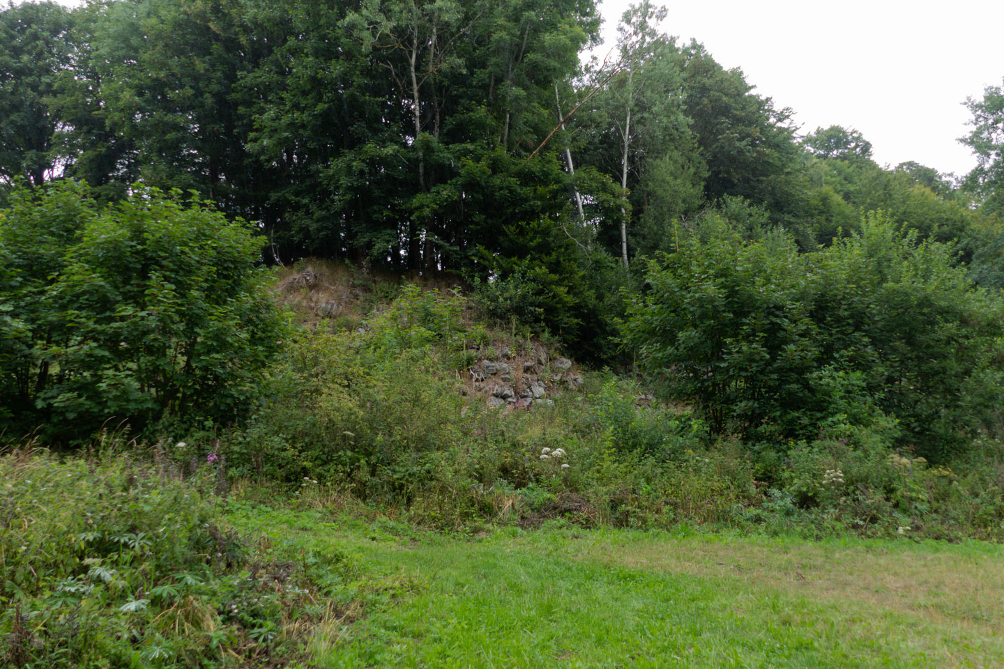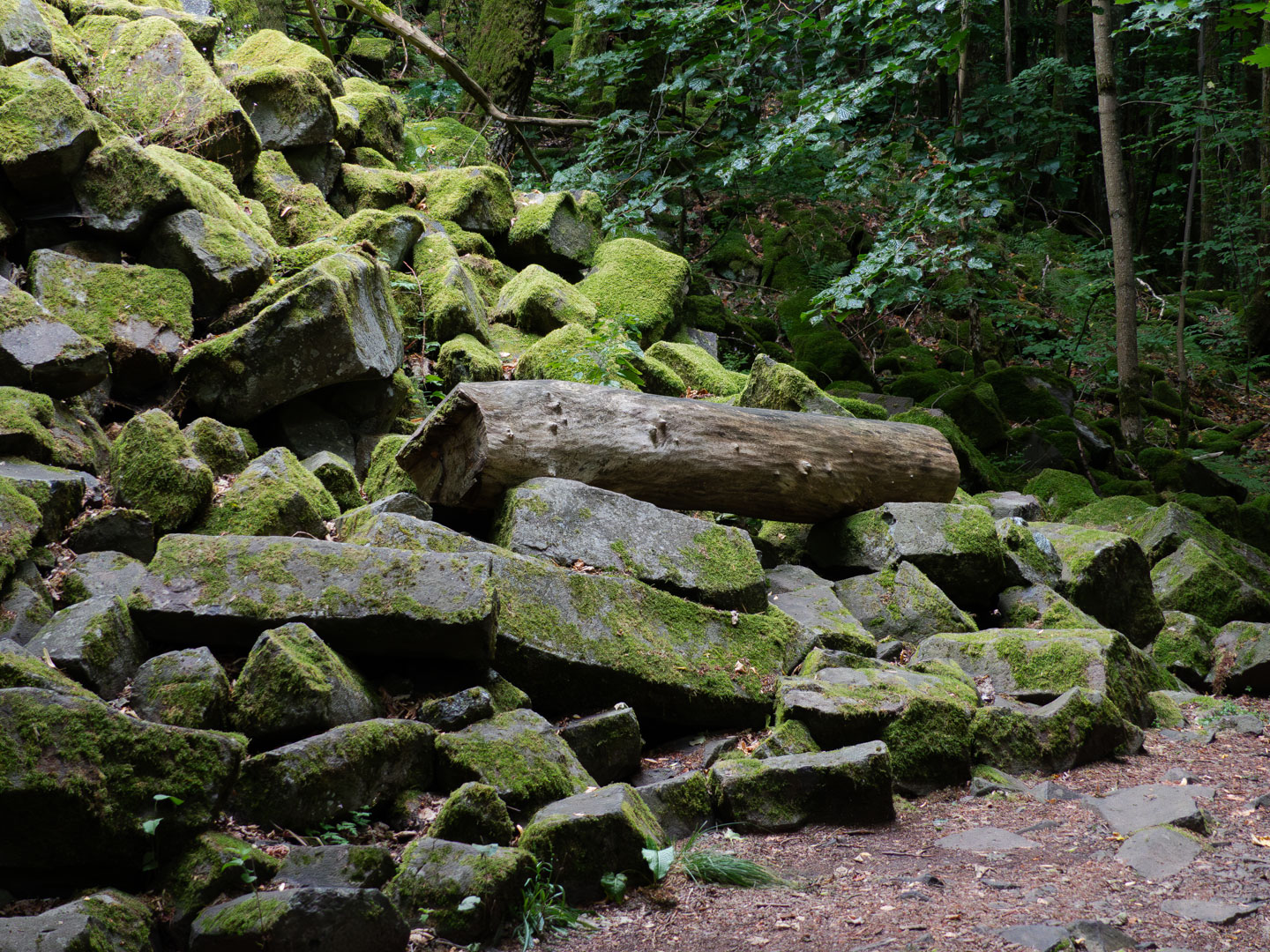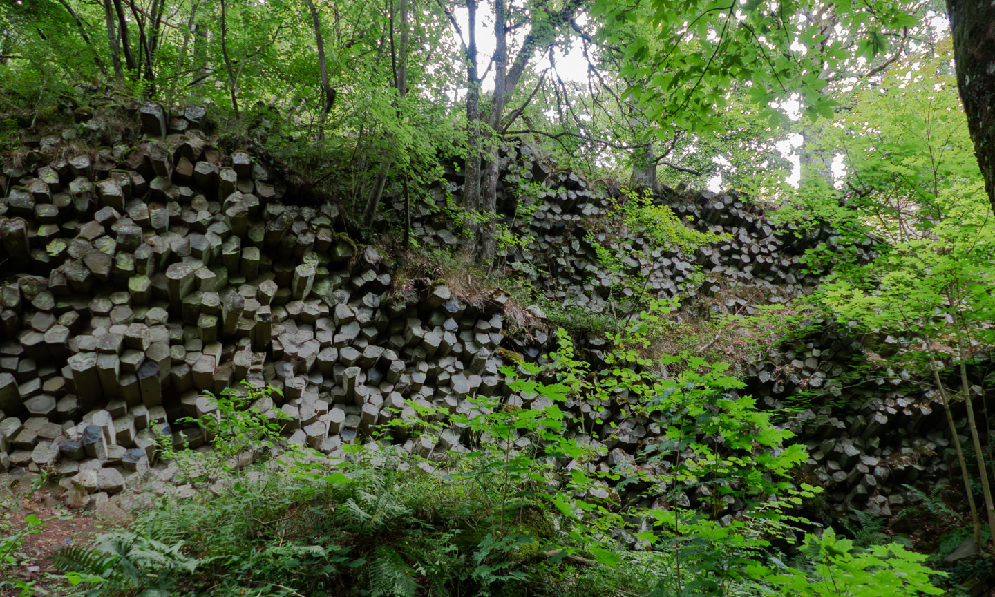 Der Sonntag war regnerisch, also war eine Runde angesagt, bei der der Hauptreiz nicht im Panorama lag. Wir entschieden uns für den Gangolfsberg mit seiner Basaltprismenwand und wollten noch die Rother Kuppe und den Rother Berg mitnehmen, weil auf letzterem der Silbersee liegt. Vormittags blieb es sogar bis auf einen kleinen Schauer ganz am Anfang sogar trocken, so dass doch einige Fotos entstanden. Ab zwölf Uhr wurde es aber dann doch etwas ungemütlicher und wir sparten uns die Rother Kuppe und den Silbersee. Bei der Ankunft an der Thüringer Hütte kam es dann zur Katastrophe: Ich wollte die Hütte von außen fotografieren und hatte im Sucher statt der Hütte ein Rauschen wie früher beim Sendersuchlauf im Fernsehen. Irgendwie war entgegen dem Attribut „spritzfest“ doch ein Wassertropfen ins Kamerainnere gedrungen und das wars halt dann. Beim nächsten Einschaltversuch ging gar nix mehr und das änderte sich auch in den folgenden Tagen nicht mehr wirklich. Da Wandern ohne Fotografieren zwar möglich, aber völlig sinnlos ist (Ausnahme meine eigenen Führungen, bei der ich mich auf die Gruppe konzentriere), war richtig Frust angesagt. Auch gibt es logischerweise vom Rest der Woche keine eigenen Berichte, weil die ohne Bilder erst Recht sinnlos sind. Deshalb folgen jetzt noch ein paar Gedanken zum Rest der Woche: