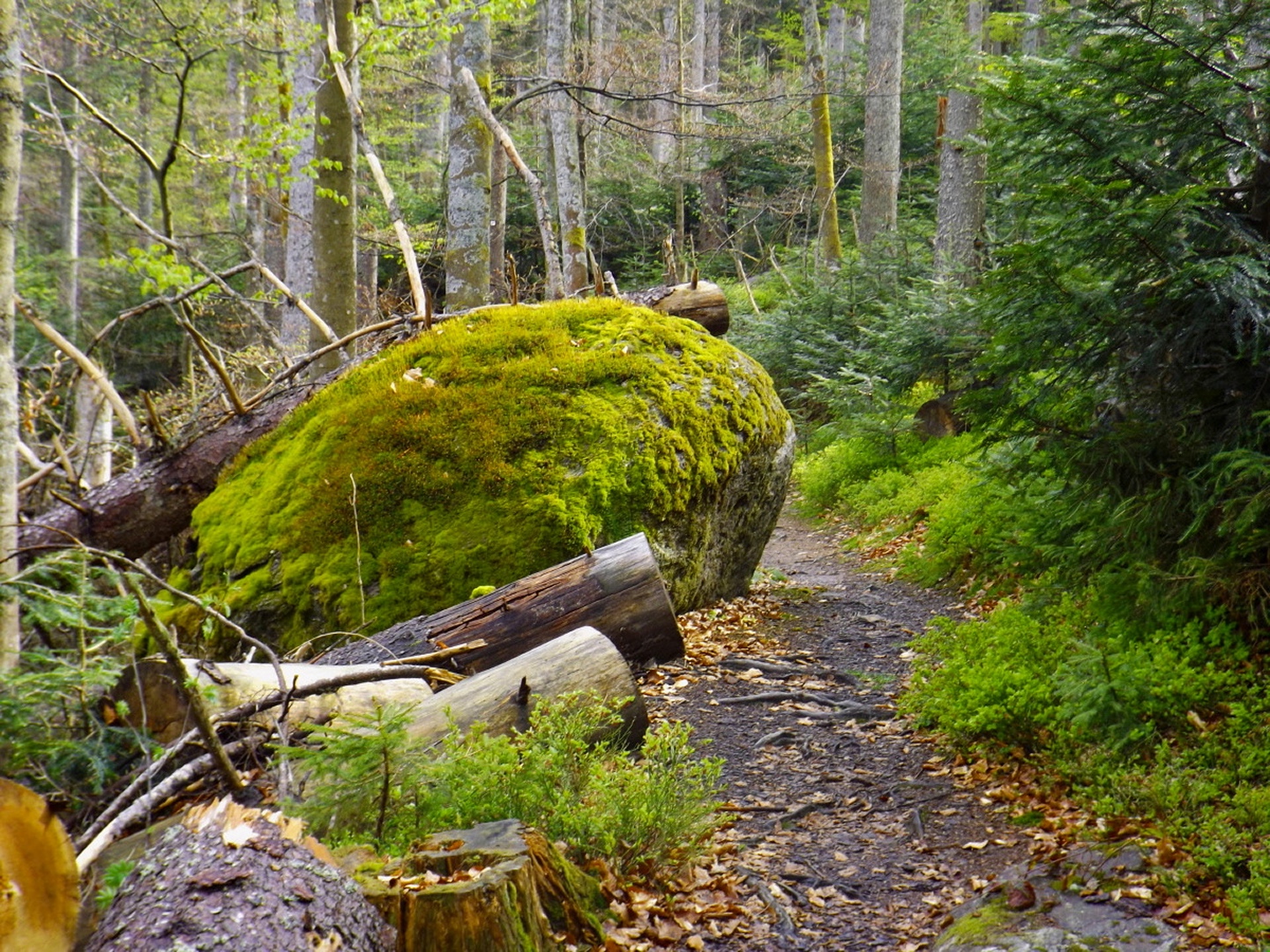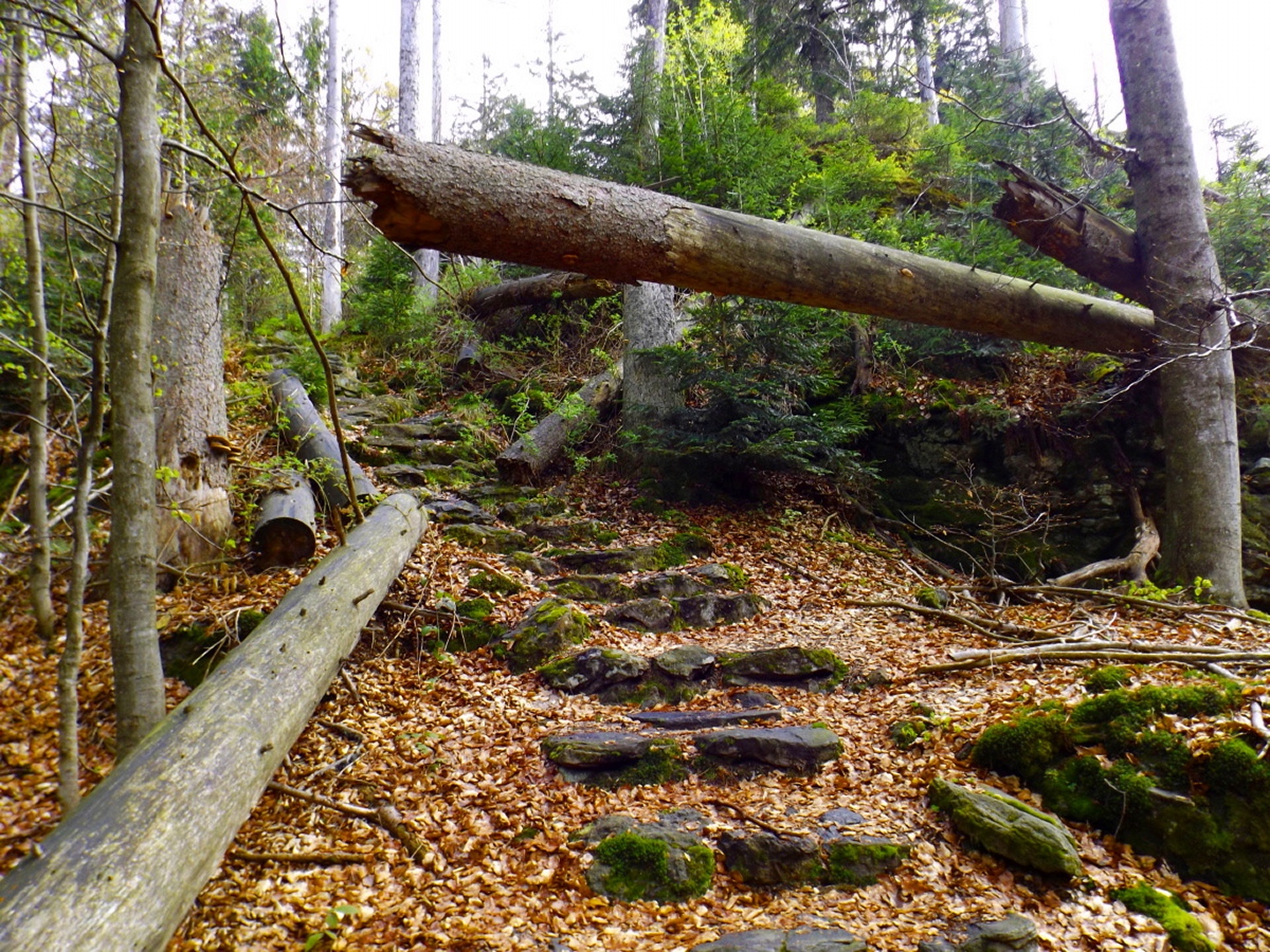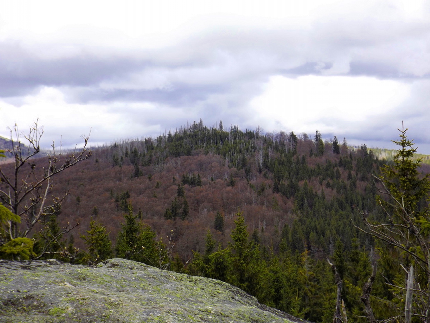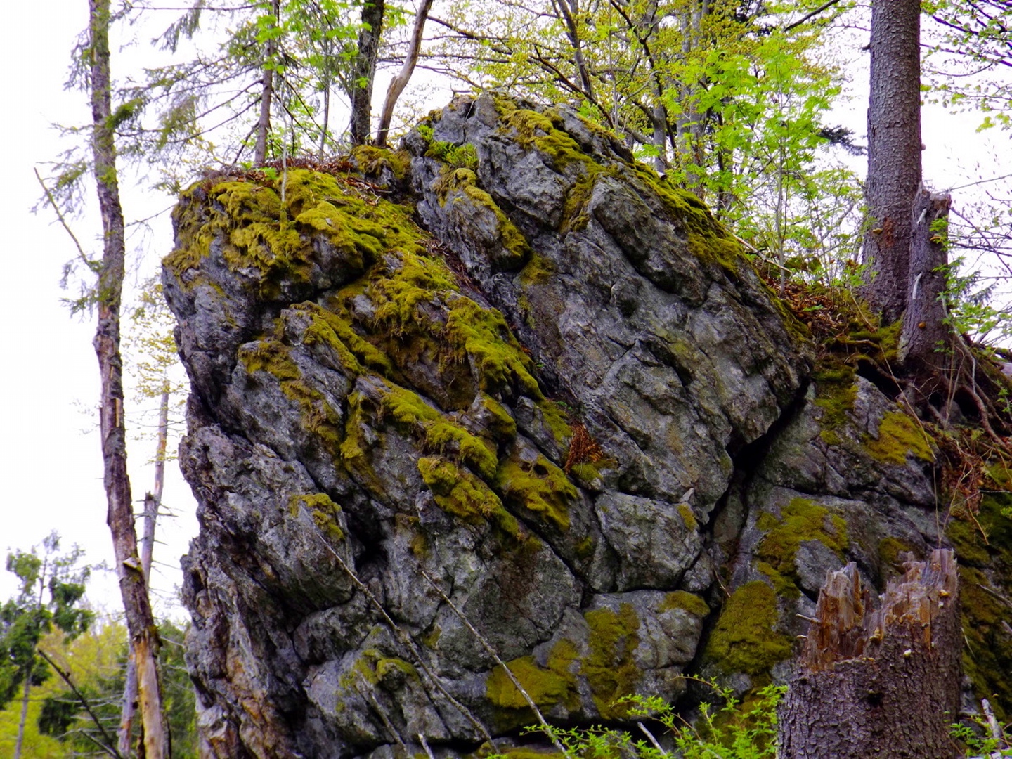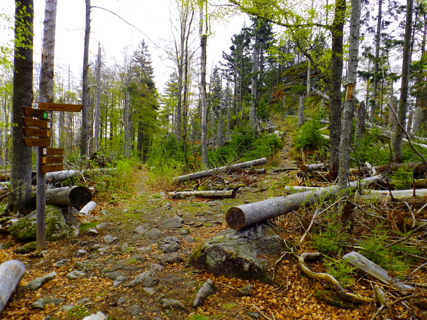 Zunächst folgte ich den Wegweisern Richtung Felsenwandergebiet nach Osten, was gleich einmal die erste Steintreppe bedeutete. Zu diesem Zeitpunkt kein Problem, es war zwar sehr bewölkt, aber trocken. Nach nicht einmal drei Minuten war ich an der ersten Abzweigung, wo ich dem Weg nach rechts folgte, während es geradeaus auf kürzerem Weg zur Steinbachklause und nach Mauth geht, und hatte bereits fünf Fotos geschossen. Durch den Urwald geht es in mäßiger Steigung zum ersten Gipfelchen des Tages, dem Ochsenriegel, wo ein Bankerl zum Rasten einladen würde, aber doch nicht nach gerade mal 16 Minuten! Ein Pärchen, das kurz vor mir losmarschiert war, hatte andere Prioritäten oder konditionelle Gegebenheiten und machte es sich gemütlich, ließ mich aber erst noch ein Gipfelfoto schießen. Weiter ging es an der am Hirschberg liegenden Ochsenriegel-Schutzhütte vorbei. Warum die Schutzhütte einen halben Kilometer von ihrem Namensgeber entfernt liegt, wissen nur die Nationalparkbeamten, es ist nicht das einzige nicht ganz nachvollziehbare Detail, über das ich an diesem Tag stolperte. An der Schutzhütte können Familien mit kleinen Kindern links abbiegen, um die superkurze Runde zu vollenden, alle anderen gehen geradeaus weiter und kommen nach zehn weiteren Minuten und leichter Steigung zum Eingang in die Felswanderzone. Diese trägt ihren Namen nicht ganz zu Unrecht, denn der Pfad windet sich um mehrere Felsformationen, der Boden ist auch nicht mehr so waldig wie vorher und mittendrin überschreitet man auch die Kleine Kanzel, die zwar ein paar Meter höher ist als ihr „Großes“ Pendant, aber bei weitem nicht so markant. Ihr höchster Punkt ist ebenso wenig zugänglich wie der in einigen Beschreibungen angekündigte Aussichtspunkt 960 mit Blick zum Rachel. Während bei der Kleinen Kanzel etwas Kletterei durch Gestrüpp nötig wäre, sind die Stufen zu Punkt 960 noch gut erkennbar, der Weg aber total mit Windwurf verlegt und deshalb auch der Wegweiser abmontiert. Es hätte wohl gegen die Philosophie des Nationalparks verstossen, den Windwurf zu beseitigen und den Aussichtspunkt wieder zugänglich zu machen. Von mir aus. Noch vor der Kleinen Kanzel zieht von rechts ein Wanderweg herauf, der etwas verwirrend beschildert ist, es ist zunächst nicht ganz klar, wie man den Felswandergebiet-Rundweg denn gehen soll. Richtig ist geradeaus, anders kommt man am Parkplatz südlich des Gebiets heraus und hat nur 180 zusätzliche Höhenmeter in den Beinen, aber bezüglich der Runde nichts gewonnen. Nach einigen Kurven und Abzweigungen erreicht man einen Grenzstein und Schilderbaum, an dem ich mich nach links wandte, um die Steinbachklause und die Große Kanzel anzuvisieren. Der Weg wird jetzt wieder breiter und ebener, nach 200 Metern kann man entweder geradeaus weiterlaufen, um zum Seefilz und zur Steinbachklause zu kommen, oder aber rechts Richtung Mauth abbiegen und die Große Kanzel mitnehmen. Dieser Abstecher ist durchaus lohnend, denn die Aussicht nach Süden und Westen kann sehr schön sein. Allerdings sollte man den Aufstieg zur Großen Kanzel nicht mit Turnschuhen versuchen, er ist an einer Stelle etwas ausgesetzt und im Gipfelbereich muss man ein bisserl klettern, deshalb auch die Bewertung mit T2 und I. Nach einer Gipfelbrotzeit und einem netten Gespräch mit zwei Jungs aus Cham ging ich zurück zur Abzweigung und folgte dem Weg hinunter zum Seefilz, wo man herauskommt, wenn man an der ersten Abzweigung geradeaus geht und bog dort rechts ab Richtung Steinbachklause. Diese liegt im Winter im Sperrgebiet, die Beschilderung der Wildruhezone wurde netterweise bereits abmontiert, obwohl der 1. Mai noch ein paar Tage entfernt ist. An der Steinbachklause muss man etwas aufpassen, um den richtigen Weg zu finden, er geht etwas versteckt rechts an der Hütte vorbei, die Goldsteig-Beschilderung am Giebel ist aber normalerweise nicht zu übersehen. Jetzt geht es in einem Bogen durch den Wald, wird stellenweise etwas steiler, aber nie unangenehm. Nach 40 Minuten erreichte ich die Einmündung in die Forststraße zum Tummelplatz, einem früheren Schachten, den ich nach weiteren 15 Minuten erreicht hatte. Laut Beschilderung an der Steinbachklause hätte ich für diesen Abschnitt fast doppelt so lange brauchen sollen, hatte aber nicht das Gefühl, besonders gerannt zu sein. Von hier aus ist es nicht weit zum Großalmeyerschloss, einem ebenfalls sehr aussichtsreichen Felskopf, dessen Zustieg etwas glitschig war, aber normalerweise T2 nicht überschreitet. Das Gipfelkreuz wurde zu meiner Überraschung weder von der Nationalparkverwaltung noch vom Bayerwaldverein errichtet, sondern von der DAV-Sektion Passau. Da schau her. Ein Gipfelbuch suchte ich jedoch ebenso wie an der Großen Kanzel vergeblich, nicht einmal eine Kassette dafür ist vorhanden. Hier begründeten sich erstmals Zweifel daran, ob ich die Tour wirklich komplett schaffen könnte, denn in Böhmen stand eine ziemlich finstere Wolkenwand. Ich ging trotzdem wie geplant auf den Lusensteig, denn erstens stand sie östlich von mir und zweitens gibt es auf der Tummelplatzstraße hinunter zur Sagwassersäge keine Unterstandsmöglichkeit, während neben dem Lusenschutzhaus auch noch das Hütterl bei der Sagwasserklause im Abstieg geeignet ist, einen Regenschauer auszusitzen. Der Lusensteig führt ohne nennenswerten Höhengewinn oder auch -verlust am Westhang des Sulzriegels entlang und glänzt durch jede Menge Abwechslung. Mal ein breiter Waldweg, dann wieder ein schmaler Bergpfad, zwischendurch Bachbett, es ist fast alles geboten. 45 Minuten nach dem Tummelplatz kam ich zur letzten Abzweigung, an der es entweder schräg rechts hinauf zum Lusen geht oder aber schräg links hinunter ins Sagwassertal. Ein Blick nach Osten und die schwarze Wolkenwand stand über dem Sulzriegel. Ich hätte es zwar wohl bis zum Schutzhaus geschafft und den Regenguss dort aussitzen können, aber hätte es danach zwei Stunden bis zum nächsten ausgehalten? Mein Bauchgefüh