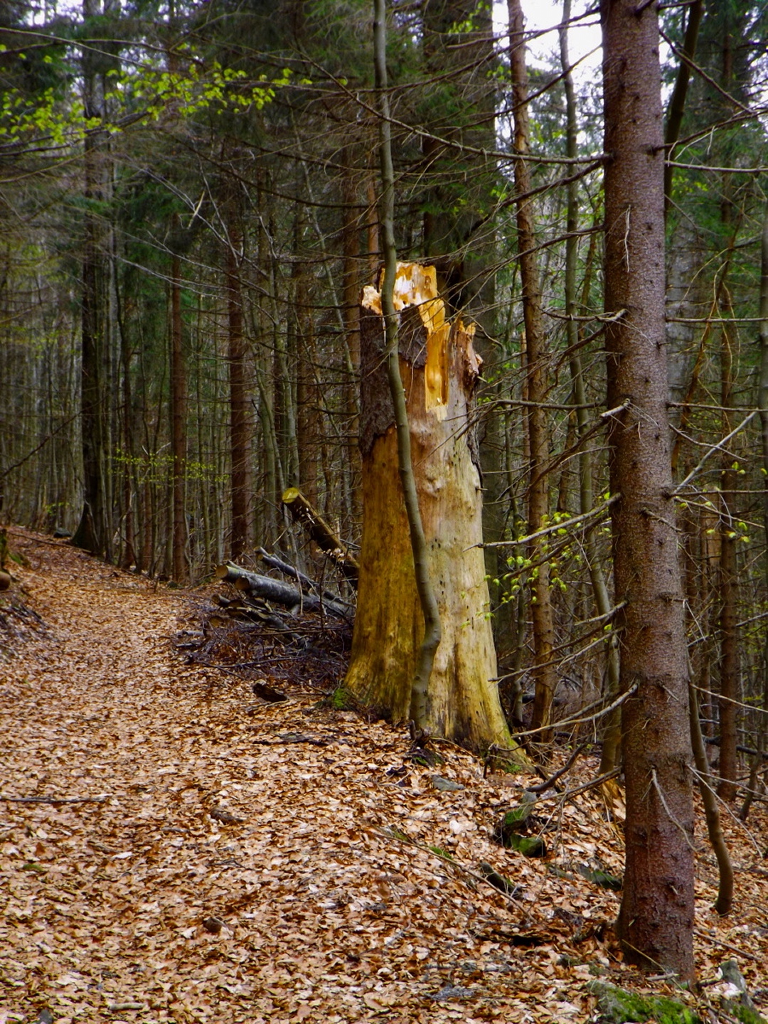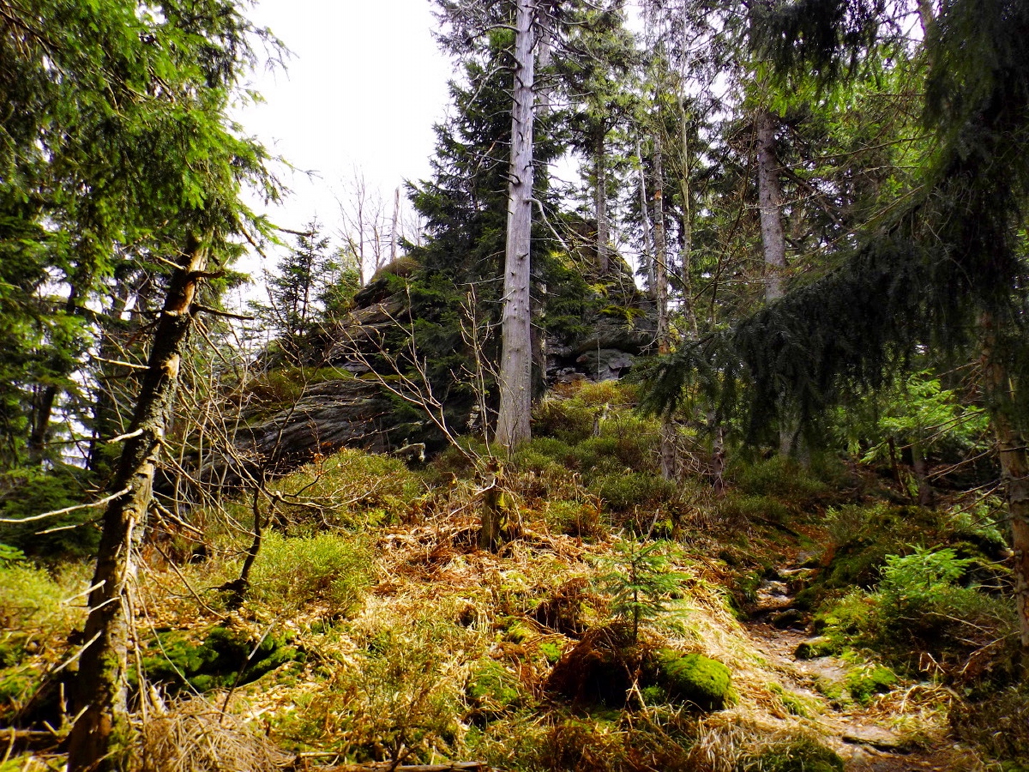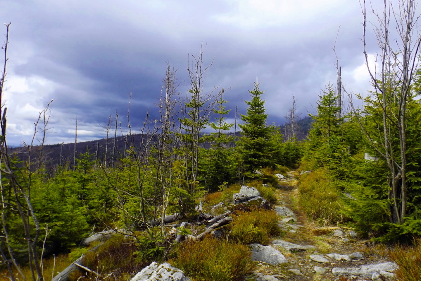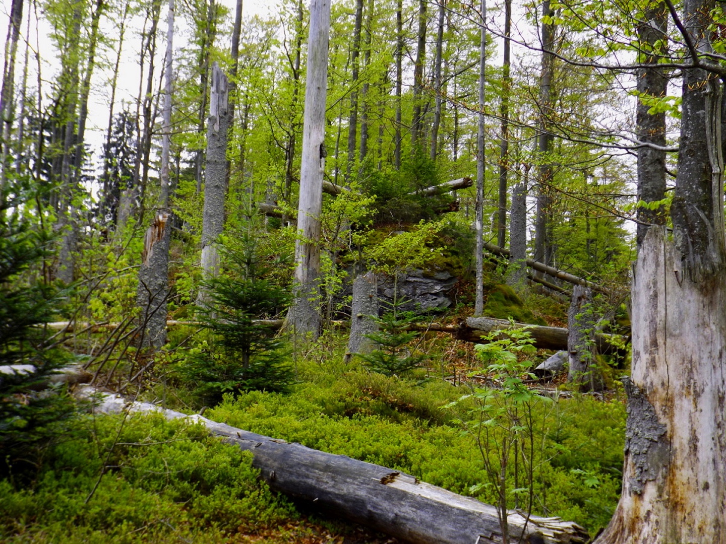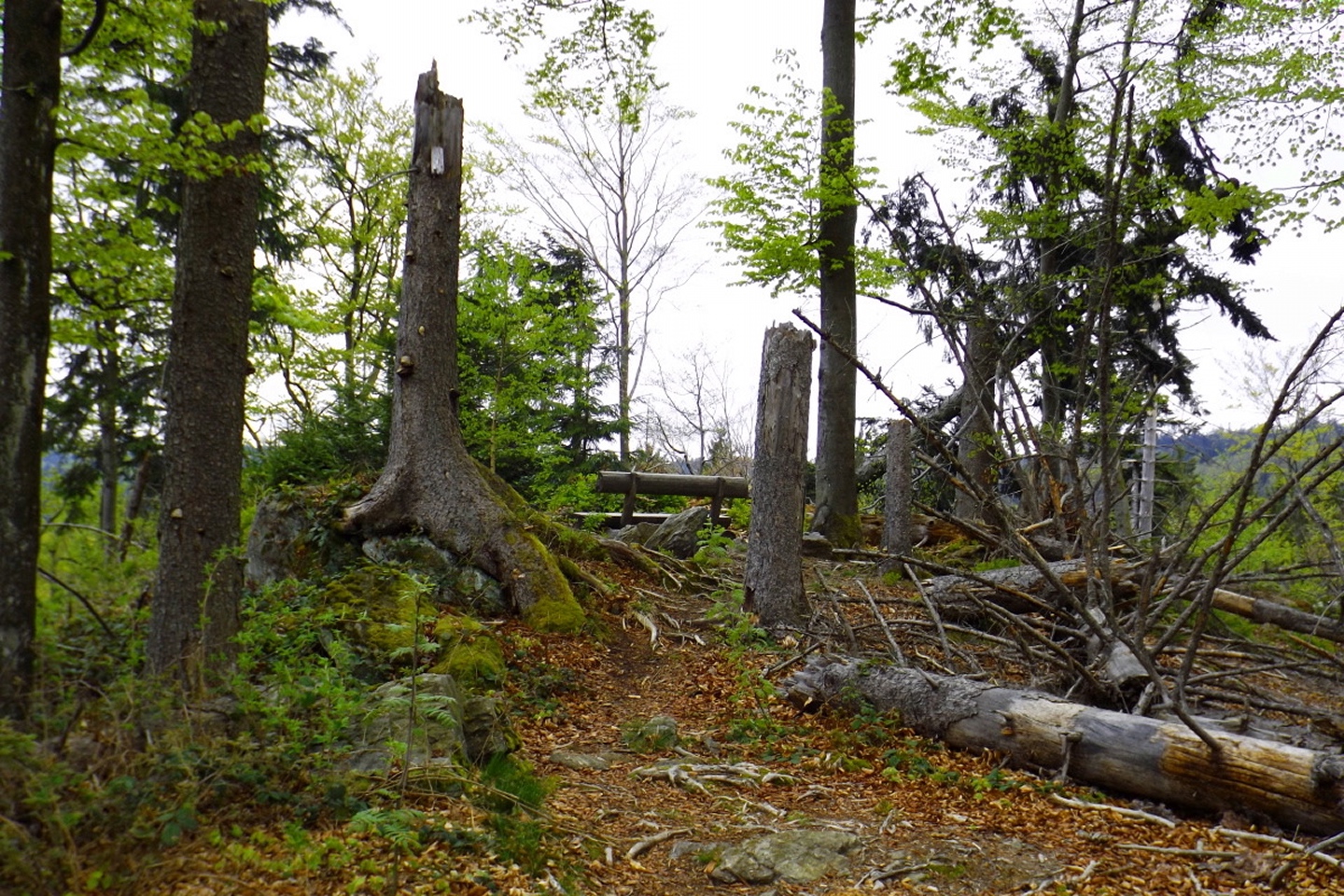 Zunächst folgte ich den Wegweisern Richtung Felsenwandergebiet nach Osten, was gleich einmal die erste Steintreppe bedeutete. Zu diesem Zeitpunkt kein Problem, es war zwar sehr bewölkt, aber trocken. Nach nicht einmal drei Minuten war ich an der ersten Abzweigung, wo ich dem Weg nach rechts folgte, während es geradeaus auf kürzerem Weg zur Steinbachklause und nach Mauth geht, und hatte bereits fünf Fotos geschossen. Durch den Urwald geht es in mäßiger Steigung zum ersten Gipfelchen des Tages, dem Ochsenriegel, wo ein Bankerl zum Rasten einladen würde, aber doch nicht nach gerade mal 16 Minuten! Ein Pärchen, das kurz vor mir losmarschiert war, hatte andere Prioritäten oder konditionelle Gegebenheiten und machte es sich gemütlich, ließ mich aber erst noch ein Gipfelfoto schießen. Weiter ging es an der am Hirschberg liegenden Ochsenriegel-Schutzhütte vorbei. Warum die Schutzhütte einen halben Kilometer von ihrem Namensgeber entfernt liegt, wissen nur die Nationalparkbeamten, es ist nicht das einzige nicht ganz nachvollziehbare Detail, über das ich an diesem Tag stolperte. An der Schutzhütte können Familien mit kleinen Kindern links abbiegen, um die superkurze Runde zu vollenden, alle anderen gehen geradeaus weiter und kommen nach zehn weiteren Minuten und leichter Steigung zum Eingang in die Felswanderzone. Diese trägt ihren Namen nicht ganz zu Unrecht, denn der Pfad windet sich um mehrere Felsformationen, der Boden ist auch nicht mehr so waldig wie vorher und mittendrin überschreitet man auch die Kleine Kanzel, die zwar ein paar Meter höher ist als ihr „Großes“ Pendant, aber bei weitem nicht so markant. Ihr höchster Punkt ist ebenso wenig zugänglich wie der in einigen Beschreibungen angekündigte Aussichtspunkt 960 mit Blick zum Rachel. Während bei der Kleinen Kanzel etwas Kletterei durch Gestrüpp nötig wäre, sind die Stufen zu Punkt 960 noch gut erkennbar, der Weg aber total mit Windwurf verlegt und deshalb auch der Wegweiser abmontiert. Es hätte wohl gegen die Philosophie des Nationalparks verstossen, den Windwurf zu beseitigen und den Aussichtspunkt wieder zugänglich zu machen. Von mir aus. Noch vor der Kleinen Kanzel zieht von rechts ein Wanderweg herauf, der etwas verwirrend beschildert ist, es ist zunächst nicht ganz klar, wie man den Felswandergebiet-Rundweg denn gehen soll. Richtig ist geradeaus, anders kommt man am Parkplatz südlich des Gebiets heraus und hat nur 180 zusätzliche Höhenmeter in den Beinen, aber bezüglich der Runde nichts gewonnen. Nach einigen Kurven und Abzweigungen erreicht man einen Grenzstein und Schilderbaum, an dem ich mich nach links wandte, um die Steinbachklause und die Große Kanzel anzuvisieren. Der Weg wird jetzt wieder breiter und ebener, nach 200 Metern kann man entweder geradeaus weiterlaufen, um zum Seefilz und zur Steinbachklause zu kommen, oder aber rechts Richtung Mauth abbiegen und die Große Kanzel mitnehmen. Dieser Abstecher ist durchaus lohnend, denn die Aussicht nach Süden und Westen kann sehr schön sein. Allerdings sollte man den Aufstieg zur Großen Kanzel nicht mit Turnschuhen versuchen, er ist an einer Stelle etwas ausgesetzt und im Gipfelbereich muss man ein bisserl klettern, deshalb auch die Bewertung mit T2 und I. Nach einer Gipfelbrotzeit und einem netten Gespräch mit zwei Jungs aus Cham ging ich zurück zur Abzweigung und folgte dem Weg hinunter zum Seefilz, wo man herauskommt, wenn man an der ersten Abzweigung geradeaus geht und bog dort rechts ab Richtung Steinbachklause. Diese liegt im Winter im Sperrgebiet, die Beschilderung der Wildruhezone wurde netterweise bereits abmontiert, obwohl der 1. Mai noch ein paar Tage entfernt ist. An der Steinbachklause muss man etwas aufpassen, um den richtigen Weg zu finden, er geht etwas versteckt rechts an der Hütte vorbei, die Goldsteig-Beschilderung am Giebel ist aber normalerweise nicht zu übersehen. Jetzt geht es in einem Bogen durch den Wald, wird stellenweise etwas steiler, aber nie unangenehm. Nach 40 Minuten erreichte ich die Einmündung in die Forststraße zum Tummelplatz, einem früheren Schachten, den ich nach weiteren 15 Minuten erreicht hatte. Laut Beschilderung an der Steinbachklause hätte ich für diesen Abschnitt fast doppelt so lange brauchen sollen, hatte aber nicht das Gefühl, besonders gerannt zu sein. Von hier aus ist es nicht weit zum Großalmeyerschloss, einem ebenfalls sehr aussichtsreichen Felskopf, dessen Zustieg etwas glitschig war, aber normalerweise T2 nicht überschreitet. Das Gipfelkreuz wurde zu meiner Überraschung weder von der Nationalparkverwaltung noch vom Bayerwaldverein errichtet, sondern von der DAV-Sektion Passau. Da schau her. Ein Gipfelbuch suchte ich jedoch ebenso wie an der Großen Kanzel vergeblich, nicht einmal eine Kassette dafür ist vorhanden. Hier begründeten sich erstmals Zweifel daran, ob ich die Tour wirklich komplett schaffen könnte, denn in Böhmen stand eine ziemlich finstere Wolkenwand. Ich ging trotzdem wie geplant auf den Lusensteig, denn erstens stand sie östlich von mir und zweitens gibt es auf der Tummelplatzstraße hinunter zur Sagwassersäge keine Unterstandsmöglichkeit, während neben dem Lusenschutzhaus auch noch das Hütterl bei der Sagwasserklause im Abstieg geeignet ist, einen Regenschauer auszusitzen. Der Lusensteig führt ohne nennenswerten Höhengewinn oder auch -verlust am Westhang des Sulzriegels entlang und glänzt durch jede Menge Abwechslung. Mal ein breiter Waldweg, dann wieder ein schmaler Bergpfad, zwischendurch Bachbett, es ist fast alles geboten. 45 Minuten nach dem Tummelplatz kam ich zur letzten Abzweigung, an der es entweder schräg rechts hinauf zum Lusen geht oder aber schräg links hinunter ins Sagwassertal. Ein Blick nach Osten und die schwarze Wolkenwand stand über dem Sulzriegel. Ich hätte es zwar wohl bis zum Schutzhaus geschafft und den Regenguss dort aussitzen können, aber hätte es danach zwei Stunden bis zum nächsten ausgehalten? Mein Bauchgefüh