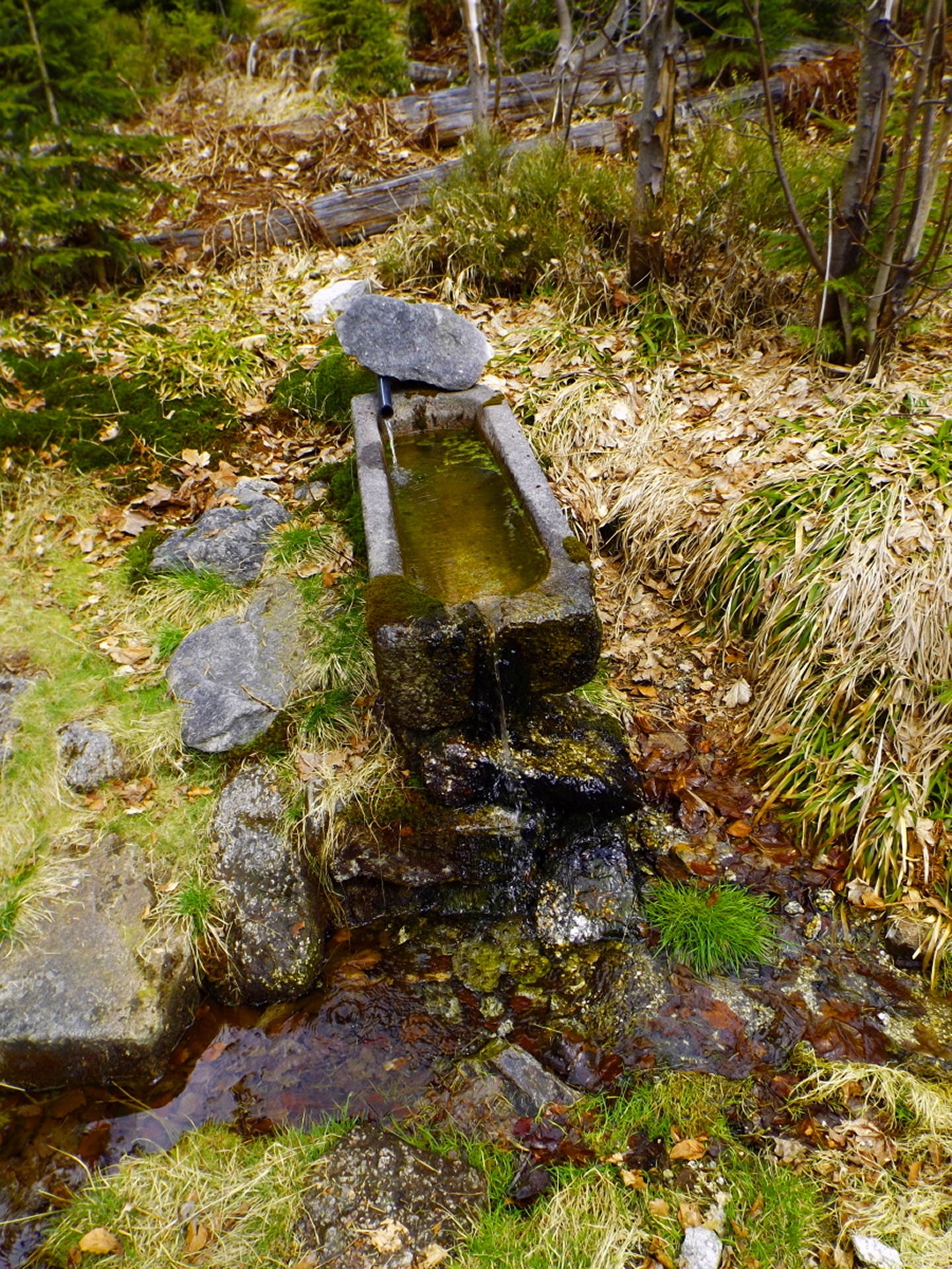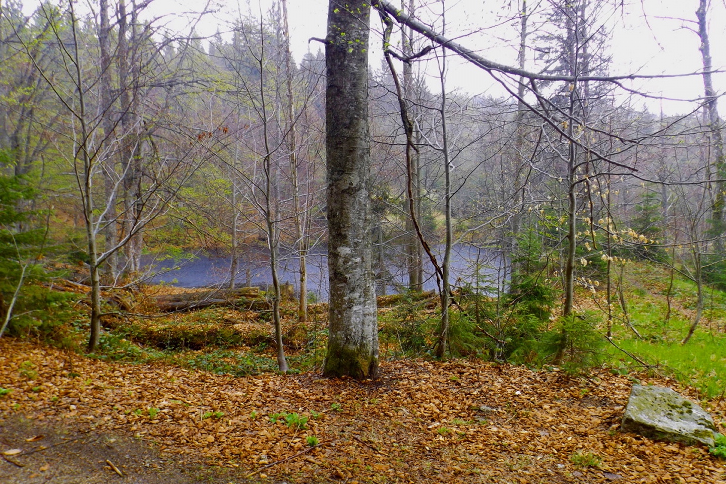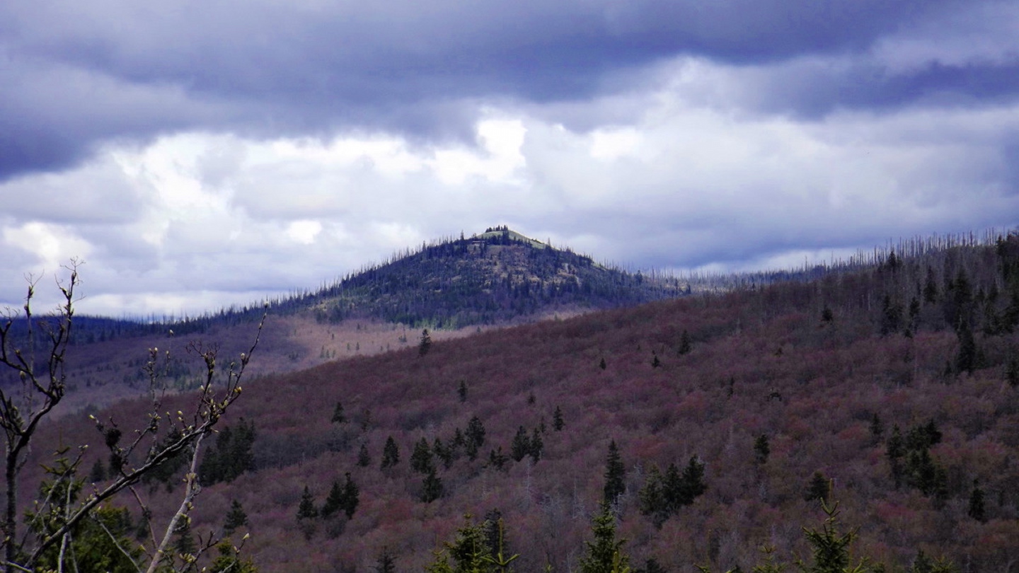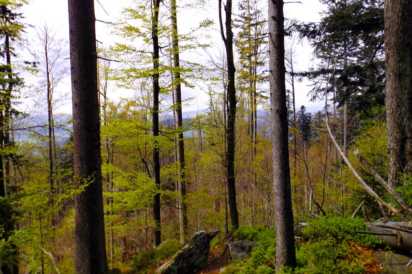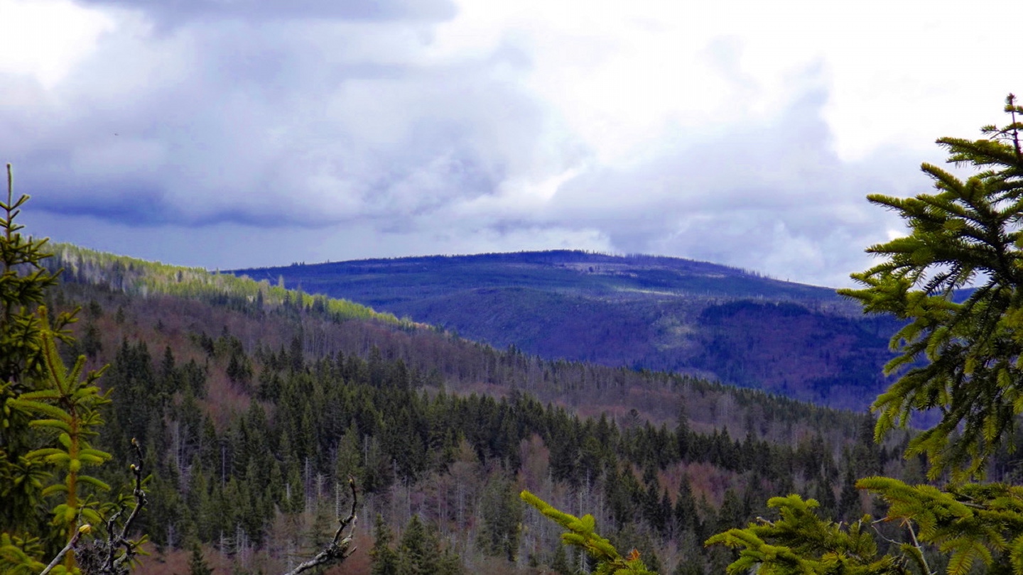 Zunächst folgte ich den Wegweisern Richtung Felsenwandergebiet nach Osten, was gleich einmal die erste Steintreppe bedeutete. Zu diesem Zeitpunkt kein Problem, es war zwar sehr bewölkt, aber trocken. Nach nicht einmal drei Minuten war ich an der ersten Abzweigung, wo ich dem Weg nach rechts folgte, während es geradeaus auf kürzerem Weg zur Steinbachklause und nach Mauth geht, und hatte bereits fünf Fotos geschossen. Durch den Urwald geht es in mäßiger Steigung zum ersten Gipfelchen des Tages, dem Ochsenriegel, wo ein Bankerl zum Rasten einladen würde, aber doch nicht nach gerade mal 16 Minuten! Ein Pärchen, das kurz vor mir losmarschiert war, hatte andere Prioritäten oder konditionelle Gegebenheiten und machte es sich gemütlich, ließ mich aber erst noch ein Gipfelfoto schießen. Weiter ging es an der am Hirschberg liegenden Ochsenriegel-Schutzhütte vorbei. Warum die Schutzhütte einen halben Kilometer von ihrem Namensgeber entfernt liegt, wissen nur die Nationalparkbeamten, es ist nicht das einzige nicht ganz nachvollziehbare Detail, über das ich an diesem Tag stolperte. An der Schutzhütte können Familien mit kleinen Kindern links abbiegen, um die superkurze Runde zu vollenden, alle anderen gehen geradeaus weiter und kommen nach zehn weiteren Minuten und leichter Steigung zum Eingang in die Felswanderzone. Diese trägt ihren Namen nicht ganz zu Unrecht, denn der Pfad windet sich um mehrere Felsformationen, der Boden ist auch nicht mehr so waldig wie vorher und mittendrin überschreitet man auch die Kleine Kanzel, die zwar ein paar Meter höher ist als ihr „Großes“ Pendant, aber bei weitem nicht so markant. Ihr höchster Punkt ist ebenso wenig zugänglich wie der in einigen Beschreibungen angekündigte Aussichtspunkt 960 mit Blick zum Rachel. Während bei der Kleinen Kanzel etwas Kletterei durch Gestrüpp nötig wäre, sind die Stufen zu Punkt 960 noch gut erkennbar, der Weg aber total mit Windwurf verlegt und deshalb auch der Wegweiser abmontiert. Es hätte wohl gegen die Philosophie des Nationalparks verstossen, den Windwurf zu beseitigen und den Aussichtspunkt wieder zugänglich zu machen. Von mir aus. Noch vor der Kleinen Kanzel zieht von rechts ein Wanderweg herauf, der etwas verwirrend beschildert ist, es ist zunächst nicht ganz klar, wie man den Felswandergebiet-Rundweg denn gehen soll. Richtig ist geradeaus, anders kommt man am Parkplatz südlich des Gebiets heraus und hat nur 180 zusätzliche Höhenmeter in den Beinen, aber bezüglich der Runde nichts gewonnen. Nach einigen Kurven und Abzweigungen erreicht man einen Grenzstein und Schilderbaum, an dem ich mich nach links wandte, um die Steinbachklause und die Große Kanzel anzuvisieren. Der Weg wird jetzt wieder breiter und ebener, nach 200 Metern kann man entweder geradeaus weiterlaufen, um zum Seefilz und zur Steinbachklause zu kommen, oder aber rechts Richtung Mauth abbiegen und die Große Kanzel mitnehmen. Dieser Abstecher ist durchaus lohnend, denn die Aussicht nach Süden und Westen kann sehr schön sein. Allerdings sollte man den Aufstieg zur Großen Kanzel nicht mit Turnschuhen versuchen, er ist an einer Stelle etwas ausgesetzt und im Gipfelbereich muss man ein bisserl klettern, deshalb auch die Bewertung mit T2 und I. Nach einer Gipfelbrotzeit und einem netten Gespräch mit zwei Jungs aus Cham ging ich zurück zur Abzweigung und folgte dem Weg hinunter zum Seefilz, wo man herauskommt, wenn man an der ersten Abzweigung geradeaus geht und bog dort rechts ab Richtung Steinbachklause. Diese liegt im Winter im Sperrgebiet, die Beschilderung der Wildruhezone wurde netterweise bereits abmontiert, obwohl der 1. Mai noch ein paar Tage entfernt ist. An der Steinbachklause muss man etwas aufpassen, um den richtigen Weg zu finden, er geht etwas versteckt rechts an der Hütte vorbei, die Goldsteig-Beschilderung am Giebel ist aber normalerweise nicht zu übersehen. Jetzt geht es in einem Bogen durch den Wald, wird stellenweise etwas steiler, aber nie unangenehm. Nach 40 Minuten erreichte ich die Einmündung in die Forststraße zum Tummelplatz, einem früheren Schachten, den ich nach weiteren 15 Minuten erreicht hatte. Laut Beschilderung an der Steinbachklause hätte ich für diesen Abschnitt fast doppelt so lange brauchen sollen, hatte aber nicht das Gefühl, besonders gerannt zu sein. Von hier aus ist es nicht weit zum Großalmeyerschloss, einem ebenfalls sehr aussichtsreichen Felskopf, dessen Zustieg etwas glitschig war, aber normalerweise T2 nicht überschreitet. Das Gipfelkreuz wurde zu meiner Überraschung weder von der Nationalparkverwaltung noch vom Bayerwaldverein errichtet, sondern von der DAV-Sektion Passau. Da schau her. Ein Gipfelbuch suchte ich jedoch ebenso wie an der Großen Kanzel vergeblich, nicht einmal eine Kassette dafür ist vorhanden. Hier begründeten sich erstmals Zweifel daran, ob ich die Tour wirklich komplett schaffen könnte, denn in Böhmen stand eine ziemlich finstere Wolkenwand. Ich ging trotzdem wie geplant auf den Lusensteig, denn erstens stand sie östlich von mir und zweitens gibt es auf der Tummelplatzstraße hinunter zur Sagwassersäge keine Unterstandsmöglichkeit, während neben dem Lusenschutzhaus auch noch das Hütterl bei der Sagwasserklause im Abstieg geeignet ist, einen Regenschauer auszusitzen. Der Lusensteig führt ohne nennenswerten Höhengewinn oder auch -verlust am Westhang des Sulzriegels entlang und glänzt durch jede Menge Abwechslung. Mal ein breiter Waldweg, dann wieder ein schmaler Bergpfad, zwischendurch Bachbett, es ist fast alles geboten. 45 Minuten nach dem Tummelplatz kam ich zur letzten Abzweigung, an der es entweder schräg rechts hinauf zum Lusen geht oder aber schräg links hinunter ins Sagwassertal. Ein Blick nach Osten und die schwarze Wolkenwand stand über dem Sulzriegel. Ich hätte es zwar wohl bis zum Schutzhaus geschafft und den Regenguss dort aussitzen können, aber hätte es danach zwei Stunden bis zum nächsten ausgehalten? Mein Bauchgefüh