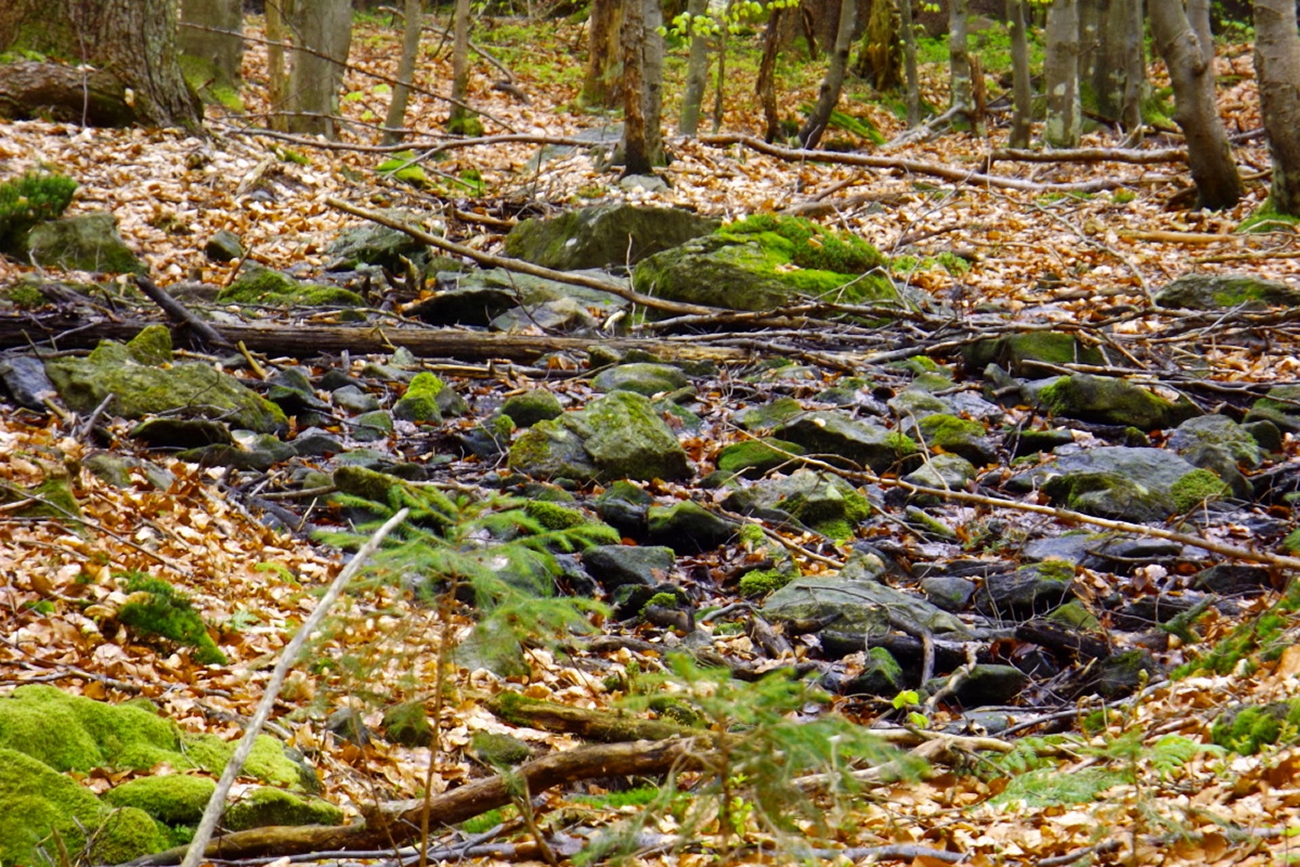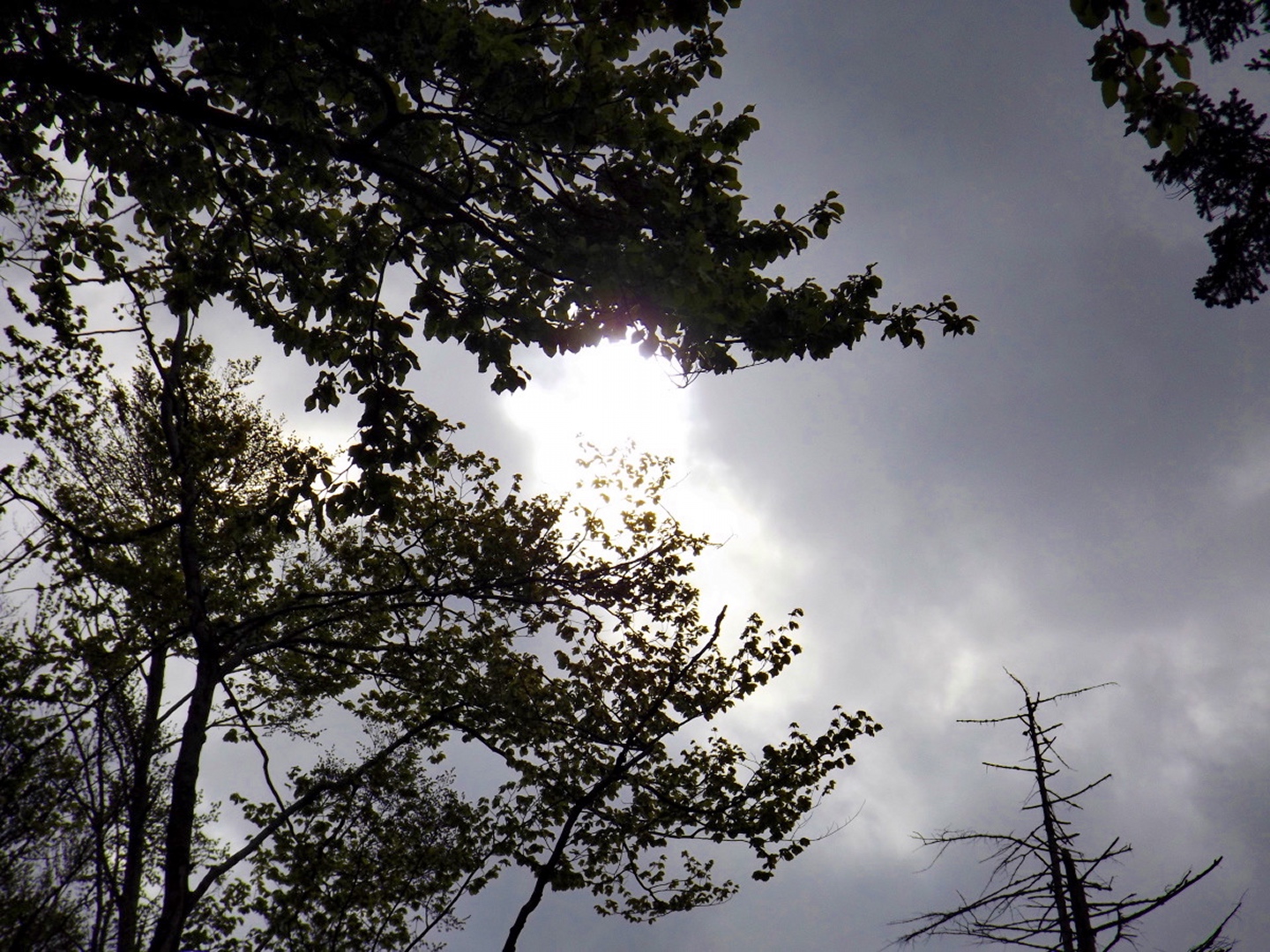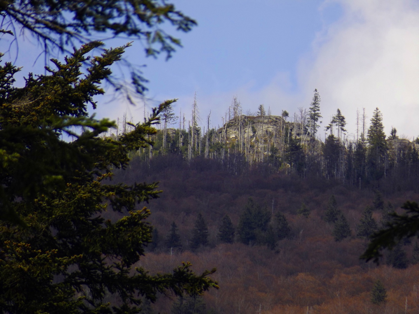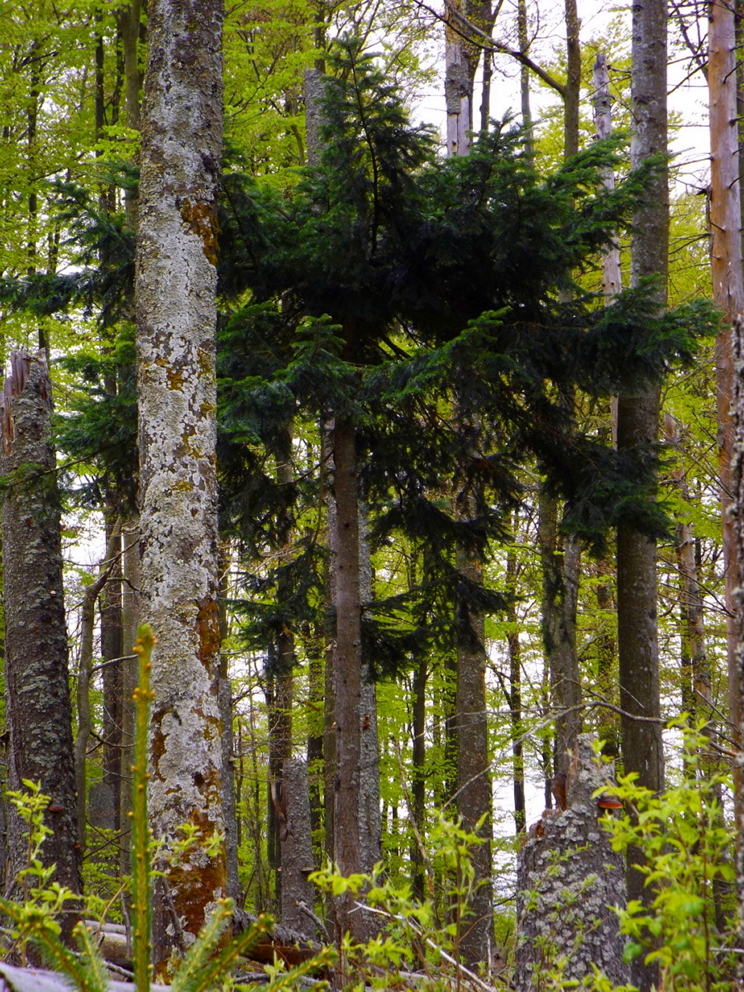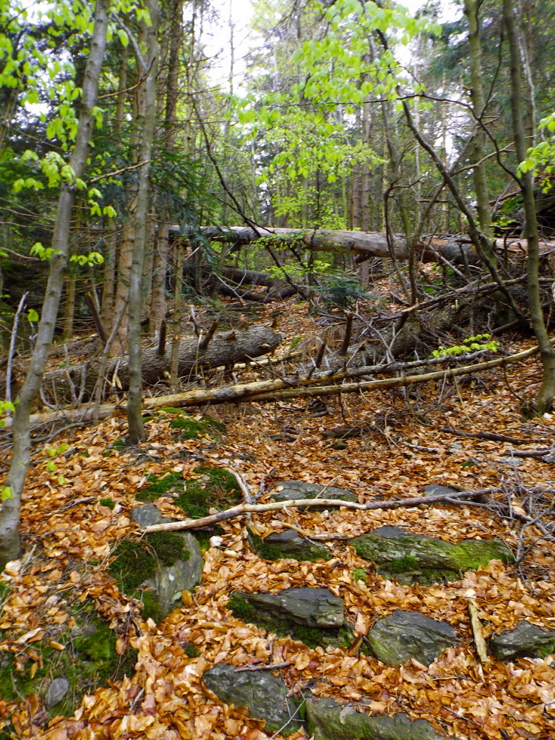 Zunächst folgte ich den Wegweisern Richtung Felsenwandergebiet nach Osten, was gleich einmal die erste Steintreppe bedeutete. Zu diesem Zeitpunkt kein Problem, es war zwar sehr bewölkt, aber trocken. Nach nicht einmal drei Minuten war ich an der ersten Abzweigung, wo ich dem Weg nach rechts folgte, während es geradeaus auf kürzerem Weg zur Steinbachklause und nach Mauth geht, und hatte bereits fünf Fotos geschossen. Durch den Urwald geht es in mäßiger Steigung zum ersten Gipfelchen des Tages, dem Ochsenriegel, wo ein Bankerl zum Rasten einladen würde, aber doch nicht nach gerade mal 16 Minuten! Ein Pärchen, das kurz vor mir losmarschiert war, hatte andere Prioritäten oder konditionelle Gegebenheiten und machte es sich gemütlich, ließ mich aber erst noch ein Gipfelfoto schießen. Weiter ging es an der am Hirschberg liegenden Ochsenriegel-Schutzhütte vorbei. Warum die Schutzhütte einen halben Kilometer von ihrem Namensgeber entfernt liegt, wissen nur die Nationalparkbeamten, es ist nicht das einzige nicht ganz nachvollziehbare Detail, über das ich an diesem Tag stolperte. An der Schutzhütte können Familien mit kleinen Kindern links abbiegen, um die superkurze Runde zu vollenden, alle anderen gehen geradeaus weiter und kommen nach zehn weiteren Minuten und leichter Steigung zum Eingang in die Felswanderzone. Diese trägt ihren Namen nicht ganz zu Unrecht, denn der Pfad windet sich um mehrere Felsformationen, der Boden ist auch nicht mehr so waldig wie vorher und mittendrin überschreitet man auch die Kleine Kanzel, die zwar ein paar Meter höher ist als ihr „Großes“ Pendant, aber bei weitem nicht so markant. Ihr höchster Punkt ist ebenso wenig zugänglich wie der in einigen Beschreibungen angekündigte Aussichtspunkt 960 mit Blick zum Rachel. Während bei der Kleinen Kanzel etwas Kletterei durch Gestrüpp nötig wäre, sind die Stufen zu Punkt 960 noch gut erkennbar, der Weg aber total mit Windwurf verlegt und deshalb auch der Wegweiser abmontiert. Es hätte wohl gegen die Philosophie des Nationalparks verstossen, den Windwurf zu beseitigen und den Aussichtspunkt wieder zugänglich zu machen. Von mir aus. Noch vor der Kleinen Kanzel zieht von rechts ein Wanderweg herauf, der etwas verwirrend beschildert ist, es ist zunächst nicht ganz klar, wie man den Felswandergebiet-Rundweg denn gehen soll. Richtig ist geradeaus, anders kommt man am Parkplatz südlich des Gebiets heraus und hat nur 180 zusätzliche Höhenmeter in den Beinen, aber bezüglich der Runde nichts gewonnen. Nach einigen Kurven und Abzweigungen erreicht man einen Grenzstein und Schilderbaum, an dem ich mich nach links wandte, um die Steinbachklause und die Große Kanzel anzuvisieren. Der Weg wird jetzt wieder breiter und ebener, nach 200 Metern kann man entweder geradeaus weiterlaufen, um zum Seefilz und zur Steinbachklause zu kommen, oder aber rechts Richtung Mauth abbiegen und die Große Kanzel mitnehmen. Dieser Abstecher ist durchaus lohnend, denn die Aussicht nach Süden und Westen kann sehr schön sein. Allerdings sollte man den Aufstieg zur Großen Kanzel nicht mit Turnschuhen versuchen, er ist an einer Stelle etwas ausgesetzt und im Gipfelbereich muss man ein bisserl klettern, deshalb auch die Bewertung mit T2 und I. Nach einer Gipfelbrotzeit und einem netten Gespräch mit zwei Jungs aus Cham ging ich zurück zur Abzweigung und folgte dem Weg hinunter zum Seefilz, wo man herauskommt, wenn man an der ersten Abzweigung geradeaus geht und bog dort rechts ab Richtung Steinbachklause. Diese liegt im Winter im Sperrgebiet, die Beschilderung der Wildruhezone wurde netterweise bereits abmontiert, obwohl der 1. Mai noch ein paar Tage entfernt ist. An der Steinbachklause muss man etwas aufpassen, um den richtigen Weg zu finden, er geht etwas versteckt rechts an der Hütte vorbei, die Goldsteig-Beschilderung am Giebel ist aber normalerweise nicht zu übersehen. Jetzt geht es in einem Bogen durch den Wald, wird stellenweise etwas steiler, aber nie unangenehm. Nach 40 Minuten erreichte ich die Einmündung in die Forststraße zum Tummelplatz, einem früheren Schachten, den ich nach weiteren 15 Minuten erreicht hatte. Laut Beschilderung an der Steinbachklause hätte ich für diesen Abschnitt fast doppelt so lange brauchen sollen, hatte aber nicht das Gefühl, besonders gerannt zu sein. Von hier aus ist es nicht weit zum Großalmeyerschloss, einem ebenfalls sehr aussichtsreichen Felskopf, dessen Zustieg etwas glitschig war, aber normalerweise T2 nicht überschreitet. Das Gipfelkreuz wurde zu meiner Überraschung weder von der Nationalparkverwaltung noch vom Bayerwaldverein errichtet, sondern von der DAV-Sektion Passau. Da schau her. Ein Gipfelbuch suchte ich jedoch ebenso wie an der Großen Kanzel vergeblich, nicht einmal eine Kassette dafür ist vorhanden. Hier begründeten sich erstmals Zweifel daran, ob ich die Tour wirklich komplett schaffen könnte, denn in Böhmen stand eine ziemlich finstere Wolkenwand. Ich ging trotzdem wie geplant auf den Lusensteig, denn erstens stand sie östlich von mir und zweitens gibt es auf der Tummelplatzstraße hinunter zur Sagwassersäge keine Unterstandsmöglichkeit, während neben dem Lusenschutzhaus auch noch das Hütterl bei der Sagwasserklause im Abstieg geeignet ist, einen Regenschauer auszusitzen. Der Lusensteig führt ohne nennenswerten Höhengewinn oder auch -verlust am Westhang des Sulzriegels entlang und glänzt durch jede Menge Abwechslung. Mal ein breiter Waldweg, dann wieder ein schmaler Bergpfad, zwischendurch Bachbett, es ist fast alles geboten. 45 Minuten nach dem Tummelplatz kam ich zur letzten Abzweigung, an der es entweder schräg rechts hinauf zum Lusen geht oder aber schräg links hinunter ins Sagwassertal. Ein Blick nach Osten und die schwarze Wolkenwand stand über dem Sulzriegel. Ich hätte es zwar wohl bis zum Schutzhaus geschafft und den Regenguss dort aussitzen können, aber hätte es danach zwei Stunden bis zum nächsten ausgehalten? Mein Bauchgefüh