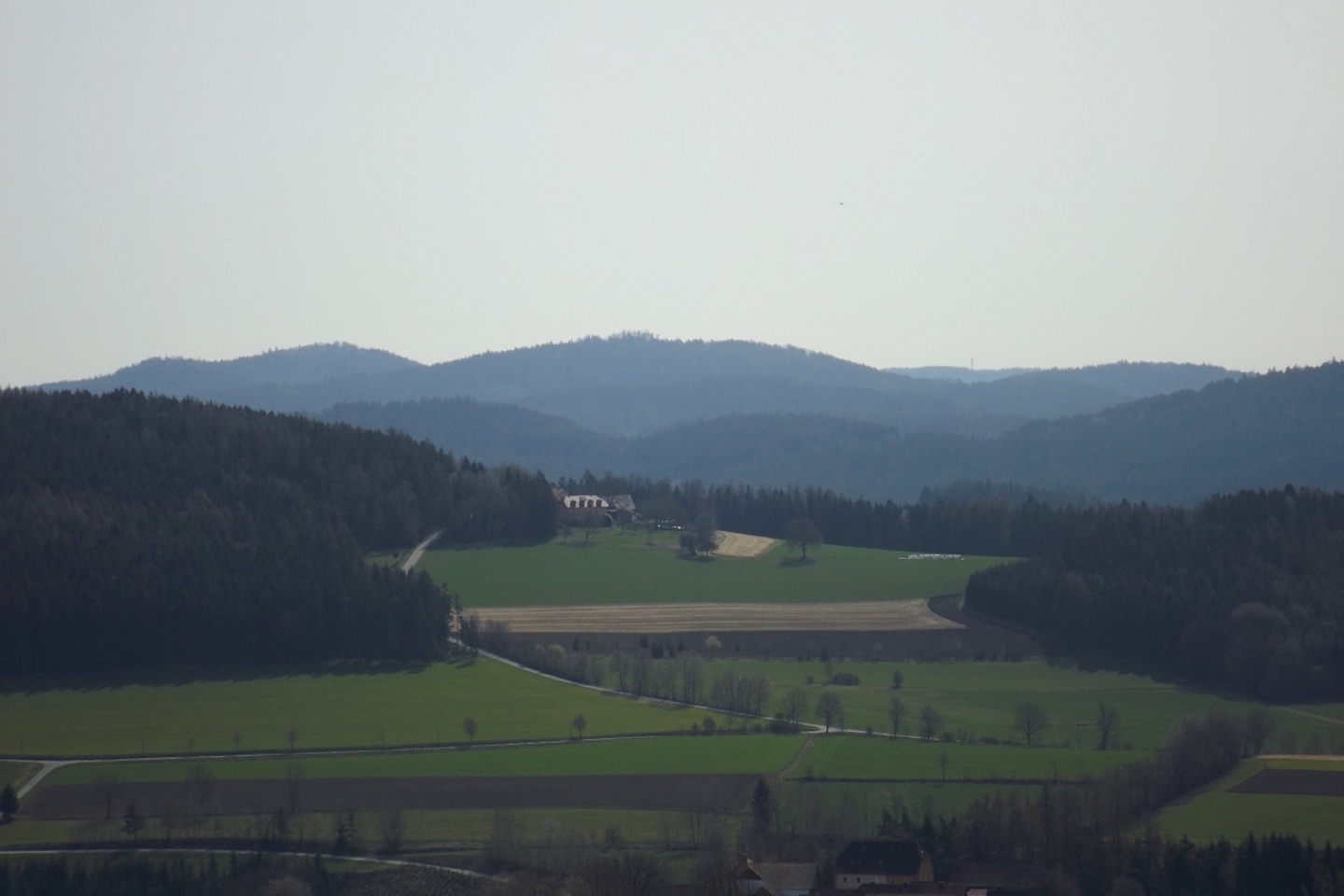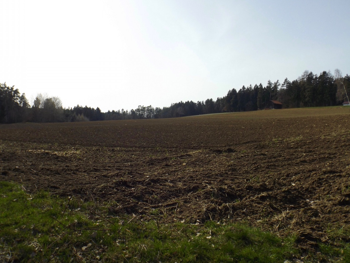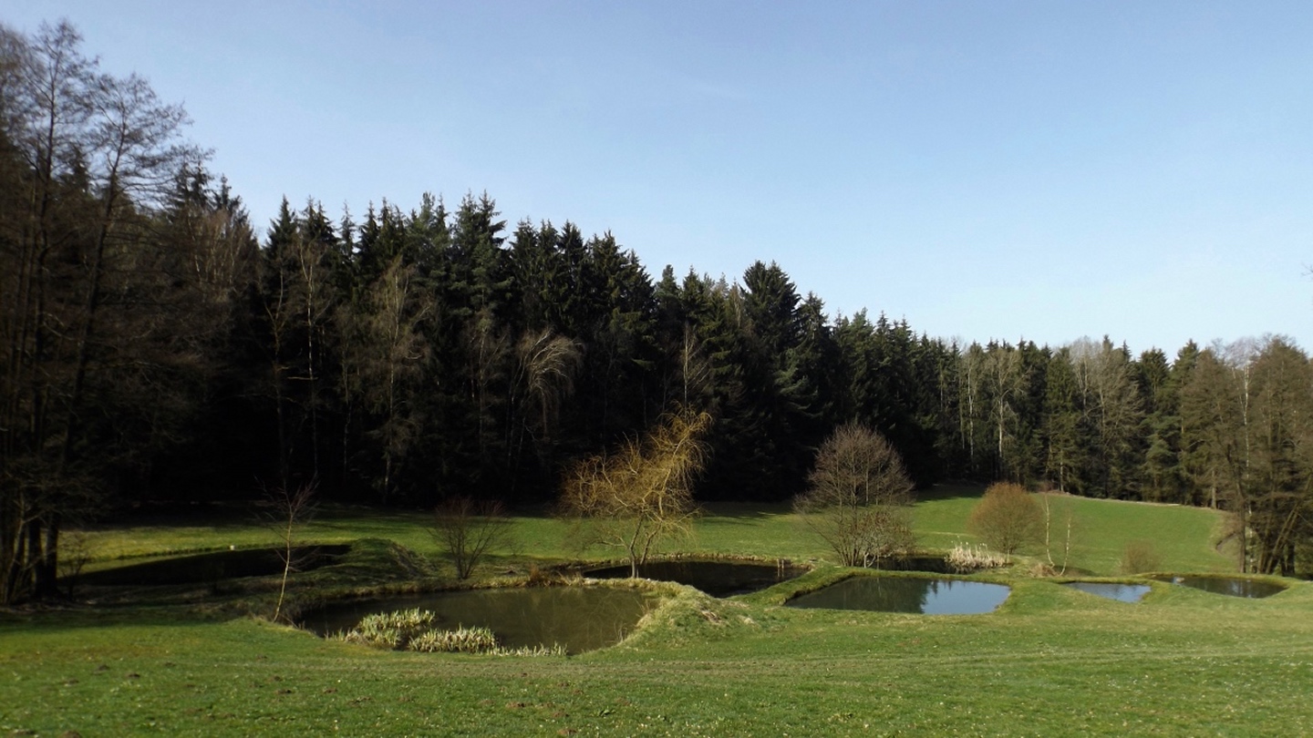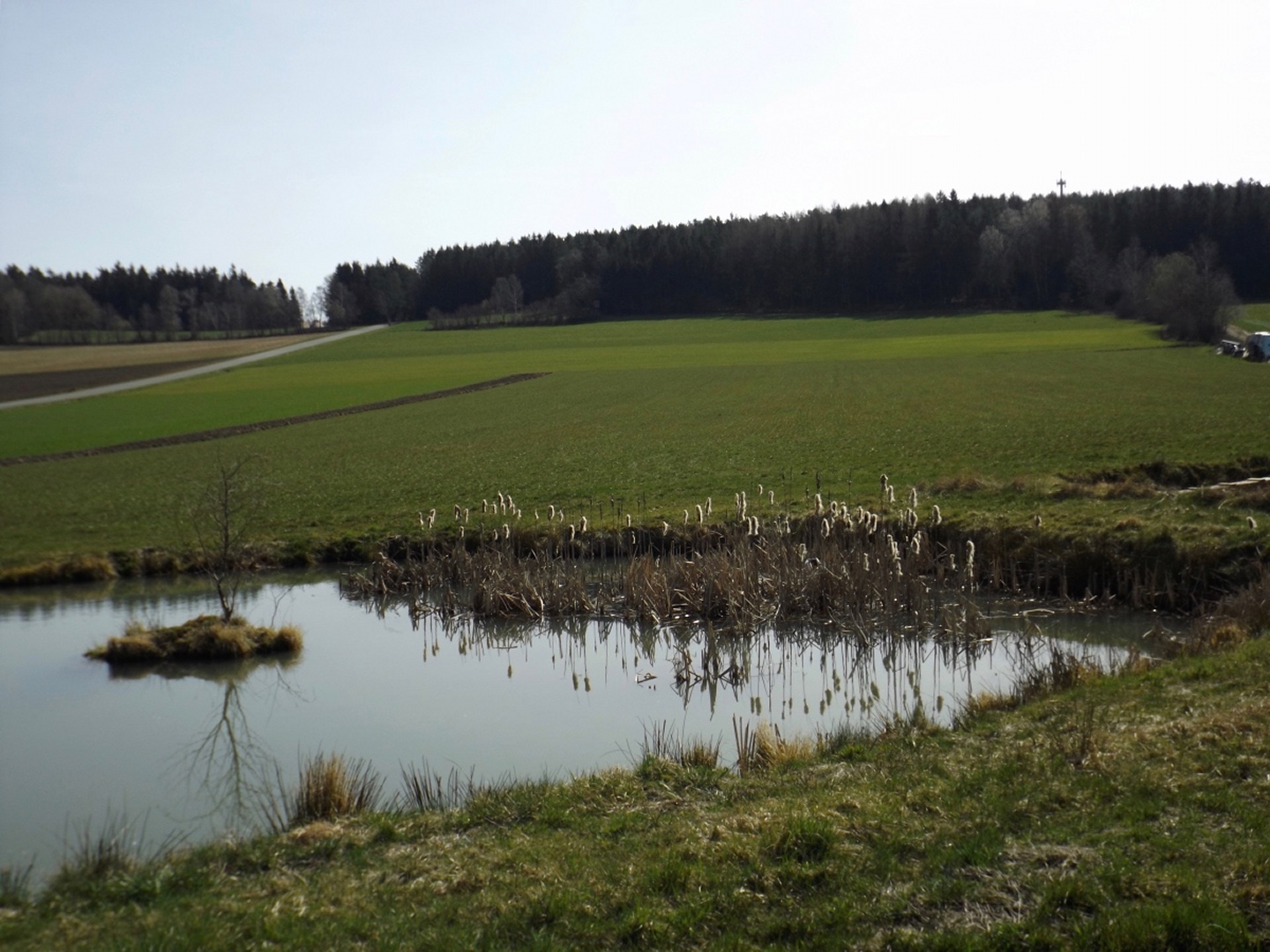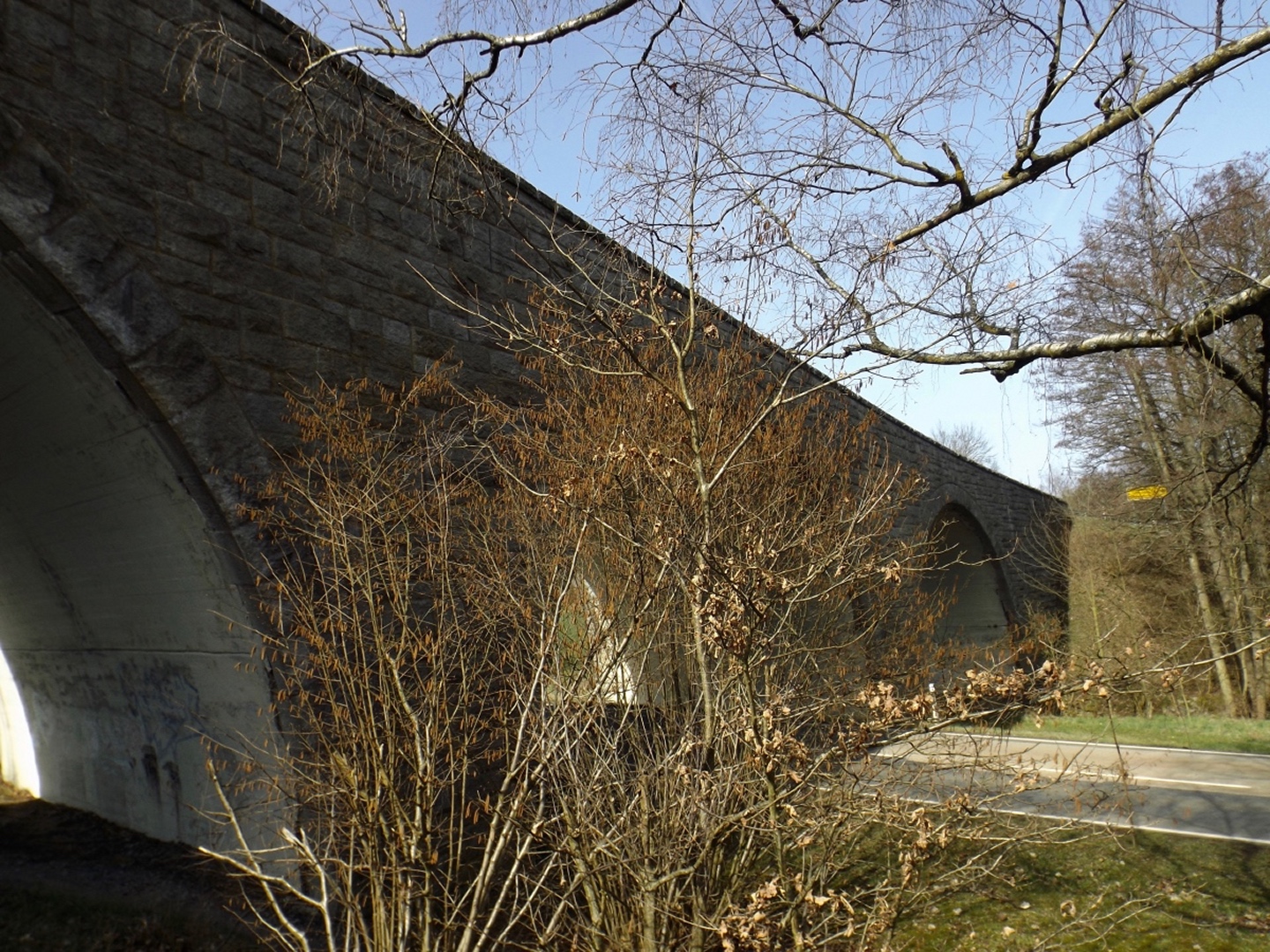 Die Strecke sei an dieser Stelle nur kurz umrissen, denn ganz unten ist ja eine Übersichtskarte angefügt. Es ging von der Mehrzweckhalle hinunter zum ehemaligen Bahnhof und von dort hinaus Richtung Niedermurach und bald den Berg hinauf Richtung Obermurach. Auf halber Höhe folgte die erste Stempel- und Suppenstation, an der wir uns von den Kurzstreckengängern verabschiedeten. Die Absolventen der Zehn-Kilometer-Variante verließen mich dann am Ortseingang von Obermurach, hätte ich gewusst, dass die Strecke kürzer ist, hätte ich wohl der Ruine Haus Murach den Besuch abgestattet, der vor ein paar Wochen mangels Schlüssel nicht möglich war, denn es waren eindeutig Personen im Burggelände zu sehen. So blieb ich auf der langen Strecke, die auf dem Goldsteig über den Kätzlesberg führte. Dieser stand, wenn auch ohne besonders hohe Priorität, auf meiner To-do-Liste in der Open-Office-Datei und ist dort ab jetzt als erledigt markiert. Kurz vor dem höchsten Punkt kam mir eine junge Dame mit zwei Pferden entgegen und wollte von mir wissen, wo man denn hinkommt. Auf meine Auskunft hin drehte sie um und suchte nach einem anderen Weg dorthin, wo sie hinwollte, da ihr der Weg über Obermurach zu weit und zu asphaltlastig war. Sie sollte mir später noch zwei Mal begegnen. Irgendwann endet jeder Kamm und so war es auch dieses Mal, unsere Strecke verließ den Wald beim Hauserlohhof und führte über die Staatsstraße und durch noch mehr Wald hinunter ins Aschatal, wo in Hohenthal die zweite Stempelstelle eingerichtet war. Dort pausierte ich für die mitgebrachte Schinkensemmel (die obligatorischen Apfelvierterln verteilten sich wie immer über den ganzen Tag), bevor es auf der anderen Talseite hinauf nach Zengeröd und über Untereppenried hinauf zum Johannisberg ging. Dieser hat mit seinem Namenskollegen bei Freudenberg eigentlich nur die Existenz einer Wallfahrtskirche gemeinsam, wobei es da bereits einen gewaltigen Altersunterschied gibt. Auf diesem Wegabschnitt gab es ein hin und her in Sachen Überholen mit zwei älteren Herren aus Zirndorf, es blieb aber freundschaftlich. Die Strecke war speziell hier sehr abwechslungsreich, es war für jeden etwas geboten, sogar für die Freunde des gepflegten Gestrüppkampfes. Der Abstieg vom Johannisberg folgte erst einmal dem Kreuzweg, nach der Unterquerung der Ostmarkstraße bog die Strecke jedoch noch einmal ab und führte vorbei an Tressenried, um noch ein paar hundert Meter Länge zu gewinnen. Am Ende plätscherte die Wanderung wieder auf der Bahnstrecke aus, bevor sie durch eine kleine Auenlandschaft zurück zur Mehrzweckhalle führte. Dort bedankte ich mich bei den Organisatoren und verhalf wie bereits erwähnt den Wanderfreunden noch zu etwas Verpflegungsumsatz, bevor ich mich nach Nabburg aufmachte.