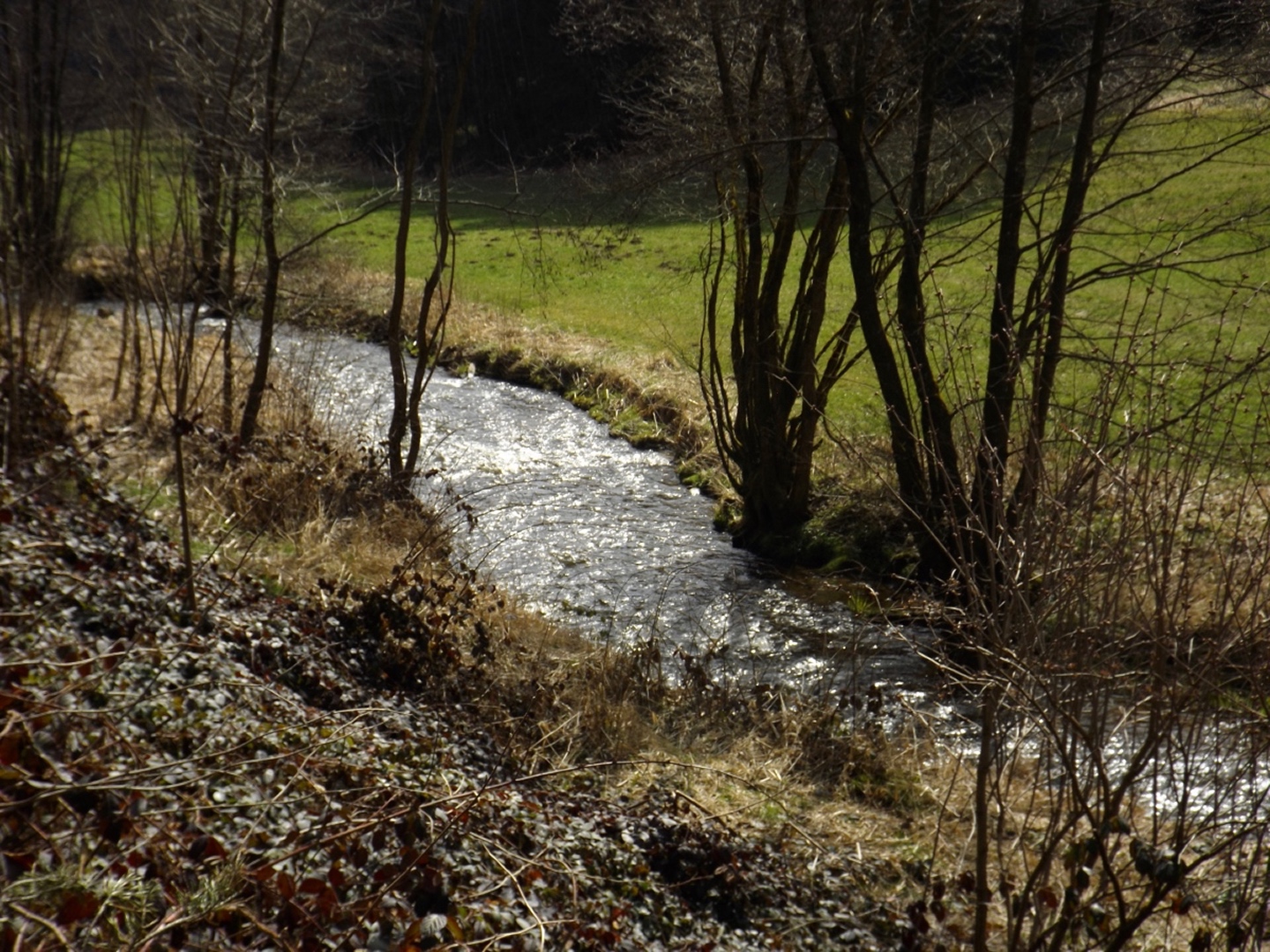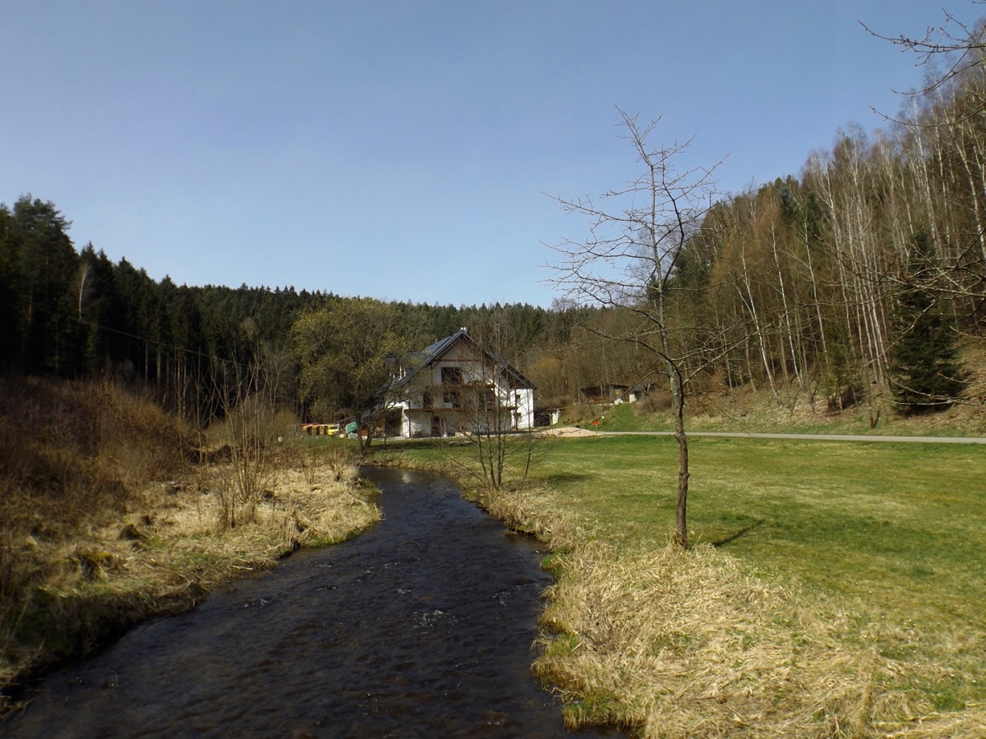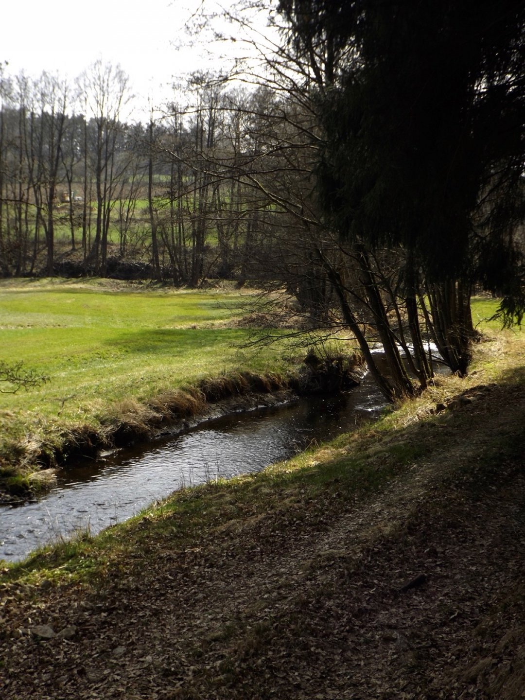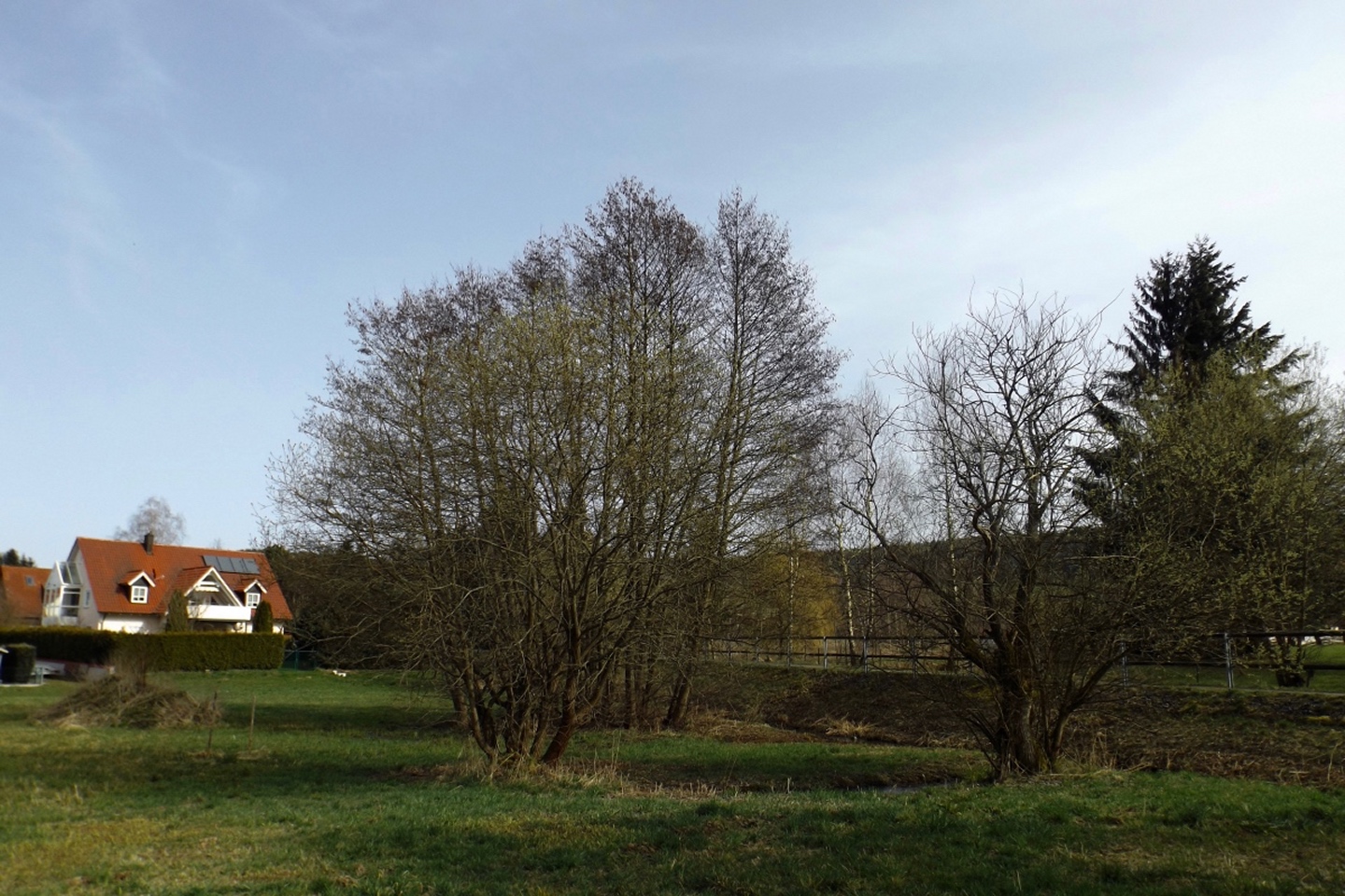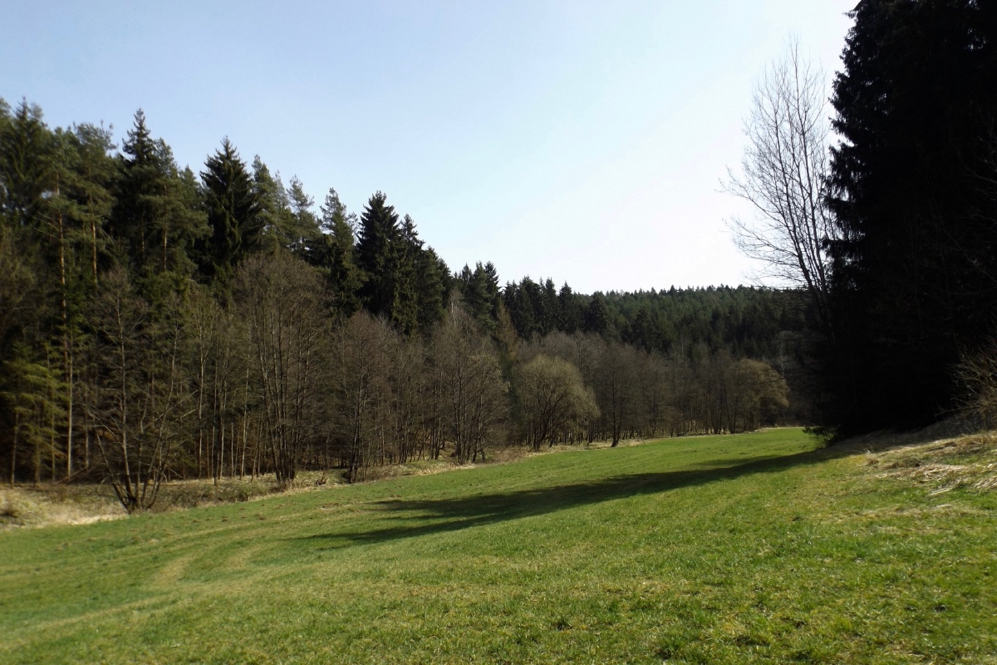 Die Strecke sei an dieser Stelle nur kurz umrissen, denn ganz unten ist ja eine Übersichtskarte angefügt. Es ging von der Mehrzweckhalle hinunter zum ehemaligen Bahnhof und von dort hinaus Richtung Niedermurach und bald den Berg hinauf Richtung Obermurach. Auf halber Höhe folgte die erste Stempel- und Suppenstation, an der wir uns von den Kurzstreckengängern verabschiedeten. Die Absolventen der Zehn-Kilometer-Variante verließen mich dann am Ortseingang von Obermurach, hätte ich gewusst, dass die Strecke kürzer ist, hätte ich wohl der Ruine Haus Murach den Besuch abgestattet, der vor ein paar Wochen mangels Schlüssel nicht möglich war, denn es waren eindeutig Personen im Burggelände zu sehen. So blieb ich auf der langen Strecke, die auf dem Goldsteig über den Kätzlesberg führte. Dieser stand, wenn auch ohne besonders hohe Priorität, auf meiner To-do-Liste in der Open-Office-Datei und ist dort ab jetzt als erledigt markiert. Kurz vor dem höchsten Punkt kam mir eine junge Dame mit zwei Pferden entgegen und wollte von mir wissen, wo man denn hinkommt. Auf meine Auskunft hin drehte sie um und suchte nach einem anderen Weg dorthin, wo sie hinwollte, da ihr der Weg über Obermurach zu weit und zu asphaltlastig war. Sie sollte mir später noch zwei Mal begegnen. Irgendwann endet jeder Kamm und so war es auch dieses Mal, unsere Strecke verließ den Wald beim Hauserlohhof und führte über die Staatsstraße und durch noch mehr Wald hinunter ins Aschatal, wo in Hohenthal die zweite Stempelstelle eingerichtet war. Dort pausierte ich für die mitgebrachte Schinkensemmel (die obligatorischen Apfelvierterln verteilten sich wie immer über den ganzen Tag), bevor es auf der anderen Talseite hinauf nach Zengeröd und über Untereppenried hinauf zum Johannisberg ging. Dieser hat mit seinem Namenskollegen bei Freudenberg eigentlich nur die Existenz einer Wallfahrtskirche gemeinsam, wobei es da bereits einen gewaltigen Altersunterschied gibt. Auf diesem Wegabschnitt gab es ein hin und her in Sachen Überholen mit zwei älteren Herren aus Zirndorf, es blieb aber freundschaftlich. Die Strecke war speziell hier sehr abwechslungsreich, es war für jeden etwas geboten, sogar für die Freunde des gepflegten Gestrüppkampfes. Der Abstieg vom Johannisberg folgte erst einmal dem Kreuzweg, nach der Unterquerung der Ostmarkstraße bog die Strecke jedoch noch einmal ab und führte vorbei an Tressenried, um noch ein paar hundert Meter Länge zu gewinnen. Am Ende plätscherte die Wanderung wieder auf der Bahnstrecke aus, bevor sie durch eine kleine Auenlandschaft zurück zur Mehrzweckhalle führte. Dort bedankte ich mich bei den Organisatoren und verhalf wie bereits erwähnt den Wanderfreunden noch zu etwas Verpflegungsumsatz, bevor ich mich nach Nabburg aufmachte.