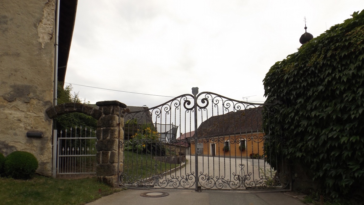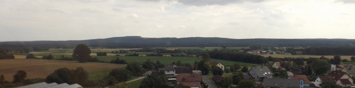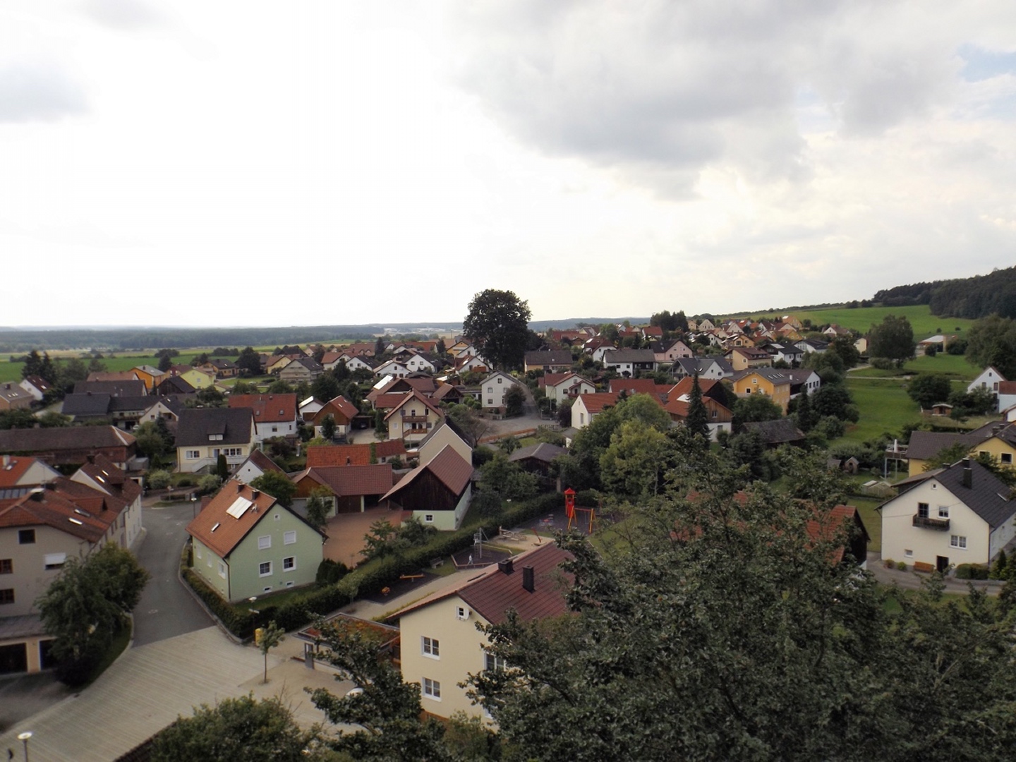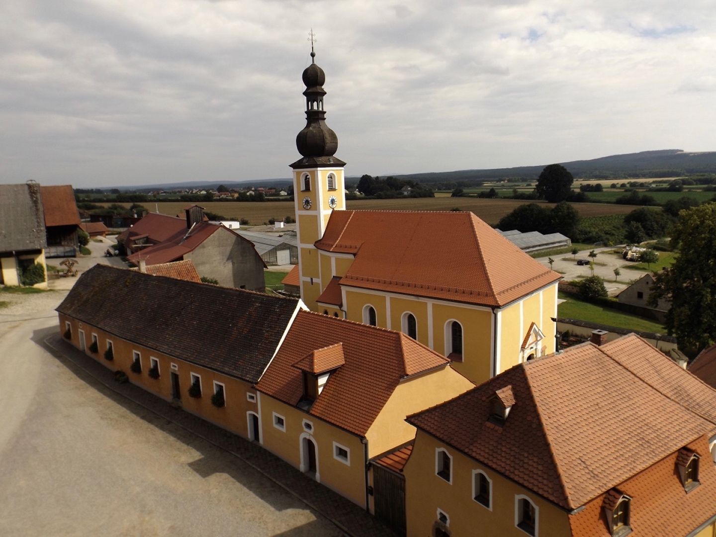 Am Treffpunkt am Volksfestplatz waren wir ein gutes Dutzend Leute, zu denen am Ausgangspunkt in Irrenlohe noch einmal ein paar und Tessa dazukamen. Der Weg folgte zwar nicht so streng dem Fensterbach wie es angekündigt war, aber das war gar nicht so verkehrt, denn direkt am Bach wäre es teilweise recht brennesselig gewesen. Auch nicht angekündigt war das BWW, die Wetterdienste sprachen eher von Dauerniesel, von dem wir bis auf etwa 90 Sekunden in Wohlfest verschont blieben. Dieser kurze Schauer fiel dafür umso heftiger aus. Die Schnapsversorgungsstation lag dieses Mal fast exakt in der Mitte der Strecke, haben Erwin und Josef das wohl vorab ausgemessen? Am Rathaus in Wolfring rannten, naja marschierten, wir entgegen der Ankündigung vorbei, O-Ton: „Da ist sowieso nix Interessantes drin“, und wurden am Kirchplatz von noch einmal einer ganzen Ladung Leuten begrüßt, die direkt zur Führung hingefahren waren. Vor der Führung gab es erst einmal eine Halbe, wobei die Auswahl echt ordentlich war, sogar zwei Arten Zoigl (Hell und Dunkel) vom Kummertbräu. Anschließend gab uns Graf Carl zu Eltz einen Überblick über die Familiengeschichte und die Nutzung seiner Ländereien. Als Höhepunkt durften wir die frisch sanierten, ehemals als Getreidespeicher genutzten oberen Stockwerke des Schloßgebäudes besichtigen. Da war es Ehrensache, dass wir seiner Bitte nachkamen, im Haus nichts zu fotografieren, erst Recht, als er mir erlaubte, aus den Fenstern hinaus Dorf- und Panoramaaufnahmen zu machen. Als alles vorbei war und wir uns auf den Wurstsalat stürzten, erschienen auch noch Marga und Liane, während Max uns zeigte, wie man Hunde (mit denen des Grafen hockten und liefen mittlerweile deren vier rund um uns herum) zu Bettelsäcken verzieht. Viel erfreulicher war, dass Irmi wieder dabei war, auch wenn sie bei der Schnapspause auf Nummer sicher ging und sich zu Erwin ins Auto setzte. Aber ich denke, dass ich in ihrer Situation genauso gehandelt hätte.