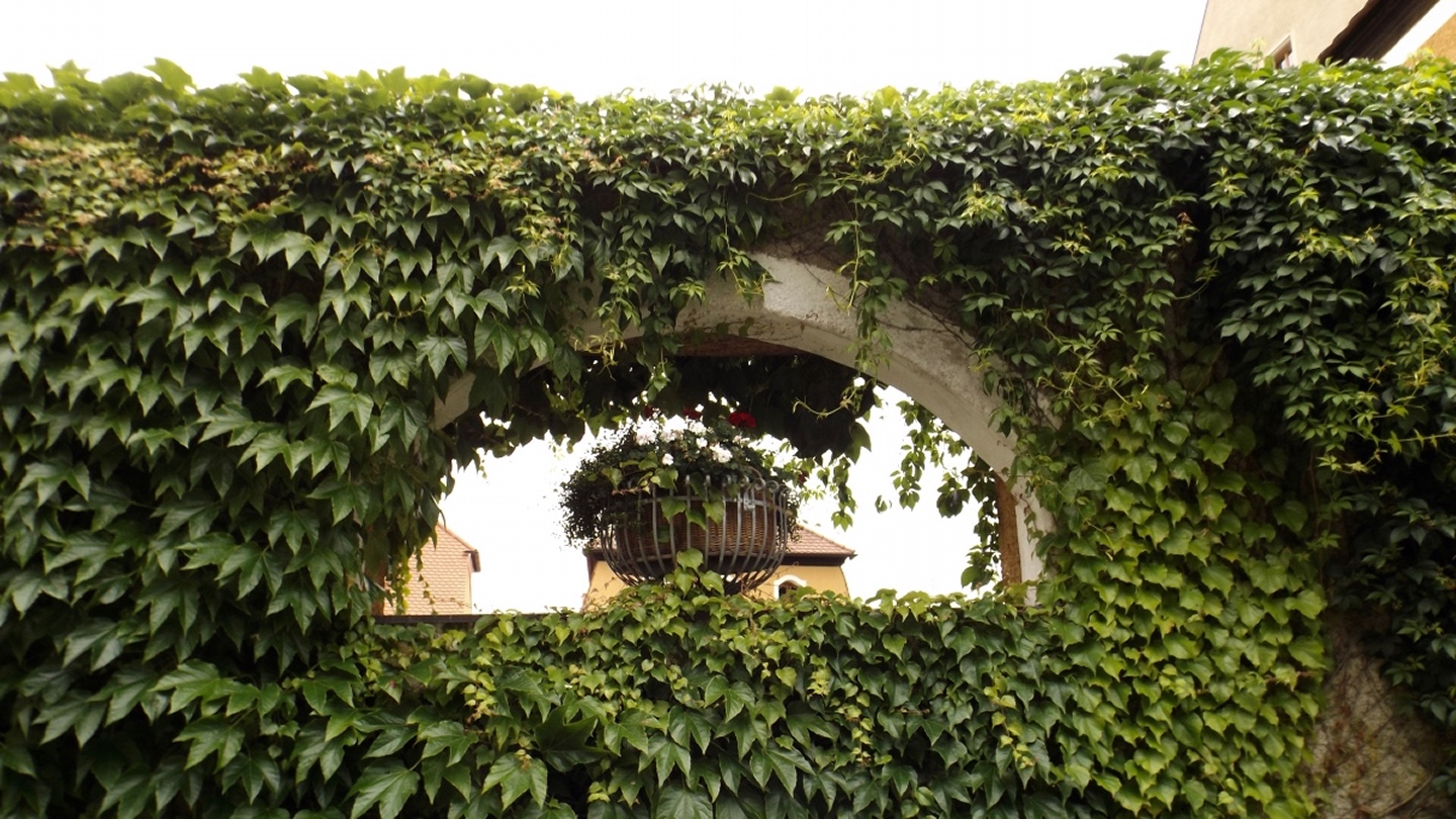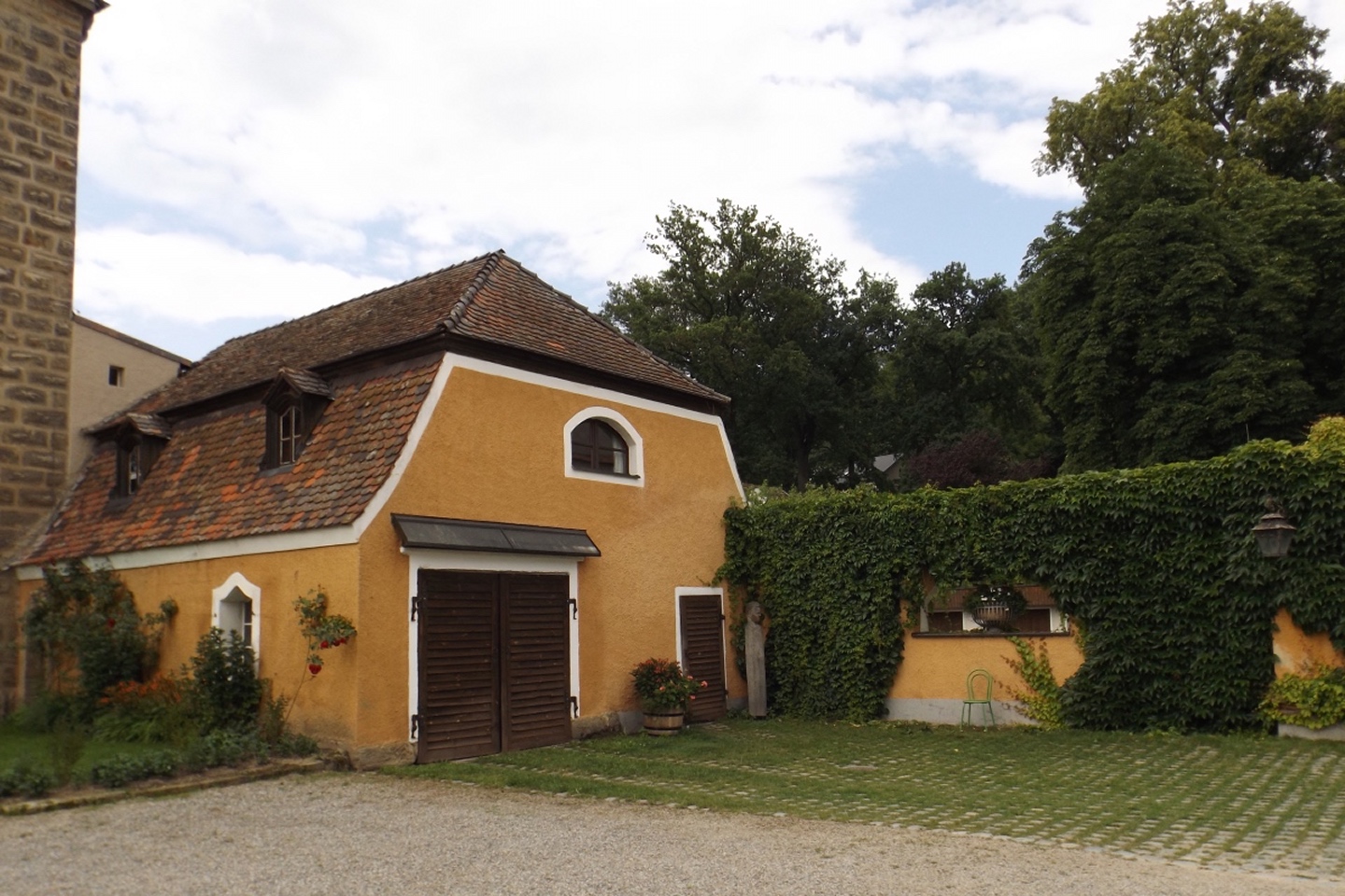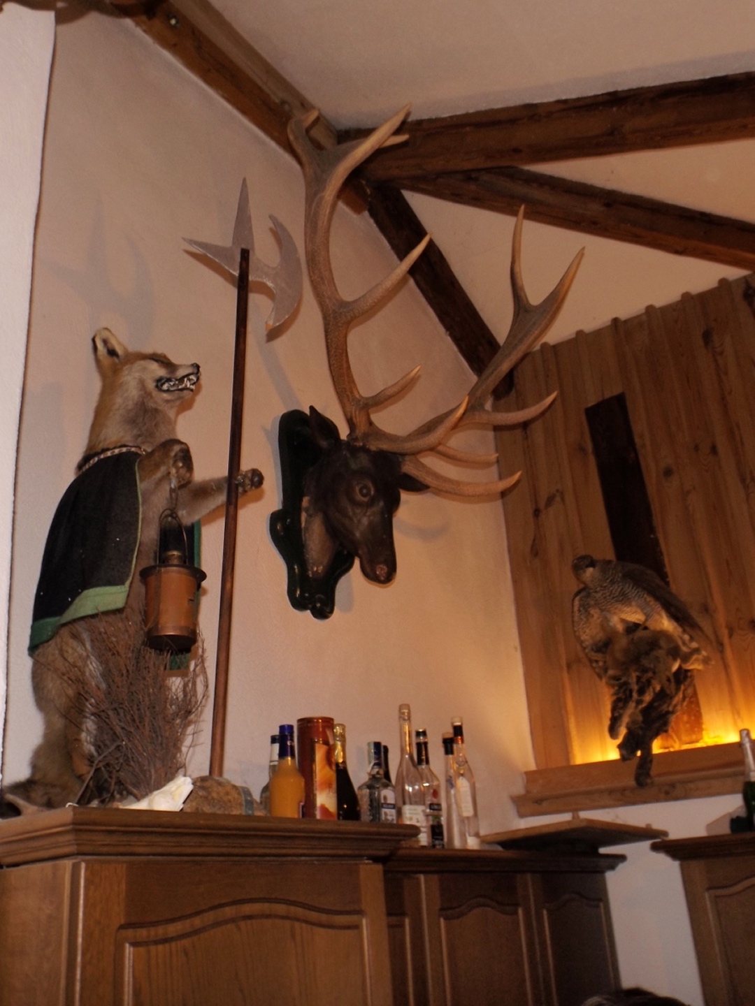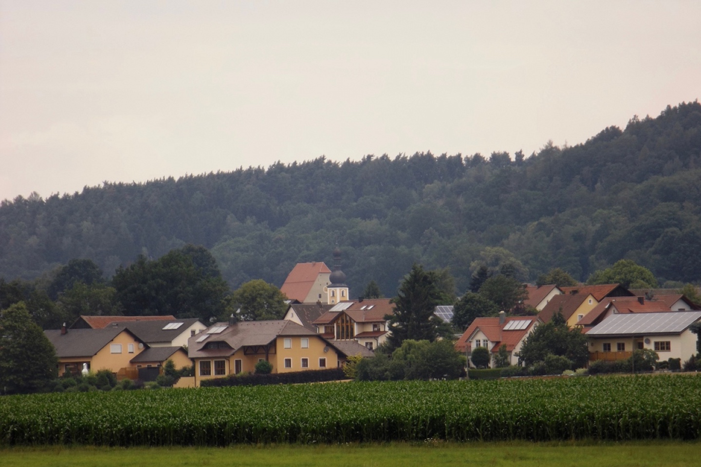 Am Treffpunkt am Volksfestplatz waren wir ein gutes Dutzend Leute, zu denen am Ausgangspunkt in Irrenlohe noch einmal ein paar und Tessa dazukamen. Der Weg folgte zwar nicht so streng dem Fensterbach wie es angekündigt war, aber das war gar nicht so verkehrt, denn direkt am Bach wäre es teilweise recht brennesselig gewesen. Auch nicht angekündigt war das BWW, die Wetterdienste sprachen eher von Dauerniesel, von dem wir bis auf etwa 90 Sekunden in Wohlfest verschont blieben. Dieser kurze Schauer fiel dafür umso heftiger aus. Die Schnapsversorgungsstation lag dieses Mal fast exakt in der Mitte der Strecke, haben Erwin und Josef das wohl vorab ausgemessen? Am Rathaus in Wolfring rannten, naja marschierten, wir entgegen der Ankündigung vorbei, O-Ton: „Da ist sowieso nix Interessantes drin“, und wurden am Kirchplatz von noch einmal einer ganzen Ladung Leuten begrüßt, die direkt zur Führung hingefahren waren. Vor der Führung gab es erst einmal eine Halbe, wobei die Auswahl echt ordentlich war, sogar zwei Arten Zoigl (Hell und Dunkel) vom Kummertbräu. Anschließend gab uns Graf Carl zu Eltz einen Überblick über die Familiengeschichte und die Nutzung seiner Ländereien. Als Höhepunkt durften wir die frisch sanierten, ehemals als Getreidespeicher genutzten oberen Stockwerke des Schloßgebäudes besichtigen. Da war es Ehrensache, dass wir seiner Bitte nachkamen, im Haus nichts zu fotografieren, erst Recht, als er mir erlaubte, aus den Fenstern hinaus Dorf- und Panoramaaufnahmen zu machen. Als alles vorbei war und wir uns auf den Wurstsalat stürzten, erschienen auch noch Marga und Liane, während Max uns zeigte, wie man Hunde (mit denen des Grafen hockten und liefen mittlerweile deren vier rund um uns herum) zu Bettelsäcken verzieht. Viel erfreulicher war, dass Irmi wieder dabei war, auch wenn sie bei der Schnapspause auf Nummer sicher ging und sich zu Erwin ins Auto setzte. Aber ich denke, dass ich in ihrer Situation genauso gehandelt hätte.