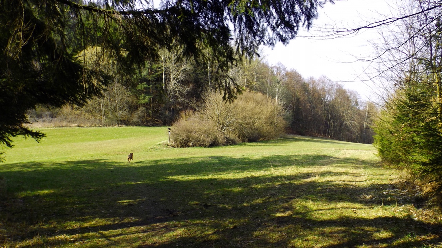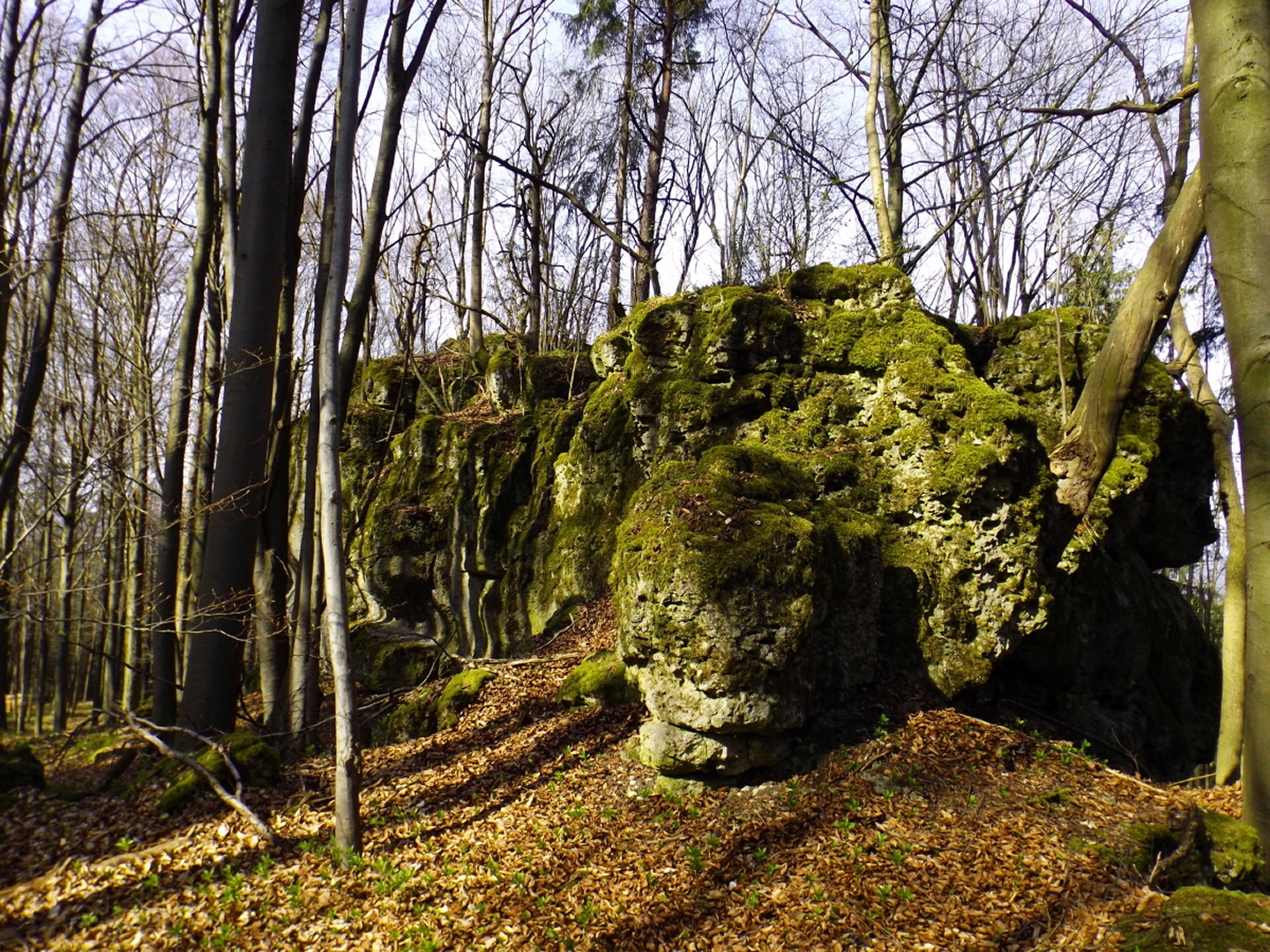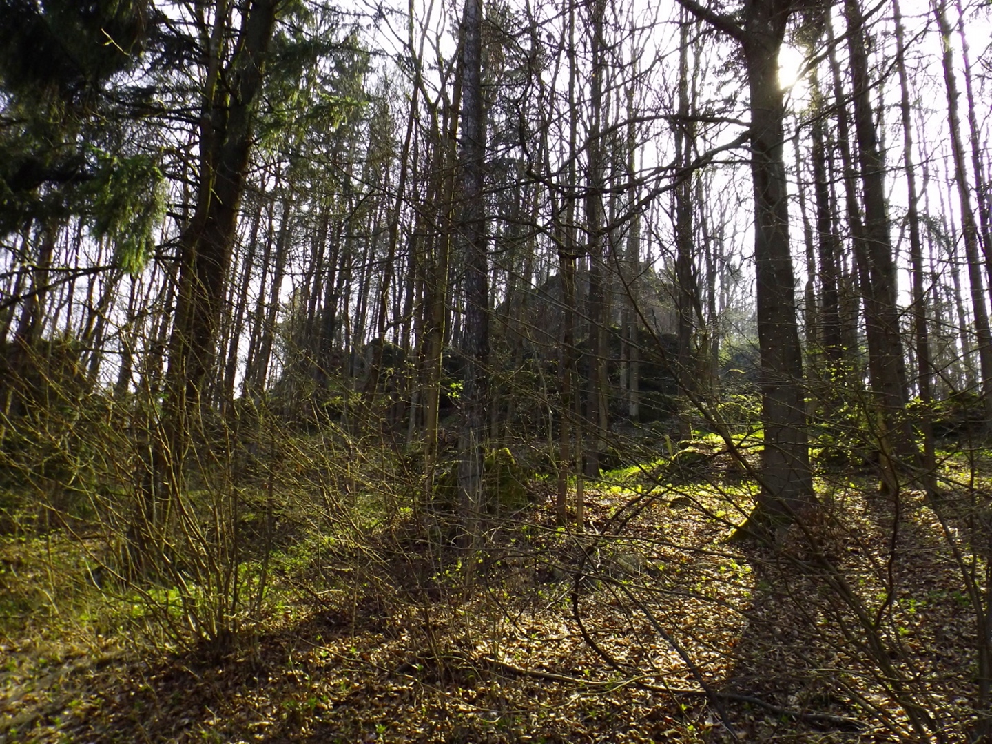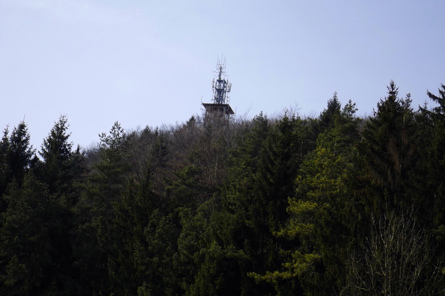 Vom Parkplatz gingen wir an der Absperrung vorbei über die Wiese bergauf und folgten dem Wanderweg 16 über ein paar Treppen, bevor er am Waldrand nach links abbog und sanft ansteigend Richtung Süden weiterging. Nach wenigen Minuten erreichten wir den Sattel des Bocksbühl, dessen höchster Felsen etwa 15 Meter links des Weges liegt und auch leicht erreichbar ist. Anschließend biegt der Weg nach Westen ab und geht hinab in eine Senke, in der uns eine junge Dame mit ebenso junger Hündin entgegenkam. Menschen und Hündinnen hatten jeweils eine kurze, nette Unterhaltung, was Coco mit Luna besprochen hat, wollte sie mir aber nicht verraten. Nach etwas auf und ab gabelte sich der Weg, die Beschilderung führte durch den Wald, etwas rechts davon über die Wiese wären wir auch zum nächsten Kreuzungspunkt gekommen. An diesem ist neben einem mit allerlei Pflanzen bestückten Steinbeet ein Infopavillion zum Botaniklehrpfad. Der direkte Weg zum Ossinger führt hier nach rechts, vor uns baut sich der Sutzerberg aus, auf den kein Weg hinaufführt, dessen mindestens fünf Felsriegel jedoch sehr interessant aussahen. Ich schaute Coco kurz in die Augen und bekam die Bestätigung, dass sie sich die geschätzten 50 Höhenmeter über den etwas steileren Waldboden noch zutraute. Hier bemerkte ich dann auch das Problem mit der Kamera, stellte um und konnte ab diesem Zeitpunkt wieder vernünftig fotografieren. Der Aufstieg war ohne Stöcke für mich nicht ganz mühelos, aber sehr lohnend. Die meisten Felsriegel sind nicht ohne kleine Klettereinlagen machbar, auf die ich wegen Coco verzichtete, aber der höchste Punkt ist relativ leicht ersteigbar, wenn man mit geschlossener Laubdecke keine Probleme hat. Bei Nässe vielleicht etwas schwieriger. Das Schönste an der Sache war aber, mit welcher Wonne mir Coco hinterhersprang, die Gams in ihr existiert also doch noch! Zur Belohnung gab es auf dem Gipfel eine Schüssel voll Wasser, die sie genussvoll ausschlabberte. Hinunter gingen wir dann Richtung Süden, bevor wir am Fuße des Felsen wieder nach Westen abbogen, um den Weg hinüber zum Ossinger zu finden. Dies erwies sich dann als ziemlich einfache Übung, eine Harvesterspur führt hinunter zu einer Kreuzung von Wanderwegen, die wir geradeaus überquerten. Nach wenigen Metern ist ein Wiese zu überqueren, ehe der Pfad doch ordentlich steil den Ossinger hochgeht. Eine Abzweigung lassen wir rechts liegen, bei der nächsten nach einem Nebengipfelfelsen geht es links hinauf zur Hütte knapp unter und dem Aussichtsturm auf dem Hauptgipfel. Dieser Abschnitt ist für die Touristen mit Stufen und einem talseitigen Geländer entschärft. Der kurze Weg von der Hütte zum Turm ist sogar geschottert. Am Turm angekommen, bewies Coco ihre Zickenqualitäten: Die erste Treppenstufe ist ein Gitterrost, und obwohl der Rest aus Holzplatten besteht, weigerte sie sich, mit hinaufzugehen. Also blieb mir nichts anderes übrig, als sie abseits des Zugangs anzuhängen und der Turm alleine zu besteigen. Irgwendwie war es sogar gut so, denn es gibt oben keine Aussichtsplattform. Der Treppengang endet auf einmal blind, denn in der Turmmitte sind scheinbar einige Kabelstränge, die mit der auf dem Dach installierten Antennenanlage verbunden sind. Dementsprechend eng geht es zu und ich beschränkte mich auf ein oder zwei Fotos in jede Richtung und stieg wieder ab. Coco hatte es sich inzwischen bequem gemacht, war aber scheinbar doch etwas beleidigt, denn die sonstige Begrüßungsorgie fiel aus. Nach der bereits erwähnten Kellerhalben stiegen wir bis zur beim Aufstieg rechts liegengelassenen Abzweigung ab und folgten dort dem etwas direkteren Weg hinunter Richtung Königstein. Dieser ist im Wald nicht immer gut erkennbar, aber sehr gut markiert. Unten hat man an einigen Abzweigungen diverse Auswahlmöglichkeiten, die in den Bildern erklärt werden. Am Ende traversierten wir wieder weglos die Nordseite des Bocksbühls, bis wir zum unteren Teil des Aufstiegswegs zurückkamen, wo Coco noch ein Mal ganz lieb zu zwei entgegenkommenden Spaziergängerinnen war, und waren in drei Minuten zurück am Auto.