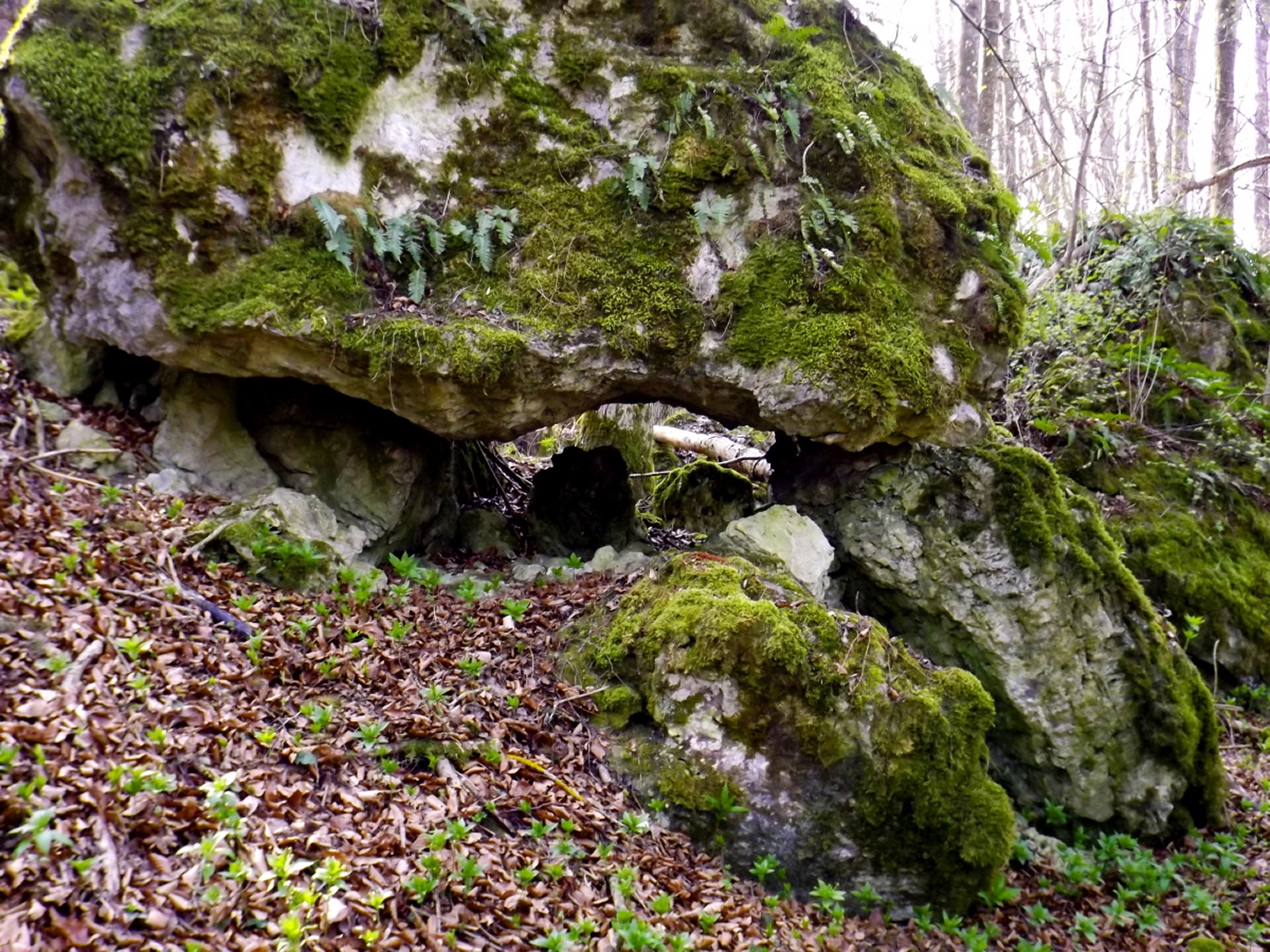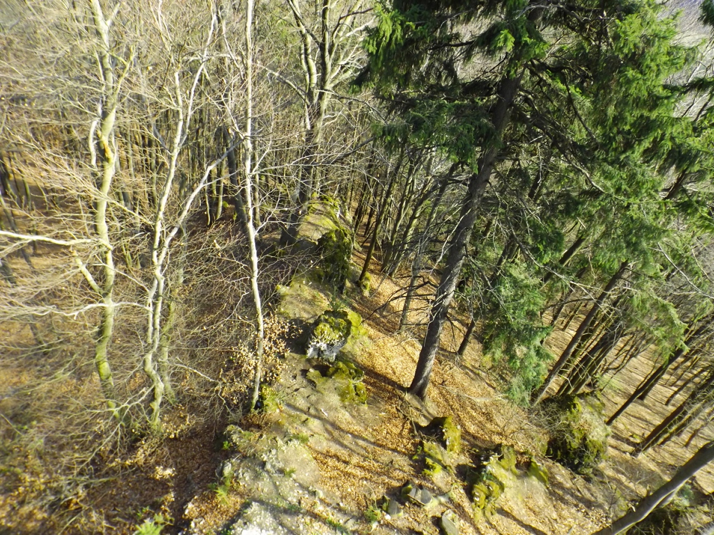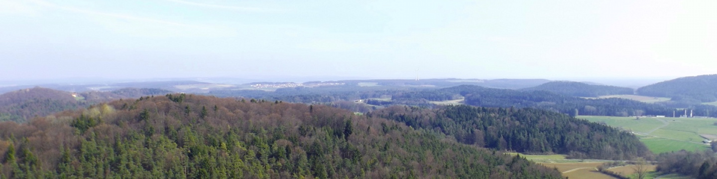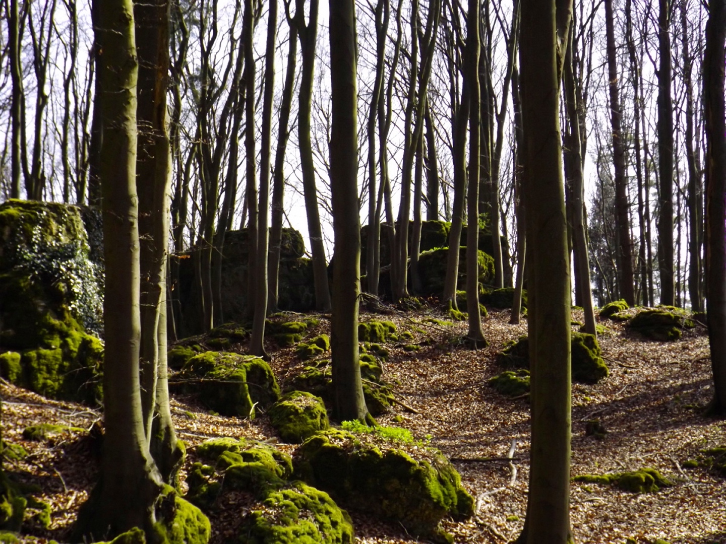 Vom Parkplatz gingen wir an der Absperrung vorbei über die Wiese bergauf und folgten dem Wanderweg 16 über ein paar Treppen, bevor er am Waldrand nach links abbog und sanft ansteigend Richtung Süden weiterging. Nach wenigen Minuten erreichten wir den Sattel des Bocksbühl, dessen höchster Felsen etwa 15 Meter links des Weges liegt und auch leicht erreichbar ist. Anschließend biegt der Weg nach Westen ab und geht hinab in eine Senke, in der uns eine junge Dame mit ebenso junger Hündin entgegenkam. Menschen und Hündinnen hatten jeweils eine kurze, nette Unterhaltung, was Coco mit Luna besprochen hat, wollte sie mir aber nicht verraten. Nach etwas auf und ab gabelte sich der Weg, die Beschilderung führte durch den Wald, etwas rechts davon über die Wiese wären wir auch zum nächsten Kreuzungspunkt gekommen. An diesem ist neben einem mit allerlei Pflanzen bestückten Steinbeet ein Infopavillion zum Botaniklehrpfad. Der direkte Weg zum Ossinger führt hier nach rechts, vor uns baut sich der Sutzerberg aus, auf den kein Weg hinaufführt, dessen mindestens fünf Felsriegel jedoch sehr interessant aussahen. Ich schaute Coco kurz in die Augen und bekam die Bestätigung, dass sie sich die geschätzten 50 Höhenmeter über den etwas steileren Waldboden noch zutraute. Hier bemerkte ich dann auch das Problem mit der Kamera, stellte um und konnte ab diesem Zeitpunkt wieder vernünftig fotografieren. Der Aufstieg war ohne Stöcke für mich nicht ganz mühelos, aber sehr lohnend. Die meisten Felsriegel sind nicht ohne kleine Klettereinlagen machbar, auf die ich wegen Coco verzichtete, aber der höchste Punkt ist relativ leicht ersteigbar, wenn man mit geschlossener Laubdecke keine Probleme hat. Bei Nässe vielleicht etwas schwieriger. Das Schönste an der Sache war aber, mit welcher Wonne mir Coco hinterhersprang, die Gams in ihr existiert also doch noch! Zur Belohnung gab es auf dem Gipfel eine Schüssel voll Wasser, die sie genussvoll ausschlabberte. Hinunter gingen wir dann Richtung Süden, bevor wir am Fuße des Felsen wieder nach Westen abbogen, um den Weg hinüber zum Ossinger zu finden. Dies erwies sich dann als ziemlich einfache Übung, eine Harvesterspur führt hinunter zu einer Kreuzung von Wanderwegen, die wir geradeaus überquerten. Nach wenigen Metern ist ein Wiese zu überqueren, ehe der Pfad doch ordentlich steil den Ossinger hochgeht. Eine Abzweigung lassen wir rechts liegen, bei der nächsten nach einem Nebengipfelfelsen geht es links hinauf zur Hütte knapp unter und dem Aussichtsturm auf dem Hauptgipfel. Dieser Abschnitt ist für die Touristen mit Stufen und einem talseitigen Geländer entschärft. Der kurze Weg von der Hütte zum Turm ist sogar geschottert. Am Turm angekommen, bewies Coco ihre Zickenqualitäten: Die erste Treppenstufe ist ein Gitterrost, und obwohl der Rest aus Holzplatten besteht, weigerte sie sich, mit hinaufzugehen. Also blieb mir nichts anderes übrig, als sie abseits des Zugangs anzuhängen und der Turm alleine zu besteigen. Irgwendwie war es sogar gut so, denn es gibt oben keine Aussichtsplattform. Der Treppengang endet auf einmal blind, denn in der Turmmitte sind scheinbar einige Kabelstränge, die mit der auf dem Dach installierten Antennenanlage verbunden sind. Dementsprechend eng geht es zu und ich beschränkte mich auf ein oder zwei Fotos in jede Richtung und stieg wieder ab. Coco hatte es sich inzwischen bequem gemacht, war aber scheinbar doch etwas beleidigt, denn die sonstige Begrüßungsorgie fiel aus. Nach der bereits erwähnten Kellerhalben stiegen wir bis zur beim Aufstieg rechts liegengelassenen Abzweigung ab und folgten dort dem etwas direkteren Weg hinunter Richtung Königstein. Dieser ist im Wald nicht immer gut erkennbar, aber sehr gut markiert. Unten hat man an einigen Abzweigungen diverse Auswahlmöglichkeiten, die in den Bildern erklärt werden. Am Ende traversierten wir wieder weglos die Nordseite des Bocksbühls, bis wir zum unteren Teil des Aufstiegswegs zurückkamen, wo Coco noch ein Mal ganz lieb zu zwei entgegenkommenden Spaziergängerinnen war, und waren in drei Minuten zurück am Auto.