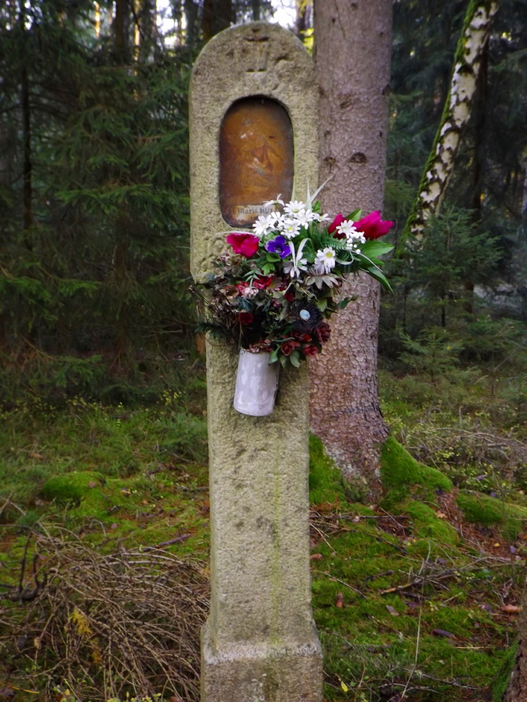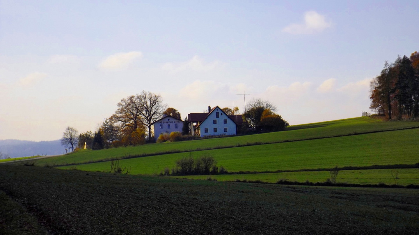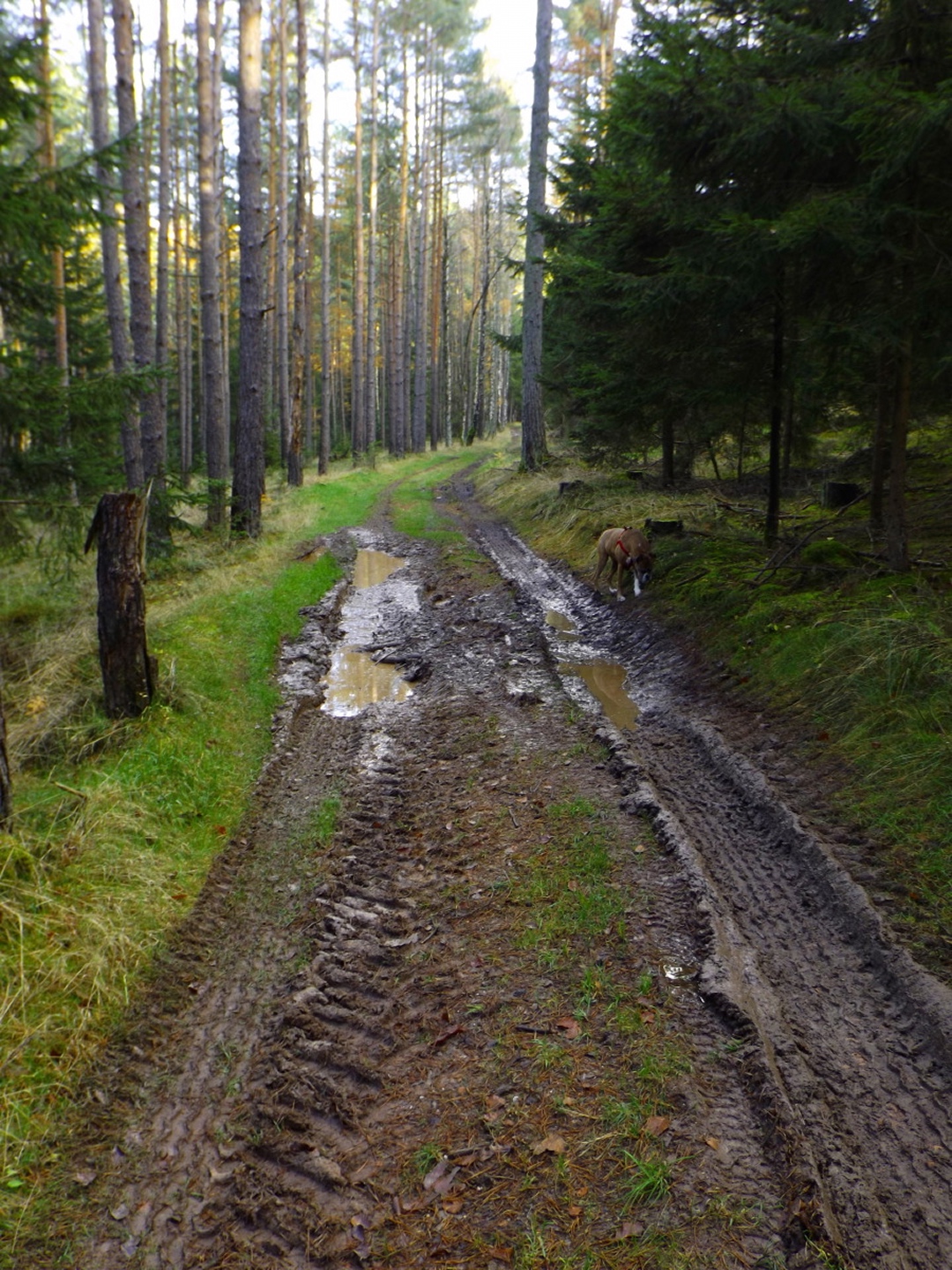 In Höhe Legendorf zwischen Brudersdorf und Gösselsdorf stellte ich das Auto am Anfang des Wirtschaftsweges ab, der auch gleich den ersten Teil des Spaziergangs darstellte. Er führt sanft steigend nach Norden, biegt am Waldrand rechts ab und endet in einem Holzsammelplatz. An diesem gingen wir geradeaus weiter in den Wald hinein, bis die gelb-orange Wanderwegmarkierung von links dazustieß. Dieser Markierung folgten wir geradeaus, bis nach einer Wiesenlichtung ein unmarkierter Forstweg nach links abzweigt und etwas abkürzt. Coco war genauso wenig vom schlammigen Zustand der Wege begeistert wie ich und versuchte, ganz die feine Dame und total boxeruntypisch, möglichst sauber zu bleiben und die übelsten Stellen zu umgehen, das Ganze mit einigem Erfolg. Gleich darauf konnten wir durch ein paar Bäume eine Ackerlichtung erkennen, die sich bis zum höchsten Punkt des Eichelberges und auf der anderen Seite wieder hinunter zog. Wir wollten sauber bleiben und verzichteten auf die 100 Meter und zehn Höhenmeter zum Gipfel. Kaum waren wir wieder komplett im Wald, kam von hinten eine Rotte Mountainbiker angerollt, die sich aber so rechtzeitig bemerkbar machten, dass ich Coco festhalten konnte, bis sie vorbei waren. 200 Meter später mussten wir die Staatsstraße von Nabburg nach Kemnath am Buchberg überqueren, was uns unfallfrei gelang. Jetzt war die Markierung ein paar Meter lang weiß-blau, bis sie nach links abbog und am Waldrand entlang zum Gasthaus Kulm in Windpaissing führte. Da wir aber den Kulm überschreiten wollten, gingen wir unmarkiert geradeaus weiter. Der Weg steilte jetzt überraschend stark auf, aber nur für etwa 60 Höhenmeter, bis wir fast am Gipfel waren und die Markierungen wieder auftauchten, denn es handelt sich jedesmal entweder um Weitwanderwege oder Rundwege mit Ausgangspunkt in Nabburg. Wir hielten uns links, direkt auf den jetzt sichtbaren Aussichtsturm zu, und waren zwei Minuten später am Gipfel. Hier musste ich feststellen, dass es doch besser gewesen wäre, zuerst beim Gasthaus vorbeizuschauen, denn der Schlüssel zum Turm liegt dort. Andererseits bezweifle ich, dass man noch allzu viel Aussicht hat, die Baumwipfel erscheinen mir doch ziemlich auf gleicher Höhe mit der Aussichtsplattform. Das daneben stehende Hütterl war ebenfalls geschlossen, ich hatte auch keine Brotzeit dabei, weil wir ja erst unmittelbar vor der Abfahrt unser Mittagessen genossen hatten, also begnügten wir uns mit fünf Minuten Pause auf beziehungsweise vor dem Bankerl und gingen dann weiter. Wir hatten den Gipfel von Osten her erklommen, also verließen wir ihn Richtung Westen, zunächst auf dem mehrfach markierten Wanderweg, folgten aber nach ein paar Metern einer unmarkierten Spur nach links, die steil nach unten führt. Jedoch zweigt noch vor der Geländekante eine ebensowenig markierte Spur rechts zu einem voll zugewachsenen Gipfelkreuz ab, welches wir natürlich nicht ausließen. Hier stellte ich fest, dass die Südflanke früher mal ein Steinbruch war, bevor wir auf der Fortsetzung der Spur zurück zum markierten Weg gingen. Dieser mündet nach etwa 150 Metern in eine breitere Spur, an der sich die Wege teilen. Nach rechts weist die Markierung nach Pfreimd, während wir links abbogen und nach Windpaissing abstiegen. An der Stelle, wo der Weg den Wald verlässt, mündet er in eine Asphaltstraße, die zum Gasthaus und der Staatsstraße führt, vorbei an ein paar Weinstöcken und zwei Eseln, mit denen Coco gleich Freundschaft schloss. Beim Gasthaus dachte ich kurz über einen Einkehrschwung nach, entschied mich aber leztendlich dagegen, weil es sonst sehr knapp werden würde, noch bei Tageslicht zum Auto zurückzukommen, es war immerhin schon fast 16 Uhr. An der Staatsstraße konnten wir einer Traktorenspur oberhalb folgen, die parallel die 100 Meter zur Ortshaupteinfahrt von Windpaissing führte. An deren Ende musste Coco an die Leine, weil ich nicht wusste, wie viel Verkehr, egal ob auf Rädern, Beinen oder Pfoten im Ort sein würde. Im Ort hätten wir links abbiegen können und wären am selben Teich herausgekommen, ich hatte mich aber bereits bei der Planung dafür entschieden, geradeaus zu gehen und weiter unten über eine Flurbereinigungsspur zum Waldrand zu gehen. Am Ortsende ließ ich Coco wieder frei und fand die gesuchte Spur ohne Probleme. Die Entscheidung erwies sich auch in anderer Hinsicht als sehr gut, denn von diesem Weg aus war der Blick auf Gösselsdorf und den Friedrichsbergkamm definitiv besser als er von näher an Windpaissing gewesen wäre. Am Ende des Wiesenweges stießen wir auf die Alternativroute und die nicht in der Kompasskarte, dafür aber im Bayernatlas verzeichnete Forstspur nach Süden, auf der wir uns wieder auf den weg Richtung Legendorf machten. Durch den Wald steigt dieser Weg noch einmal etwas an, aber Höhenmeter hatten wir heute sowieso eher zu wenig. Zwischendurch sichteten wir links im Wald ein Reh, aber Coco war ein braves und einsichtiges Mädchen und blieb bei mir auf dem Weg. Sie hätte das Reh sowieso nicht erwischt, um mit ihm zu spielen. Oben auf der Kammlinie verließen wir den Wald und hätten die Option gehabt, zwischen zwei Feldern hindurch nach Legendorf hinein und auf der Gemeindeverbindungsstraße zum Auto zu gehen, ich entschied mich aber dafür, am Waldrand zur Wirtschaftsstraße zu queren, auf der wir zu Beginn der Runde heraufgekommen waren und auf ihr zurückzugehen. Coco sah mich zwar am Auto etwas ungläubig an, dass schon Schluss war, stieg aber ohne Proteste ein und durfte daheim als Belohnung ein zusätzliches Wienerl genießen.