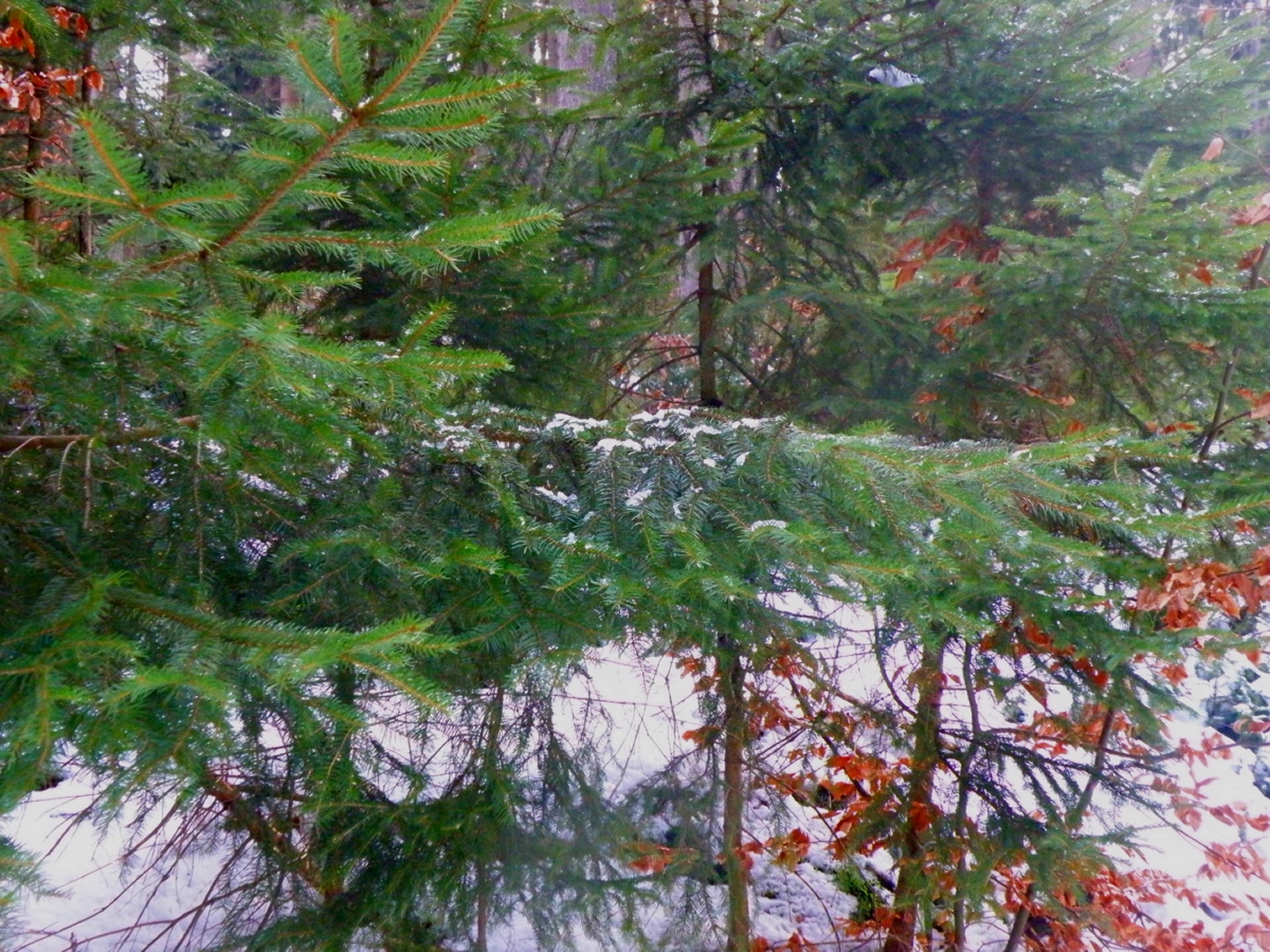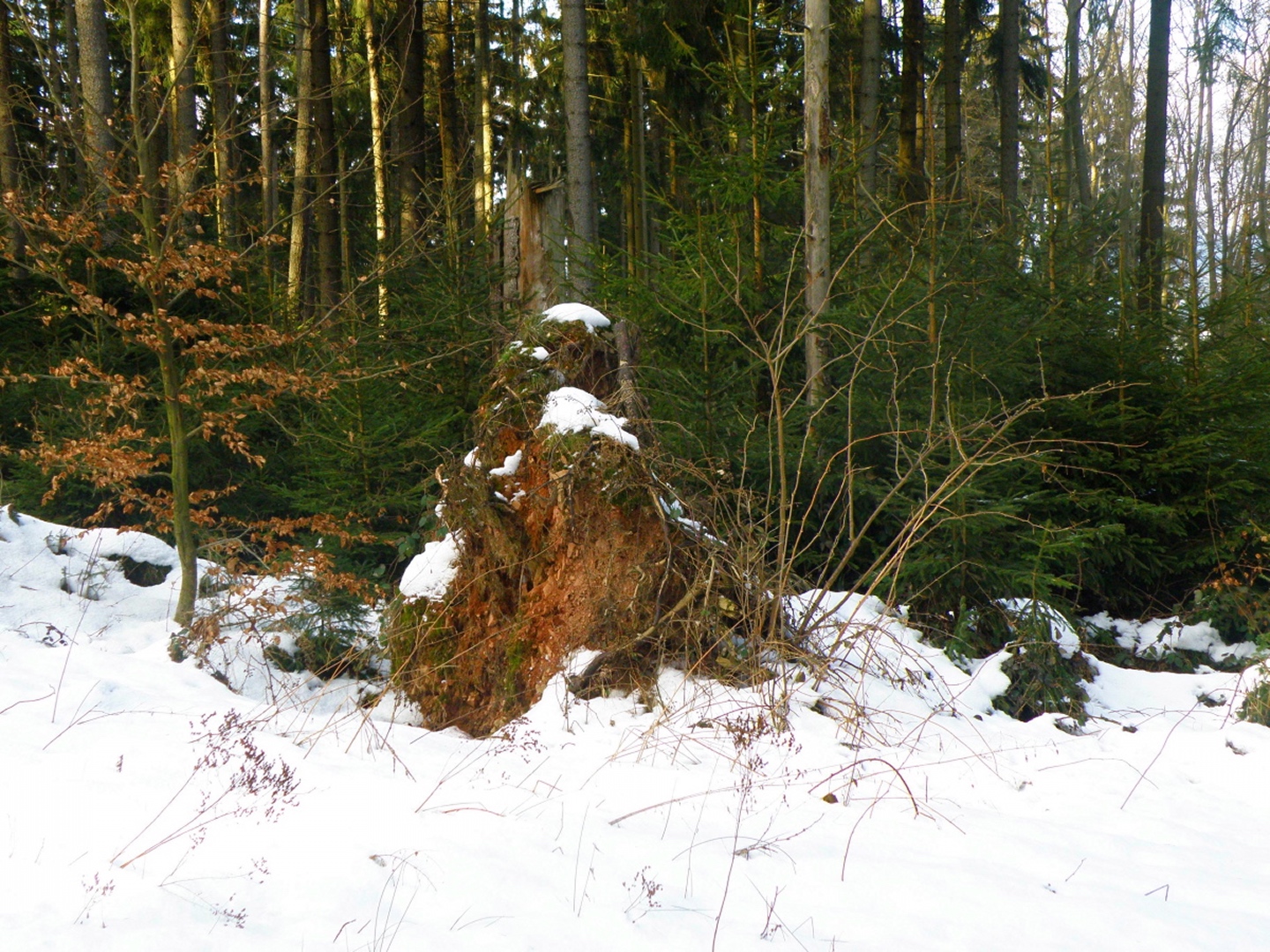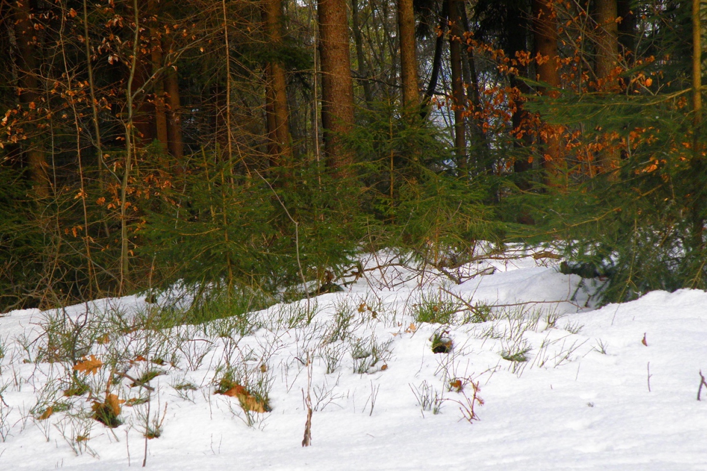 Normalerweise folgt man der Liftschneise in der Direttissima bis knapp unter dem Gipfel. Heute waren die Verhältnisse aber viel zu harschig dafür, weshalb wir der ersten Forstwegquerung dieser folgten und in angenehmer Steigung über die Forstwege dreimal den Skihang im Zickzack querten. Coco tat sich trotzdem an einigen Stellen schwer genug. Vom Gipfel aus folgten wir dem Weg zur Buchberghütte, der ab der obersten Abzweigung nicht viel mehr als ein netter kleiner Pfad durch den Wald ist. Normalerweise kein Problem, heute ziemlich vereist. Zum Glück war rechts und links etwas Platz und Schnee. Vorbei an einer kleinen unbewirtschafteten Wanderhütte führt der Pfad zu einem etwas steileren Hang, der aufgrund der Vereisung etwas heikler war und mündet in eine Fünferkreuzung. Bei besserem Wetter wäre es sicher interessant gewesen, die Keltenwallanlage anzuschauen, wir hoben uns diese jedoch für den Sommer auf und versuchten unser Glück bei der Buchberghütte. Diese war trotz „Montag und Dienstag Ruhetag“ geöffnet und auch ziemlich voll. Kein Wunder, freier Nachmittag für alle. Wir wurden mit zwei älteren Herren an ein Tischende gesetzt, was sich als ganz nett herausstellte, obwohl Coco mit dem harten Steinboden nicht ganz zufrieden war. Sie hätte lieber eine Decke als Unterlage gehabt. Ein Dunkles und eine Brotzeitplatte (in Österreich sagt man dazu Brettljausn) für zusammen 6,90 € später machten wir uns auf den Rest der Runde, der eigentlich nur noch darin bestand, der Forststraße von der Hütte zum Lifthang zu folgen und diesen zum Auto abzusteigen.