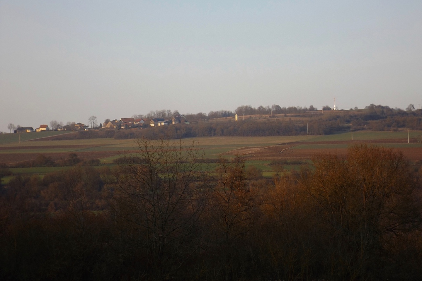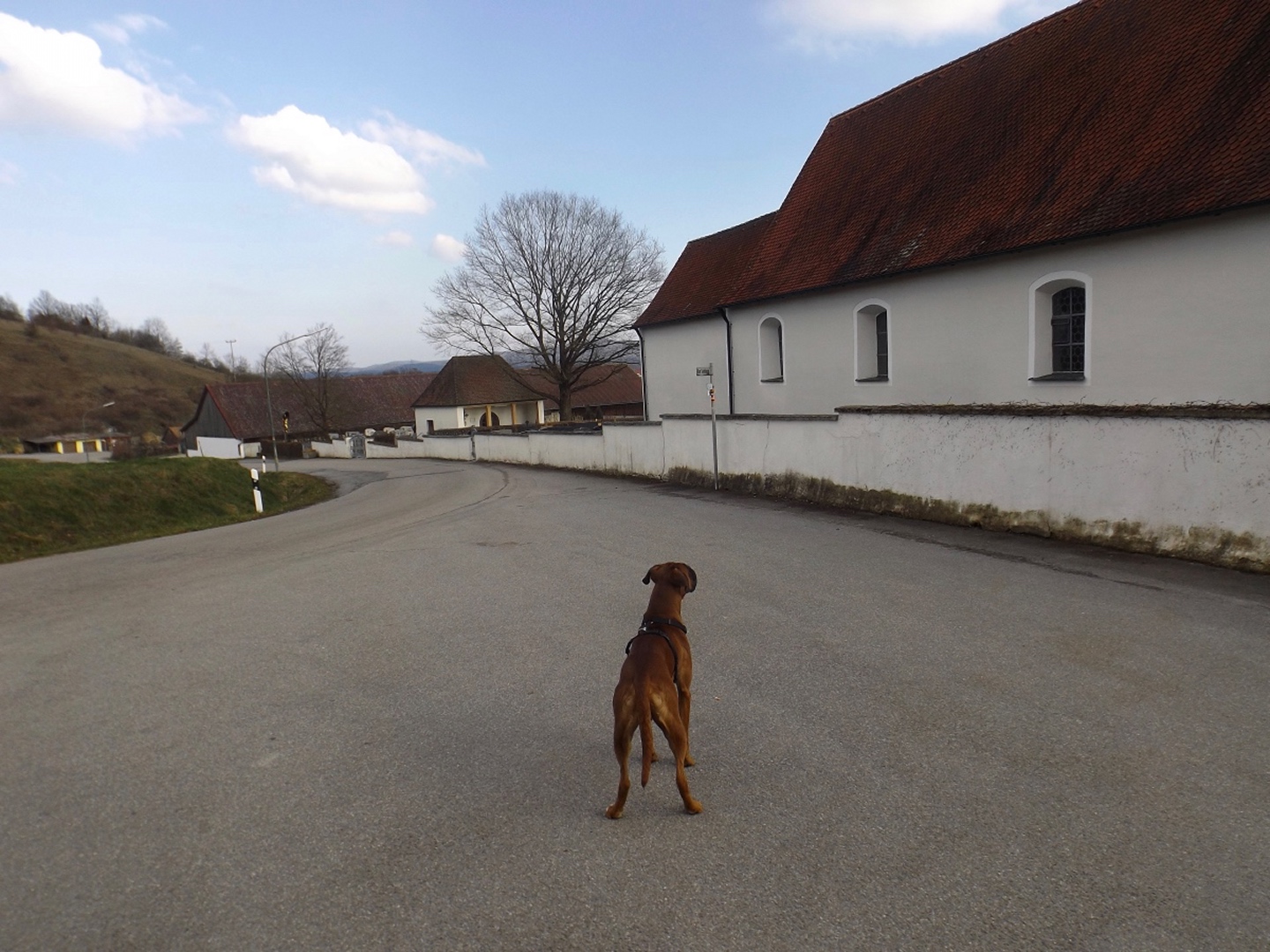 Ich stellte das Auto an der Kirche ab und ließ Karlie die zwei Minuten, bis alle Vorbereitungen erledigt waren, ohne Leine, nahm ihn dann aber doch dran, weil er in letzter Zeit einfach zu umtriebig ist. Zuerst ging es auf dem Steig, den wir letztes Jahr mit dem OWV gegangen sind, zum Premberger „Gipfel“kreuz, kehrten aber dort nicht um, sondern gingen weiter nach Norden. Kurz vor dem ersten Vorgipfelchen kam uns ein Paar mit einem dreijährigen Boxerrüden entgegen und wir versuchten, die Hunde miteinander tollen zu lassen. Leider hatte keiner ein Interesse daran, mit dem anderen zu tollen, es war vielmehr ein Belauern und wechselseitige Versuche, den anderen zu dominieren. Da beide irgendwie auf dem Weg zum Alphatier sind, waren alle diese Versuche zum Scheitern verurteilt, weil sich keiner unterwarf oder auch nur ansatzweise den Schwanz einzog. Und das ist wörtlich zu verstehen, die Ruten waren immer stolz gehoben. Nach drei Minuten wurden beide Wuffis sicherheitshalber wieder angeleint und wir setzten unsere Wege fort. Zwischen Frauenberg und der Kreuzung unterhalb von Oberhof war unsere Strecke mit der identisch, die ich vor einem Jahr an Cocos letztem Geburtstag mit ihr gegangen bin, dieses Mal bogen wir aber statt nach rechts nach links ab und folgten einem Landwirtschaftsweg am Waldrand nach Richthof und weiter Richtung Dirnau. Nicht nur hier war Karlie ziemlich unerträglich in Sachen Ziehen, es ging so weit, dass ich die Leine nicht mehr festhalten konnte und sie ihm nachschoss. Das hat ihn zum Glück so schockiert, dass er sich den Rest der Tour etwas zurückhielt. Kurz vor Dirnau stießen wir auf den Malerwinkelrundweg und folgten ihm bis zur Premberger Kirche. Größtenteils entsprach das wieder der Strecke, die bereits im letzten Juni dran war.