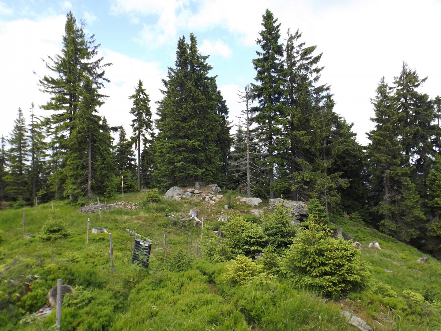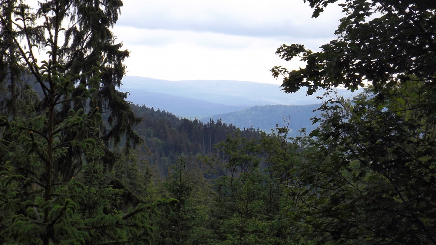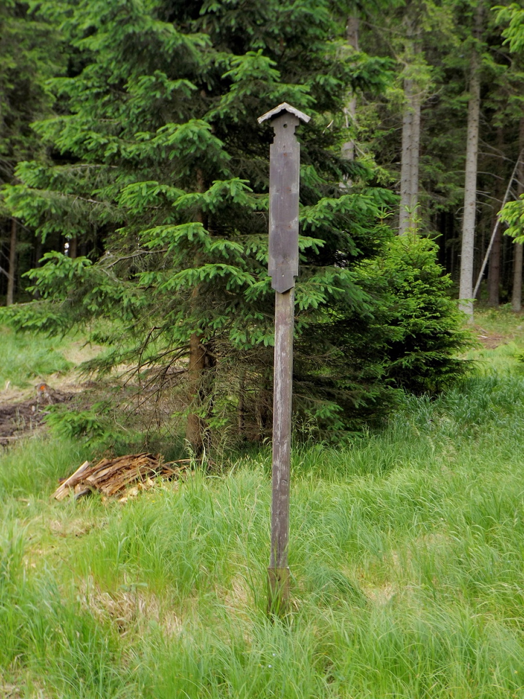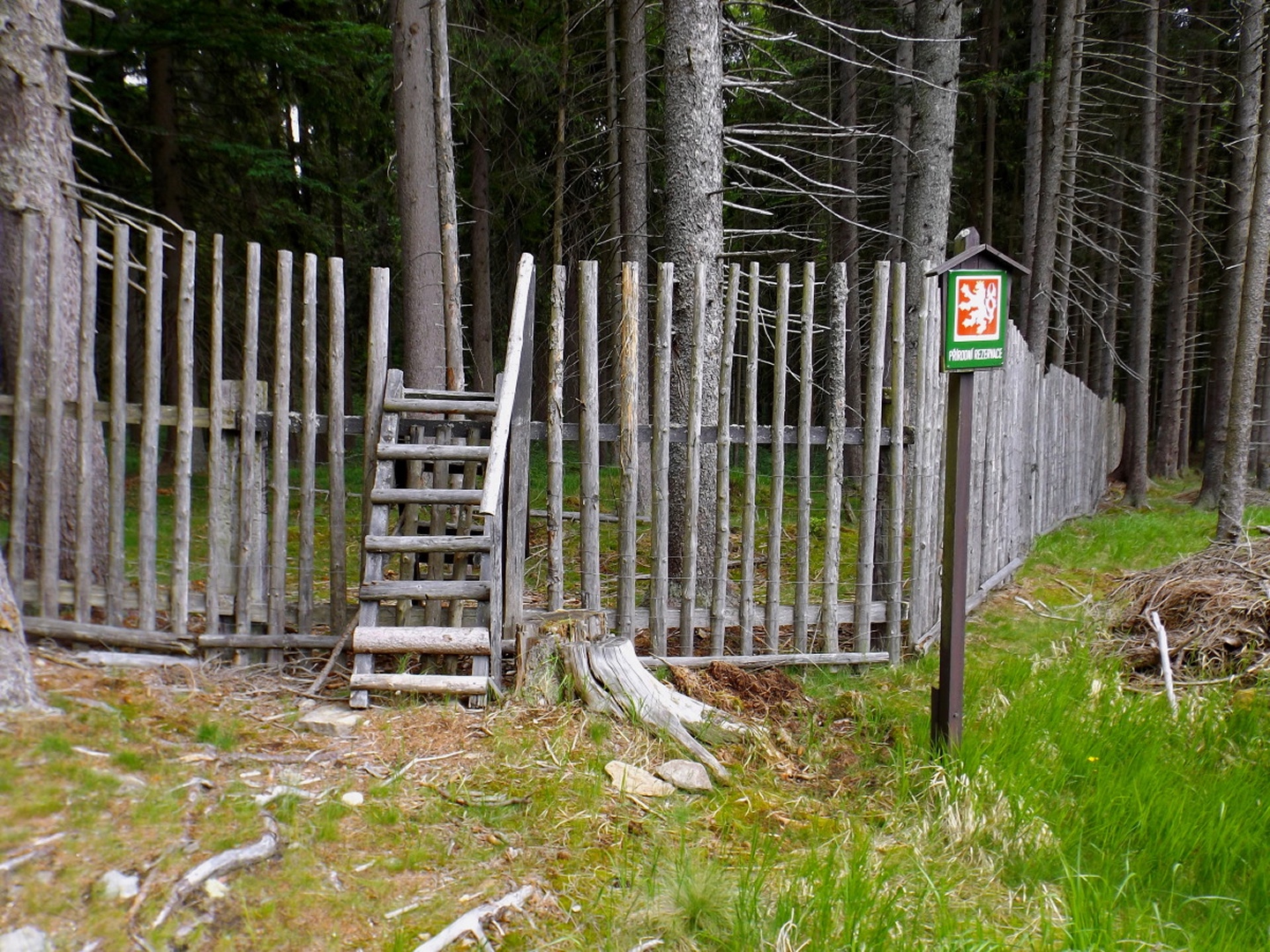 Nach einem liebevoll zubereiteten und sehr reichhaltigen Frühstück, bestehend aus 3 Kipferln, von denen eines mit dem obligatorisch geviertelten Apfel in der Brotzeitbox landete, einem feinen Wurst-Käse-Teller und einem Joghurt, dazu einem Kännchen schwarzen Tee, setzte ich mich ins Auto und fuhr die am Ende doch 14 Kilometer zum Ausgangspunkt, wo ich bereits vor neun Uhr lostigern konnte. Der Parkplatz ist ganz nebenbei gebührenpflichtig und die 50 Kronen Tagesgebühr sind für tschechische Verhältnisse ein ganz ordentlicher Preis, aus deutscher Sicht aber immer noch ziemlich günstig (umgerechnet etwa 1,85 Euro). Erst geht es auf Asphalt unter der Bahnlinie hindurch zum Infozentrum, das bereits geöffnet war. Dumm ist nur, dass alle Infotafeln rein in tschechischer Sprache sind und auch der eigentlich ganz nette Nationalparkmitarbeiter weder deutsch noch englisch spricht. Immerhin konnte das Team vor Kurzem die Existenz des Blauelfen nachweisen und sogar ein Exemplar davon in den Ausstellungsraum bringen. Weiter ging es immer noch auf Asphalt zum Abzweig Amortovka, an dem ich auf einer geschotterten Forststraße ins Naturschutzgebiet hineinwanderte. Ich war früh dran, also ließ ich mir Zeit. Bald erreichte ich den Boubínské jezírko, einen kleinen Triftteich, der viel kleiner ist als die berühmteren Karseen beispielsweie am Künischen Gebirge und auch nicht ganz die Größe des Teiches bei der Höllbachschwelle erreicht. Das ändert aber nichts daran, dass er wunderbar als Spiegel taugt, weshalb auch ein bisserl Infrastruktur zum Rasten vorhanden ist. Ein Teil davon wurde gerade erneuert, was mit etwas Motorgesäge und Gehämmere verbunden war, so dass die Rast kürzer ausfiel als an ruhigeren Tagen. Der kürzere Weiterweg führt rechts am östlichen Seeufer vorbei, ich hatte aber Zeit und außerdem von vornherein die längere Variante geplant, die nach Westen steil den Hang hinaufging, direkt an einem eingezäunten Teil des Urwaldes entlang. 100 Höhenmeter weiter oben mündet dieser Steig in eine Forststraße, die sich bei sanfter Steigung an den Hang schmiegt. Dieser folgte ich vorbei an einem etwas baufälligen Rasthütterl, in dem ich trotzdem Station machte (ich hatte ja Zeit und langsam auch Lust auf das erste Apfelvierterl), bis zum Abzweig Boubínský prales – severozápad (Nordwest), der etwas weiter nördlich liegt als in der Karte eingezeichnet. Hier verließ ich die Forststraße und stieg auf einem schönen Pfad weiter nach oben. Dieser Pfad mündete bald in die nächsthöhere Forststraße, auf der ich zuerst zum Forsthaus mit Terrasse und Kapelle Lovecký zámeček kam und 700 Meter später die Kreuzung Na Křížkách erreichen sollte. Allerdings gibt es etwa auf halber Strecke eine Abkürzung durch den Wald, die zwar nicht markiert ist, aber wohl außerhalb des Naturschutzgebietes oder zumindest direkt auf seiner Grenze liegt, gerade mal 20 Meter lang ist und einen gut frequentierten Eindruck macht. Lange Rede, kurze Aussage: Ich nahm diese Abkürzung. Sie macht natürlich nur Sinn, wenn man den Boubín von Süden her besteigen will, ansonsten geht man besser wirklich bis Na Křížkách. Der Südaufstieg zum Boubín ist ein bisserl uneben, ein bisserl steil und ansonsten total unspektakulär. Ein paar Felsriegelchen hier, jede Menge Bäume dort und am Ende Stufen und ein beidseitiges Geländer, das weniger zum Festhalten notwendig ist als zur Verhinderung von unerlaubten Abschweifern ins Schutzgebiet. Oben auf dem Gipfel gibt es dann neben dem Gipfelfelsen und ein paar Rastbänken den obligatorischen trigonometrischen Punkt, den genauso obligatorischen Wegweiser und einen der in Tschechien weit verbreiteten Aussichtstürme. Aus diesem Grund ist der Boubín auch sehr gut frequentiert, ohne aber überlaufen zu wirken. Der Aussichtsturm hat seinen Namen auch wirklich verdient, lediglich die Bewölkung verdarb die Freude ein kleines bisserl. Immerhin war der Gipfel im Gegensatz zu den Plöckensteinen und dem Smrčina frei, gut dass ich heute nicht auf einem dieser beiden Höhenzüge unterwegs war. Nach dem Abstecher auf den Turm setzte ich mich auf eines der Bankerln und futterte das dritte Kipferl. Um zwölf Uhr setzte ich mich wieder in Bewegung und stieg über die Nordwestseite ab. Den Abzweig zum Srní vrch und Johnův kámen ließ ich links liegen und hob ihn mir fürs nächste Mal auf. Stattdessen stieg ich, jetzt nicht mehr auf dem Waldboden, sondern auf Holzplanken ab bis zur Forstraße, die von Kubova Hut‘ heraufkommt. Dort wandte ich mich aber nicht jenem Dorfe zu, sondern ging in entgegengesetzter Richtung an der Nordostflanke entlang hinunter nach Na Křížkách und steuerte die Kreuzung dieses Mal auch wirklich an. Es gibt dort das fast obligatorische Rasthütterl und einen Zaun mit verschlossenem Tor sowie einem Trepperl für Fußgänger, über das der markierte Weg nach Na Kubrnech führt. Dieser ist bis auf das nochmal eingezäunte Naturschutzgebiet Milešický prales eher langweilig und im letzten Viertel auf einer Asphaltstraße. Auf dieser kam mir auch prompt ein Škoda mit Pferdeanhänger entgegegen. Die Kreuzung Na Kubrnech hat ihren Namen von der Wüstung Kuberna, wobei etwas weiter oben Richtung Bobík ein Ferienhaus gleichen Namens steht. Einen halben Kilometer weiter oben führt der gleiche Zaun über den Sattel und ist mit den gleichen Elementen ausgestattet wie eine Stunde vorher. Hier wird auch der Grund ersichtlich: Das Forstamt will den Wald ungestört bewirtschaften. Beim nächsten Mal folge ich dem Pfad, der außerhalb am Zaun entlang führt, das sind zwei zusätzliche Kammgipfel. Draußen bog ich links ab und folgte der roten Markierung Richtung Volary. Denn dieser Weg führt in angenehmer Steigung zu einem weiter oben gelegenen Sattel, an dem der Gipfelpfad zum Bobík abzweigt. Es gibt vorher einen unmarkierten Weg hinauf zum Gipfel, aber das wusste ich von unten nicht und hatte außerdem keinerlei Eile. Außerdem hätte ic
