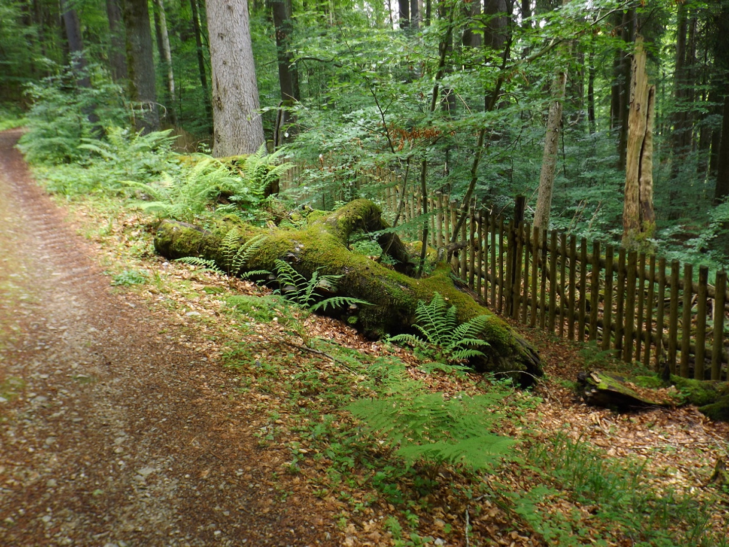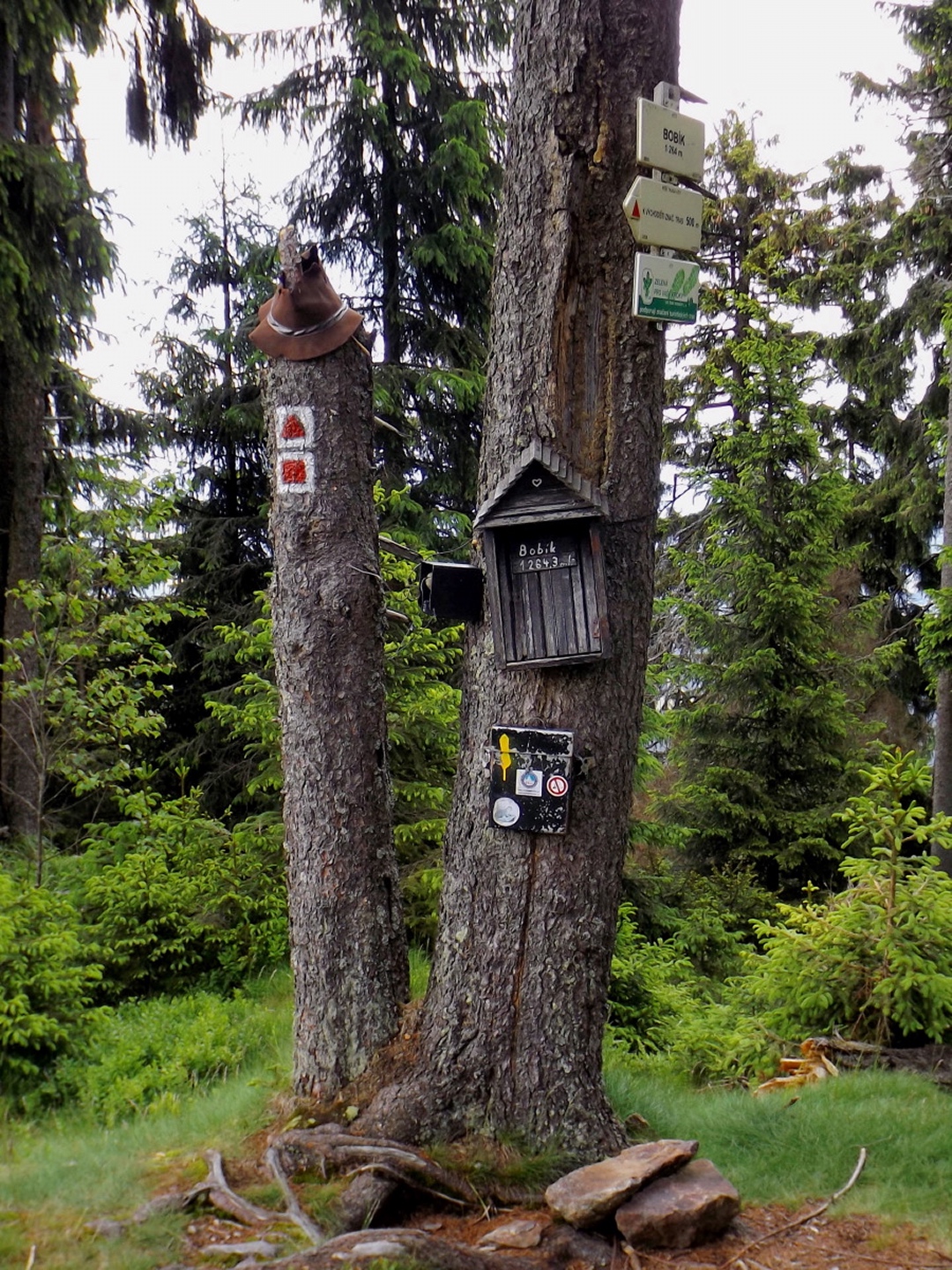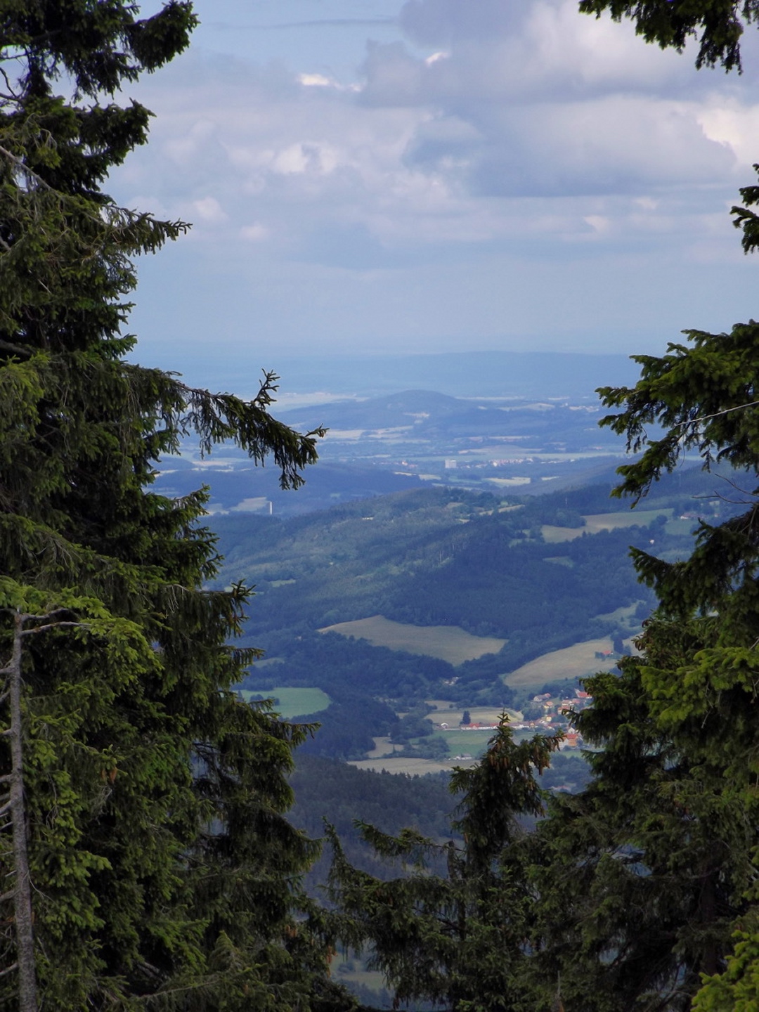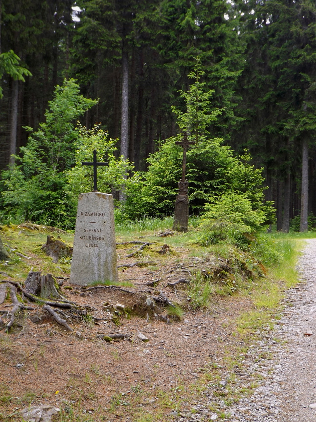 Nach einem liebevoll zubereiteten und sehr reichhaltigen Frühstück, bestehend aus 3 Kipferln, von denen eines mit dem obligatorisch geviertelten Apfel in der Brotzeitbox landete, einem feinen Wurst-Käse-Teller und einem Joghurt, dazu einem Kännchen schwarzen Tee, setzte ich mich ins Auto und fuhr die am Ende doch 14 Kilometer zum Ausgangspunkt, wo ich bereits vor neun Uhr lostigern konnte. Der Parkplatz ist ganz nebenbei gebührenpflichtig und die 50 Kronen Tagesgebühr sind für tschechische Verhältnisse ein ganz ordentlicher Preis, aus deutscher Sicht aber immer noch ziemlich günstig (umgerechnet etwa 1,85 Euro). Erst geht es auf Asphalt unter der Bahnlinie hindurch zum Infozentrum, das bereits geöffnet war. Dumm ist nur, dass alle Infotafeln rein in tschechischer Sprache sind und auch der eigentlich ganz nette Nationalparkmitarbeiter weder deutsch noch englisch spricht. Immerhin konnte das Team vor Kurzem die Existenz des Blauelfen nachweisen und sogar ein Exemplar davon in den Ausstellungsraum bringen. Weiter ging es immer noch auf Asphalt zum Abzweig Amortovka, an dem ich auf einer geschotterten Forststraße ins Naturschutzgebiet hineinwanderte. Ich war früh dran, also ließ ich mir Zeit. Bald erreichte ich den Boubínské jezírko, einen kleinen Triftteich, der viel kleiner ist als die berühmteren Karseen beispielsweie am Künischen Gebirge und auch nicht ganz die Größe des Teiches bei der Höllbachschwelle erreicht. Das ändert aber nichts daran, dass er wunderbar als Spiegel taugt, weshalb auch ein bisserl Infrastruktur zum Rasten vorhanden ist. Ein Teil davon wurde gerade erneuert, was mit etwas Motorgesäge und Gehämmere verbunden war, so dass die Rast kürzer ausfiel als an ruhigeren Tagen. Der kürzere Weiterweg führt rechts am östlichen Seeufer vorbei, ich hatte aber Zeit und außerdem von vornherein die längere Variante geplant, die nach Westen steil den Hang hinaufging, direkt an einem eingezäunten Teil des Urwaldes entlang. 100 Höhenmeter weiter oben mündet dieser Steig in eine Forststraße, die sich bei sanfter Steigung an den Hang schmiegt. Dieser folgte ich vorbei an einem etwas baufälligen Rasthütterl, in dem ich trotzdem Station machte (ich hatte ja Zeit und langsam auch Lust auf das erste Apfelvierterl), bis zum Abzweig Boubínský prales – severozápad (Nordwest), der etwas weiter nördlich liegt als in der Karte eingezeichnet. Hier verließ ich die Forststraße und stieg auf einem schönen Pfad weiter nach oben. Dieser Pfad mündete bald in die nächsthöhere Forststraße, auf der ich zuerst zum Forsthaus mit Terrasse und Kapelle Lovecký zámeček kam und 700 Meter später die Kreuzung Na Křížkách erreichen sollte. Allerdings gibt es etwa auf halber Strecke eine Abkürzung durch den Wald, die zwar nicht markiert ist, aber wohl außerhalb des Naturschutzgebietes oder zumindest direkt auf seiner Grenze liegt, gerade mal 20 Meter lang ist und einen gut frequentierten Eindruck macht. Lange Rede, kurze Aussage: Ich nahm diese Abkürzung. Sie macht natürlich nur Sinn, wenn man den Boubín von Süden her besteigen will, ansonsten geht man besser wirklich bis Na Křížkách. Der Südaufstieg zum Boubín ist ein bisserl uneben, ein bisserl steil und ansonsten total unspektakulär. Ein paar Felsriegelchen hier, jede Menge Bäume dort und am Ende Stufen und ein beidseitiges Geländer, das weniger zum Festhalten notwendig ist als zur Verhinderung von unerlaubten Abschweifern ins Schutzgebiet. Oben auf dem Gipfel gibt es dann neben dem Gipfelfelsen und ein paar Rastbänken den obligatorischen trigonometrischen Punkt, den genauso obligatorischen Wegweiser und einen der in Tschechien weit verbreiteten Aussichtstürme. Aus diesem Grund ist der Boubín auch sehr gut frequentiert, ohne aber überlaufen zu wirken. Der Aussichtsturm hat seinen Namen auch wirklich verdient, lediglich die Bewölkung verdarb die Freude ein kleines bisserl. Immerhin war der Gipfel im Gegensatz zu den Plöckensteinen und dem Smrčina frei, gut dass ich heute nicht auf einem dieser beiden Höhenzüge unterwegs war. Nach dem Abstecher auf den Turm setzte ich mich auf eines der Bankerln und futterte das dritte Kipferl. Um zwölf Uhr setzte ich mich wieder in Bewegung und stieg über die Nordwestseite ab. Den Abzweig zum Srní vrch und Johnův kámen ließ ich links liegen und hob ihn mir fürs nächste Mal auf. Stattdessen stieg ich, jetzt nicht mehr auf dem Waldboden, sondern auf Holzplanken ab bis zur Forstraße, die von Kubova Hut‘ heraufkommt. Dort wandte ich mich aber nicht jenem Dorfe zu, sondern ging in entgegengesetzter Richtung an der Nordostflanke entlang hinunter nach Na Křížkách und steuerte die Kreuzung dieses Mal auch wirklich an. Es gibt dort das fast obligatorische Rasthütterl und einen Zaun mit verschlossenem Tor sowie einem Trepperl für Fußgänger, über das der markierte Weg nach Na Kubrnech führt. Dieser ist bis auf das nochmal eingezäunte Naturschutzgebiet Milešický prales eher langweilig und im letzten Viertel auf einer Asphaltstraße. Auf dieser kam mir auch prompt ein Škoda mit Pferdeanhänger entgegegen. Die Kreuzung Na Kubrnech hat ihren Namen von der Wüstung Kuberna, wobei etwas weiter oben Richtung Bobík ein Ferienhaus gleichen Namens steht. Einen halben Kilometer weiter oben führt der gleiche Zaun über den Sattel und ist mit den gleichen Elementen ausgestattet wie eine Stunde vorher. Hier wird auch der Grund ersichtlich: Das Forstamt will den Wald ungestört bewirtschaften. Beim nächsten Mal folge ich dem Pfad, der außerhalb am Zaun entlang führt, das sind zwei zusätzliche Kammgipfel. Draußen bog ich links ab und folgte der roten Markierung Richtung Volary. Denn dieser Weg führt in angenehmer Steigung zu einem weiter oben gelegenen Sattel, an dem der Gipfelpfad zum Bobík abzweigt. Es gibt vorher einen unmarkierten Weg hinauf zum Gipfel, aber das wusste ich von unten nicht und hatte außerdem keinerlei Eile. Außerdem hätte ic