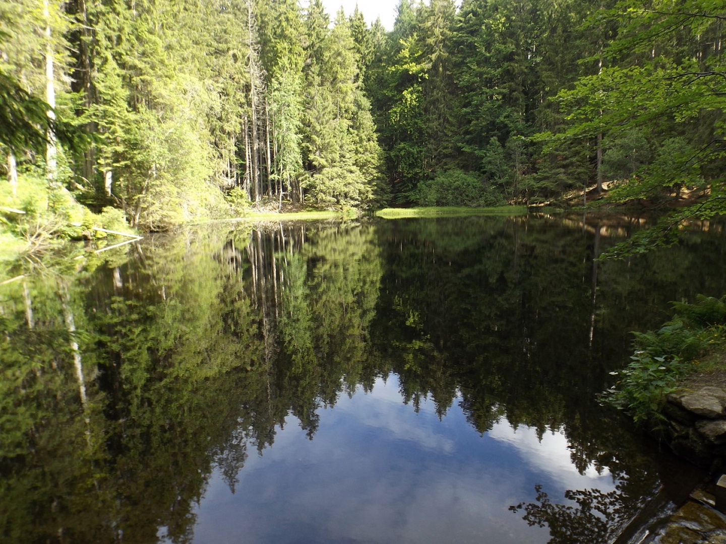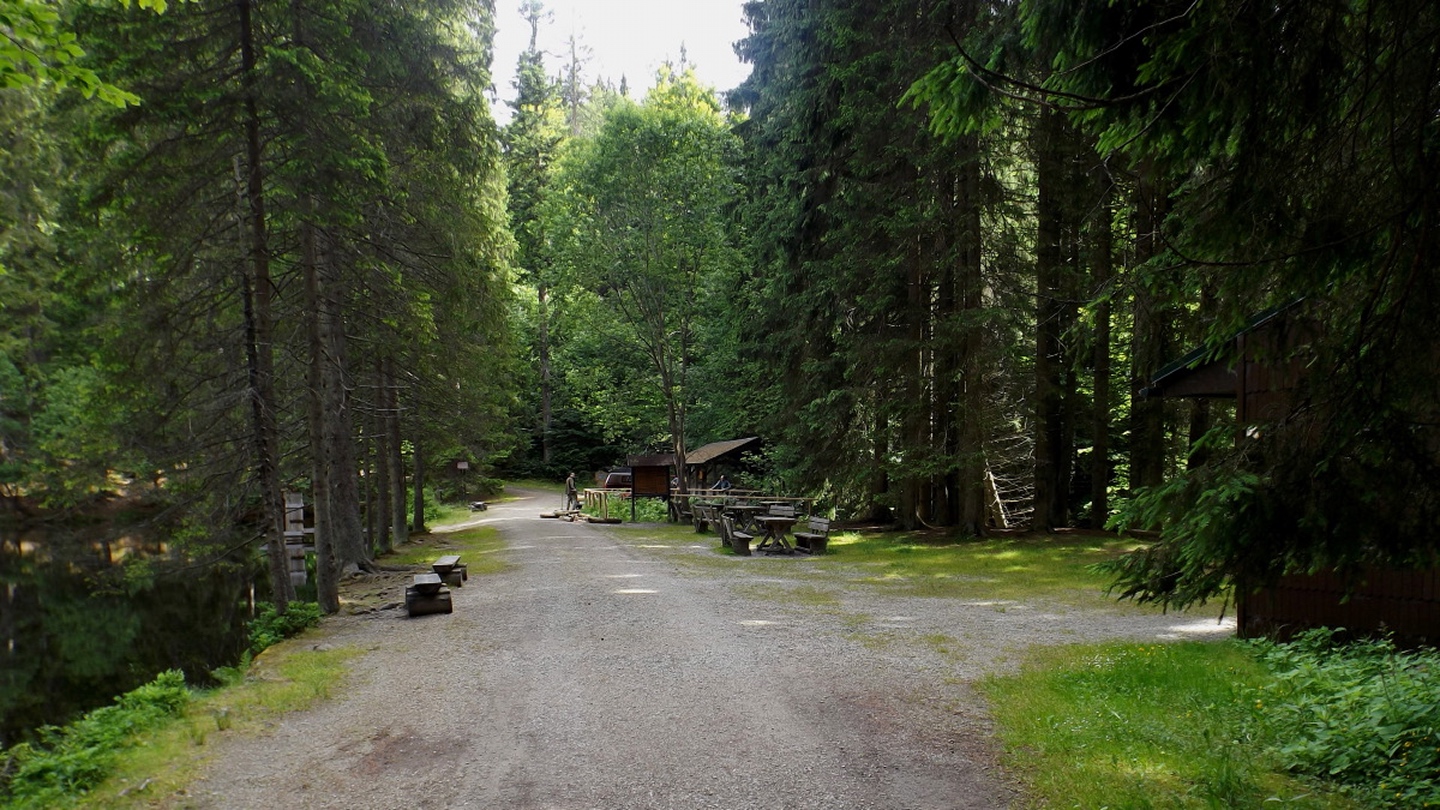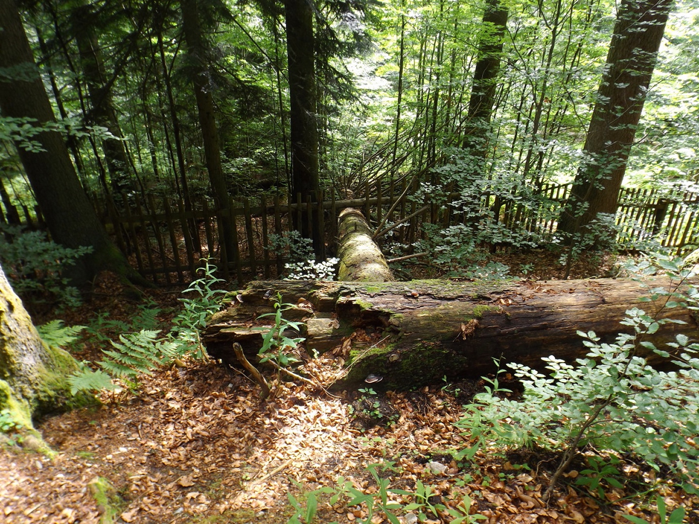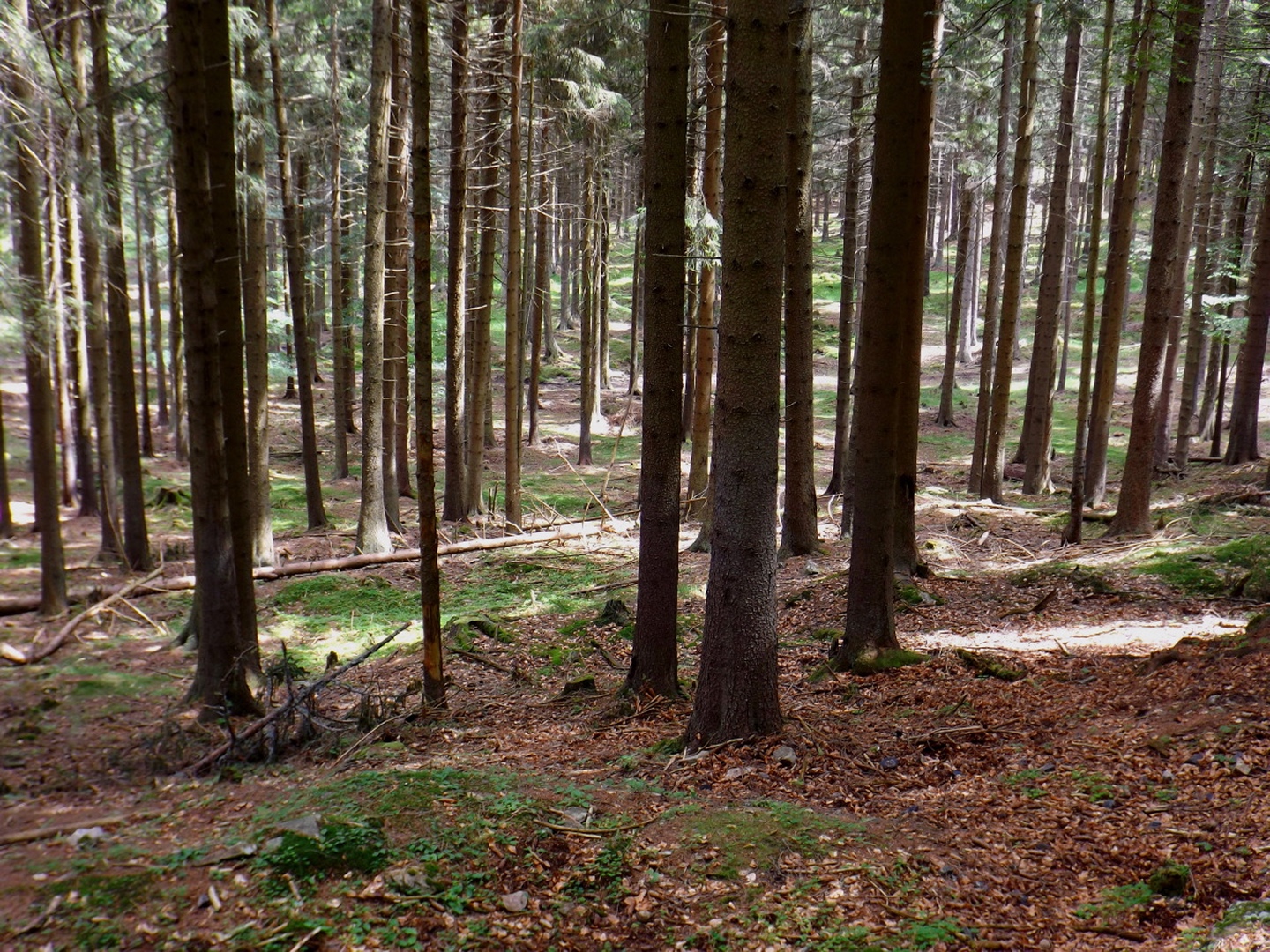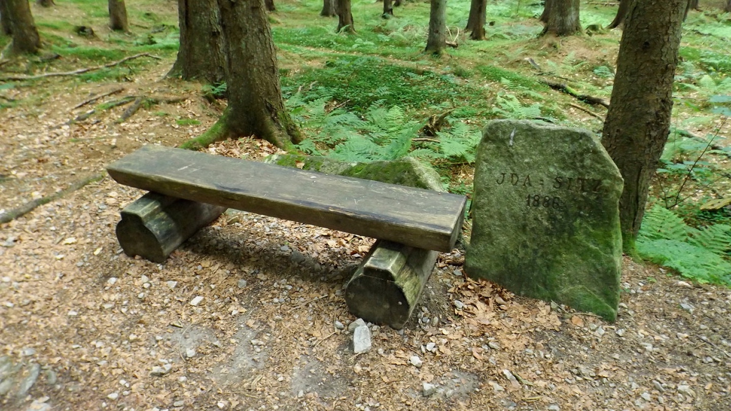 Nach einem liebevoll zubereiteten und sehr reichhaltigen Frühstück, bestehend aus 3 Kipferln, von denen eines mit dem obligatorisch geviertelten Apfel in der Brotzeitbox landete, einem feinen Wurst-Käse-Teller und einem Joghurt, dazu einem Kännchen schwarzen Tee, setzte ich mich ins Auto und fuhr die am Ende doch 14 Kilometer zum Ausgangspunkt, wo ich bereits vor neun Uhr lostigern konnte. Der Parkplatz ist ganz nebenbei gebührenpflichtig und die 50 Kronen Tagesgebühr sind für tschechische Verhältnisse ein ganz ordentlicher Preis, aus deutscher Sicht aber immer noch ziemlich günstig (umgerechnet etwa 1,85 Euro). Erst geht es auf Asphalt unter der Bahnlinie hindurch zum Infozentrum, das bereits geöffnet war. Dumm ist nur, dass alle Infotafeln rein in tschechischer Sprache sind und auch der eigentlich ganz nette Nationalparkmitarbeiter weder deutsch noch englisch spricht. Immerhin konnte das Team vor Kurzem die Existenz des Blauelfen nachweisen und sogar ein Exemplar davon in den Ausstellungsraum bringen. Weiter ging es immer noch auf Asphalt zum Abzweig Amortovka, an dem ich auf einer geschotterten Forststraße ins Naturschutzgebiet hineinwanderte. Ich war früh dran, also ließ ich mir Zeit. Bald erreichte ich den Boubínské jezírko, einen kleinen Triftteich, der viel kleiner ist als die berühmteren Karseen beispielsweie am Künischen Gebirge und auch nicht ganz die Größe des Teiches bei der Höllbachschwelle erreicht. Das ändert aber nichts daran, dass er wunderbar als Spiegel taugt, weshalb auch ein bisserl Infrastruktur zum Rasten vorhanden ist. Ein Teil davon wurde gerade erneuert, was mit etwas Motorgesäge und Gehämmere verbunden war, so dass die Rast kürzer ausfiel als an ruhigeren Tagen. Der kürzere Weiterweg führt rechts am östlichen Seeufer vorbei, ich hatte aber Zeit und außerdem von vornherein die längere Variante geplant, die nach Westen steil den Hang hinaufging, direkt an einem eingezäunten Teil des Urwaldes entlang. 100 Höhenmeter weiter oben mündet dieser Steig in eine Forststraße, die sich bei sanfter Steigung an den Hang schmiegt. Dieser folgte ich vorbei an einem etwas baufälligen Rasthütterl, in dem ich trotzdem Station machte (ich hatte ja Zeit und langsam auch Lust auf das erste Apfelvierterl), bis zum Abzweig Boubínský prales – severozápad (Nordwest), der etwas weiter nördlich liegt als in der Karte eingezeichnet. Hier verließ ich die Forststraße und stieg auf einem schönen Pfad weiter nach oben. Dieser Pfad mündete bald in die nächsthöhere Forststraße, auf der ich zuerst zum Forsthaus mit Terrasse und Kapelle Lovecký zámeček kam und 700 Meter später die Kreuzung Na Křížkách erreichen sollte. Allerdings gibt es etwa auf halber Strecke eine Abkürzung durch den Wald, die zwar nicht markiert ist, aber wohl außerhalb des Naturschutzgebietes oder zumindest direkt auf seiner Grenze liegt, gerade mal 20 Meter lang ist und einen gut frequentierten Eindruck macht. Lange Rede, kurze Aussage: Ich nahm diese Abkürzung. Sie macht natürlich nur Sinn, wenn man den Boubín von Süden her besteigen will, ansonsten geht man besser wirklich bis Na Křížkách. Der Südaufstieg zum Boubín ist ein bisserl uneben, ein bisserl steil und ansonsten total unspektakulär. Ein paar Felsriegelchen hier, jede Menge Bäume dort und am Ende Stufen und ein beidseitiges Geländer, das weniger zum Festhalten notwendig ist als zur Verhinderung von unerlaubten Abschweifern ins Schutzgebiet. Oben auf dem Gipfel gibt es dann neben dem Gipfelfelsen und ein paar Rastbänken den obligatorischen trigonometrischen Punkt, den genauso obligatorischen Wegweiser und einen der in Tschechien weit verbreiteten Aussichtstürme. Aus diesem Grund ist der Boubín auch sehr gut frequentiert, ohne aber überlaufen zu wirken. Der Aussichtsturm hat seinen Namen auch wirklich verdient, lediglich die Bewölkung verdarb die Freude ein kleines bisserl. Immerhin war der Gipfel im Gegensatz zu den Plöckensteinen und dem Smrčina frei, gut dass ich heute nicht auf einem dieser beiden Höhenzüge unterwegs war. Nach dem Abstecher auf den Turm setzte ich mich auf eines der Bankerln und futterte das dritte Kipferl. Um zwölf Uhr setzte ich mich wieder in Bewegung und stieg über die Nordwestseite ab. Den Abzweig zum Srní vrch und Johnův kámen ließ ich links liegen und hob ihn mir fürs nächste Mal auf. Stattdessen stieg ich, jetzt nicht mehr auf dem Waldboden, sondern auf Holzplanken ab bis zur Forstraße, die von Kubova Hut‘ heraufkommt. Dort wandte ich mich aber nicht jenem Dorfe zu, sondern ging in entgegengesetzter Richtung an der Nordostflanke entlang hinunter nach Na Křížkách und steuerte die Kreuzung dieses Mal auch wirklich an. Es gibt dort das fast obligatorische Rasthütterl und einen Zaun mit verschlossenem Tor sowie einem Trepperl für Fußgänger, über das der markierte Weg nach Na Kubrnech führt. Dieser ist bis auf das nochmal eingezäunte Naturschutzgebiet Milešický prales eher langweilig und im letzten Viertel auf einer Asphaltstraße. Auf dieser kam mir auch prompt ein Škoda mit Pferdeanhänger entgegegen. Die Kreuzung Na Kubrnech hat ihren Namen von der Wüstung Kuberna, wobei etwas weiter oben Richtung Bobík ein Ferienhaus gleichen Namens steht. Einen halben Kilometer weiter oben führt der gleiche Zaun über den Sattel und ist mit den gleichen Elementen ausgestattet wie eine Stunde vorher. Hier wird auch der Grund ersichtlich: Das Forstamt will den Wald ungestört bewirtschaften. Beim nächsten Mal folge ich dem Pfad, der außerhalb am Zaun entlang führt, das sind zwei zusätzliche Kammgipfel. Draußen bog ich links ab und folgte der roten Markierung Richtung Volary. Denn dieser Weg führt in angenehmer Steigung zu einem weiter oben gelegenen Sattel, an dem der Gipfelpfad zum Bobík abzweigt. Es gibt vorher einen unmarkierten Weg hinauf zum Gipfel, aber das wusste ich von unten nicht und hatte außerdem keinerlei Eile. Außerdem hätte ic
