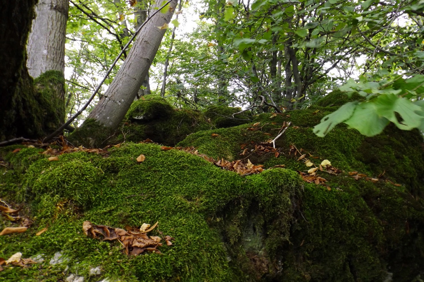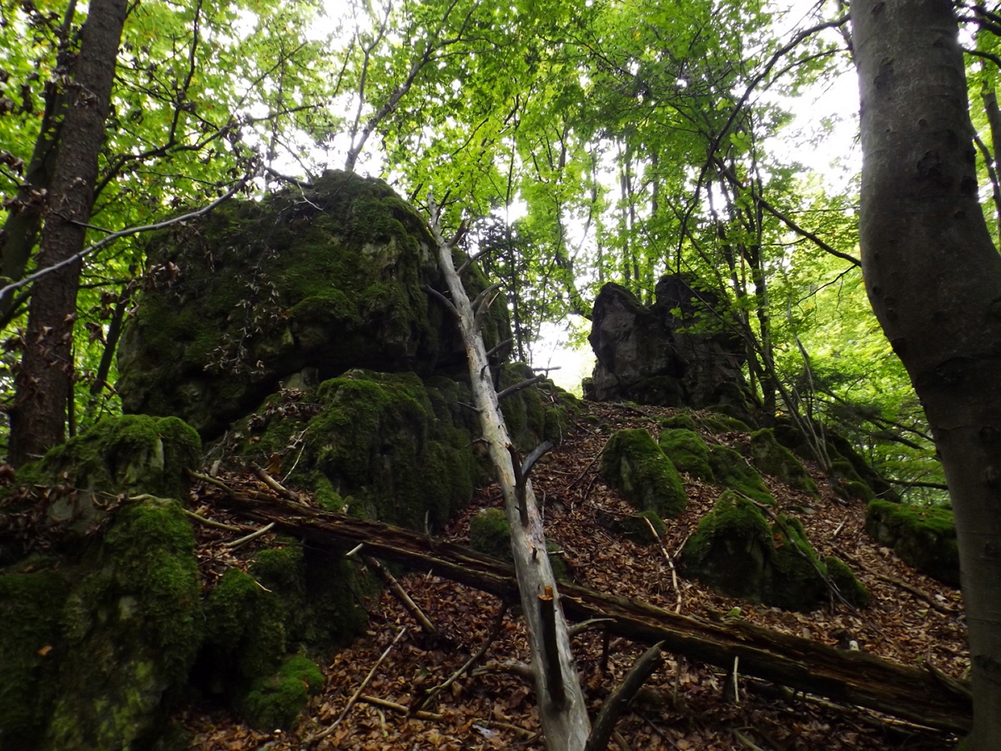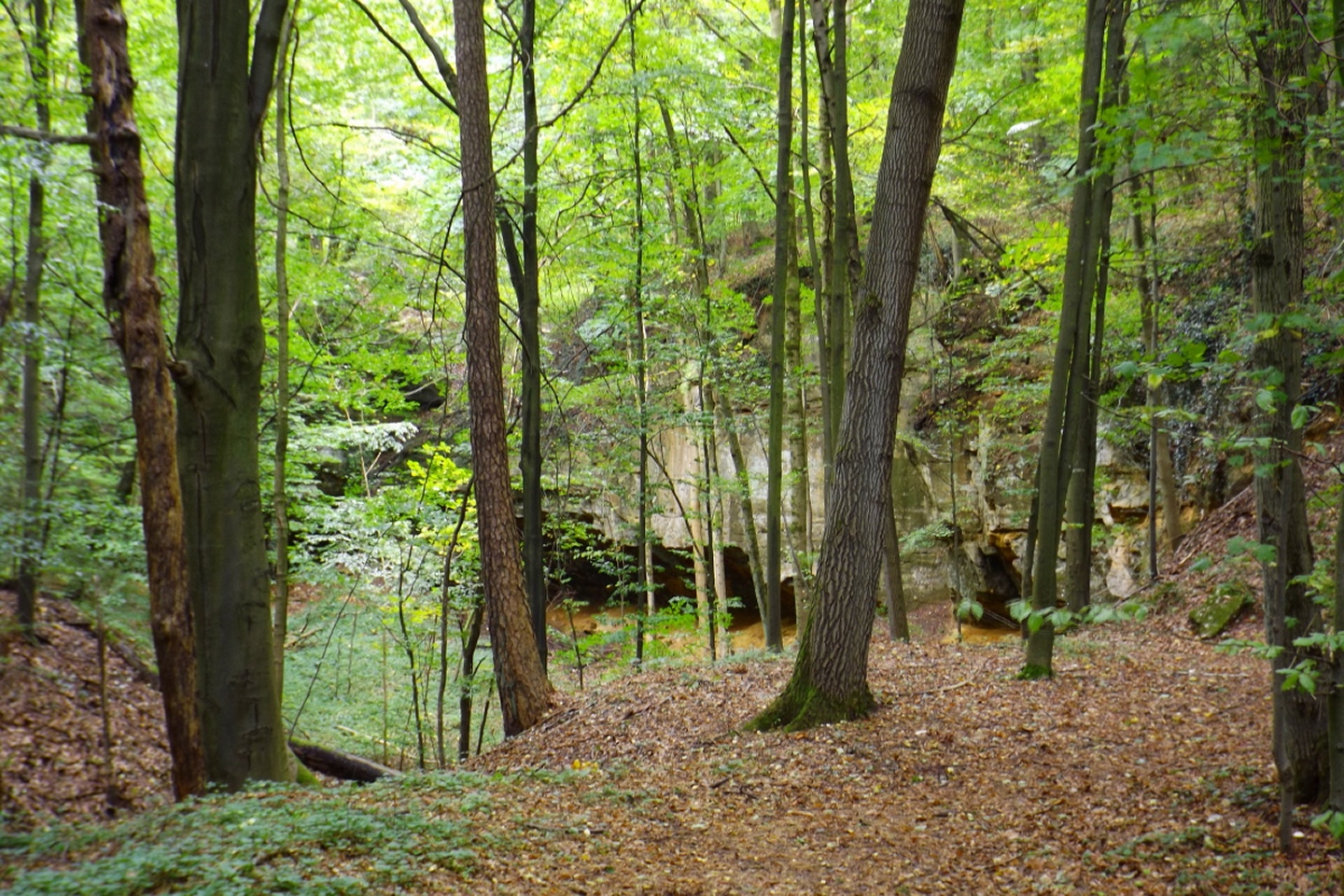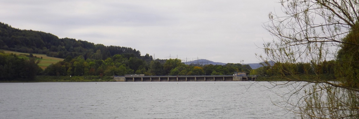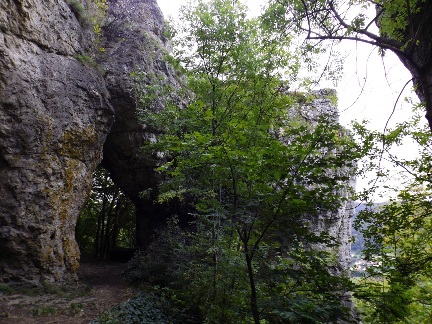 Eigentlich wollte ich wie in einer Routenbeschreibung, die ich im Internet gefunden hatte, in Happurg oder zumindest am Stausee starten, aber dann lachte mich der Wanderparkplatz am Ortsende von Förrenbach an. Talhatscher am Anfang ist besser als am Schluss, also stellte ich mein Auto dort ab. Zunächst folgte ich dem Rad- und Wanderweg am Ostufer des Sees entlang nach Happurg, immer wieder versehen mit Schautafeln zur Geschichte des Ortes. Denn neben der keltischen Besiedelung gibt es auch eine dunkle Seite, ein Regime, das man in Deutschland ja eigentlich gar nicht erwähnen darf, ließ im Berg eine Rüstungsfabrik bauen und brachte die Zwangsarbeiter in einem eigens dafür errichteten Lager unter, das inzwischen im See versunken ist. In Happurg angekommen, ging es erst einmal zehn Höhenmeter bergab und dann an der katholischen Kirche vorbei, irgendwie schien mir dieser Bau ein treffendes Symbol für den Zustand und der Geisteshaltung dieser Organisation. Bei einer Gabelung ist es egal, ob man den oberen oder unteren Weg nimmt, ein schottisches Volkslied, mit dem eine meiner Lieblingsbands ihre Konzerte zu beschließen pflegt, kam mir in den Sinn. Als die Glocke der evangelischen Kirche, welche alt und solide ist, vier Uhr schlug, folgte ich der Grabenstraße bergauf zum Höhenweg bis zum Kriegerdenkmal. An diesem führt der Weg schlecht erkennbar links vorbei, man kann aber auch die Treppen nehmen und das für mich fragwürdige Bauwerk umrunden, wichtig ist nur, 20 Meter dahinter in den Wald abzubiegen. Jetzt geht es endlich bergauf, aber nicht wirklich steil, zumindest im Vergleich mit den Alpen (und auch einem Teil des späteren Abstiegs). Bald kam ich an einem zugemauerten Stolleneingang zur erwähnten Fabrik vorbei und wurde mit dem Kernproblem der Tour konfrontiert, den Lichtverhältnissen. Es war schlicht und einfach nicht möglich, mit der gewohnten ISO 64 zu fotografieren, ich musste teilweise bis auf 800 hochgehen, dementsprechend grobkörnig sehen einige Fotos aus. Nach einem kurzen Bergpfad landete ich auf einer Fahrstraße, die bereits am Wall entlang nach oben führte, zwei Minuten später erreichte ich ein weiteres Taferl und bog nach links auf den Wallrundweg ab, der mit einem grünen Punkt markiert ist. Zwischendurch gibt es immer wieder kleine Pfade nach links, hinaus aus den Bäumen, zu Aussichtspunkten nach Happurg und Hersbruck. Später biegt der Weg nach Osten, bevor der Zustieg aus Pommelsbrunn heraufkommt und nach einem Gegenanstieg der Pfad den Weg verlässt und auf den Ostwall abbiegt. Diesen verließ ich gleich wieder, um den etwa 100 Meter entfernt liegenden Gipfel des Bocksberges mitzunehmen, aber danach bleibt man eigentlich bis zum höchsten Punkt der gesamten Houbirg auf dem Wall. An einer Stelle, wohl dem östlichen Zugangstor, ist ein Einschnitt, an dem man einen Weg nach Arzlohe kreuzt und dazu absteigen muss, aber auf der anderen Seite geht es gleich wieder auf dem Wall weiter. Wenn der Pfad den Wall endgültig verlässt, kann man entweder dem Punkt folgen oder wie ich nach rechts ins Gelände ausweichen und den kleinen Rücken mit dem Gipfel mitnehmen, anschließend ist es unschwer, wieder zum offiziellen Pfad zurückzufinden. Dieser führt jetzt aus der keltischen Siedlung hinaus zur Kante des Hohen Felsen, von dem aus man schöne Aussicht über den See und die gegenüberliegenden Hügel sowie ins Tal oberhalb von Förrenbach hat. Wenn alle lohnenden Punkte besucht sind, führt eine Treppe hinunter zum Fuß des Felsen, wo hinter einem doppelten Felsentor eine große Höhle wartet, die ebenfalls bereits in der Steinzeit bewohnt war. Zurück vor dem Felsentor war für mich nicht ganz erkennbar, wohin der markierte Weg führte, wohl als Querung parallel am Wall entlang nach unten, aber da gab es ja noch eine unmarkierte Spur direkt den Hang hinunter, sicher 45 Grad steil. Ich hatte zwar nur meine Mittelgebirgsstiefel an, aber mit verlängerten Stöcken geht das schon. 100 Höhenmeter unterhalb stieß ich dann auf den Wanderweg, der den Hang vom unteren Teil der Siedlung kommend quert und folgte ihm bis zu einer Einmündung, bei der ich wieder auf den grünen Punkt stieß. Dieser biegt etwa 300 Meter talauswärts rechts ab in eine weitere Querung nach Happurg, ich blieb jedoch auf dem Forstweg, der mich geradewegs hinunter zum Radweg und zurück zum Wanderparkplatz brachte.