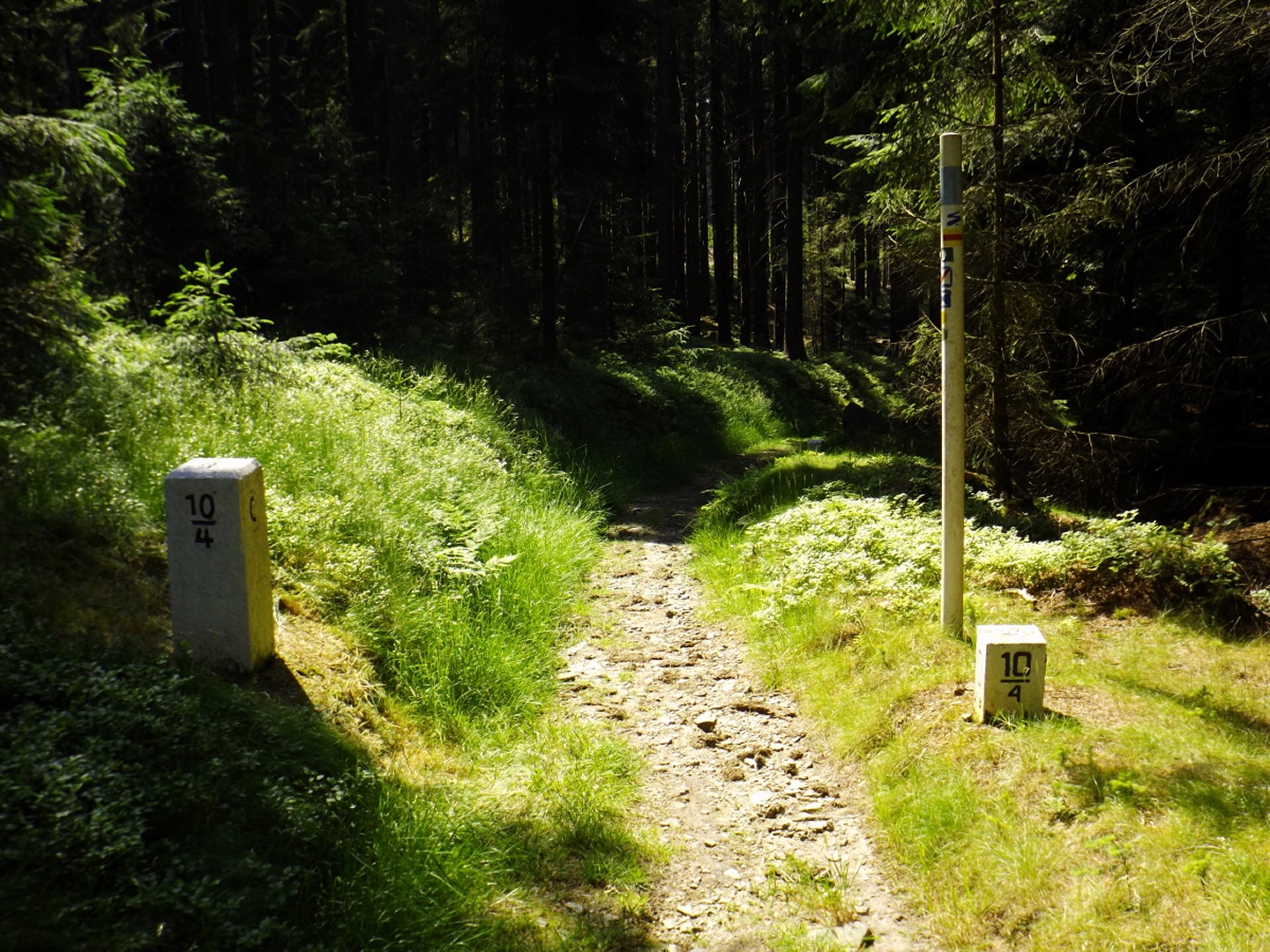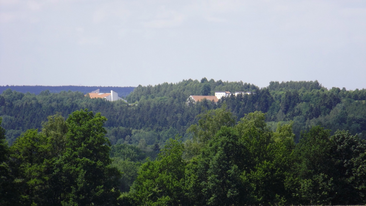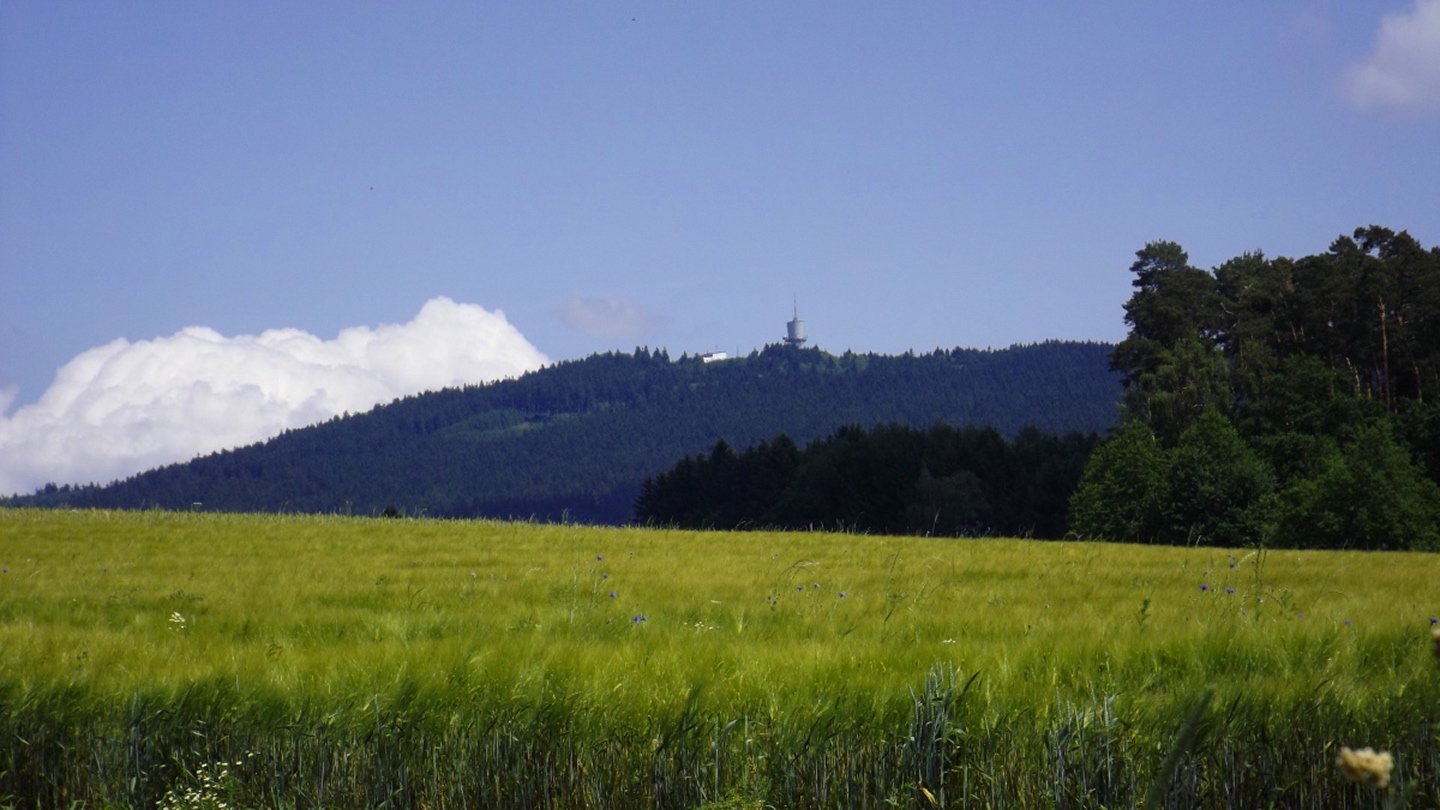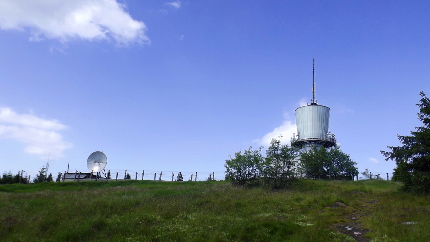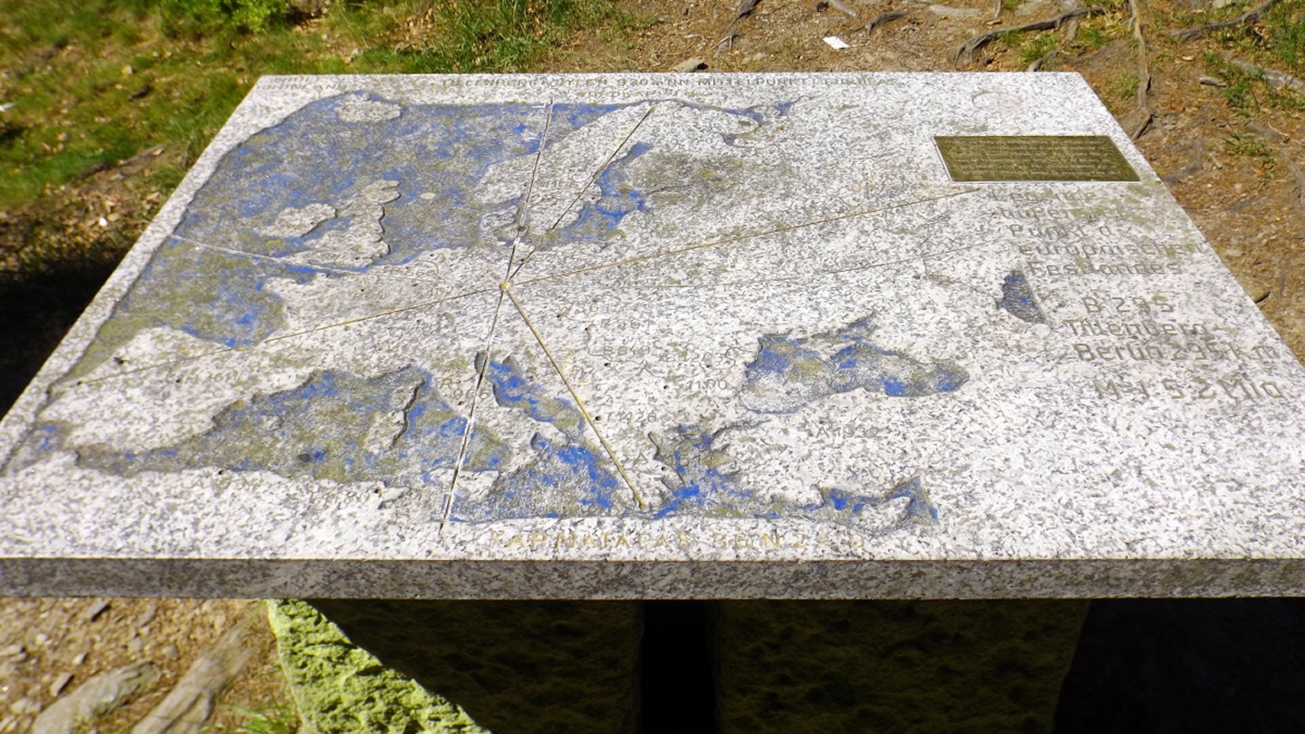 Nach einem kleinen Umweg über Schnaittenbach, der einerseits der größeren Baustelle auf der A 93 zwischen Nabburg und Wernberg, andererseits der bedauerlichen Tatsache geschuldet war, dass einer der beiden Teeläden in Schwandorf demnächst schließt und längst nicht mehr alle Sorten vorrätig hat, diese aber von einem kleinen Hersteller im Städtchen am Rotbühl bezieht, kam ich planmäßig um 14 Uhr in Neualbenreuth an, wo es am Ortseingang einen netten kleinen Parkplatz gibt. Kurze Zeit später waren Schuhe und T-Shirt gewechselt, die neuen Teleskopstöcke am Rucksack montiert und ich auf dem Weg. Dieser führte zunächst ein paar Meter auf der Tirschenreuther Straße hinaus Richtung Altmugl und bog dann beim ersten Bauernhof links ab Richtung Fischzucht Becker. Beim Bauernhof wurde ich freudig von einer Hundedame begrüßt und grüßte freudig zurück. Anschließend ging es zunächst geschottert, nach ein paar Metern auf einem Flurweg zwischen gut bestellten Feldern sanft nach oben. Hier öffneten sich erste Blicke zum Gipfel und zum Grenzlandturm und ich wurde bis zum Waldrand von einem kleinen Schmetterlingsschwarm begleitet. Dort ist ein Abstecher hinauf zu alten Schürfstellen am Pfarrbühl, der in der Kompasskarte Pfaffenbühl heißt, möglich, ich verzichtete jedoch darauf, weil ich mich nicht gleich zu Beginn unter Zeitdruck setzen wollte. Schließlich sollte ich sinnvollerweise vor halb acht wieder am Auto sein, um nicht wie bei der Steinwaldüberschreitung zu spät zum Vortrag auf dem Stammtisch zu kommen. Gleich kommt auf der rechten Seite die Fischzucht, in der eine Familie fischte. Ob es die Betreiber oder Gäste waren, konnte ich nicht in Erfahrung bringen. Am Parkplatz heißt es dann aufpassen, denn der markierte Wanderweg zweigt etwas unscheinbar nach rechts ab und es geht wieder etwas bergauf durch den Wald. Leider mündet diese angenehme Passage etwa 500 Meter nach der Fischzucht in eine Fahrstraße, die auf den nächsten zwei Kilometer ertragen werden muss. Immerhin geht es sanft und stetig bergauf. Zwei Waldwege und eine asphaltierte Abzweigung werden rechts liegen gelassen, bevor ebenfalls auf der rechten Seite der mehrfach markierte Pfad zur Grenze etwas steiler nach oben geht. Dieser kreuzt nach vielleicht 300 Metern eine befahrbare Schneise, wobei man kurz unterhalb dieser Stelle 20 Meter abkürzen kann, indem man den markierten Pfad verlässt und in der Direttissima durch eine Hohlgasse aufsteigt. Der markierte Pfad folgt dieser Schneise für 15 Meter und geht dann wieder geradewegs nach oben, und kurz darauf ist der Grenzsteig erreicht. Hier bog ich links ab und näherte mich endgültig mit jedem Schritt dem Mittelpunkt Europas. Dabei ging es weiterhin stetig nach oben, witzig waren in diesem Abschnitt die Grenzsteine, die bei strenger Auslegung den Pfad zu einem neutralen und eventuell sogar rechtsfreien Korridor machen. Ohne große Vorwarnung taucht dann der Mittelpunkt Europas auf. Er besteht aus einem Relief etwas unterhalb des Weges, einem Bankerl dahinter und einem Gedenkstein noch weiter unten, alles auf deutscher Seite. Die tschechische Seite bietet hingegen ein gepflegtes Hinweisschild mit Höhenangabe und ein etwas luxuriöseres Bankerl, vergleichbar mit dem am Přílba-Gipfel, ein paar Meter oberhalb des Weges. Nach dem unvermeidlichen Viertel Apfel und den noch weniger vermeidlichen Fotos ging ich dann auch weiter Richtung Norden, hinauf zum Abzweig zum Dyleň. Dazwischen liegt noch der Granatbrunnen, den ich als eine der Quellen des Flüsschens Wondreb interpretierte. Dazu durfte ich ein paar Meter vom Weg absteigen, ein Foto machen und die gleichen paar Meter wieder hinaufsteigen. Geschadet hat es nicht. Am Abzweig dann Verwirrung pur: Der tschechische Wegweiser zeigt einen Kilometer zum Gipfel, der deutsche 1,5. Vom Gefühl (und auch den bisherigen Erfahrungen) her stimmt der tschechische. Der Pfad hinauf ist ziemlich gerade und das steilste Stück der Runde, kann aber mit alpinen Steigungen nicht mithalten. Auf halbem Weg mündet er in eine Forststraße, die von Norden heraufzieht. Hier heißt es rechts abbiegen und gleich wieder links auf einen schnurgeraden Fahrweg, der zunächst noch ein wenig aufsteigt, dann aber abfällt und eine nette Aussicht Richtung Osten freigibt. An diesem Sattel führt der Gipfelweg nach links in den Wald hinein und weiter aufwärts. In diesem Bereich sind mir die einzigen Menschen während der Tour begegnet, zunächst ein tschechischer Jogger / Bergläufer, kurz darauf eine deutsche Famile. 60 Höhenmeter später öffnet sich der Wald und man steht vor dem Zaun um die Gipfelanlagen. Früher war das wie so oft militärisch, jetzt wird hier zivil Radio gemacht und gesendet. Ich folgte zunächst einem Pfad am westlichen Rand des Geländes vorbei und wurde mit brauchbaren Aussichtspunkten und, etwa zehn Meter vom Nebengebäude mit dem Gipfelschild entfernt, einem Gipfelbuch belohnt. Es war zwar ziemlich zerfleddert und sicher nicht so schön eingebunden wie das am Přílba, aber immerhin trocken. So genehmigte ich mir nach zweieinhalb Stunden meine Hauptbrotzeit, bevor ich den Pfad bis zum Eck des Zaunes zurückging, an dem zuvor die Markierungen für den Weiterweg zu sehen waren. Dieser führt einmal um das Gelände, naja, etwas weiter als bis zur gegenüberliegenden Ecke und ist schmal, etwas holprig und teilweise etwas zugewachsen, aber hervorragend markiert. An seinem Ende steht ein Schutzhütterl, in dem man auch bei Schlechtwetter jausen kann. Leider folgte die nächste kleine Asphaltpassage, weil es auf dem Zufahrtsweg weitergeht, aber nur 150 Meter. Dann war an einem Baum auf der linken Seite ein Hinweis, dass der Wanderweg gleich links abbiegen wird, und das war auch der Fall. Der nächste Kilometer führt wieder schnurgerade bergab und ist fast so steil wie der Aufstieg vom Grenzpfad. Hier habe ich meinen Knien zuliebe kurz die neuen Stöcke eingesetzt. Am Ende steht der Abzweig Pod Dylení, auf dem ich 