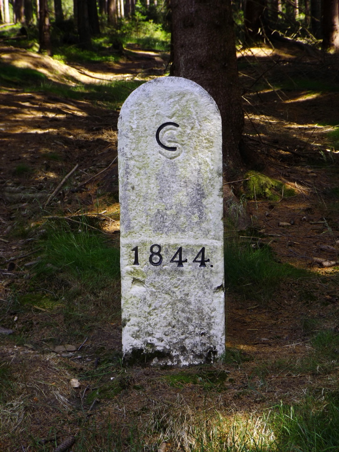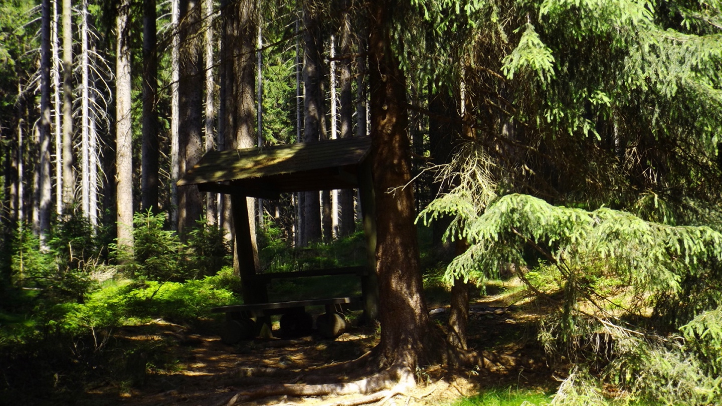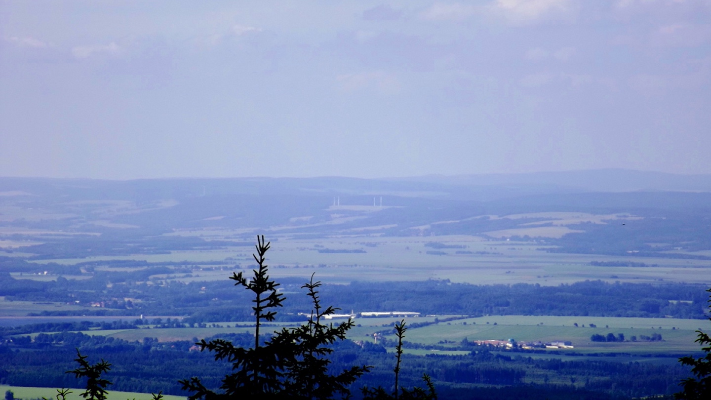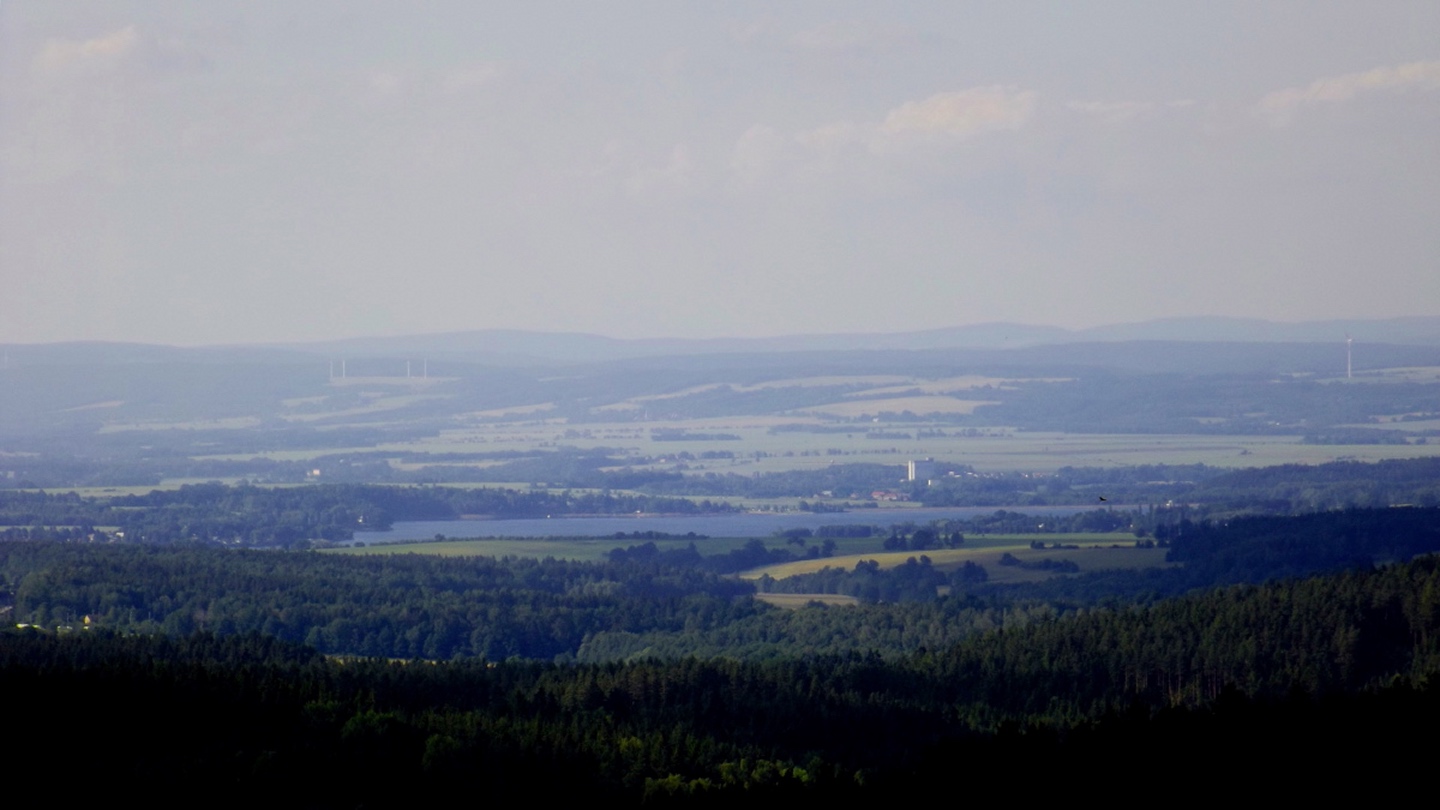 Nach einem kleinen Umweg über Schnaittenbach, der einerseits der größeren Baustelle auf der A 93 zwischen Nabburg und Wernberg, andererseits der bedauerlichen Tatsache geschuldet war, dass einer der beiden Teeläden in Schwandorf demnächst schließt und längst nicht mehr alle Sorten vorrätig hat, diese aber von einem kleinen Hersteller im Städtchen am Rotbühl bezieht, kam ich planmäßig um 14 Uhr in Neualbenreuth an, wo es am Ortseingang einen netten kleinen Parkplatz gibt. Kurze Zeit später waren Schuhe und T-Shirt gewechselt, die neuen Teleskopstöcke am Rucksack montiert und ich auf dem Weg. Dieser führte zunächst ein paar Meter auf der Tirschenreuther Straße hinaus Richtung Altmugl und bog dann beim ersten Bauernhof links ab Richtung Fischzucht Becker. Beim Bauernhof wurde ich freudig von einer Hundedame begrüßt und grüßte freudig zurück. Anschließend ging es zunächst geschottert, nach ein paar Metern auf einem Flurweg zwischen gut bestellten Feldern sanft nach oben. Hier öffneten sich erste Blicke zum Gipfel und zum Grenzlandturm und ich wurde bis zum Waldrand von einem kleinen Schmetterlingsschwarm begleitet. Dort ist ein Abstecher hinauf zu alten Schürfstellen am Pfarrbühl, der in der Kompasskarte Pfaffenbühl heißt, möglich, ich verzichtete jedoch darauf, weil ich mich nicht gleich zu Beginn unter Zeitdruck setzen wollte. Schließlich sollte ich sinnvollerweise vor halb acht wieder am Auto sein, um nicht wie bei der Steinwaldüberschreitung zu spät zum Vortrag auf dem Stammtisch zu kommen. Gleich kommt auf der rechten Seite die Fischzucht, in der eine Familie fischte. Ob es die Betreiber oder Gäste waren, konnte ich nicht in Erfahrung bringen. Am Parkplatz heißt es dann aufpassen, denn der markierte Wanderweg zweigt etwas unscheinbar nach rechts ab und es geht wieder etwas bergauf durch den Wald. Leider mündet diese angenehme Passage etwa 500 Meter nach der Fischzucht in eine Fahrstraße, die auf den nächsten zwei Kilometer ertragen werden muss. Immerhin geht es sanft und stetig bergauf. Zwei Waldwege und eine asphaltierte Abzweigung werden rechts liegen gelassen, bevor ebenfalls auf der rechten Seite der mehrfach markierte Pfad zur Grenze etwas steiler nach oben geht. Dieser kreuzt nach vielleicht 300 Metern eine befahrbare Schneise, wobei man kurz unterhalb dieser Stelle 20 Meter abkürzen kann, indem man den markierten Pfad verlässt und in der Direttissima durch eine Hohlgasse aufsteigt. Der markierte Pfad folgt dieser Schneise für 15 Meter und geht dann wieder geradewegs nach oben, und kurz darauf ist der Grenzsteig erreicht. Hier bog ich links ab und näherte mich endgültig mit jedem Schritt dem Mittelpunkt Europas. Dabei ging es weiterhin stetig nach oben, witzig waren in diesem Abschnitt die Grenzsteine, die bei strenger Auslegung den Pfad zu einem neutralen und eventuell sogar rechtsfreien Korridor machen. Ohne große Vorwarnung taucht dann der Mittelpunkt Europas auf. Er besteht aus einem Relief etwas unterhalb des Weges, einem Bankerl dahinter und einem Gedenkstein noch weiter unten, alles auf deutscher Seite. Die tschechische Seite bietet hingegen ein gepflegtes Hinweisschild mit Höhenangabe und ein etwas luxuriöseres Bankerl, vergleichbar mit dem am Přílba-Gipfel, ein paar Meter oberhalb des Weges. Nach dem unvermeidlichen Viertel Apfel und den noch weniger vermeidlichen Fotos ging ich dann auch weiter Richtung Norden, hinauf zum Abzweig zum Dyleň. Dazwischen liegt noch der Granatbrunnen, den ich als eine der Quellen des Flüsschens Wondreb interpretierte. Dazu durfte ich ein paar Meter vom Weg absteigen, ein Foto machen und die gleichen paar Meter wieder hinaufsteigen. Geschadet hat es nicht. Am Abzweig dann Verwirrung pur: Der tschechische Wegweiser zeigt einen Kilometer zum Gipfel, der deutsche 1,5. Vom Gefühl (und auch den bisherigen Erfahrungen) her stimmt der tschechische. Der Pfad hinauf ist ziemlich gerade und das steilste Stück der Runde, kann aber mit alpinen Steigungen nicht mithalten. Auf halbem Weg mündet er in eine Forststraße, die von Norden heraufzieht. Hier heißt es rechts abbiegen und gleich wieder links auf einen schnurgeraden Fahrweg, der zunächst noch ein wenig aufsteigt, dann aber abfällt und eine nette Aussicht Richtung Osten freigibt. An diesem Sattel führt der Gipfelweg nach links in den Wald hinein und weiter aufwärts. In diesem Bereich sind mir die einzigen Menschen während der Tour begegnet, zunächst ein tschechischer Jogger / Bergläufer, kurz darauf eine deutsche Famile. 60 Höhenmeter später öffnet sich der Wald und man steht vor dem Zaun um die Gipfelanlagen. Früher war das wie so oft militärisch, jetzt wird hier zivil Radio gemacht und gesendet. Ich folgte zunächst einem Pfad am westlichen Rand des Geländes vorbei und wurde mit brauchbaren Aussichtspunkten und, etwa zehn Meter vom Nebengebäude mit dem Gipfelschild entfernt, einem Gipfelbuch belohnt. Es war zwar ziemlich zerfleddert und sicher nicht so schön eingebunden wie das am Přílba, aber immerhin trocken. So genehmigte ich mir nach zweieinhalb Stunden meine Hauptbrotzeit, bevor ich den Pfad bis zum Eck des Zaunes zurückging, an dem zuvor die Markierungen für den Weiterweg zu sehen waren. Dieser führt einmal um das Gelände, naja, etwas weiter als bis zur gegenüberliegenden Ecke und ist schmal, etwas holprig und teilweise etwas zugewachsen, aber hervorragend markiert. An seinem Ende steht ein Schutzhütterl, in dem man auch bei Schlechtwetter jausen kann. Leider folgte die nächste kleine Asphaltpassage, weil es auf dem Zufahrtsweg weitergeht, aber nur 150 Meter. Dann war an einem Baum auf der linken Seite ein Hinweis, dass der Wanderweg gleich links abbiegen wird, und das war auch der Fall. Der nächste Kilometer führt wieder schnurgerade bergab und ist fast so steil wie der Aufstieg vom Grenzpfad. Hier habe ich meinen Knien zuliebe kurz die neuen Stöcke eingesetzt. Am Ende steht der Abzweig Pod Dylení, auf dem ich 
