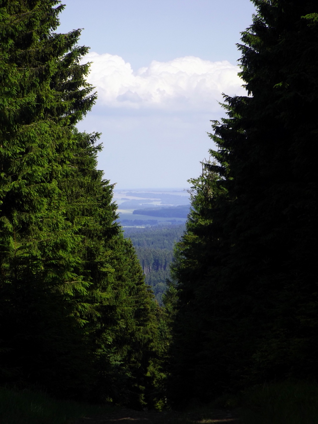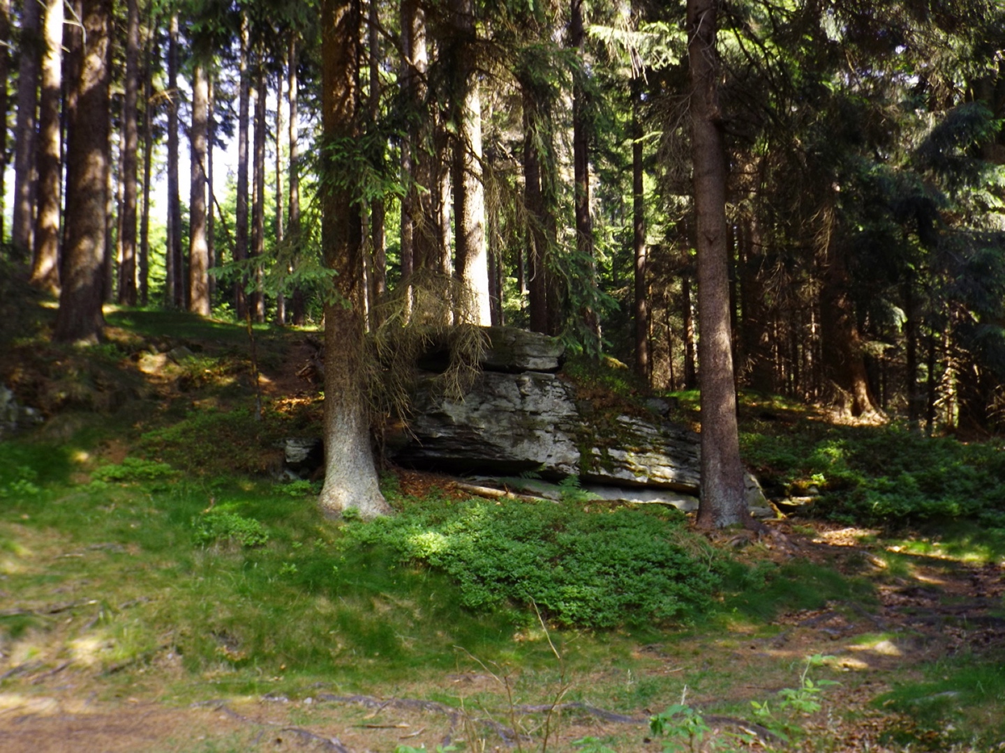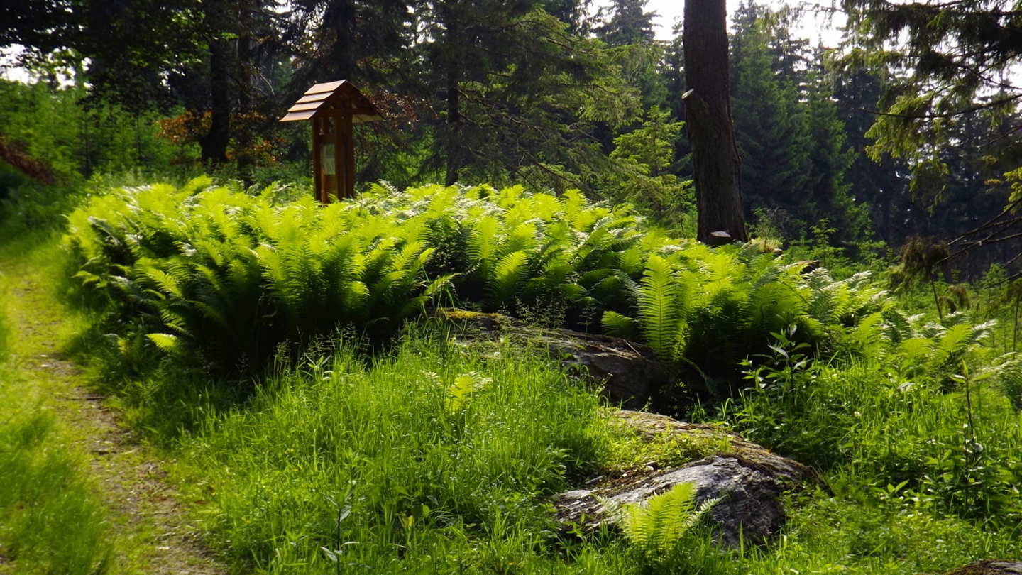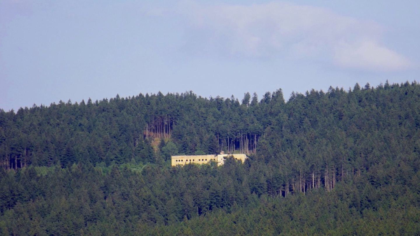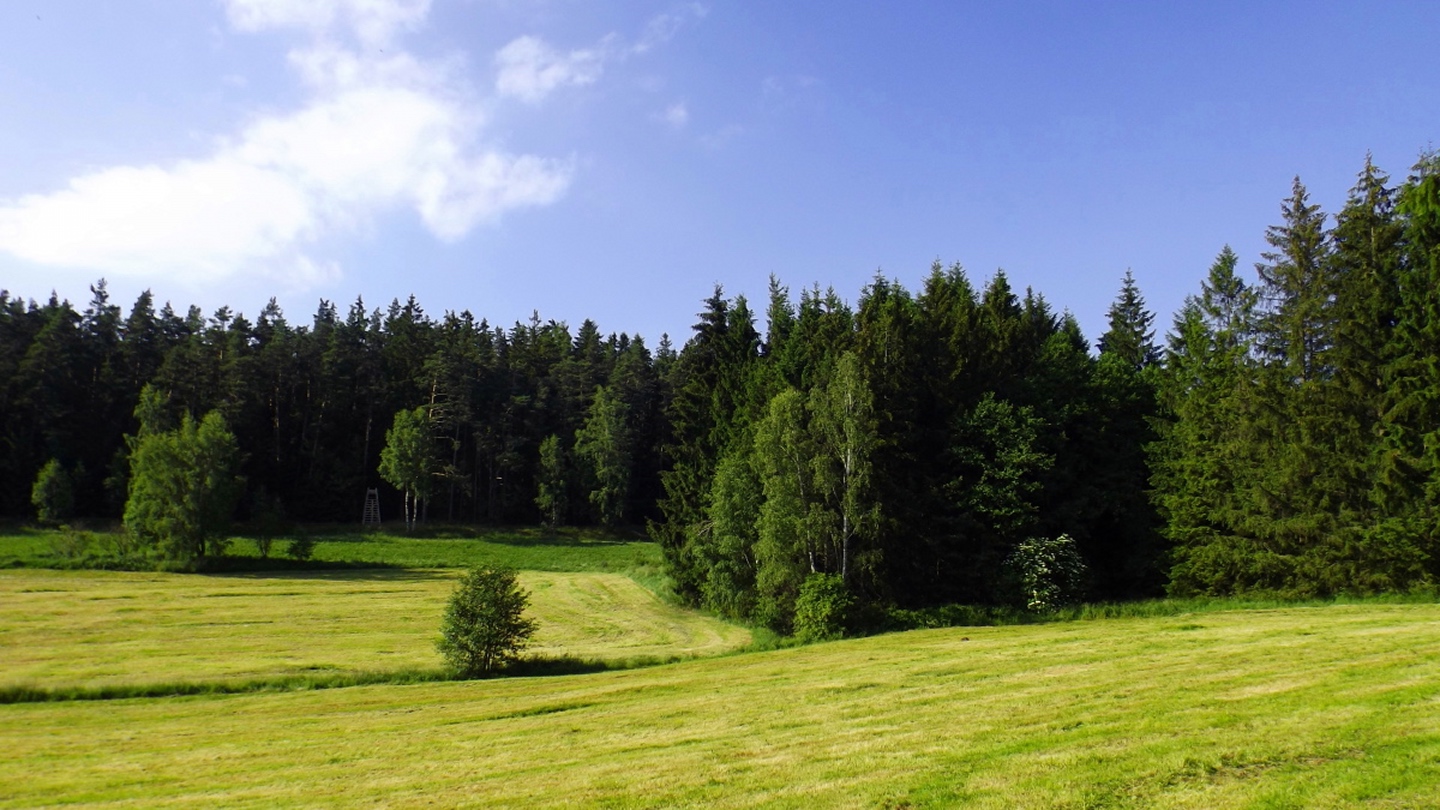 Nach einem kleinen Umweg über Schnaittenbach, der einerseits der größeren Baustelle auf der A 93 zwischen Nabburg und Wernberg, andererseits der bedauerlichen Tatsache geschuldet war, dass einer der beiden Teeläden in Schwandorf demnächst schließt und längst nicht mehr alle Sorten vorrätig hat, diese aber von einem kleinen Hersteller im Städtchen am Rotbühl bezieht, kam ich planmäßig um 14 Uhr in Neualbenreuth an, wo es am Ortseingang einen netten kleinen Parkplatz gibt. Kurze Zeit später waren Schuhe und T-Shirt gewechselt, die neuen Teleskopstöcke am Rucksack montiert und ich auf dem Weg. Dieser führte zunächst ein paar Meter auf der Tirschenreuther Straße hinaus Richtung Altmugl und bog dann beim ersten Bauernhof links ab Richtung Fischzucht Becker. Beim Bauernhof wurde ich freudig von einer Hundedame begrüßt und grüßte freudig zurück. Anschließend ging es zunächst geschottert, nach ein paar Metern auf einem Flurweg zwischen gut bestellten Feldern sanft nach oben. Hier öffneten sich erste Blicke zum Gipfel und zum Grenzlandturm und ich wurde bis zum Waldrand von einem kleinen Schmetterlingsschwarm begleitet. Dort ist ein Abstecher hinauf zu alten Schürfstellen am Pfarrbühl, der in der Kompasskarte Pfaffenbühl heißt, möglich, ich verzichtete jedoch darauf, weil ich mich nicht gleich zu Beginn unter Zeitdruck setzen wollte. Schließlich sollte ich sinnvollerweise vor halb acht wieder am Auto sein, um nicht wie bei der Steinwaldüberschreitung zu spät zum Vortrag auf dem Stammtisch zu kommen. Gleich kommt auf der rechten Seite die Fischzucht, in der eine Familie fischte. Ob es die Betreiber oder Gäste waren, konnte ich nicht in Erfahrung bringen. Am Parkplatz heißt es dann aufpassen, denn der markierte Wanderweg zweigt etwas unscheinbar nach rechts ab und es geht wieder etwas bergauf durch den Wald. Leider mündet diese angenehme Passage etwa 500 Meter nach der Fischzucht in eine Fahrstraße, die auf den nächsten zwei Kilometer ertragen werden muss. Immerhin geht es sanft und stetig bergauf. Zwei Waldwege und eine asphaltierte Abzweigung werden rechts liegen gelassen, bevor ebenfalls auf der rechten Seite der mehrfach markierte Pfad zur Grenze etwas steiler nach oben geht. Dieser kreuzt nach vielleicht 300 Metern eine befahrbare Schneise, wobei man kurz unterhalb dieser Stelle 20 Meter abkürzen kann, indem man den markierten Pfad verlässt und in der Direttissima durch eine Hohlgasse aufsteigt. Der markierte Pfad folgt dieser Schneise für 15 Meter und geht dann wieder geradewegs nach oben, und kurz darauf ist der Grenzsteig erreicht. Hier bog ich links ab und näherte mich endgültig mit jedem Schritt dem Mittelpunkt Europas. Dabei ging es weiterhin stetig nach oben, witzig waren in diesem Abschnitt die Grenzsteine, die bei strenger Auslegung den Pfad zu einem neutralen und eventuell sogar rechtsfreien Korridor machen. Ohne große Vorwarnung taucht dann der Mittelpunkt Europas auf. Er besteht aus einem Relief etwas unterhalb des Weges, einem Bankerl dahinter und einem Gedenkstein noch weiter unten, alles auf deutscher Seite. Die tschechische Seite bietet hingegen ein gepflegtes Hinweisschild mit Höhenangabe und ein etwas luxuriöseres Bankerl, vergleichbar mit dem am Přílba-Gipfel, ein paar Meter oberhalb des Weges. Nach dem unvermeidlichen Viertel Apfel und den noch weniger vermeidlichen Fotos ging ich dann auch weiter Richtung Norden, hinauf zum Abzweig zum Dyleň. Dazwischen liegt noch der Granatbrunnen, den ich als eine der Quellen des Flüsschens Wondreb interpretierte. Dazu durfte ich ein paar Meter vom Weg absteigen, ein Foto machen und die gleichen paar Meter wieder hinaufsteigen. Geschadet hat es nicht. Am Abzweig dann Verwirrung pur: Der tschechische Wegweiser zeigt einen Kilometer zum Gipfel, der deutsche 1,5. Vom Gefühl (und auch den bisherigen Erfahrungen) her stimmt der tschechische. Der Pfad hinauf ist ziemlich gerade und das steilste Stück der Runde, kann aber mit alpinen Steigungen nicht mithalten. Auf halbem Weg mündet er in eine Forststraße, die von Norden heraufzieht. Hier heißt es rechts abbiegen und gleich wieder links auf einen schnurgeraden Fahrweg, der zunächst noch ein wenig aufsteigt, dann aber abfällt und eine nette Aussicht Richtung Osten freigibt. An diesem Sattel führt der Gipfelweg nach links in den Wald hinein und weiter aufwärts. In diesem Bereich sind mir die einzigen Menschen während der Tour begegnet, zunächst ein tschechischer Jogger / Bergläufer, kurz darauf eine deutsche Famile. 60 Höhenmeter später öffnet sich der Wald und man steht vor dem Zaun um die Gipfelanlagen. Früher war das wie so oft militärisch, jetzt wird hier zivil Radio gemacht und gesendet. Ich folgte zunächst einem Pfad am westlichen Rand des Geländes vorbei und wurde mit brauchbaren Aussichtspunkten und, etwa zehn Meter vom Nebengebäude mit dem Gipfelschild entfernt, einem Gipfelbuch belohnt. Es war zwar ziemlich zerfleddert und sicher nicht so schön eingebunden wie das am Přílba, aber immerhin trocken. So genehmigte ich mir nach zweieinhalb Stunden meine Hauptbrotzeit, bevor ich den Pfad bis zum Eck des Zaunes zurückging, an dem zuvor die Markierungen für den Weiterweg zu sehen waren. Dieser führt einmal um das Gelände, naja, etwas weiter als bis zur gegenüberliegenden Ecke und ist schmal, etwas holprig und teilweise etwas zugewachsen, aber hervorragend markiert. An seinem Ende steht ein Schutzhütterl, in dem man auch bei Schlechtwetter jausen kann. Leider folgte die nächste kleine Asphaltpassage, weil es auf dem Zufahrtsweg weitergeht, aber nur 150 Meter. Dann war an einem Baum auf der linken Seite ein Hinweis, dass der Wanderweg gleich links abbiegen wird, und das war auch der Fall. Der nächste Kilometer führt wieder schnurgerade bergab und ist fast so steil wie der Aufstieg vom Grenzpfad. Hier habe ich meinen Knien zuliebe kurz die neuen Stöcke eingesetzt. Am Ende steht der Abzweig Pod Dylení, auf dem ich 