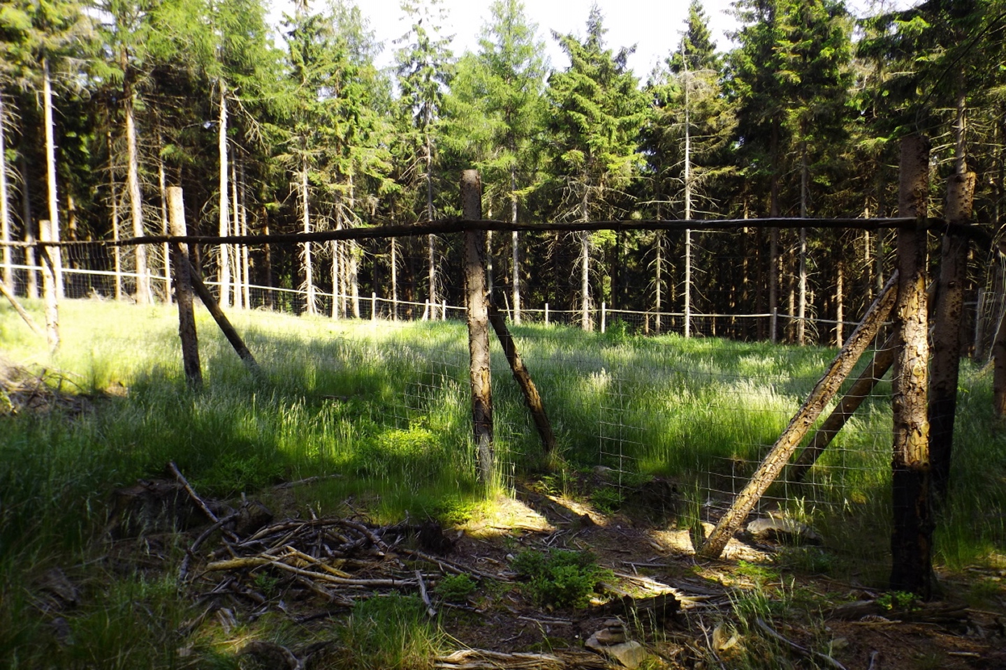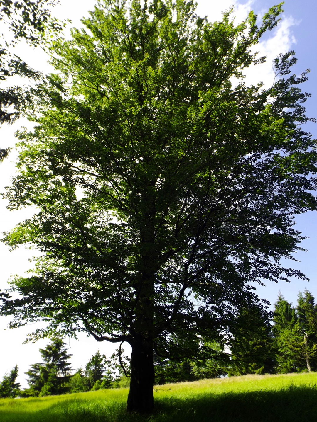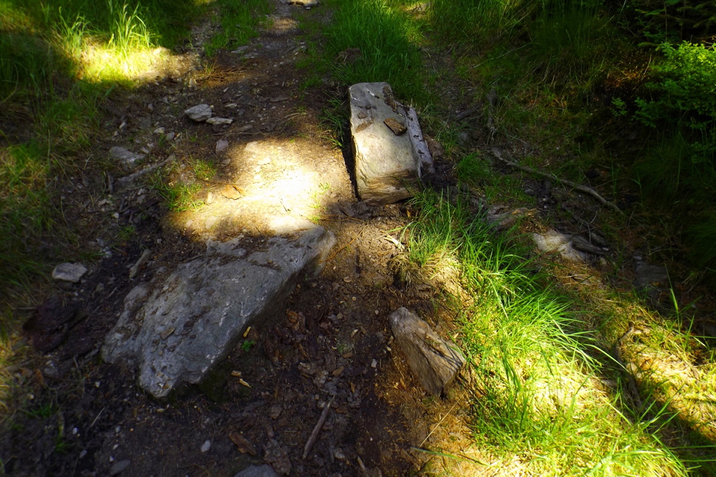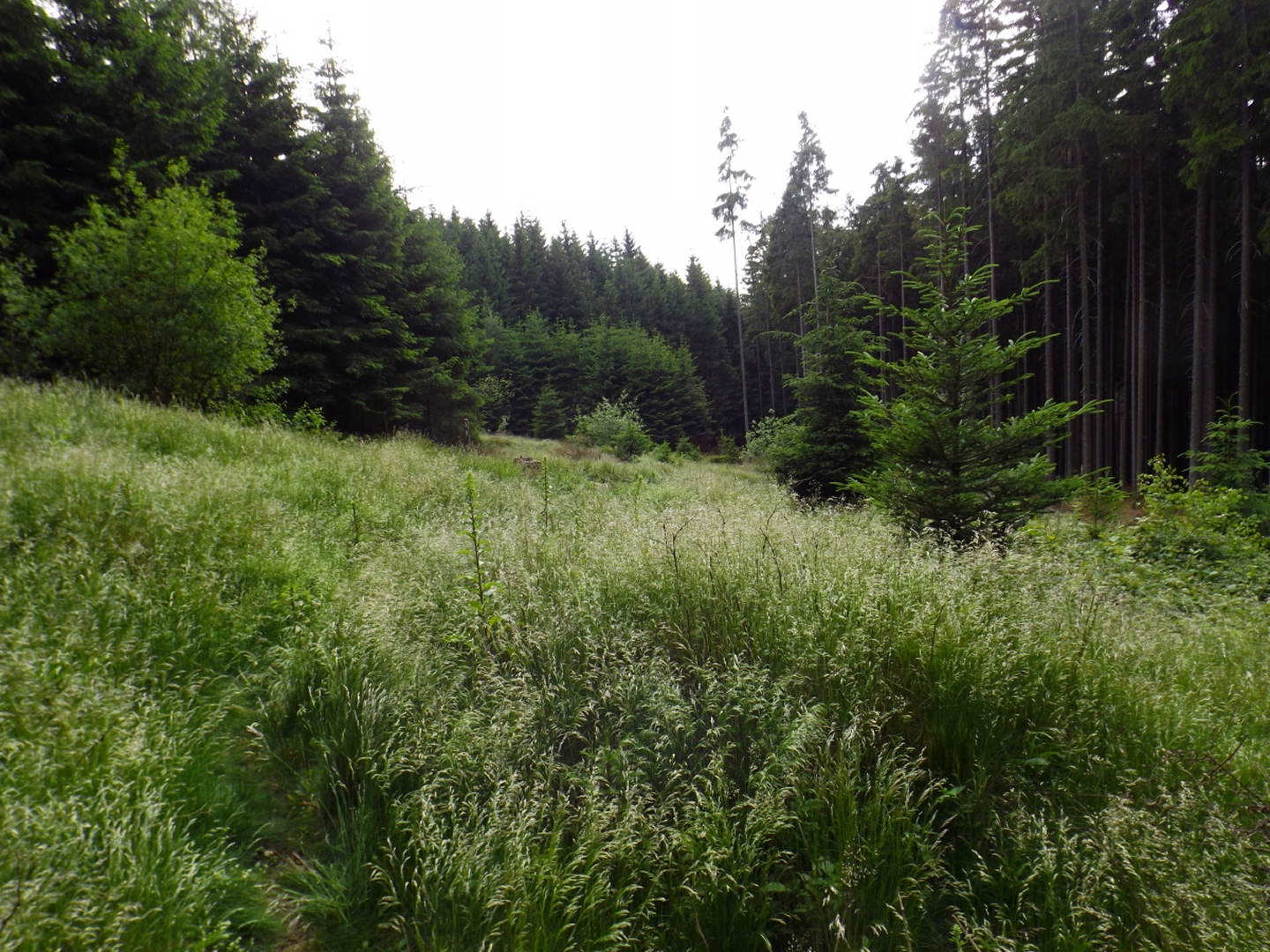 Nach einem kleinen Umweg über Schnaittenbach, der einerseits der größeren Baustelle auf der A 93 zwischen Nabburg und Wernberg, andererseits der bedauerlichen Tatsache geschuldet war, dass einer der beiden Teeläden in Schwandorf demnächst schließt und längst nicht mehr alle Sorten vorrätig hat, diese aber von einem kleinen Hersteller im Städtchen am Rotbühl bezieht, kam ich planmäßig um 14 Uhr in Neualbenreuth an, wo es am Ortseingang einen netten kleinen Parkplatz gibt. Kurze Zeit später waren Schuhe und T-Shirt gewechselt, die neuen Teleskopstöcke am Rucksack montiert und ich auf dem Weg. Dieser führte zunächst ein paar Meter auf der Tirschenreuther Straße hinaus Richtung Altmugl und bog dann beim ersten Bauernhof links ab Richtung Fischzucht Becker. Beim Bauernhof wurde ich freudig von einer Hundedame begrüßt und grüßte freudig zurück. Anschließend ging es zunächst geschottert, nach ein paar Metern auf einem Flurweg zwischen gut bestellten Feldern sanft nach oben. Hier öffneten sich erste Blicke zum Gipfel und zum Grenzlandturm und ich wurde bis zum Waldrand von einem kleinen Schmetterlingsschwarm begleitet. Dort ist ein Abstecher hinauf zu alten Schürfstellen am Pfarrbühl, der in der Kompasskarte Pfaffenbühl heißt, möglich, ich verzichtete jedoch darauf, weil ich mich nicht gleich zu Beginn unter Zeitdruck setzen wollte. Schließlich sollte ich sinnvollerweise vor halb acht wieder am Auto sein, um nicht wie bei der Steinwaldüberschreitung zu spät zum Vortrag auf dem Stammtisch zu kommen. Gleich kommt auf der rechten Seite die Fischzucht, in der eine Familie fischte. Ob es die Betreiber oder Gäste waren, konnte ich nicht in Erfahrung bringen. Am Parkplatz heißt es dann aufpassen, denn der markierte Wanderweg zweigt etwas unscheinbar nach rechts ab und es geht wieder etwas bergauf durch den Wald. Leider mündet diese angenehme Passage etwa 500 Meter nach der Fischzucht in eine Fahrstraße, die auf den nächsten zwei Kilometer ertragen werden muss. Immerhin geht es sanft und stetig bergauf. Zwei Waldwege und eine asphaltierte Abzweigung werden rechts liegen gelassen, bevor ebenfalls auf der rechten Seite der mehrfach markierte Pfad zur Grenze etwas steiler nach oben geht. Dieser kreuzt nach vielleicht 300 Metern eine befahrbare Schneise, wobei man kurz unterhalb dieser Stelle 20 Meter abkürzen kann, indem man den markierten Pfad verlässt und in der Direttissima durch eine Hohlgasse aufsteigt. Der markierte Pfad folgt dieser Schneise für 15 Meter und geht dann wieder geradewegs nach oben, und kurz darauf ist der Grenzsteig erreicht. Hier bog ich links ab und näherte mich endgültig mit jedem Schritt dem Mittelpunkt Europas. Dabei ging es weiterhin stetig nach oben, witzig waren in diesem Abschnitt die Grenzsteine, die bei strenger Auslegung den Pfad zu einem neutralen und eventuell sogar rechtsfreien Korridor machen. Ohne große Vorwarnung taucht dann der Mittelpunkt Europas auf. Er besteht aus einem Relief etwas unterhalb des Weges, einem Bankerl dahinter und einem Gedenkstein noch weiter unten, alles auf deutscher Seite. Die tschechische Seite bietet hingegen ein gepflegtes Hinweisschild mit Höhenangabe und ein etwas luxuriöseres Bankerl, vergleichbar mit dem am Přílba-Gipfel, ein paar Meter oberhalb des Weges. Nach dem unvermeidlichen Viertel Apfel und den noch weniger vermeidlichen Fotos ging ich dann auch weiter Richtung Norden, hinauf zum Abzweig zum Dyleň. Dazwischen liegt noch der Granatbrunnen, den ich als eine der Quellen des Flüsschens Wondreb interpretierte. Dazu durfte ich ein paar Meter vom Weg absteigen, ein Foto machen und die gleichen paar Meter wieder hinaufsteigen. Geschadet hat es nicht. Am Abzweig dann Verwirrung pur: Der tschechische Wegweiser zeigt einen Kilometer zum Gipfel, der deutsche 1,5. Vom Gefühl (und auch den bisherigen Erfahrungen) her stimmt der tschechische. Der Pfad hinauf ist ziemlich gerade und das steilste Stück der Runde, kann aber mit alpinen Steigungen nicht mithalten. Auf halbem Weg mündet er in eine Forststraße, die von Norden heraufzieht. Hier heißt es rechts abbiegen und gleich wieder links auf einen schnurgeraden Fahrweg, der zunächst noch ein wenig aufsteigt, dann aber abfällt und eine nette Aussicht Richtung Osten freigibt. An diesem Sattel führt der Gipfelweg nach links in den Wald hinein und weiter aufwärts. In diesem Bereich sind mir die einzigen Menschen während der Tour begegnet, zunächst ein tschechischer Jogger / Bergläufer, kurz darauf eine deutsche Famile. 60 Höhenmeter später öffnet sich der Wald und man steht vor dem Zaun um die Gipfelanlagen. Früher war das wie so oft militärisch, jetzt wird hier zivil Radio gemacht und gesendet. Ich folgte zunächst einem Pfad am westlichen Rand des Geländes vorbei und wurde mit brauchbaren Aussichtspunkten und, etwa zehn Meter vom Nebengebäude mit dem Gipfelschild entfernt, einem Gipfelbuch belohnt. Es war zwar ziemlich zerfleddert und sicher nicht so schön eingebunden wie das am Přílba, aber immerhin trocken. So genehmigte ich mir nach zweieinhalb Stunden meine Hauptbrotzeit, bevor ich den Pfad bis zum Eck des Zaunes zurückging, an dem zuvor die Markierungen für den Weiterweg zu sehen waren. Dieser führt einmal um das Gelände, naja, etwas weiter als bis zur gegenüberliegenden Ecke und ist schmal, etwas holprig und teilweise etwas zugewachsen, aber hervorragend markiert. An seinem Ende steht ein Schutzhütterl, in dem man auch bei Schlechtwetter jausen kann. Leider folgte die nächste kleine Asphaltpassage, weil es auf dem Zufahrtsweg weitergeht, aber nur 150 Meter. Dann war an einem Baum auf der linken Seite ein Hinweis, dass der Wanderweg gleich links abbiegen wird, und das war auch der Fall. Der nächste Kilometer führt wieder schnurgerade bergab und ist fast so steil wie der Aufstieg vom Grenzpfad. Hier habe ich meinen Knien zuliebe kurz die neuen Stöcke eingesetzt. Am Ende steht der Abzweig Pod Dylení, auf dem ich 