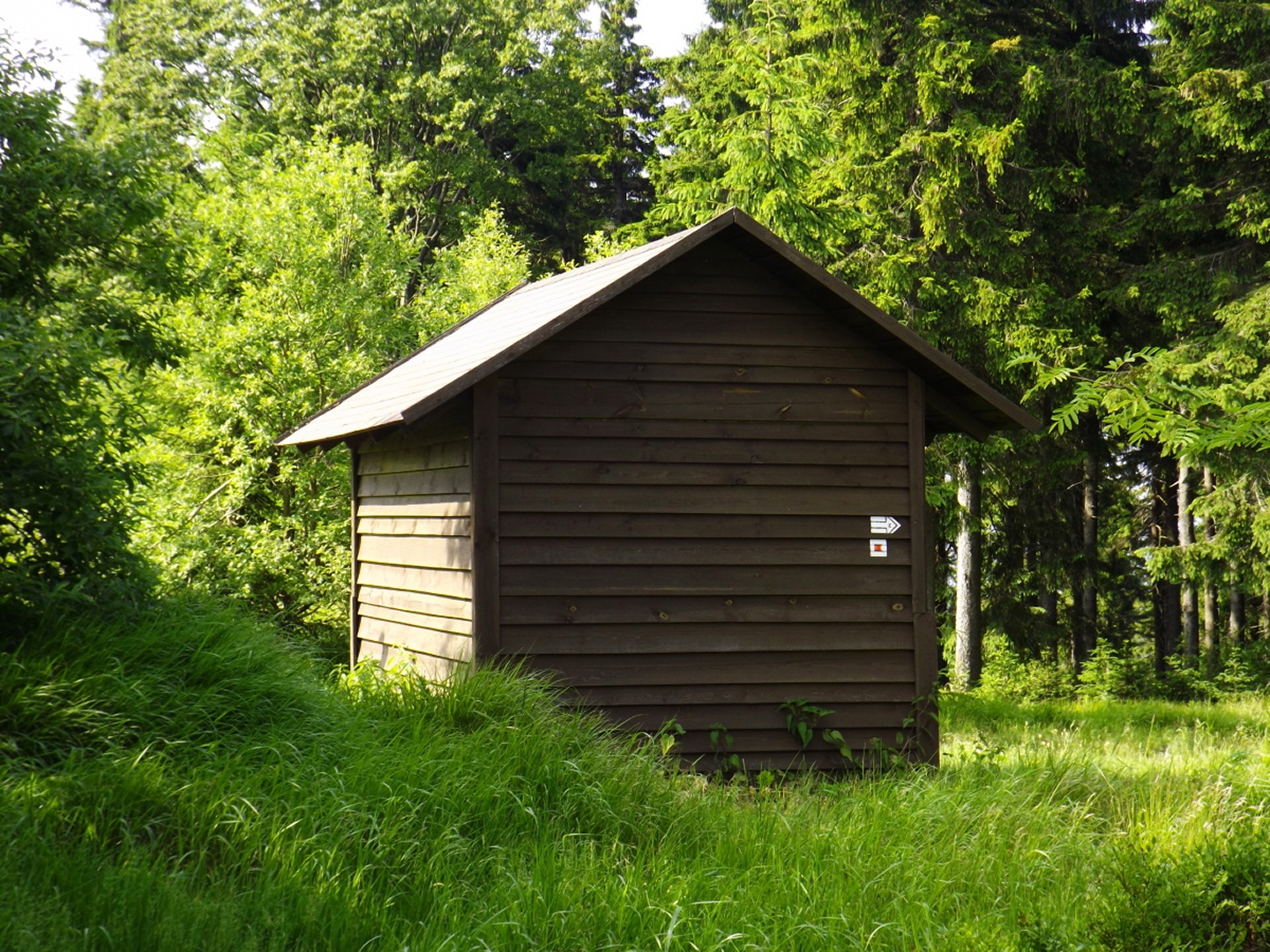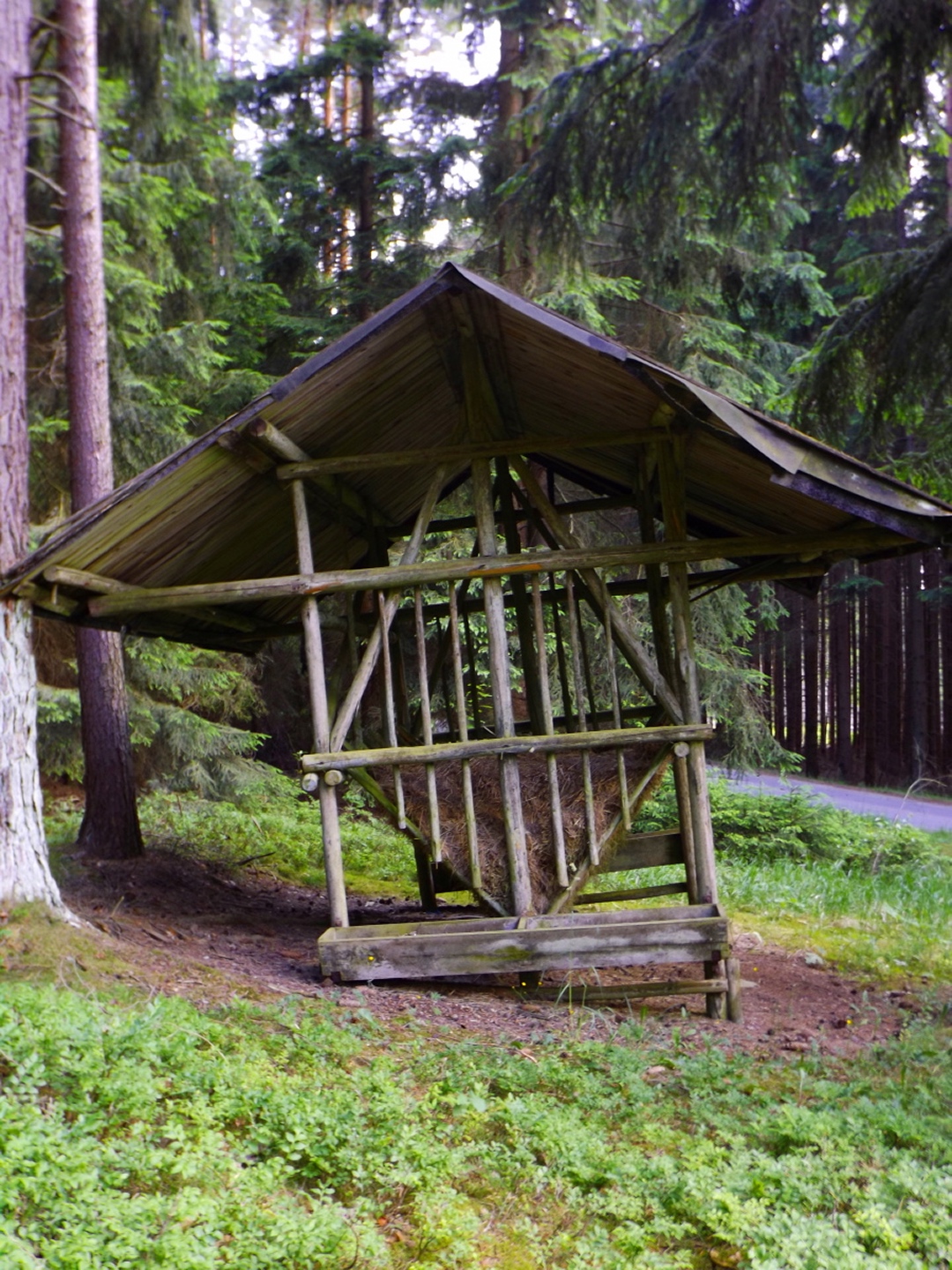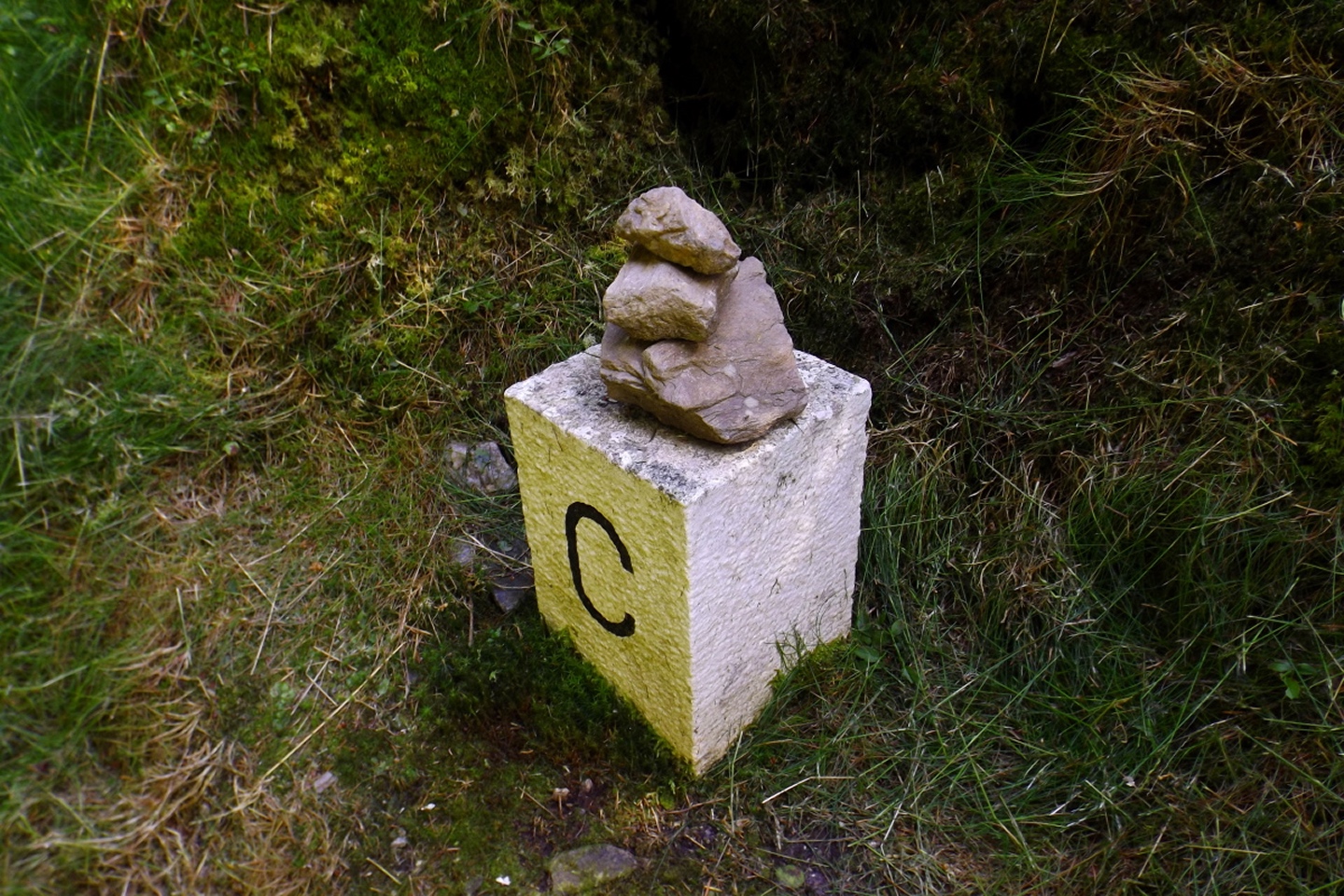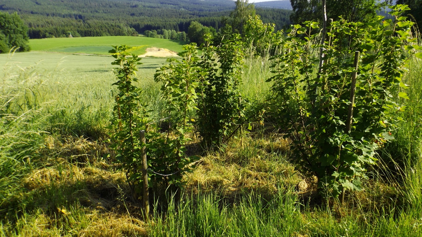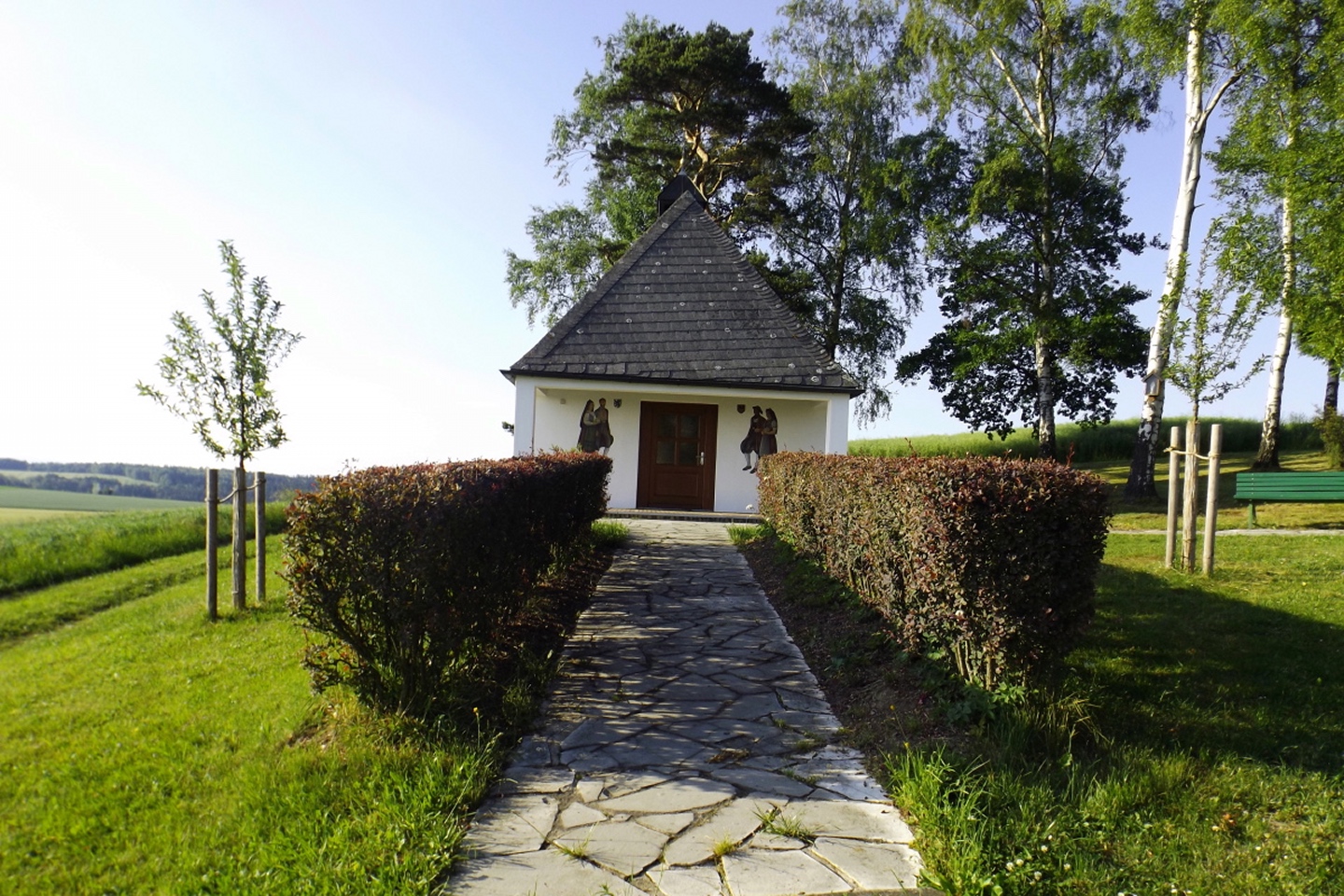 Nach einem kleinen Umweg über Schnaittenbach, der einerseits der größeren Baustelle auf der A 93 zwischen Nabburg und Wernberg, andererseits der bedauerlichen Tatsache geschuldet war, dass einer der beiden Teeläden in Schwandorf demnächst schließt und längst nicht mehr alle Sorten vorrätig hat, diese aber von einem kleinen Hersteller im Städtchen am Rotbühl bezieht, kam ich planmäßig um 14 Uhr in Neualbenreuth an, wo es am Ortseingang einen netten kleinen Parkplatz gibt. Kurze Zeit später waren Schuhe und T-Shirt gewechselt, die neuen Teleskopstöcke am Rucksack montiert und ich auf dem Weg. Dieser führte zunächst ein paar Meter auf der Tirschenreuther Straße hinaus Richtung Altmugl und bog dann beim ersten Bauernhof links ab Richtung Fischzucht Becker. Beim Bauernhof wurde ich freudig von einer Hundedame begrüßt und grüßte freudig zurück. Anschließend ging es zunächst geschottert, nach ein paar Metern auf einem Flurweg zwischen gut bestellten Feldern sanft nach oben. Hier öffneten sich erste Blicke zum Gipfel und zum Grenzlandturm und ich wurde bis zum Waldrand von einem kleinen Schmetterlingsschwarm begleitet. Dort ist ein Abstecher hinauf zu alten Schürfstellen am Pfarrbühl, der in der Kompasskarte Pfaffenbühl heißt, möglich, ich verzichtete jedoch darauf, weil ich mich nicht gleich zu Beginn unter Zeitdruck setzen wollte. Schließlich sollte ich sinnvollerweise vor halb acht wieder am Auto sein, um nicht wie bei der Steinwaldüberschreitung zu spät zum Vortrag auf dem Stammtisch zu kommen. Gleich kommt auf der rechten Seite die Fischzucht, in der eine Familie fischte. Ob es die Betreiber oder Gäste waren, konnte ich nicht in Erfahrung bringen. Am Parkplatz heißt es dann aufpassen, denn der markierte Wanderweg zweigt etwas unscheinbar nach rechts ab und es geht wieder etwas bergauf durch den Wald. Leider mündet diese angenehme Passage etwa 500 Meter nach der Fischzucht in eine Fahrstraße, die auf den nächsten zwei Kilometer ertragen werden muss. Immerhin geht es sanft und stetig bergauf. Zwei Waldwege und eine asphaltierte Abzweigung werden rechts liegen gelassen, bevor ebenfalls auf der rechten Seite der mehrfach markierte Pfad zur Grenze etwas steiler nach oben geht. Dieser kreuzt nach vielleicht 300 Metern eine befahrbare Schneise, wobei man kurz unterhalb dieser Stelle 20 Meter abkürzen kann, indem man den markierten Pfad verlässt und in der Direttissima durch eine Hohlgasse aufsteigt. Der markierte Pfad folgt dieser Schneise für 15 Meter und geht dann wieder geradewegs nach oben, und kurz darauf ist der Grenzsteig erreicht. Hier bog ich links ab und näherte mich endgültig mit jedem Schritt dem Mittelpunkt Europas. Dabei ging es weiterhin stetig nach oben, witzig waren in diesem Abschnitt die Grenzsteine, die bei strenger Auslegung den Pfad zu einem neutralen und eventuell sogar rechtsfreien Korridor machen. Ohne große Vorwarnung taucht dann der Mittelpunkt Europas auf. Er besteht aus einem Relief etwas unterhalb des Weges, einem Bankerl dahinter und einem Gedenkstein noch weiter unten, alles auf deutscher Seite. Die tschechische Seite bietet hingegen ein gepflegtes Hinweisschild mit Höhenangabe und ein etwas luxuriöseres Bankerl, vergleichbar mit dem am Přílba-Gipfel, ein paar Meter oberhalb des Weges. Nach dem unvermeidlichen Viertel Apfel und den noch weniger vermeidlichen Fotos ging ich dann auch weiter Richtung Norden, hinauf zum Abzweig zum Dyleň. Dazwischen liegt noch der Granatbrunnen, den ich als eine der Quellen des Flüsschens Wondreb interpretierte. Dazu durfte ich ein paar Meter vom Weg absteigen, ein Foto machen und die gleichen paar Meter wieder hinaufsteigen. Geschadet hat es nicht. Am Abzweig dann Verwirrung pur: Der tschechische Wegweiser zeigt einen Kilometer zum Gipfel, der deutsche 1,5. Vom Gefühl (und auch den bisherigen Erfahrungen) her stimmt der tschechische. Der Pfad hinauf ist ziemlich gerade und das steilste Stück der Runde, kann aber mit alpinen Steigungen nicht mithalten. Auf halbem Weg mündet er in eine Forststraße, die von Norden heraufzieht. Hier heißt es rechts abbiegen und gleich wieder links auf einen schnurgeraden Fahrweg, der zunächst noch ein wenig aufsteigt, dann aber abfällt und eine nette Aussicht Richtung Osten freigibt. An diesem Sattel führt der Gipfelweg nach links in den Wald hinein und weiter aufwärts. In diesem Bereich sind mir die einzigen Menschen während der Tour begegnet, zunächst ein tschechischer Jogger / Bergläufer, kurz darauf eine deutsche Famile. 60 Höhenmeter später öffnet sich der Wald und man steht vor dem Zaun um die Gipfelanlagen. Früher war das wie so oft militärisch, jetzt wird hier zivil Radio gemacht und gesendet. Ich folgte zunächst einem Pfad am westlichen Rand des Geländes vorbei und wurde mit brauchbaren Aussichtspunkten und, etwa zehn Meter vom Nebengebäude mit dem Gipfelschild entfernt, einem Gipfelbuch belohnt. Es war zwar ziemlich zerfleddert und sicher nicht so schön eingebunden wie das am Přílba, aber immerhin trocken. So genehmigte ich mir nach zweieinhalb Stunden meine Hauptbrotzeit, bevor ich den Pfad bis zum Eck des Zaunes zurückging, an dem zuvor die Markierungen für den Weiterweg zu sehen waren. Dieser führt einmal um das Gelände, naja, etwas weiter als bis zur gegenüberliegenden Ecke und ist schmal, etwas holprig und teilweise etwas zugewachsen, aber hervorragend markiert. An seinem Ende steht ein Schutzhütterl, in dem man auch bei Schlechtwetter jausen kann. Leider folgte die nächste kleine Asphaltpassage, weil es auf dem Zufahrtsweg weitergeht, aber nur 150 Meter. Dann war an einem Baum auf der linken Seite ein Hinweis, dass der Wanderweg gleich links abbiegen wird, und das war auch der Fall. Der nächste Kilometer führt wieder schnurgerade bergab und ist fast so steil wie der Aufstieg vom Grenzpfad. Hier habe ich meinen Knien zuliebe kurz die neuen Stöcke eingesetzt. Am Ende steht der Abzweig Pod Dylení, auf dem ich 