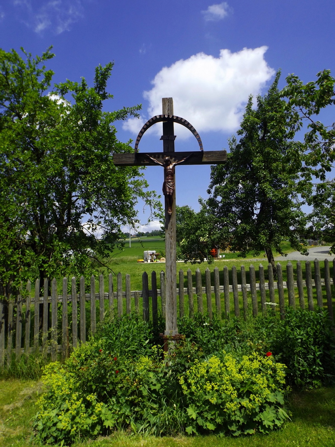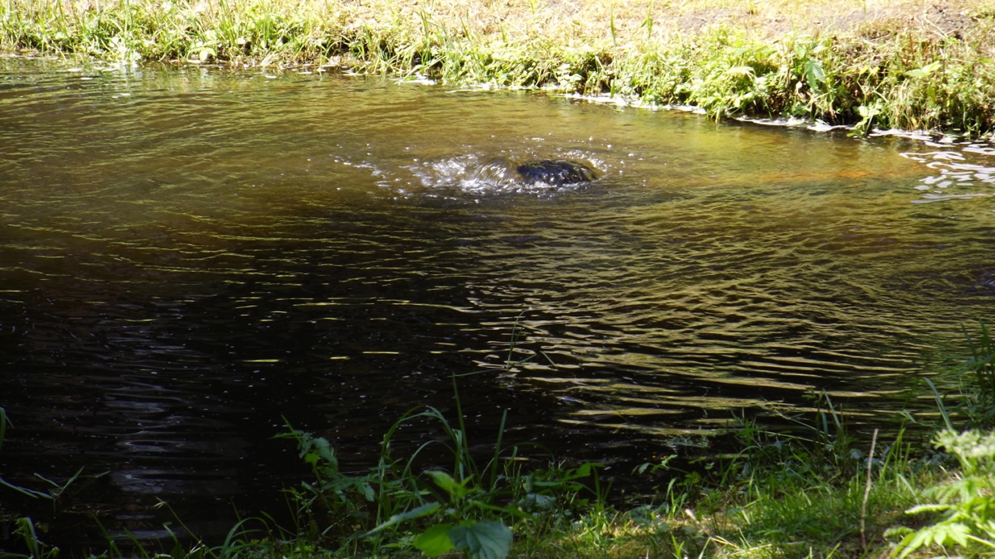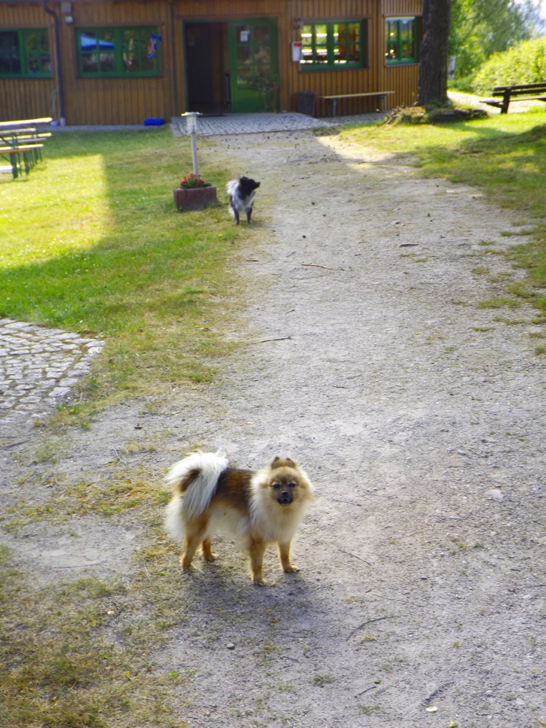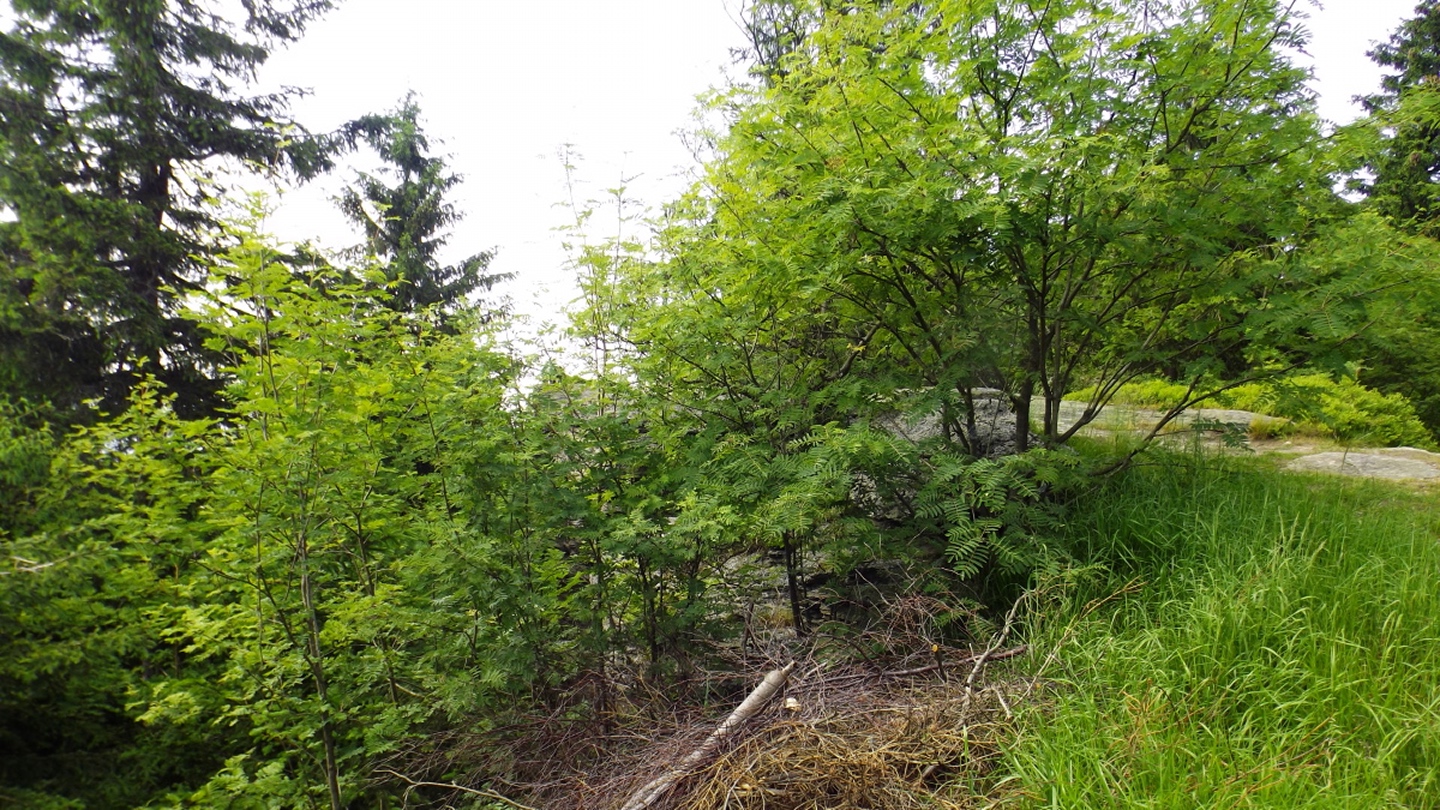 Nach einem kleinen Umweg über Schnaittenbach, der einerseits der größeren Baustelle auf der A 93 zwischen Nabburg und Wernberg, andererseits der bedauerlichen Tatsache geschuldet war, dass einer der beiden Teeläden in Schwandorf demnächst schließt und längst nicht mehr alle Sorten vorrätig hat, diese aber von einem kleinen Hersteller im Städtchen am Rotbühl bezieht, kam ich planmäßig um 14 Uhr in Neualbenreuth an, wo es am Ortseingang einen netten kleinen Parkplatz gibt. Kurze Zeit später waren Schuhe und T-Shirt gewechselt, die neuen Teleskopstöcke am Rucksack montiert und ich auf dem Weg. Dieser führte zunächst ein paar Meter auf der Tirschenreuther Straße hinaus Richtung Altmugl und bog dann beim ersten Bauernhof links ab Richtung Fischzucht Becker. Beim Bauernhof wurde ich freudig von einer Hundedame begrüßt und grüßte freudig zurück. Anschließend ging es zunächst geschottert, nach ein paar Metern auf einem Flurweg zwischen gut bestellten Feldern sanft nach oben. Hier öffneten sich erste Blicke zum Gipfel und zum Grenzlandturm und ich wurde bis zum Waldrand von einem kleinen Schmetterlingsschwarm begleitet. Dort ist ein Abstecher hinauf zu alten Schürfstellen am Pfarrbühl, der in der Kompasskarte Pfaffenbühl heißt, möglich, ich verzichtete jedoch darauf, weil ich mich nicht gleich zu Beginn unter Zeitdruck setzen wollte. Schließlich sollte ich sinnvollerweise vor halb acht wieder am Auto sein, um nicht wie bei der Steinwaldüberschreitung zu spät zum Vortrag auf dem Stammtisch zu kommen. Gleich kommt auf der rechten Seite die Fischzucht, in der eine Familie fischte. Ob es die Betreiber oder Gäste waren, konnte ich nicht in Erfahrung bringen. Am Parkplatz heißt es dann aufpassen, denn der markierte Wanderweg zweigt etwas unscheinbar nach rechts ab und es geht wieder etwas bergauf durch den Wald. Leider mündet diese angenehme Passage etwa 500 Meter nach der Fischzucht in eine Fahrstraße, die auf den nächsten zwei Kilometer ertragen werden muss. Immerhin geht es sanft und stetig bergauf. Zwei Waldwege und eine asphaltierte Abzweigung werden rechts liegen gelassen, bevor ebenfalls auf der rechten Seite der mehrfach markierte Pfad zur Grenze etwas steiler nach oben geht. Dieser kreuzt nach vielleicht 300 Metern eine befahrbare Schneise, wobei man kurz unterhalb dieser Stelle 20 Meter abkürzen kann, indem man den markierten Pfad verlässt und in der Direttissima durch eine Hohlgasse aufsteigt. Der markierte Pfad folgt dieser Schneise für 15 Meter und geht dann wieder geradewegs nach oben, und kurz darauf ist der Grenzsteig erreicht. Hier bog ich links ab und näherte mich endgültig mit jedem Schritt dem Mittelpunkt Europas. Dabei ging es weiterhin stetig nach oben, witzig waren in diesem Abschnitt die Grenzsteine, die bei strenger Auslegung den Pfad zu einem neutralen und eventuell sogar rechtsfreien Korridor machen. Ohne große Vorwarnung taucht dann der Mittelpunkt Europas auf. Er besteht aus einem Relief etwas unterhalb des Weges, einem Bankerl dahinter und einem Gedenkstein noch weiter unten, alles auf deutscher Seite. Die tschechische Seite bietet hingegen ein gepflegtes Hinweisschild mit Höhenangabe und ein etwas luxuriöseres Bankerl, vergleichbar mit dem am Přílba-Gipfel, ein paar Meter oberhalb des Weges. Nach dem unvermeidlichen Viertel Apfel und den noch weniger vermeidlichen Fotos ging ich dann auch weiter Richtung Norden, hinauf zum Abzweig zum Dyleň. Dazwischen liegt noch der Granatbrunnen, den ich als eine der Quellen des Flüsschens Wondreb interpretierte. Dazu durfte ich ein paar Meter vom Weg absteigen, ein Foto machen und die gleichen paar Meter wieder hinaufsteigen. Geschadet hat es nicht. Am Abzweig dann Verwirrung pur: Der tschechische Wegweiser zeigt einen Kilometer zum Gipfel, der deutsche 1,5. Vom Gefühl (und auch den bisherigen Erfahrungen) her stimmt der tschechische. Der Pfad hinauf ist ziemlich gerade und das steilste Stück der Runde, kann aber mit alpinen Steigungen nicht mithalten. Auf halbem Weg mündet er in eine Forststraße, die von Norden heraufzieht. Hier heißt es rechts abbiegen und gleich wieder links auf einen schnurgeraden Fahrweg, der zunächst noch ein wenig aufsteigt, dann aber abfällt und eine nette Aussicht Richtung Osten freigibt. An diesem Sattel führt der Gipfelweg nach links in den Wald hinein und weiter aufwärts. In diesem Bereich sind mir die einzigen Menschen während der Tour begegnet, zunächst ein tschechischer Jogger / Bergläufer, kurz darauf eine deutsche Famile. 60 Höhenmeter später öffnet sich der Wald und man steht vor dem Zaun um die Gipfelanlagen. Früher war das wie so oft militärisch, jetzt wird hier zivil Radio gemacht und gesendet. Ich folgte zunächst einem Pfad am westlichen Rand des Geländes vorbei und wurde mit brauchbaren Aussichtspunkten und, etwa zehn Meter vom Nebengebäude mit dem Gipfelschild entfernt, einem Gipfelbuch belohnt. Es war zwar ziemlich zerfleddert und sicher nicht so schön eingebunden wie das am Přílba, aber immerhin trocken. So genehmigte ich mir nach zweieinhalb Stunden meine Hauptbrotzeit, bevor ich den Pfad bis zum Eck des Zaunes zurückging, an dem zuvor die Markierungen für den Weiterweg zu sehen waren. Dieser führt einmal um das Gelände, naja, etwas weiter als bis zur gegenüberliegenden Ecke und ist schmal, etwas holprig und teilweise etwas zugewachsen, aber hervorragend markiert. An seinem Ende steht ein Schutzhütterl, in dem man auch bei Schlechtwetter jausen kann. Leider folgte die nächste kleine Asphaltpassage, weil es auf dem Zufahrtsweg weitergeht, aber nur 150 Meter. Dann war an einem Baum auf der linken Seite ein Hinweis, dass der Wanderweg gleich links abbiegen wird, und das war auch der Fall. Der nächste Kilometer führt wieder schnurgerade bergab und ist fast so steil wie der Aufstieg vom Grenzpfad. Hier habe ich meinen Knien zuliebe kurz die neuen Stöcke eingesetzt. Am Ende steht der Abzweig Pod Dylení, auf dem ich 