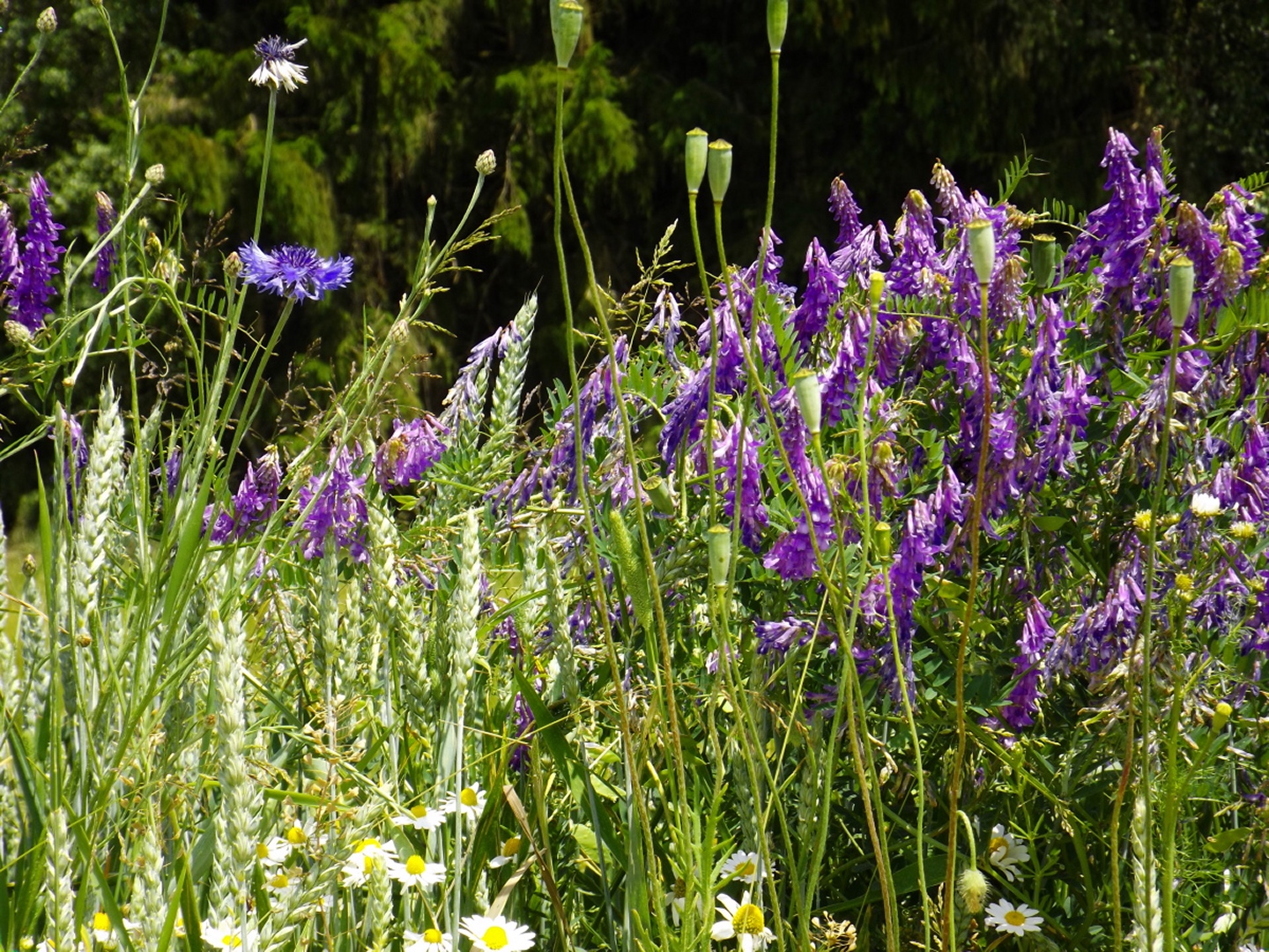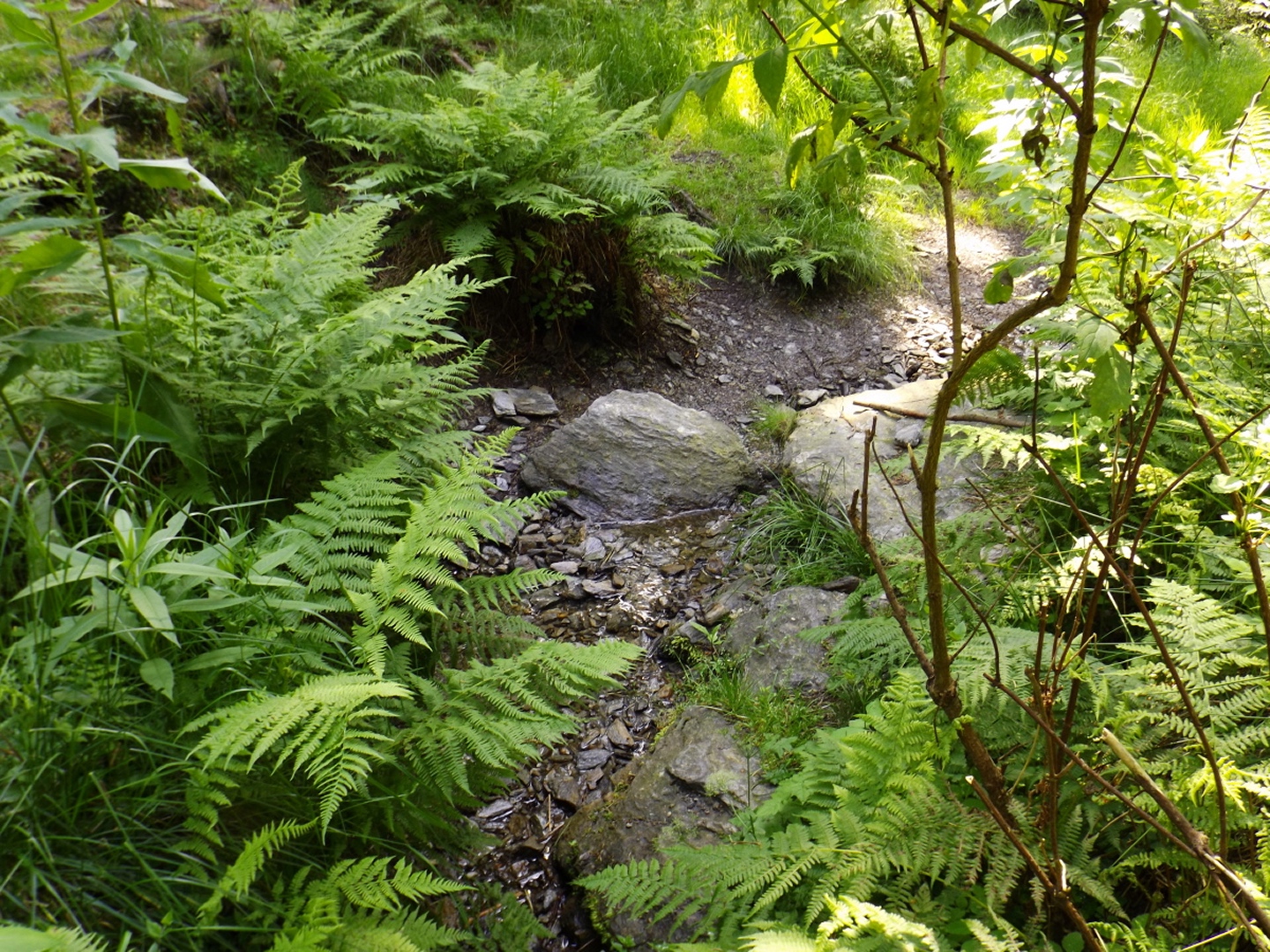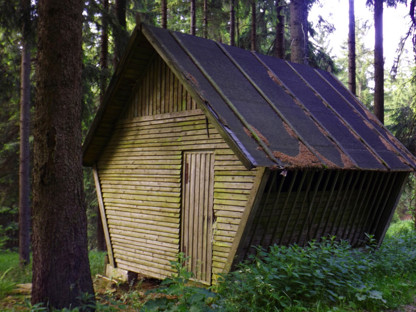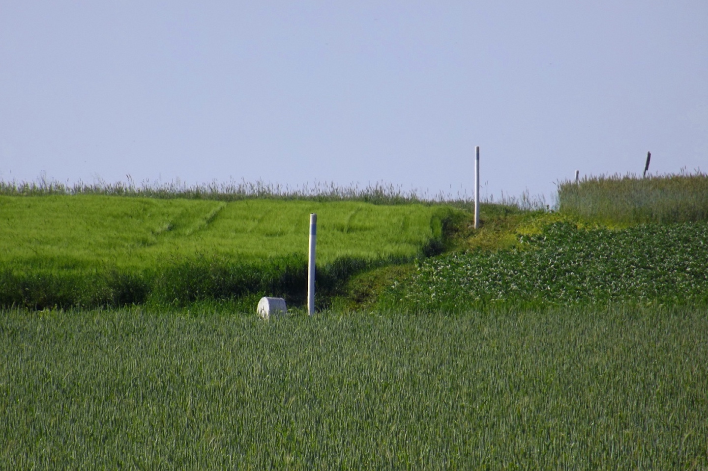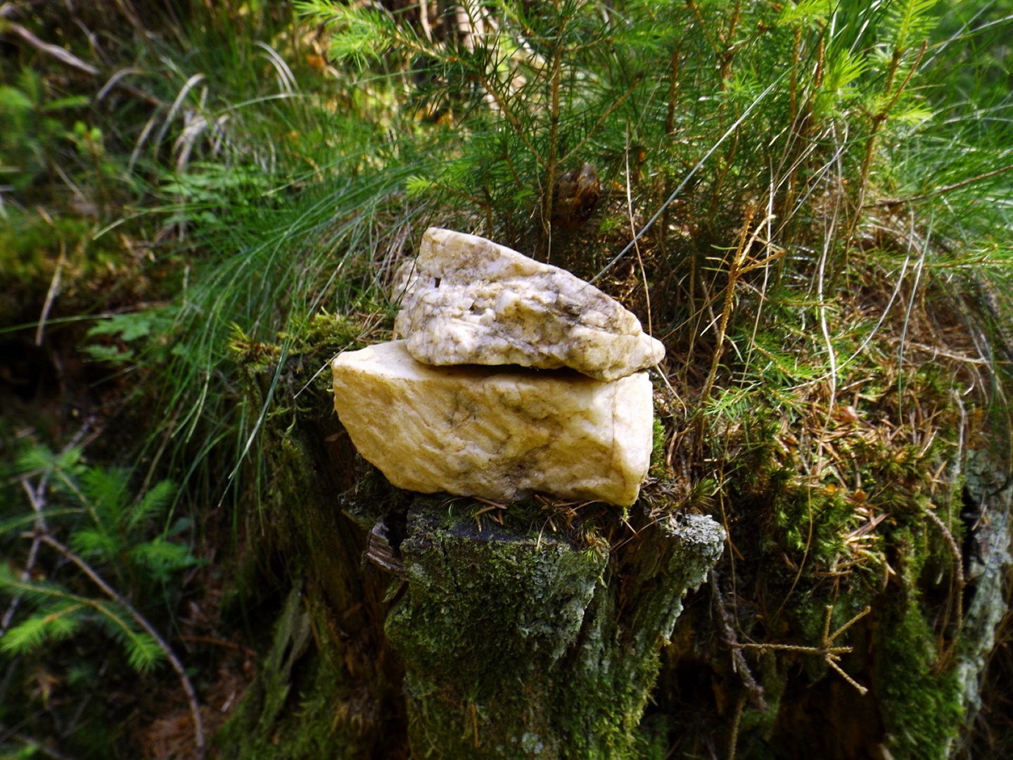 Nach einem kleinen Umweg über Schnaittenbach, der einerseits der größeren Baustelle auf der A 93 zwischen Nabburg und Wernberg, andererseits der bedauerlichen Tatsache geschuldet war, dass einer der beiden Teeläden in Schwandorf demnächst schließt und längst nicht mehr alle Sorten vorrätig hat, diese aber von einem kleinen Hersteller im Städtchen am Rotbühl bezieht, kam ich planmäßig um 14 Uhr in Neualbenreuth an, wo es am Ortseingang einen netten kleinen Parkplatz gibt. Kurze Zeit später waren Schuhe und T-Shirt gewechselt, die neuen Teleskopstöcke am Rucksack montiert und ich auf dem Weg. Dieser führte zunächst ein paar Meter auf der Tirschenreuther Straße hinaus Richtung Altmugl und bog dann beim ersten Bauernhof links ab Richtung Fischzucht Becker. Beim Bauernhof wurde ich freudig von einer Hundedame begrüßt und grüßte freudig zurück. Anschließend ging es zunächst geschottert, nach ein paar Metern auf einem Flurweg zwischen gut bestellten Feldern sanft nach oben. Hier öffneten sich erste Blicke zum Gipfel und zum Grenzlandturm und ich wurde bis zum Waldrand von einem kleinen Schmetterlingsschwarm begleitet. Dort ist ein Abstecher hinauf zu alten Schürfstellen am Pfarrbühl, der in der Kompasskarte Pfaffenbühl heißt, möglich, ich verzichtete jedoch darauf, weil ich mich nicht gleich zu Beginn unter Zeitdruck setzen wollte. Schließlich sollte ich sinnvollerweise vor halb acht wieder am Auto sein, um nicht wie bei der Steinwaldüberschreitung zu spät zum Vortrag auf dem Stammtisch zu kommen. Gleich kommt auf der rechten Seite die Fischzucht, in der eine Familie fischte. Ob es die Betreiber oder Gäste waren, konnte ich nicht in Erfahrung bringen. Am Parkplatz heißt es dann aufpassen, denn der markierte Wanderweg zweigt etwas unscheinbar nach rechts ab und es geht wieder etwas bergauf durch den Wald. Leider mündet diese angenehme Passage etwa 500 Meter nach der Fischzucht in eine Fahrstraße, die auf den nächsten zwei Kilometer ertragen werden muss. Immerhin geht es sanft und stetig bergauf. Zwei Waldwege und eine asphaltierte Abzweigung werden rechts liegen gelassen, bevor ebenfalls auf der rechten Seite der mehrfach markierte Pfad zur Grenze etwas steiler nach oben geht. Dieser kreuzt nach vielleicht 300 Metern eine befahrbare Schneise, wobei man kurz unterhalb dieser Stelle 20 Meter abkürzen kann, indem man den markierten Pfad verlässt und in der Direttissima durch eine Hohlgasse aufsteigt. Der markierte Pfad folgt dieser Schneise für 15 Meter und geht dann wieder geradewegs nach oben, und kurz darauf ist der Grenzsteig erreicht. Hier bog ich links ab und näherte mich endgültig mit jedem Schritt dem Mittelpunkt Europas. Dabei ging es weiterhin stetig nach oben, witzig waren in diesem Abschnitt die Grenzsteine, die bei strenger Auslegung den Pfad zu einem neutralen und eventuell sogar rechtsfreien Korridor machen. Ohne große Vorwarnung taucht dann der Mittelpunkt Europas auf. Er besteht aus einem Relief etwas unterhalb des Weges, einem Bankerl dahinter und einem Gedenkstein noch weiter unten, alles auf deutscher Seite. Die tschechische Seite bietet hingegen ein gepflegtes Hinweisschild mit Höhenangabe und ein etwas luxuriöseres Bankerl, vergleichbar mit dem am Přílba-Gipfel, ein paar Meter oberhalb des Weges. Nach dem unvermeidlichen Viertel Apfel und den noch weniger vermeidlichen Fotos ging ich dann auch weiter Richtung Norden, hinauf zum Abzweig zum Dyleň. Dazwischen liegt noch der Granatbrunnen, den ich als eine der Quellen des Flüsschens Wondreb interpretierte. Dazu durfte ich ein paar Meter vom Weg absteigen, ein Foto machen und die gleichen paar Meter wieder hinaufsteigen. Geschadet hat es nicht. Am Abzweig dann Verwirrung pur: Der tschechische Wegweiser zeigt einen Kilometer zum Gipfel, der deutsche 1,5. Vom Gefühl (und auch den bisherigen Erfahrungen) her stimmt der tschechische. Der Pfad hinauf ist ziemlich gerade und das steilste Stück der Runde, kann aber mit alpinen Steigungen nicht mithalten. Auf halbem Weg mündet er in eine Forststraße, die von Norden heraufzieht. Hier heißt es rechts abbiegen und gleich wieder links auf einen schnurgeraden Fahrweg, der zunächst noch ein wenig aufsteigt, dann aber abfällt und eine nette Aussicht Richtung Osten freigibt. An diesem Sattel führt der Gipfelweg nach links in den Wald hinein und weiter aufwärts. In diesem Bereich sind mir die einzigen Menschen während der Tour begegnet, zunächst ein tschechischer Jogger / Bergläufer, kurz darauf eine deutsche Famile. 60 Höhenmeter später öffnet sich der Wald und man steht vor dem Zaun um die Gipfelanlagen. Früher war das wie so oft militärisch, jetzt wird hier zivil Radio gemacht und gesendet. Ich folgte zunächst einem Pfad am westlichen Rand des Geländes vorbei und wurde mit brauchbaren Aussichtspunkten und, etwa zehn Meter vom Nebengebäude mit dem Gipfelschild entfernt, einem Gipfelbuch belohnt. Es war zwar ziemlich zerfleddert und sicher nicht so schön eingebunden wie das am Přílba, aber immerhin trocken. So genehmigte ich mir nach zweieinhalb Stunden meine Hauptbrotzeit, bevor ich den Pfad bis zum Eck des Zaunes zurückging, an dem zuvor die Markierungen für den Weiterweg zu sehen waren. Dieser führt einmal um das Gelände, naja, etwas weiter als bis zur gegenüberliegenden Ecke und ist schmal, etwas holprig und teilweise etwas zugewachsen, aber hervorragend markiert. An seinem Ende steht ein Schutzhütterl, in dem man auch bei Schlechtwetter jausen kann. Leider folgte die nächste kleine Asphaltpassage, weil es auf dem Zufahrtsweg weitergeht, aber nur 150 Meter. Dann war an einem Baum auf der linken Seite ein Hinweis, dass der Wanderweg gleich links abbiegen wird, und das war auch der Fall. Der nächste Kilometer führt wieder schnurgerade bergab und ist fast so steil wie der Aufstieg vom Grenzpfad. Hier habe ich meinen Knien zuliebe kurz die neuen Stöcke eingesetzt. Am Ende steht der Abzweig Pod Dylení, auf dem ich 