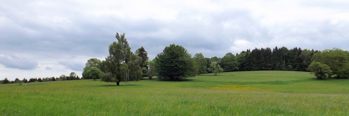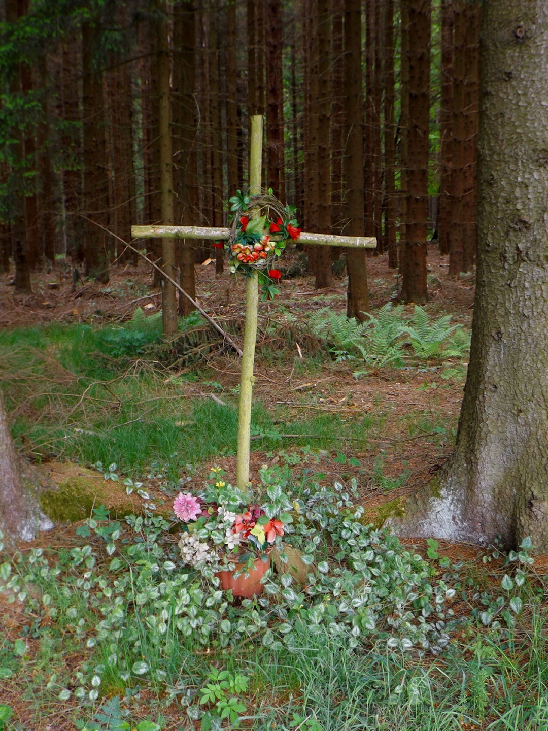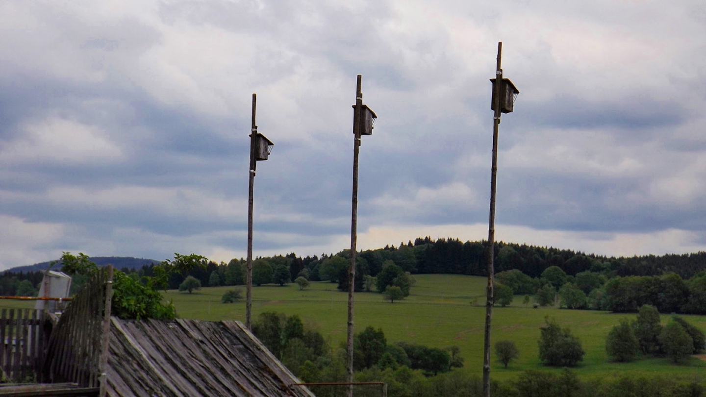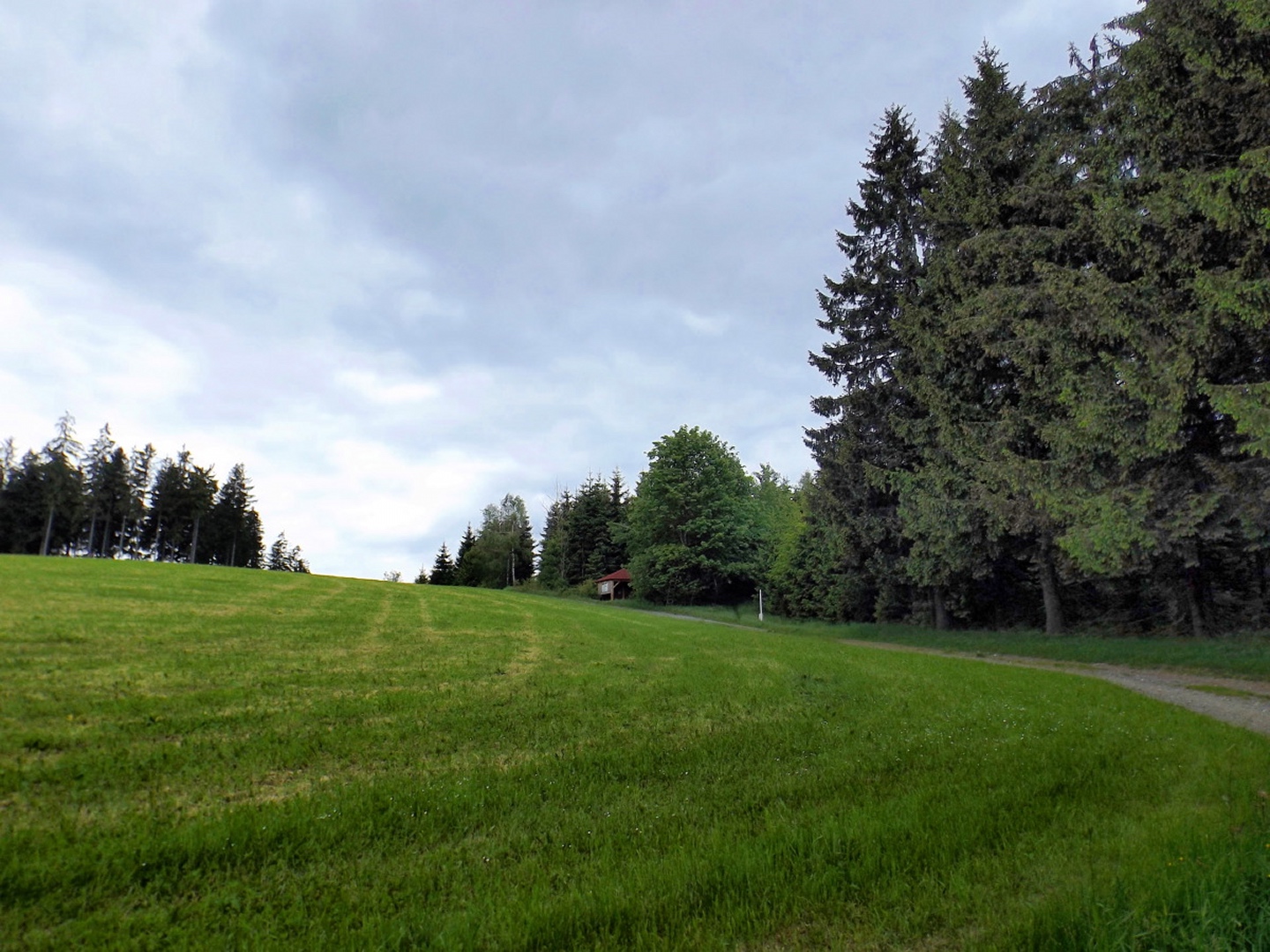Über die ersten Kilometer brauche ich nicht viel schreiben. Zuerst folgte ich dem vom Landkreis Schwandorf eingerichteten Sautreiberweg, der bis zum Abzweig nach Charlottental auf der Hauptstraße verläuft. Auf, nicht neben. In Charlottental wechselte ich auf den Nurtschweg (Zuständigkeit OWV), der bis Kleinsteinlohe hauptsächlich auf angenehmen Pfaden durch den Wald führt. Zwischendurch verließ ich ihn aufgrund einer Ungenauigkeit beim Ausmessen der Route im Bayernatlas mal kurz für eine 300 Meter lange Wildniseinlage. Kurz vor Kleinsteinlohe verließ ich ihn endgültig und wanderte auf einem unmarkierten, aber klar erkennbaren Wiesenpfad nach Osten. Anschließend ging es auf der Zufahrtsstraße zum nordöstlichsten Anwesen, hinter dem die in der bayerischen Karte nicht eingezeichnete Grenzübertrittsstelle liegt. Auf der tschechischen Seite ist ein eingezeichneter, wenn auch unmarkierter Pfad, der auch wirklich existiert. Also keinen weiteren Fehler auf mapy.cz entdeckt und durchgeschnauft. Zu meiner Überraschung fand ich an dieser Stelle der Grenze, die auf deutscher Seite auf einem guten Feldweg erreichbar ist, einen Infopavillion mit ca zehn Sitzplätzen und drei Tafeln, aus denen ich nicht ganz schlau wurde. Muss ich im Juli noch mal etwas genauer anschauen. Jenseits der Grenze folgte ich erst einmal einem winzigen Waldpfad bis zu einer Kreuzung, an der ich laut GPS-Track geradeaus weiter musste, und von dort zu einer weiteren Kreuzung, an der von Süden her der für Juli gedachte Weg herunterkommen müsste. An dieser Stelle kam auch von Süden ein Weg, aber nicht wirklich herunter, weil die Kreuzung etwas höher liegt als vermutet. Aber ansonsten stimmte alles mit der Vorstellung überein. Hier bog ich nach Norden ab, immer noch dem GPS-Track folgend, zu dem zu sagen ist, dass ich ihm nur teilweise und dann auch noch umgekehrt folgen wollte, weil er eigentlich eine Schnapsidee gewesen ist und deswegen fast 29 Kilometer lang wäre, wenn ich die Runde komplett gehen würde. Leider verpasste ich den richtigen Ort, den Track zu verlassen, welcher bei der Wüstung Hraničná gewesen wäre. Von hier wollte ich eigentlich über Závist nach Rybník gehen und dort das Dorfwirtshaus für eine Einkehr mit dem OWV im nächsten oder übernächsten Jahr testen. In der Realität blieb ich auf dem Track und kam bald zur Wüstung Horní hut‘, an der ich erstmals den Wegweiser zu den anderen Wüstungen in diesem Gebiet vor mir sah. Ab hier war ich leider auch wieder auf Asphalt unterwegs, was aber durch die mal mehr oder oft auch weniger deutlich erkennbaren Überreste untergegangener Dörfer oder Gutshöfe einigermaßen kompensiert wurde. Beispielsweise ist Dolní hut‘ neben dem Hinweisschild nur an der plötzlich erhöhten Konzentration Brennesseln erkennbar, während von Dianina Dvůr noch deutliche Mauerreste sichtbar sind. Außerdem verließ der Weg kurz nach Dolní hut‘ den Wald und bescherte mir jede Menge Aussicht. Hinzu kam die Begegnung mit einem Fuchs, der zuerst so in seine Spurensuche vertieft war, dass er mich erst bemerkte, als wir nur noch 30 Meter auseinander waren. Daraufhin drehte er aber panikartig um und flüchtete. Er war also beruhigenderweise nicht tollwütig. Einige Fotos später mündete der Weg in die offiziell Radfahrern vorbehaltene Straße von Schwarzach nach Rybník, auf der mir aber gleich ein Golf mit tschechischem Kennzeichen entgegenkam. Kurz vor der Grenze durfte ich noch ein paar Infotafeln zum ehemaligen böhmischen Teil von Schwarzach, tschechisch Švarcava, lesen, bevor ich nach Bayern zurückkehrte und eine Minute später am Auto ankam.