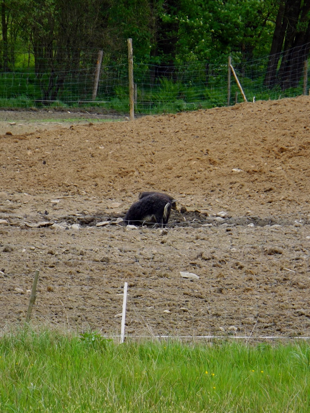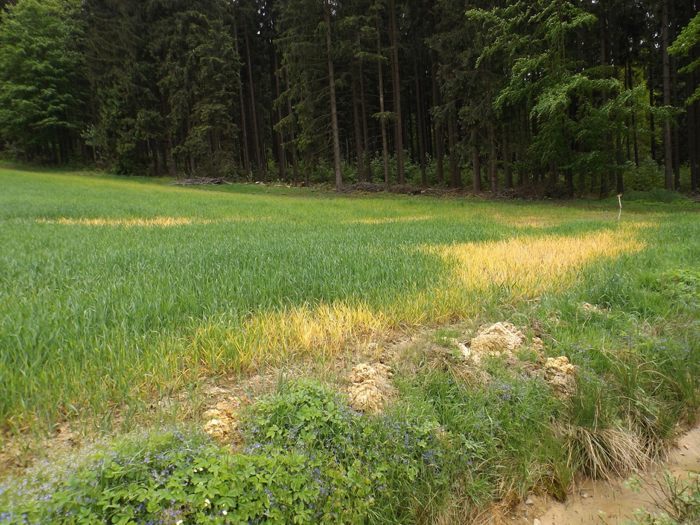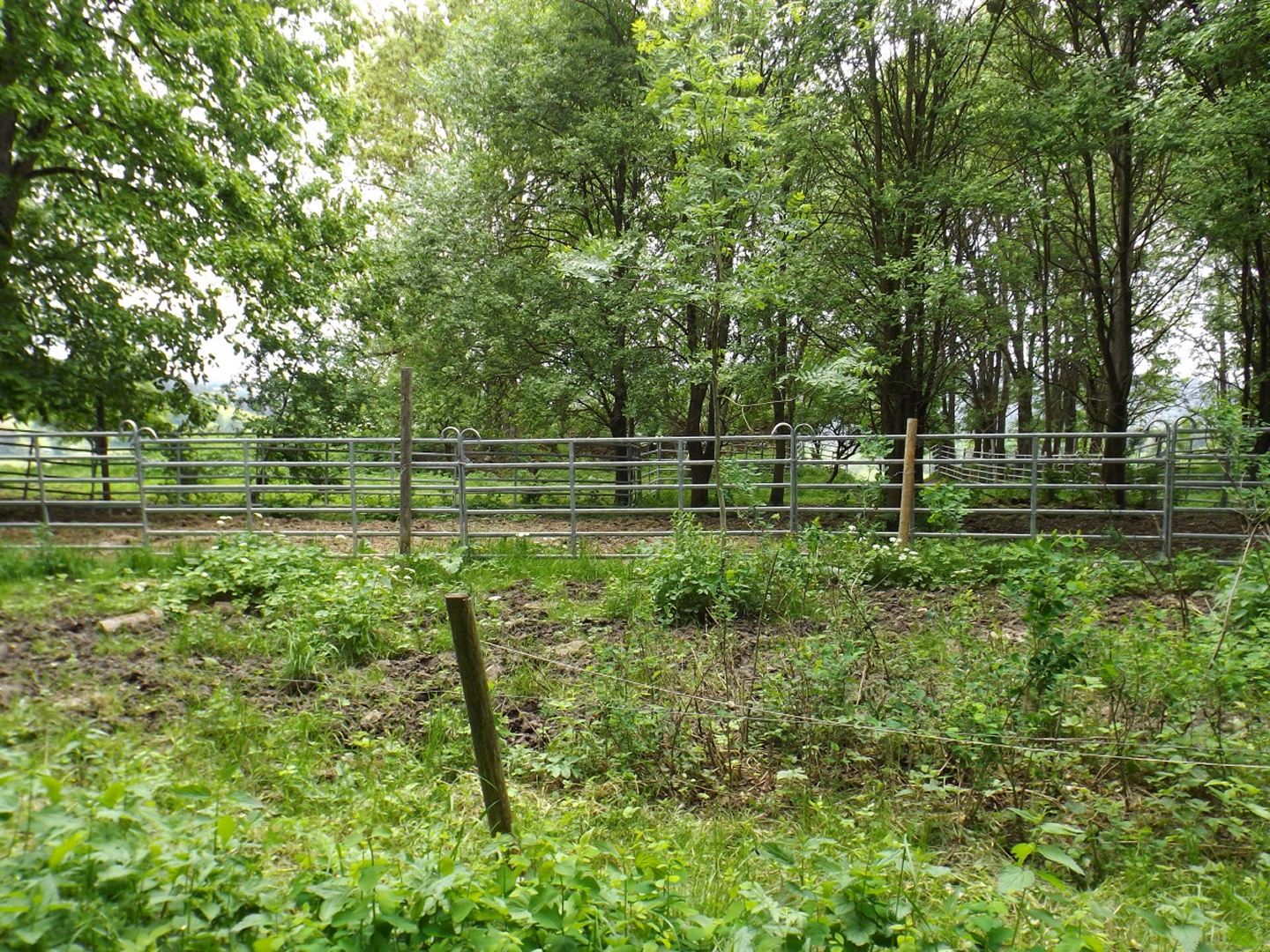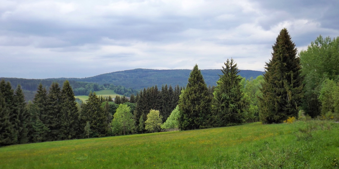 Über die ersten Kilometer brauche ich nicht viel schreiben. Zuerst folgte ich dem vom Landkreis Schwandorf eingerichteten Sautreiberweg, der bis zum Abzweig nach Charlottental auf der Hauptstraße verläuft. Auf, nicht neben. In Charlottental wechselte ich auf den Nurtschweg (Zuständigkeit OWV), der bis Kleinsteinlohe hauptsächlich auf angenehmen Pfaden durch den Wald führt. Zwischendurch verließ ich ihn aufgrund einer Ungenauigkeit beim Ausmessen der Route im Bayernatlas mal kurz für eine 300 Meter lange Wildniseinlage. Kurz vor Kleinsteinlohe verließ ich ihn endgültig und wanderte auf einem unmarkierten, aber klar erkennbaren Wiesenpfad nach Osten. Anschließend ging es auf der Zufahrtsstraße zum nordöstlichsten Anwesen, hinter dem die in der bayerischen Karte nicht eingezeichnete Grenzübertrittsstelle liegt. Auf der tschechischen Seite ist ein eingezeichneter, wenn auch unmarkierter Pfad, der auch wirklich existiert. Also keinen weiteren Fehler auf mapy.cz entdeckt und durchgeschnauft. Zu meiner Überraschung fand ich an dieser Stelle der Grenze, die auf deutscher Seite auf einem guten Feldweg erreichbar ist, einen Infopavillion mit ca zehn Sitzplätzen und drei Tafeln, aus denen ich nicht ganz schlau wurde. Muss ich im Juli noch mal etwas genauer anschauen. Jenseits der Grenze folgte ich erst einmal einem winzigen Waldpfad bis zu einer Kreuzung, an der ich laut GPS-Track geradeaus weiter musste, und von dort zu einer weiteren Kreuzung, an der von Süden her der für Juli gedachte Weg herunterkommen müsste. An dieser Stelle kam auch von Süden ein Weg, aber nicht wirklich herunter, weil die Kreuzung etwas höher liegt als vermutet. Aber ansonsten stimmte alles mit der Vorstellung überein. Hier bog ich nach Norden ab, immer noch dem GPS-Track folgend, zu dem zu sagen ist, dass ich ihm nur teilweise und dann auch noch umgekehrt folgen wollte, weil er eigentlich eine Schnapsidee gewesen ist und deswegen fast 29 Kilometer lang wäre, wenn ich die Runde komplett gehen würde. Leider verpasste ich den richtigen Ort, den Track zu verlassen, welcher bei der Wüstung Hraničná gewesen wäre. Von hier wollte ich eigentlich über Závist nach Rybník gehen und dort das Dorfwirtshaus für eine Einkehr mit dem OWV im nächsten oder übernächsten Jahr testen. In der Realität blieb ich auf dem Track und kam bald zur Wüstung Horní hut‘, an der ich erstmals den Wegweiser zu den anderen Wüstungen in diesem Gebiet vor mir sah. Ab hier war ich leider auch wieder auf Asphalt unterwegs, was aber durch die mal mehr oder oft auch weniger deutlich erkennbaren Überreste untergegangener Dörfer oder Gutshöfe einigermaßen kompensiert wurde. Beispielsweise ist Dolní hut‘ neben dem Hinweisschild nur an der plötzlich erhöhten Konzentration Brennesseln erkennbar, während von Dianina Dvůr noch deutliche Mauerreste sichtbar sind. Außerdem verließ der Weg kurz nach Dolní hut‘ den Wald und bescherte mir jede Menge Aussicht. Hinzu kam die Begegnung mit einem Fuchs, der zuerst so in seine Spurensuche vertieft war, dass er mich erst bemerkte, als wir nur noch 30 Meter auseinander waren. Daraufhin drehte er aber panikartig um und flüchtete. Er war also beruhigenderweise nicht tollwütig. Einige Fotos später mündete der Weg in die offiziell Radfahrern vorbehaltene Straße von Schwarzach nach Rybník, auf der mir aber gleich ein Golf mit tschechischem Kennzeichen entgegenkam. Kurz vor der Grenze durfte ich noch ein paar Infotafeln zum ehemaligen böhmischen Teil von Schwarzach, tschechisch Švarcava, lesen, bevor ich nach Bayern zurückkehrte und eine Minute später am Auto ankam.