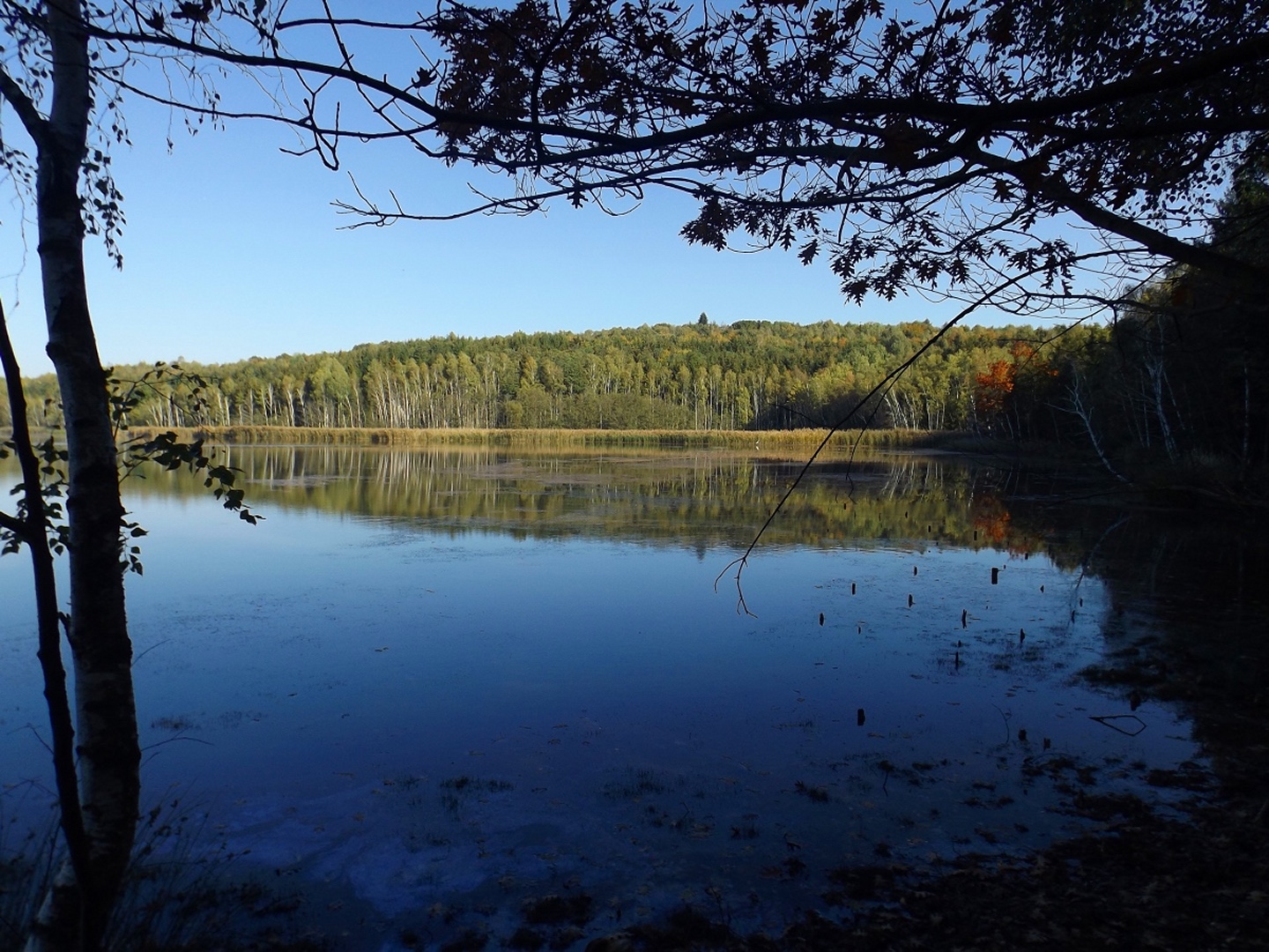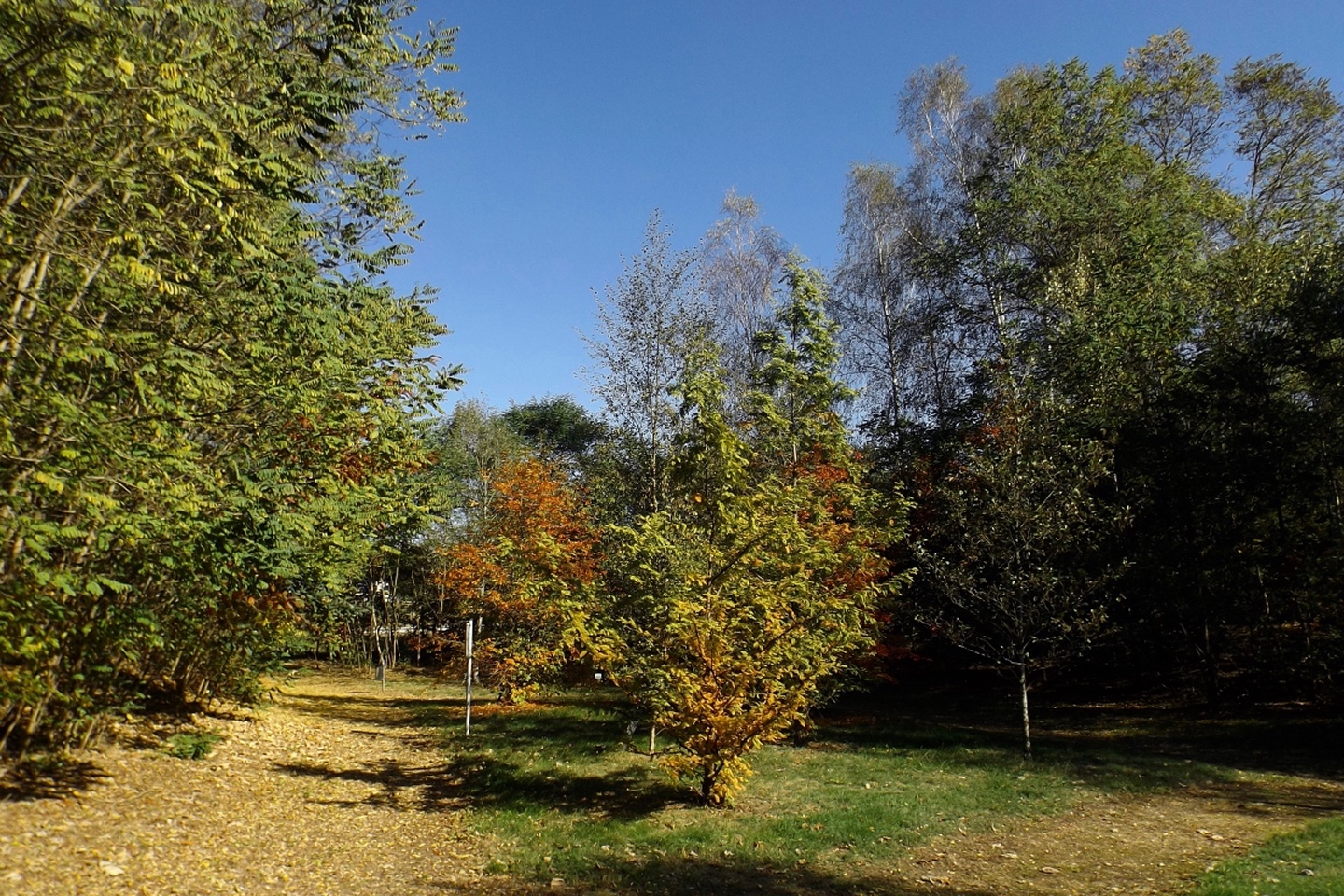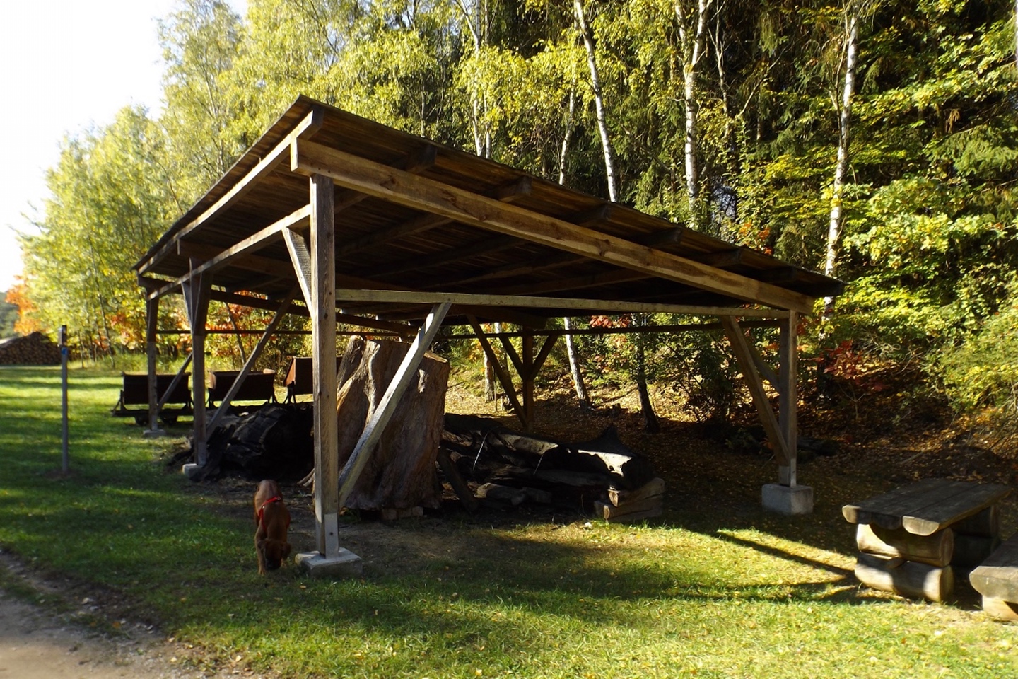 Wir starteten am kleinen Parkplatz bei der Baustelleneinfahrt, hinter dem auch der Zugang zum Geotop 99 liegt und betrachteten gleich einmal den rechten Teil des Tertiärwaldes auf der gegenüberliegenden Straßenseite. Das heißt, ich versuchte, ihn zu betrachten, Karlie fand das außer langweilig nur fad und versuchte lieber, mir Leine und Jacke zu zerbeißen. Nach ein paar Minuten hatte er so weit ausgespielt, dass wir uns auf den beschilderten Seerundweg machen konnten. Dieser ist eigentlich ganz gut, aber teilweise etwas repetitiv. Ich kann noch akzeptieren, dass auf beiden Seiten des Sees über Biber informiert wird, aber drei identische Tafeln zu angenagten Kiefern in nicht einmal 100 Metern Abstand sind definitiv zu viel. Karlie war hier ziemlich mit der unbekannten Gegend beschäftigt und brav, so dass ich doch einige Fotos machen konnte. Kurz vor dem Ende der Runde gibt es einen Verbindungsweg zum Museumslehrpfad, der über die Geschichte des Braunkohlereviers informiert. Auf diesem gingen wir etwa einen Kilometer, trafen dabei eine Wischmopp-Hündin, die eher Angst vor Karlie hatte, und blieben an der Abzweigung mit dem Schuppen auf dem Panoramaweg. Auf diesem unterquerten wir die B 85 und gingen zurück Richtung Wackersdorf. Nach einer weiteren Begegnung mit dem Wischmopp erreichten wir den Wackersdorfer Weiher, den wir nördlich umrundeten und dann wieder unter der B 85 hindurch zum Tertiärwald zurückkehrten. Jetzt schaute ich mir die andere Hälfte davon an, ging noch auf den Hügel nebenan, stellte fest, dass nur ein Soldatendenkmal oben steht, und kehrte zurück zum Auto.