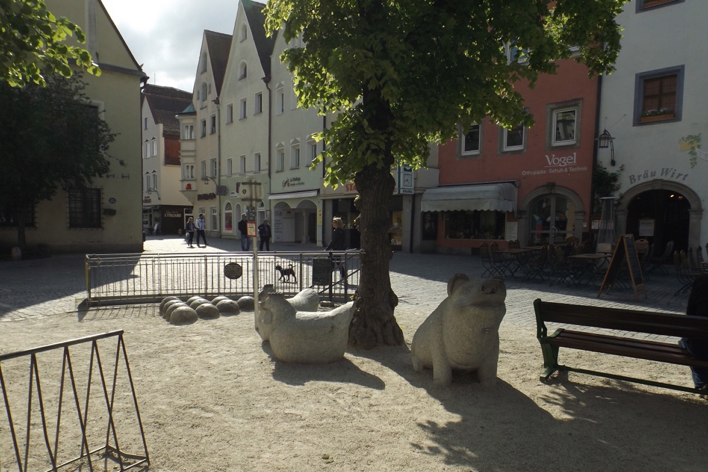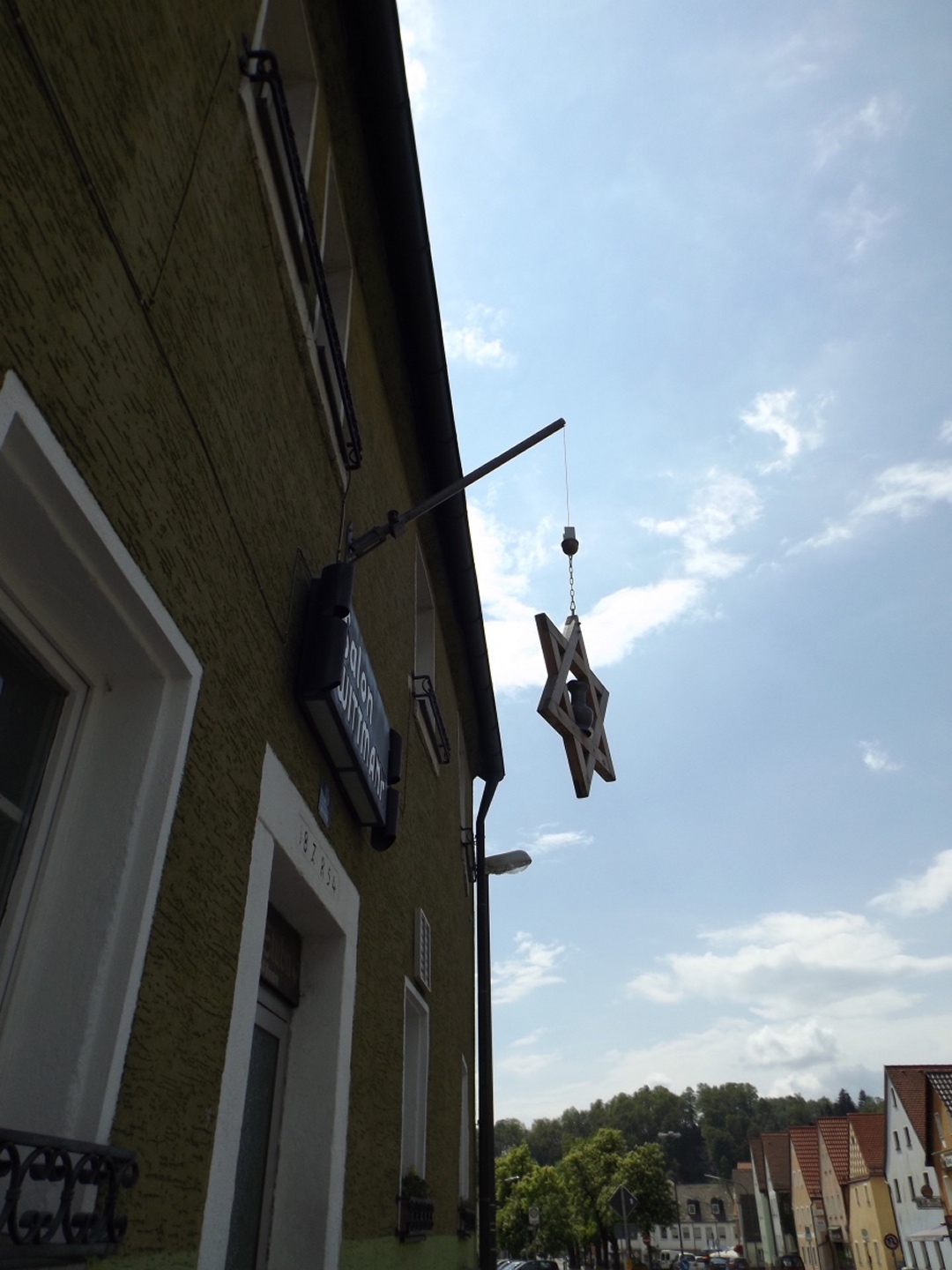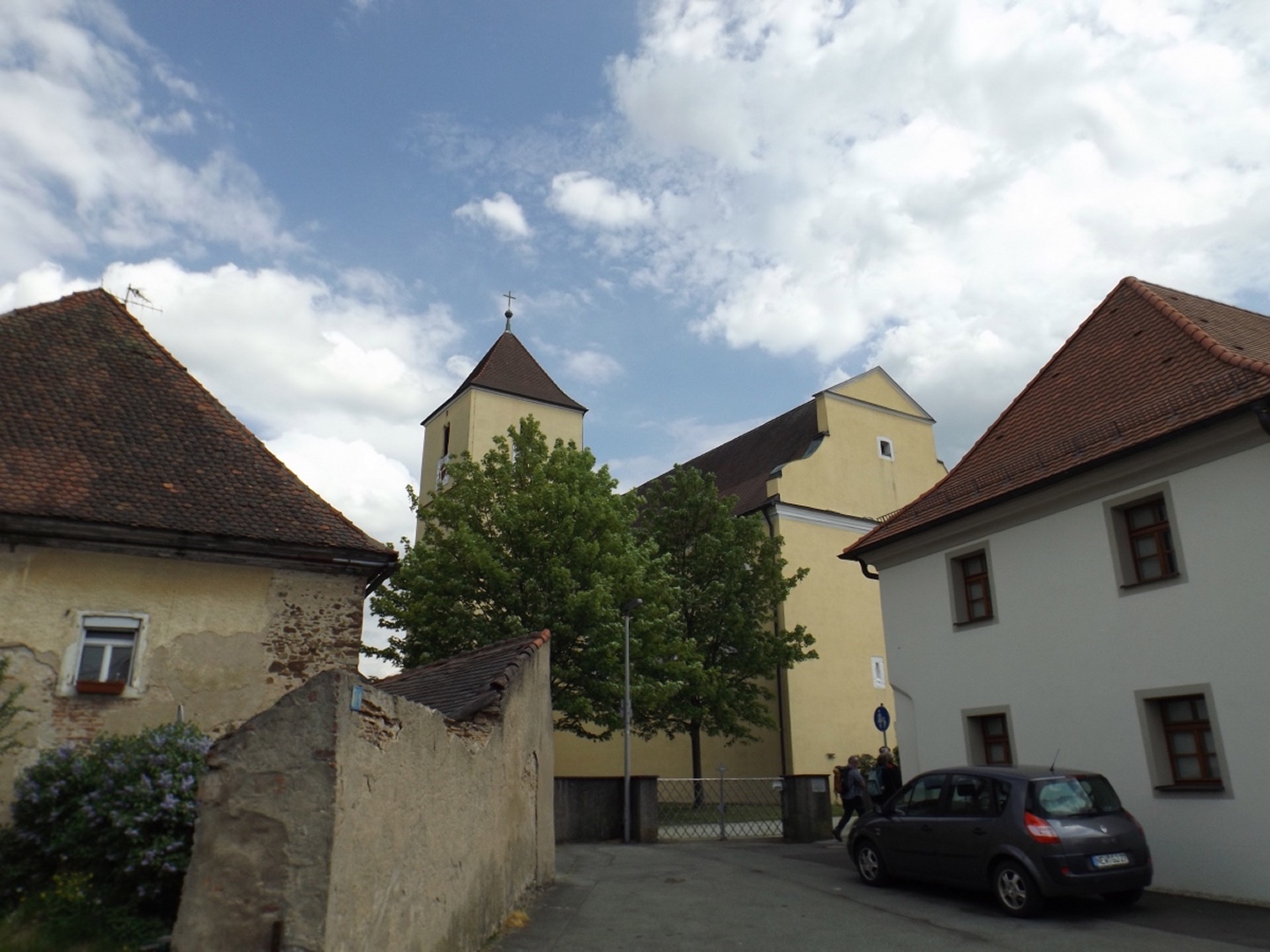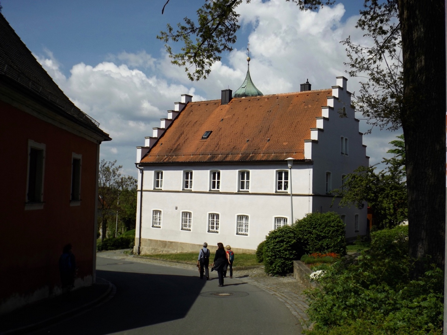 Unterwegs war es nicht wesentlich anders als bei den beiden ersten Etappen. Die Rennsemmeln hielten sich zwar etwas zurück, waren aber trotzdem immer ganz weit vorne und übersahen so doch einiges wie beispielsweise die Überreste einer Mühle am Waldrand, die ich den in meiner Nähe gebliebenen anhand der Wüstungsmerkmale erklären konnte. Einige Motive wie die beiden Kirchtürme von Püchersreuth widersetzten sich ganz gewaltig dem Fotografiertwerden, so dass am Ende erheblich mehr Bilder gelöscht werden mussten als sonst. Leider war am Vormittag auch die Geschäftsführerin des Hauptvereins dabei, so dass es unvermeidlich war, dass wir in einen recht heftigen Hagelschauer gerieten. Margit ist zwar eine ganz liebe Frau, mit der ich mich dafür, dass wir recht wenig Kontakt haben, ganz gut verstehe, aber sowohl sie selbst als auch alle teilnehmenden Hauptvorstandsmitglieder machen sie für jedes schlechte Wetter verantwortlich, weil es immer dann auftritt, wenn sie mitgeht. Interessanterweise wurde es nach der Mittagseinkehr, als sie sich zusammen mit zwei anderen Teilnehmern von uns verabschiedet hatte, wieder richtig sonnig. Diese Einkehr war dieses Mal in der Stadthalle in Neustadt, und ich war nicht soooooo begeistert. Ok, das Cordon bleu sah gut aus und schmeckte auch entsprechend, aber um ein Drittel höhere Preise als vorige Woche in Högen sind eigentlich nicht zu rechtfertigen. Neustadt ist zwar Kreisstadt, aber nicht München oder gar Zürich. Als dann bei der Schlusseinkehr in einem Cafe am Unteren Markt in Weiden das Bier noch mal 20 Cent teurer war, verzichtete ich darauf und begnügte mich mit einem Grünen Tee. Auch hier gilt: Auch wenn Weiden Hochschulstandort ist, ist das Preisniveau nicht ganz nachvollziehbar. Ansonsten war die Tour ziemlich schön, halt leider wieder mit sehr viel Asphalt unter den Füßen, Si(e)gmund (auf der OWV-Hauptvereinsseite widersprechen sich die Schreibweisen seines Vornamens) konnte den nicht vorausgerannten Teilnehmern auch zu einigen Dingen am Wegesrand, die nichts mit dem 14. Jahrhundert zu tun hatten, interessante Hintergründe erzählen, und am Neustädter Stadtplatz durften wir uns nicht nur durch eine, sondern gleich zwei Hochzeitsgesellschaften durchmogeln.
