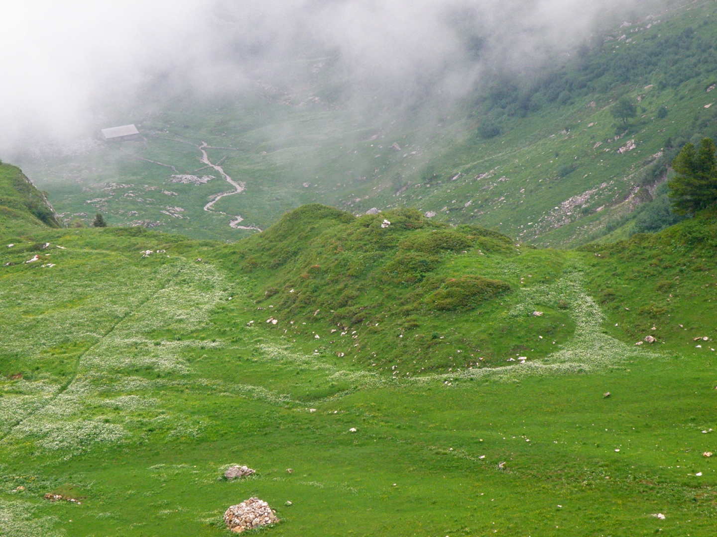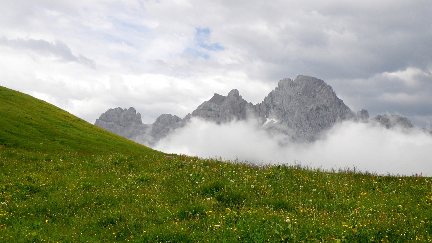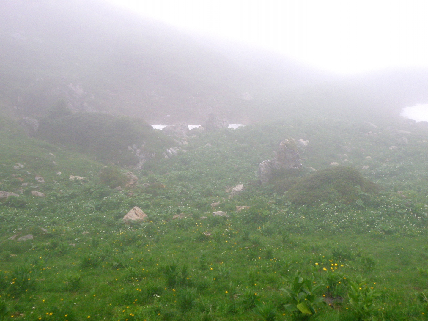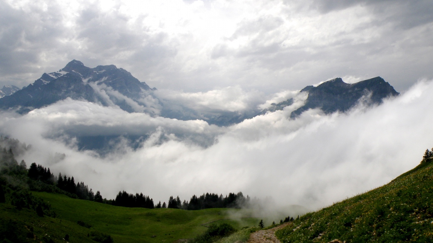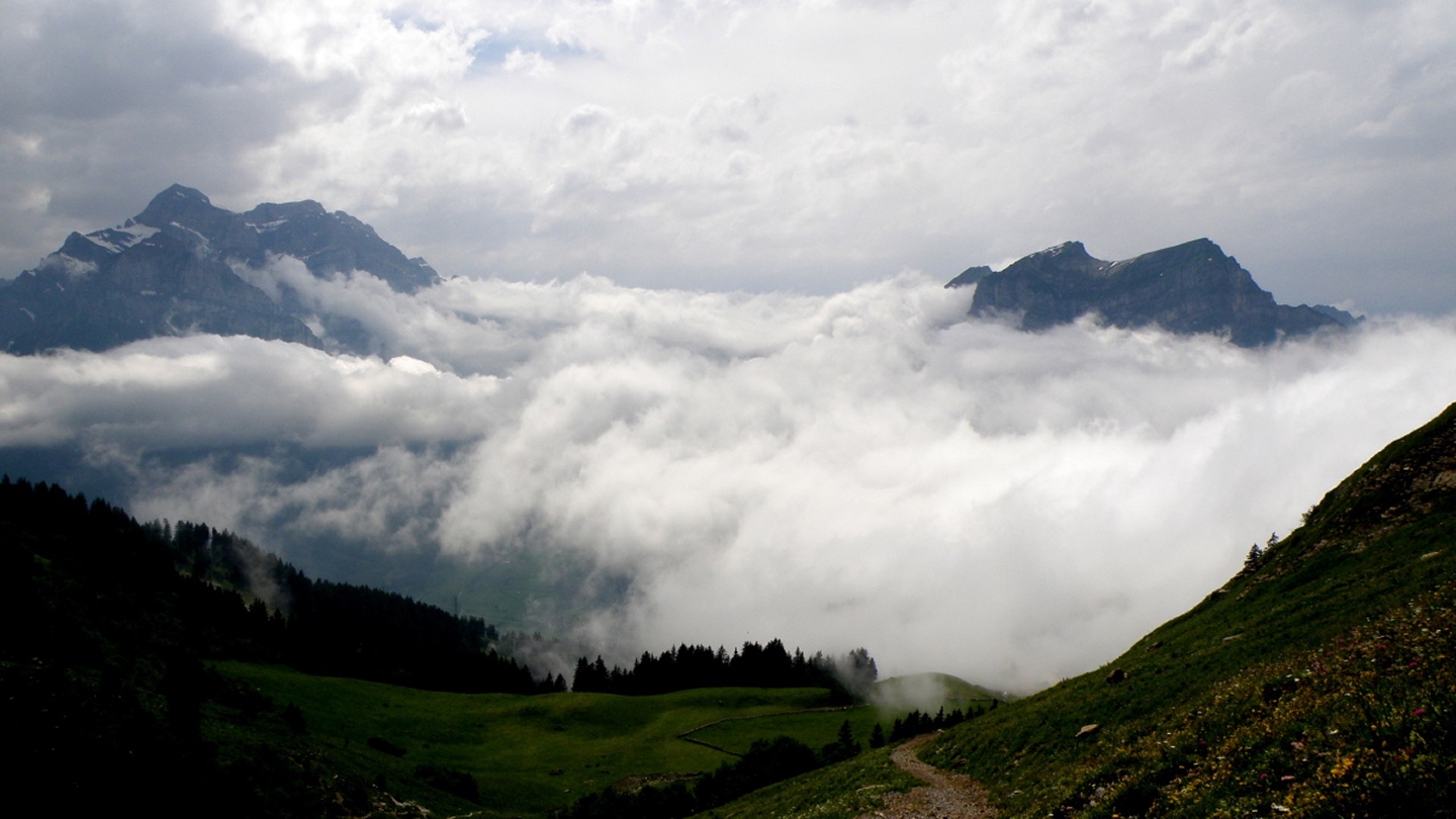 Der Weg ist eigentlich ausführlichst auf Hikr.org beschrieben und folgt eigentlich immer der Fahrstraße. Man muss nur bei Mittler Stafel aufpassen, dass man richtig abbiegt (durch den Alphof). Bis zum Fronalppass folgte ich Renaiolo, dort bog ich nach Hineinfühlen in meinen Bauch aber nicht links zum Fronalpstock, sondern rechts Richtung Schilt ab. Die Ostflanke des Färistocks hat unter dem Winter etwas gelitten, an zwei Stellen war der Pfad durch Lawinen oder Muren ganz ordentlich beschädigt. Je näher ich dem Breitfeld kam, umso dicker wurde der Nebel, aber ich wollte trotzdem einen Gipfel haben und versuchte, von Punkt 1956 aus den Südgrat des Färistocks. Wären ja nur 60 Höhenmeter gewesen. Am ersten größeren Gratgipfelchen / Felsblock wurde mir die Sache aber zu heikel, außerdem verfiel ich der irrigen Meinung, bereits nach 35 Höhenmetern den Gipfel erreicht zu haben (mein Kartenausdruck 1:25000 war zu weit nördlich angesetzt, um auch den Nüenchamm mit auf dem Blatt zu haben). Jedenfalls setzte ich mich unterhalb des Felsens ins Gras, mampfte ein Butterbrötli mit Schokistücken und machte mich wieder auf den Weg hinab. Nach etwas Blindflug in der Senke südlich des Färistocks erreichte ich dann auch wieder den Pfad und nach wenigen Metern den Abzweig Breitfeld. Von dort ging es auf dem gut markierten und trotz Nebels nicht zu verfehlenden Weg durch den Heuboden zurück nach Mittler Stafel und auf der Fahrstraße zum Naturfreundehaus.