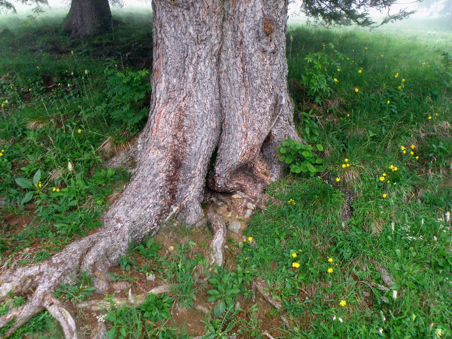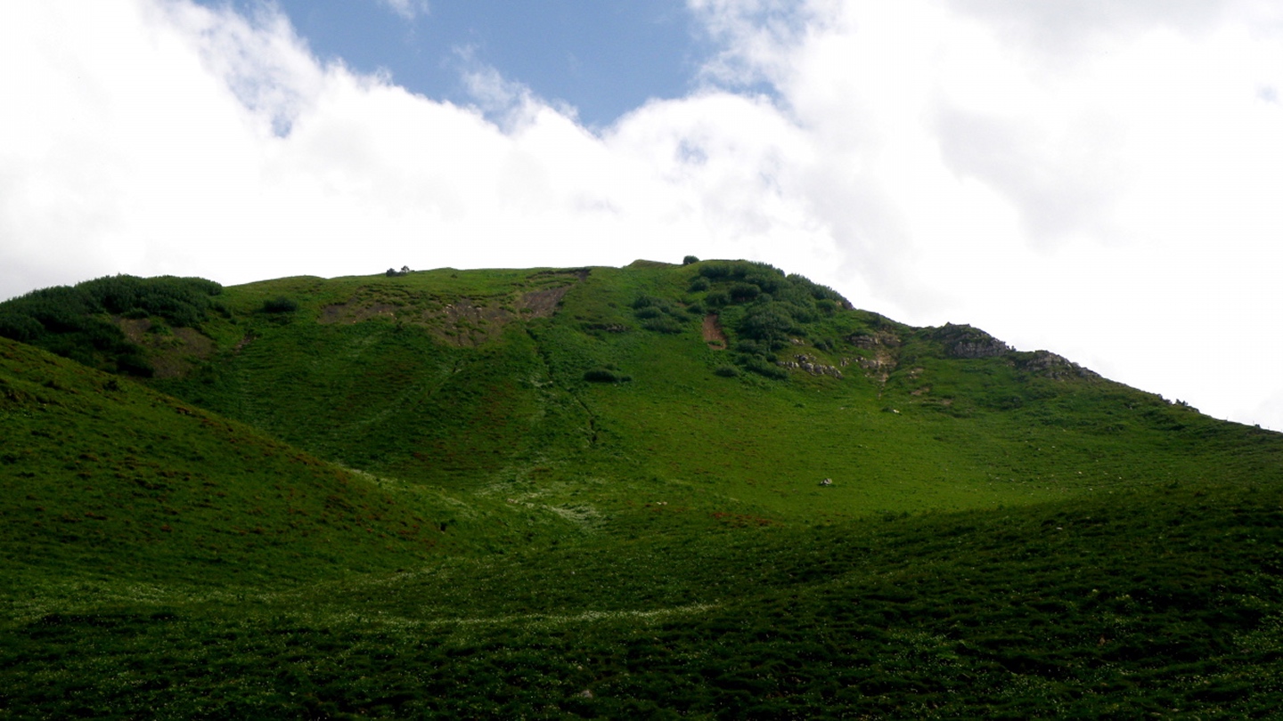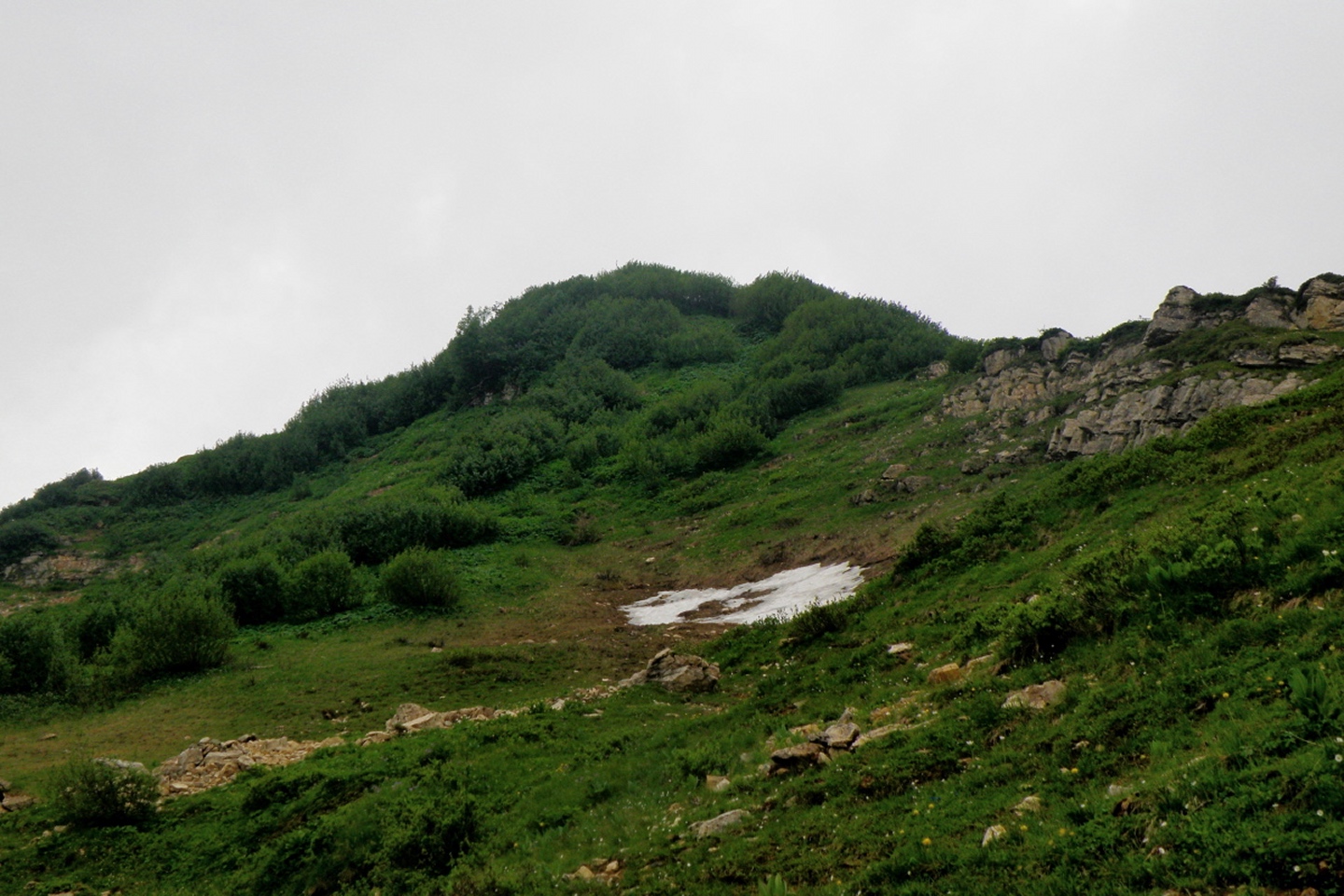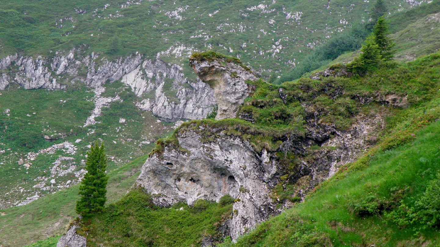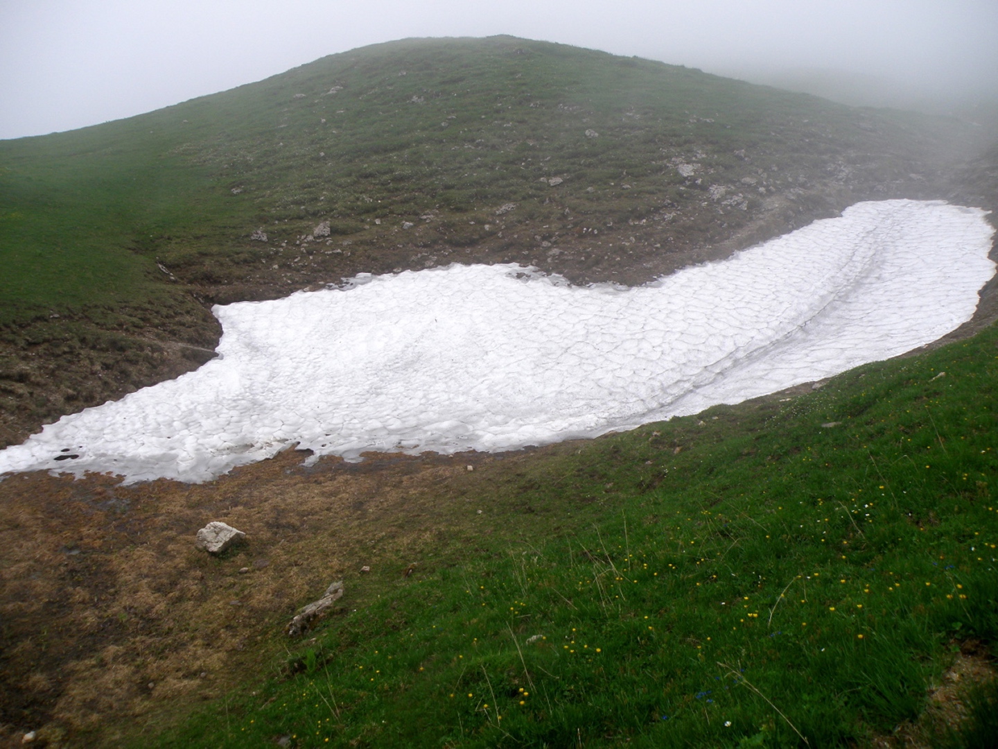 Der Weg ist eigentlich ausführlichst auf Hikr.org beschrieben und folgt eigentlich immer der Fahrstraße. Man muss nur bei Mittler Stafel aufpassen, dass man richtig abbiegt (durch den Alphof). Bis zum Fronalppass folgte ich Renaiolo, dort bog ich nach Hineinfühlen in meinen Bauch aber nicht links zum Fronalpstock, sondern rechts Richtung Schilt ab. Die Ostflanke des Färistocks hat unter dem Winter etwas gelitten, an zwei Stellen war der Pfad durch Lawinen oder Muren ganz ordentlich beschädigt. Je näher ich dem Breitfeld kam, umso dicker wurde der Nebel, aber ich wollte trotzdem einen Gipfel haben und versuchte, von Punkt 1956 aus den Südgrat des Färistocks. Wären ja nur 60 Höhenmeter gewesen. Am ersten größeren Gratgipfelchen / Felsblock wurde mir die Sache aber zu heikel, außerdem verfiel ich der irrigen Meinung, bereits nach 35 Höhenmetern den Gipfel erreicht zu haben (mein Kartenausdruck 1:25000 war zu weit nördlich angesetzt, um auch den Nüenchamm mit auf dem Blatt zu haben). Jedenfalls setzte ich mich unterhalb des Felsens ins Gras, mampfte ein Butterbrötli mit Schokistücken und machte mich wieder auf den Weg hinab. Nach etwas Blindflug in der Senke südlich des Färistocks erreichte ich dann auch wieder den Pfad und nach wenigen Metern den Abzweig Breitfeld. Von dort ging es auf dem gut markierten und trotz Nebels nicht zu verfehlenden Weg durch den Heuboden zurück nach Mittler Stafel und auf der Fahrstraße zum Naturfreundehaus.