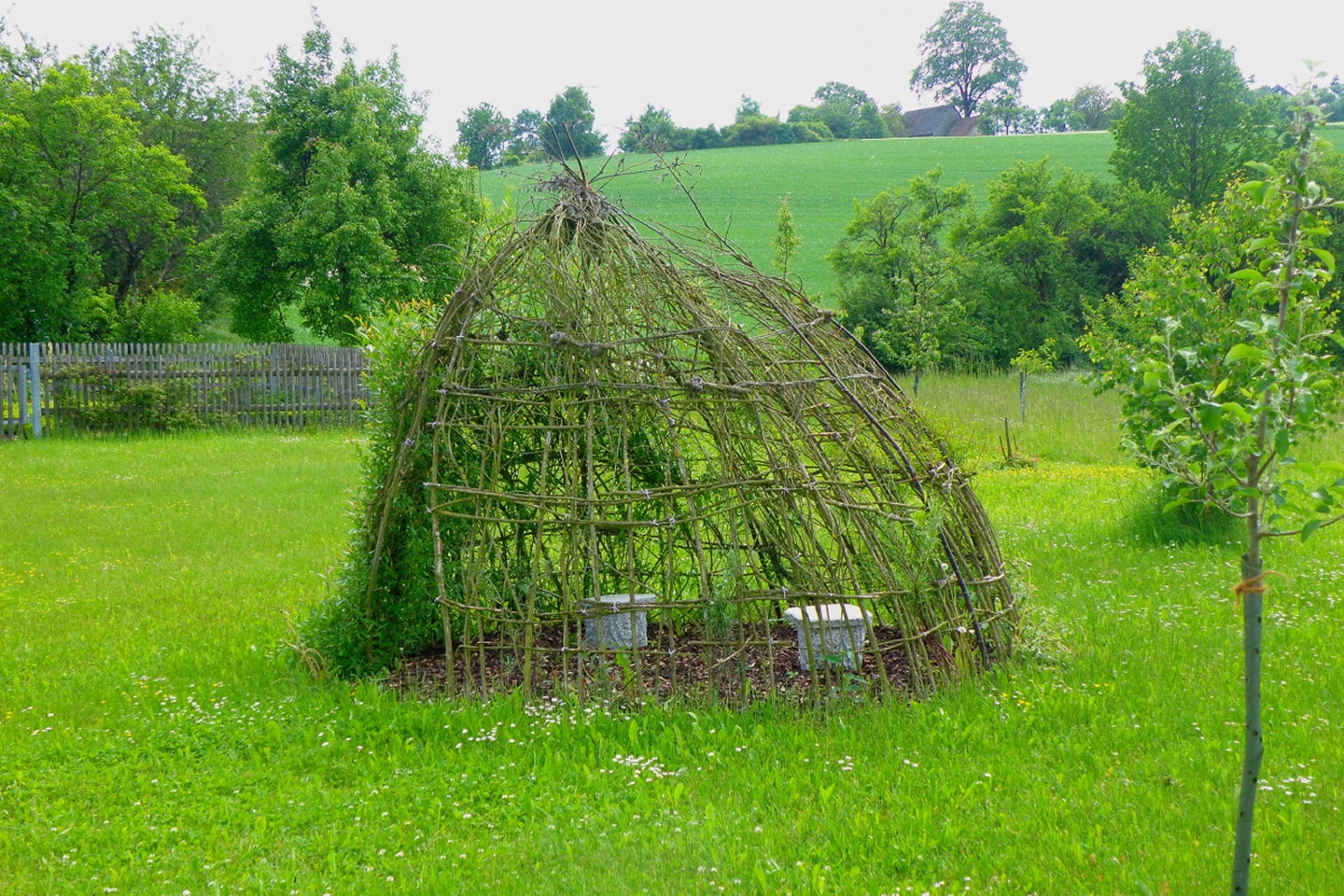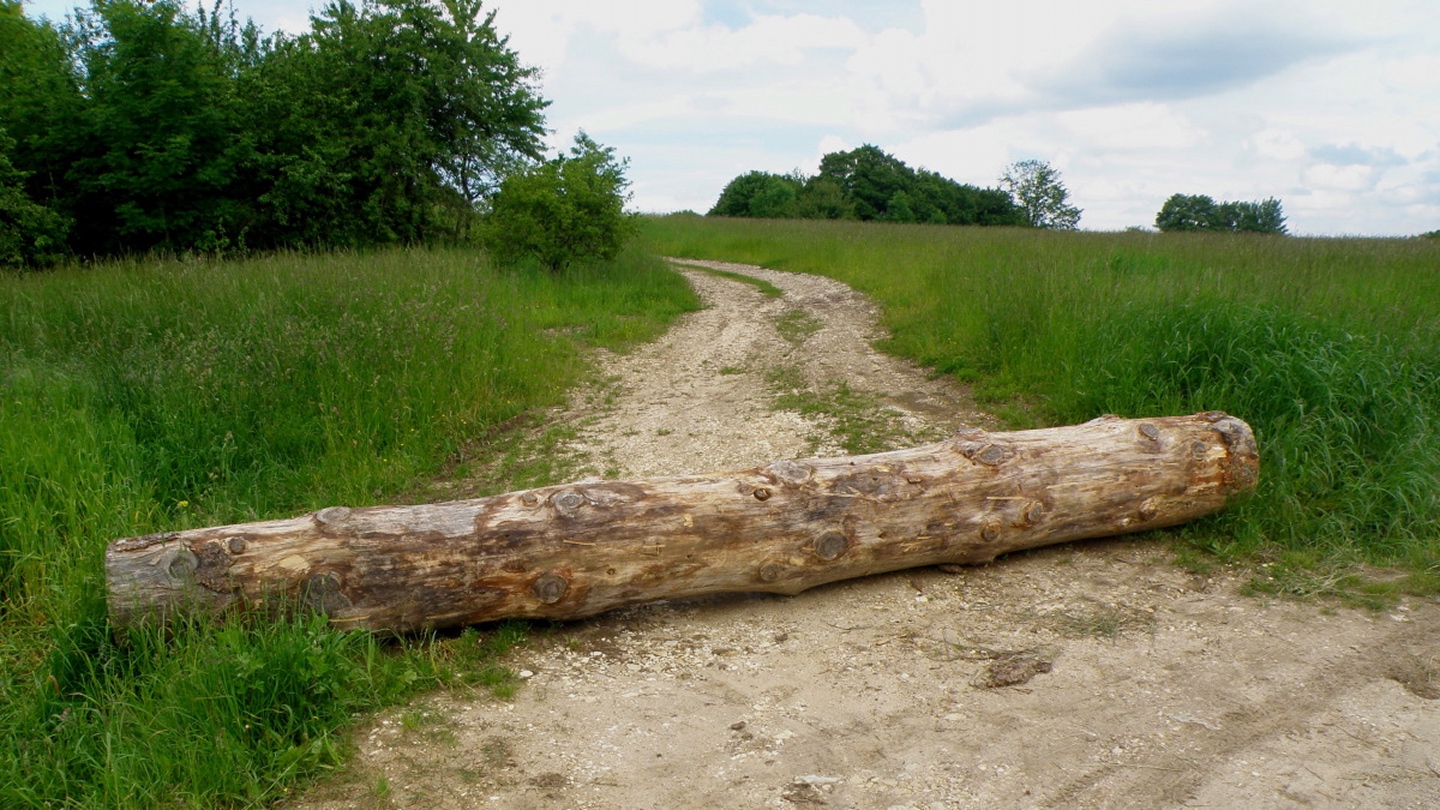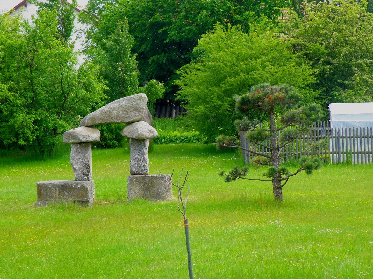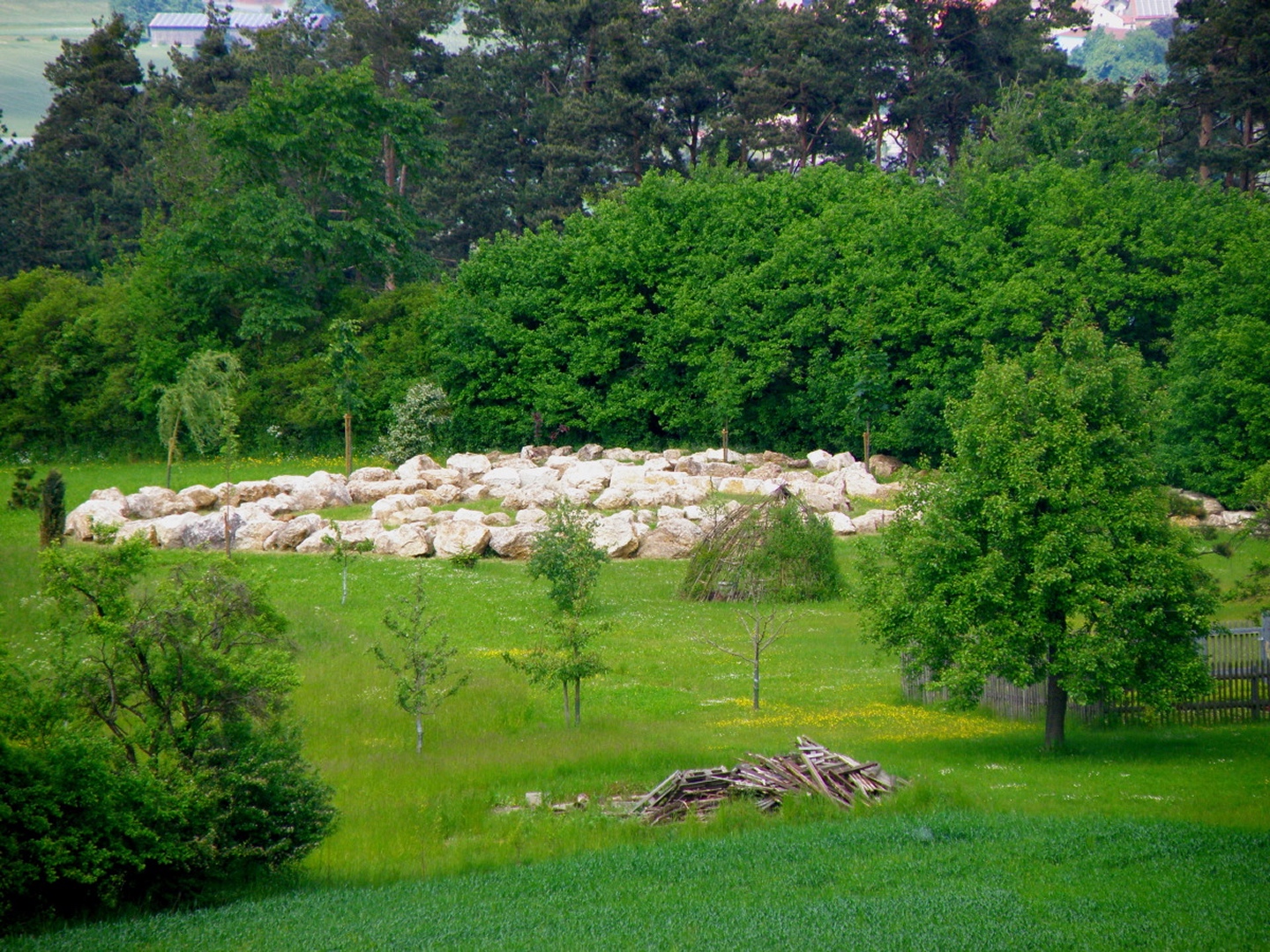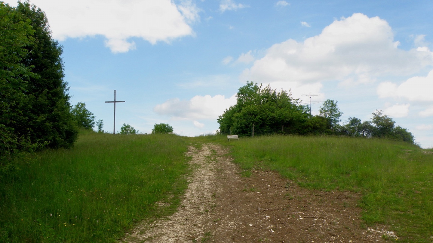 Ich parkte mein Auto in einer kleinen Seitenstraße in Münchshofen und ging die Bergstraße hinauf. Nach etwa 700 Metern biegt rechts ein Sträßlein nach Frauenhof ab, von dem aus unmittelbar das nach Oberhof links abzweigt. Diesem folgte ich durch den Ort, der nach weiteren 700 Metern kommt. Kurz vor dem Scheitelpunkt dieser Straße geht linsk ein durch einen großen Baumstamm versperrter Fahrweg zum höchsten Punkt mit Gipfelkreuz. Nach einer zehnminütigen Fotopause folgte ich einer Traktorspur hinunter nach Frauenhof, wo ich nicht rechts auf die Straße zur genannten Kreuzung abbog, sondern links zu den untersten Häusern des Dorfes ging. Hinter dem letzten Haus folgte eine kleine Überraschung: Dort ist eine völlig frei zugängliche Meditationsanlage mit Teich, Felstor, verschiedenen Bäumen und einer recht großen Steinschnecke. Ich nahm mir die Zeit, die Runden zu ihrem zentralen Punkt zu gehen und dort etwas zu meditieren. Danach brauchte ich etwas, um den Weiterweg zu finden, schaffte es aber nach einer kleinen Umrundung der angrenzenden und noch nicht gemähten Wiese und stieg auf einem Waldweg ab. Am Ende des Waldes bog ich rechts ab und ging auf einem weiteren Traktorpfad zurück nach Münchshofen, wo ich genau dort herauskam, wo ich wollte.