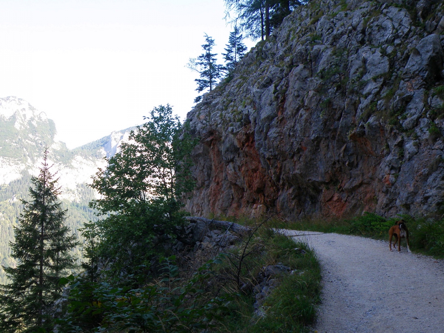 Start war am Holzlagerplatz an der Verbindungsstraße von Ramsau nach Hintersee. Nach Überquerung der Straße geht es mäßig steil eine Forststraße hinauf bis zur bewirtschafteten Schärtenalm, wo wir eine erste kleine Teepause einlegten. Ab der Schärtenalm geht die Forststraße etwas auf und ab, bis der Pfad zur Blaueishütte und den umliegenden Gipfeln kurz vor der Materialseilbahn links abzweigt. Dieser ist etwas steiler und vor allem schmäler, jedoch nie ausgesetzt oder schwierig. Nach einer ausgiebigen Rast mit zwei Stücken der berühmten Torten ging es auf dem Anstiegsweg zurück, wobei da ein Klettererpärchen erst Coco mit seinem Ausrüstungsgeklapper erschreckte und dann hysterisch herumschrie, weil Coco ihre Aktion mit heftigem Bellen belohnte. Grenzwertig war dann, dass Coco unten an der Straße nicht gehorchte und sich anleinen ließ, sondern einfach zum Auto auf die andere Seite rüberlief. Zum Glück kam niemand, inzwischen hat sie sich derartiges auch abgewöhnt.