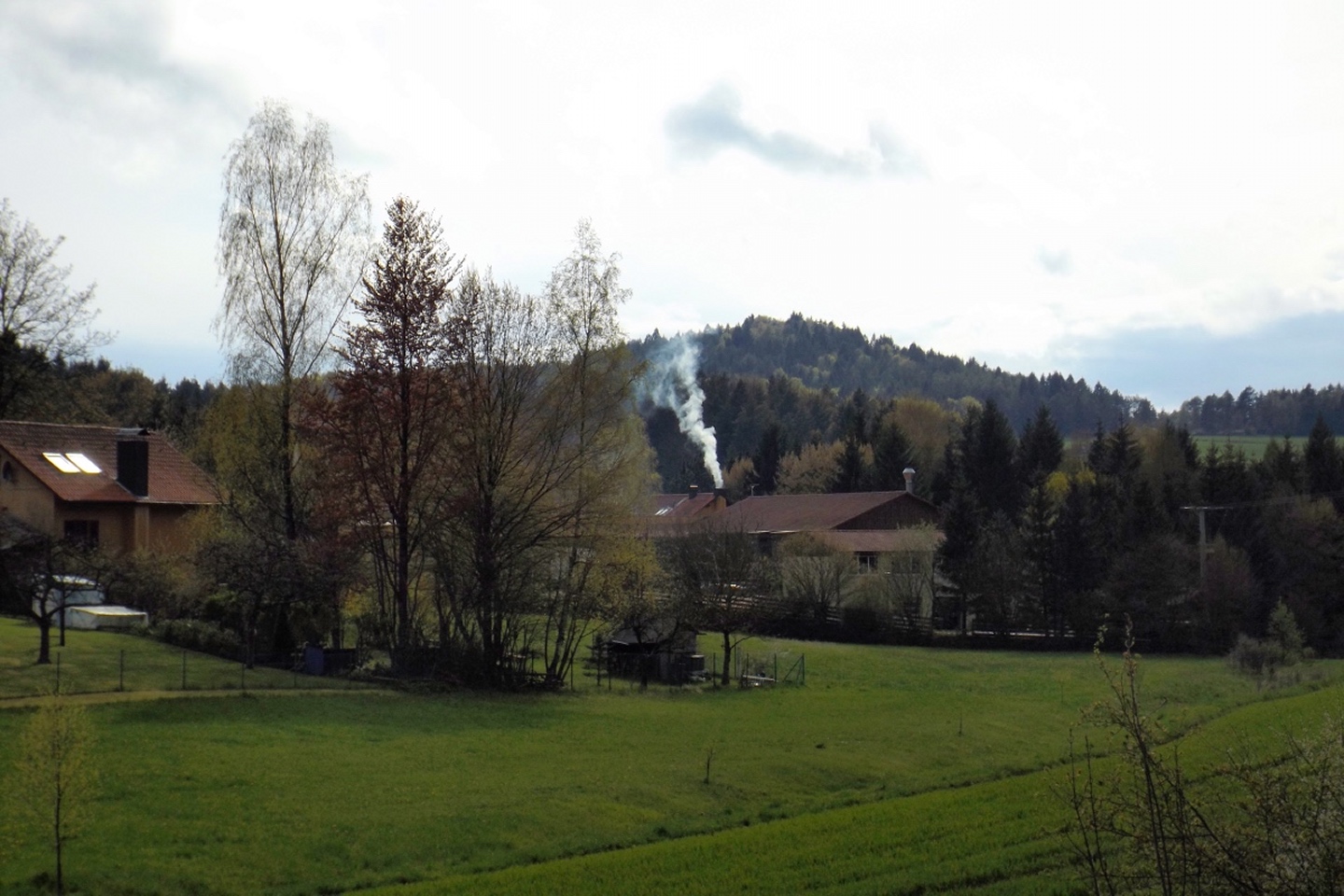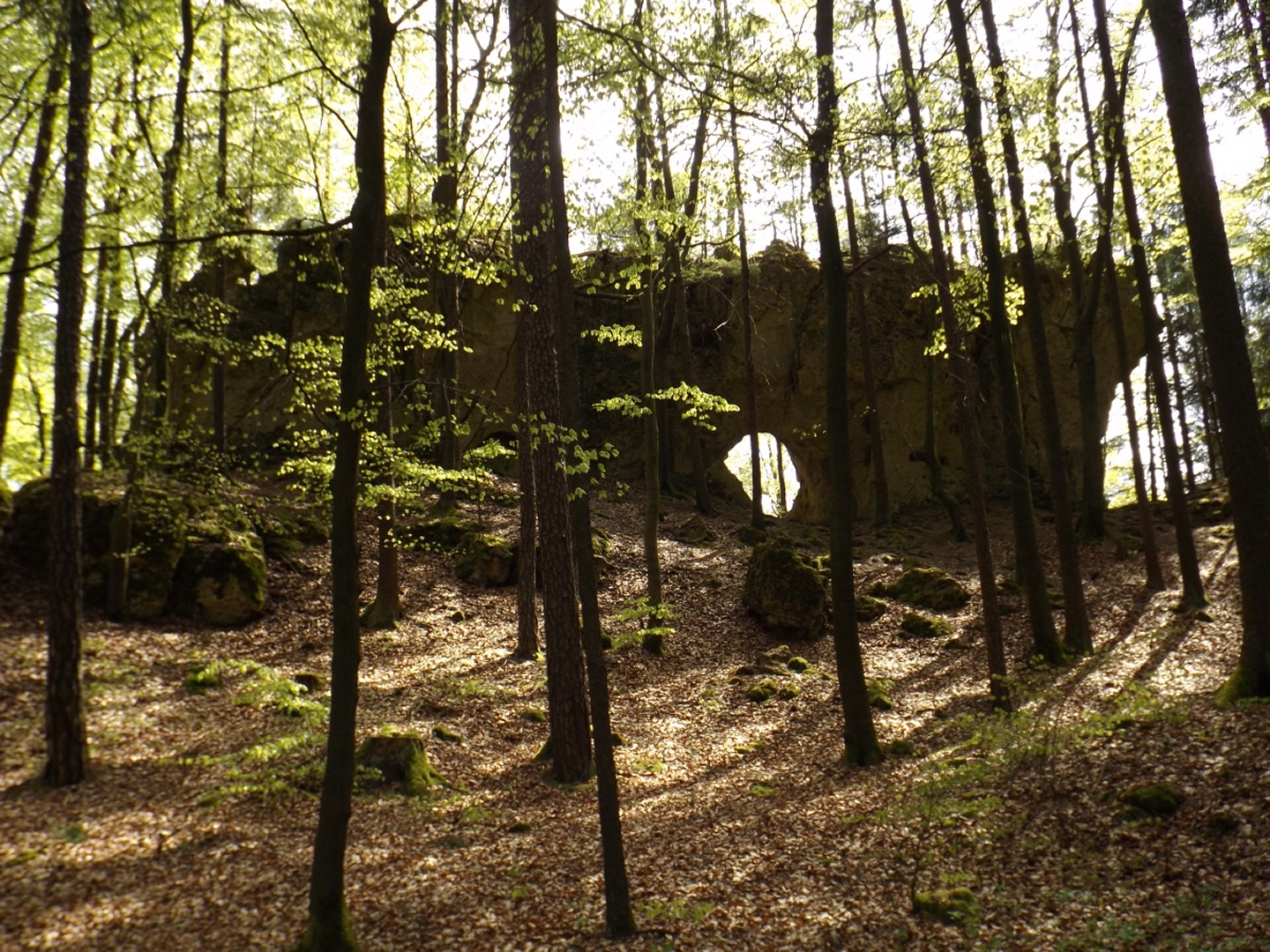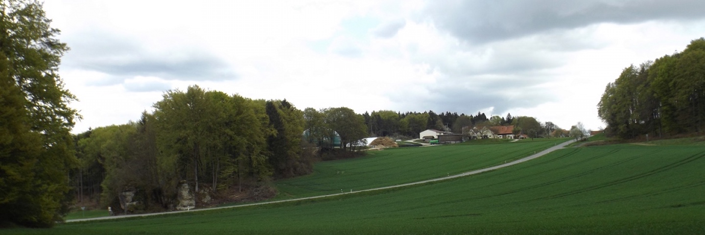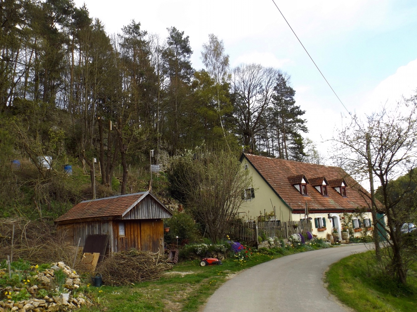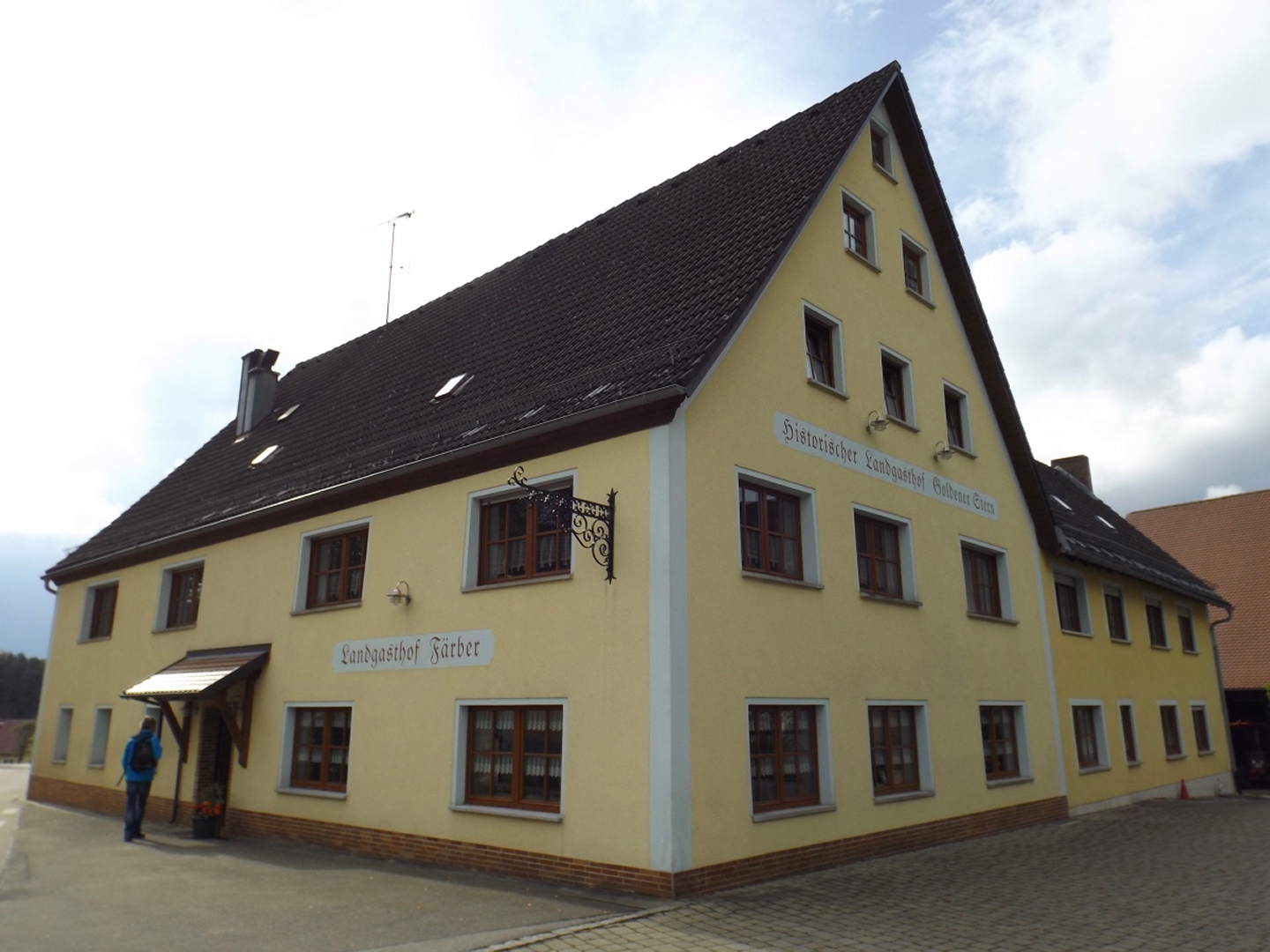Um die Strecke noch mehr abzukürzen, weil es schon recht spät war, stellten wir die Autos nicht in Fürnried bei den beiden Gasthöfen ab, sondern fuhren noch etwa einen Kilometer weiter Richtung Wurmrausch und blockierten für den Rest des Nachmittags einen kleinen Parkplatz oben auf der Anhöhe. Von dort folgten wir dem Birglandrundweg hinunter nach Wurmrausch, einer keltischen Gründung, wo wir hinter einer Hackschnitzelplantage links auf den Frauenschuhrundweg abbogen. Jetzt ging es steil hinauf, was einigen ungeübteren Teilnehmerinnen leichte Probleme bereitete, und oben auf dem Kronbergkamm vorbei an mehreren Kletterfelsen nach Lichtenegg. Hier entschieden sich die gehandicapten und Stefan (aus Faulheit), mit Klara zurück nach Fürnried zu fahren, während die Hauptgruppe am Osthang des Kronbergs entlang zurück nach Wurmrausch und zu den Autos ging. Dominik und ich hatten noch lange nicht genug und gingen den letzten Kilometer nach Fürnried, den die Gruppe mit den Autos zurücklegte, auch noch zu Fuß. Dort trafen wir dann alle im historischen Landgasthof Goldener Stern, auch Färber genannt, zur einer gemütlichen Einkehr. Ich entschied mich (leider) für den überbackenen Camembert, der zwar exzellent schmeckte, aber unverständlicherweise ohne Toast serviert wurde. Da waren beispielsweise die Brotzeitplatte oder die Fischgerichte deutlich vollständiger. Dafür war das Hersbrucker Dampfbier mindestens genauso gut wie sein Zwieseler Pendant, so dass ich wohl bei meiner nächsten Tour im Raum Fürnried wieder dort einkehren und nur eben eine andere Speise wählen werde.