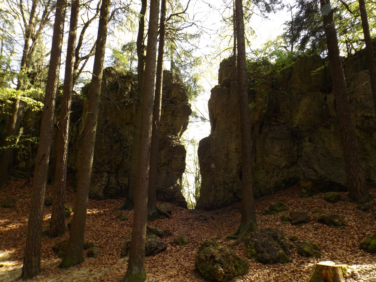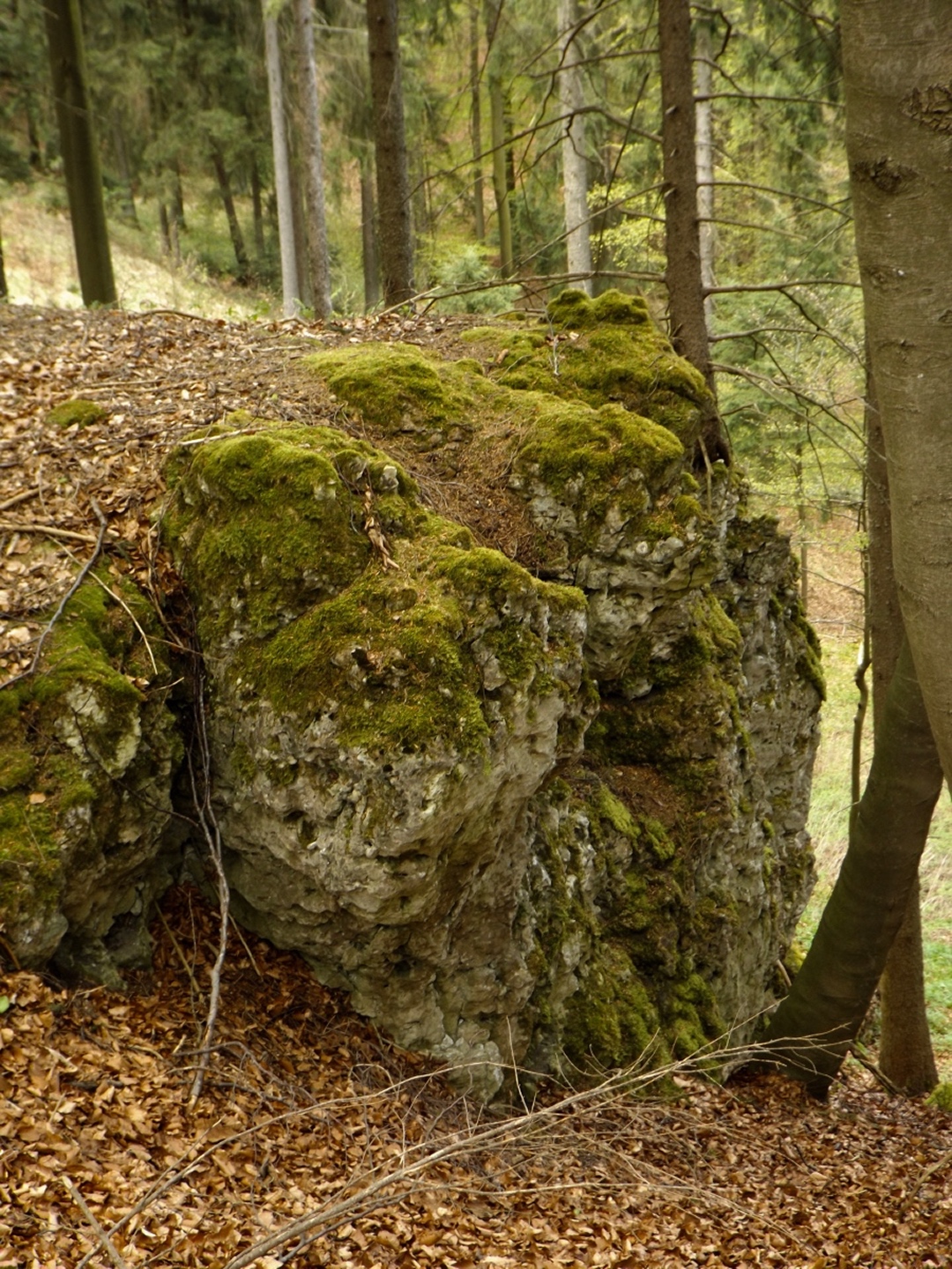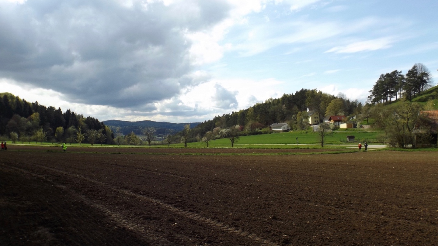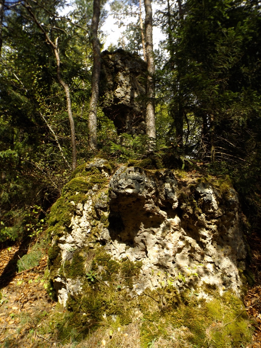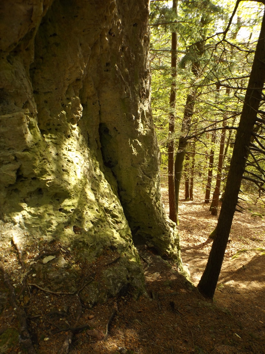 Um die Strecke noch mehr abzukürzen, weil es schon recht spät war, stellten wir die Autos nicht in Fürnried bei den beiden Gasthöfen ab, sondern fuhren noch etwa einen Kilometer weiter Richtung Wurmrausch und blockierten für den Rest des Nachmittags einen kleinen Parkplatz oben auf der Anhöhe. Von dort folgten wir dem Birglandrundweg hinunter nach Wurmrausch, einer keltischen Gründung, wo wir hinter einer Hackschnitzelplantage links auf den Frauenschuhrundweg abbogen. Jetzt ging es steil hinauf, was einigen ungeübteren Teilnehmerinnen leichte Probleme bereitete, und oben auf dem Kronbergkamm vorbei an mehreren Kletterfelsen nach Lichtenegg. Hier entschieden sich die gehandicapten und Stefan (aus Faulheit), mit Klara zurück nach Fürnried zu fahren, während die Hauptgruppe am Osthang des Kronbergs entlang zurück nach Wurmrausch und zu den Autos ging. Dominik und ich hatten noch lange nicht genug und gingen den letzten Kilometer nach Fürnried, den die Gruppe mit den Autos zurücklegte, auch noch zu Fuß. Dort trafen wir dann alle im historischen Landgasthof Goldener Stern, auch Färber genannt, zur einer gemütlichen Einkehr. Ich entschied mich (leider) für den überbackenen Camembert, der zwar exzellent schmeckte, aber unverständlicherweise ohne Toast serviert wurde. Da waren beispielsweise die Brotzeitplatte oder die Fischgerichte deutlich vollständiger. Dafür war das Hersbrucker Dampfbier mindestens genauso gut wie sein Zwieseler Pendant, so dass ich wohl bei meiner nächsten Tour im Raum Fürnried wieder dort einkehren und nur eben eine andere Speise wählen werde.