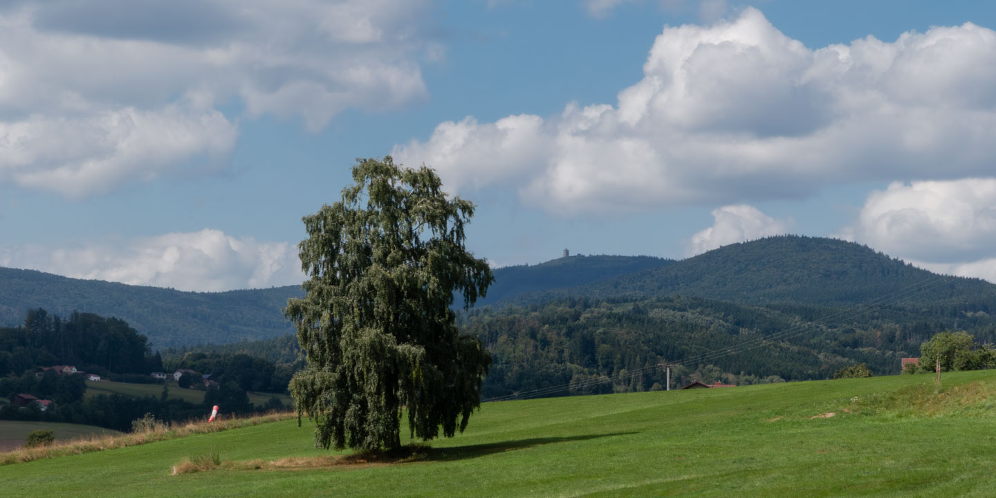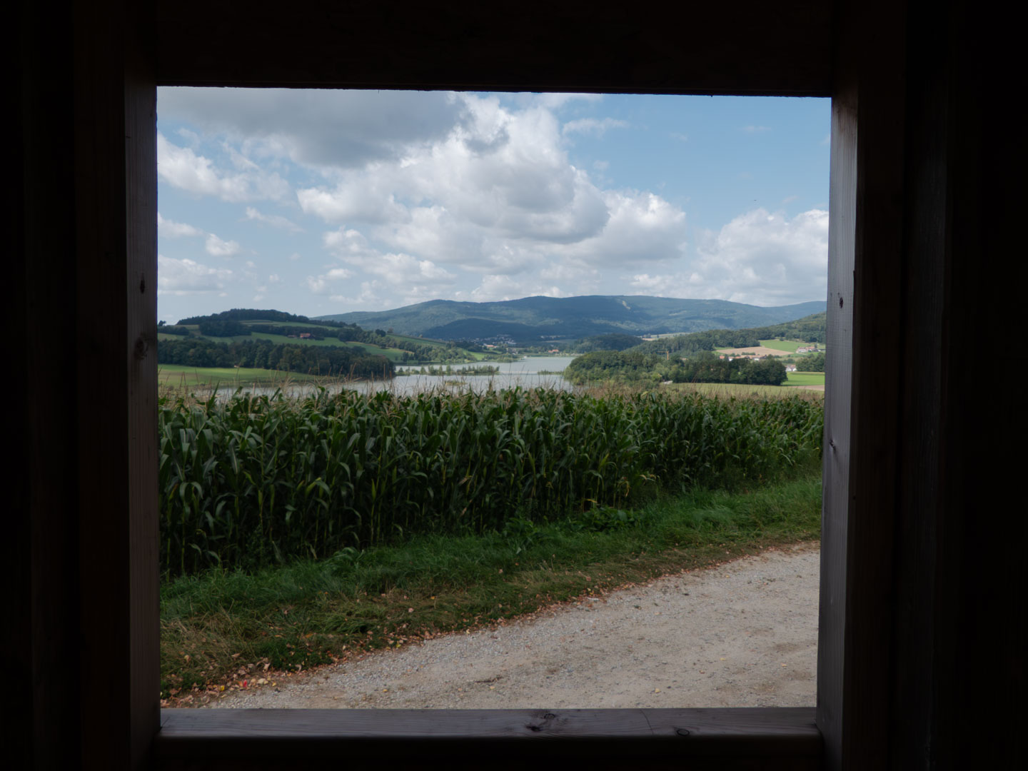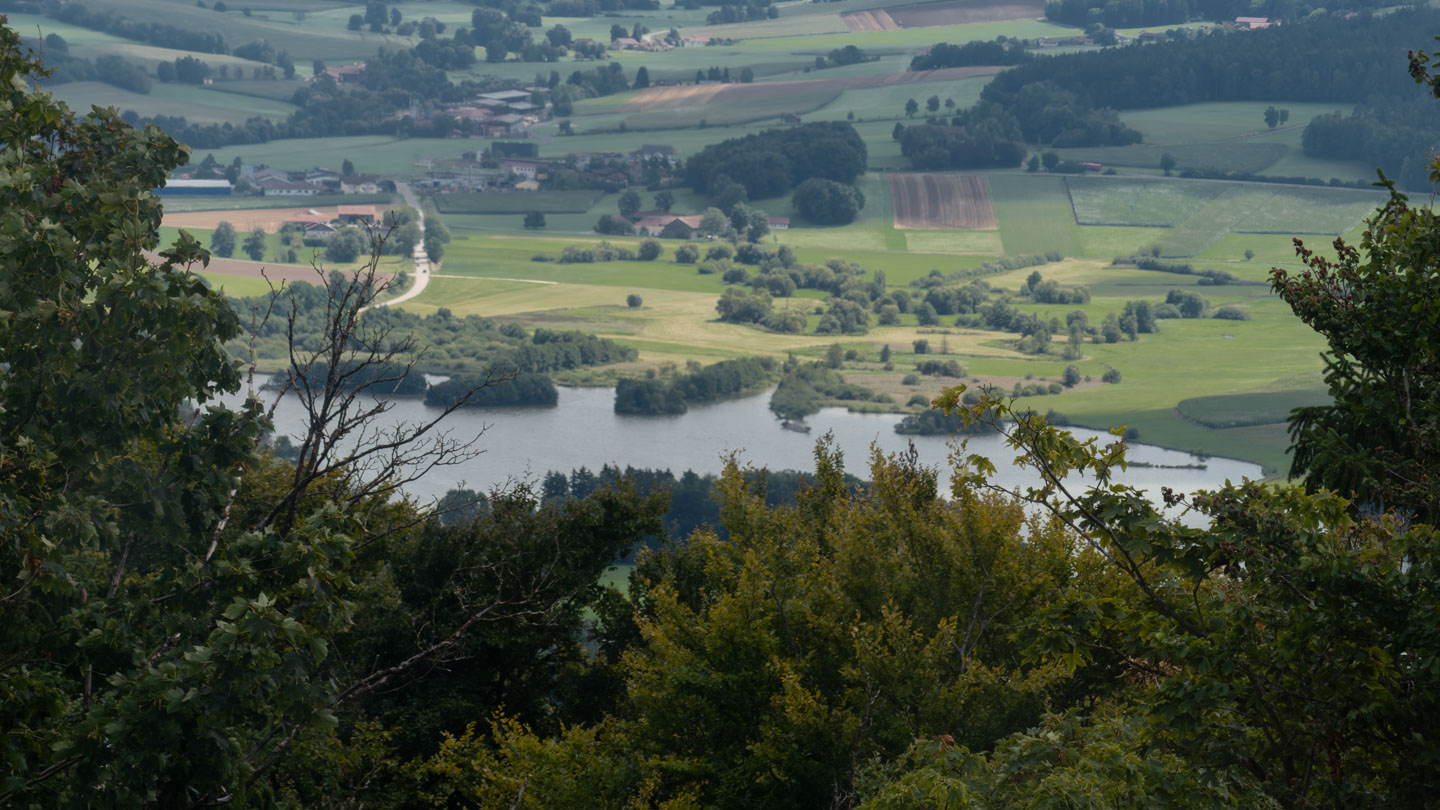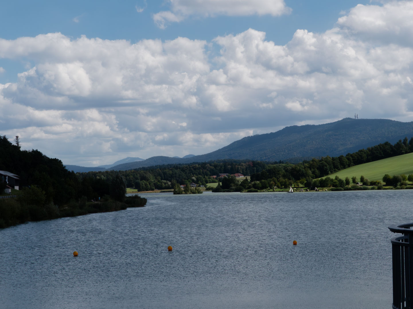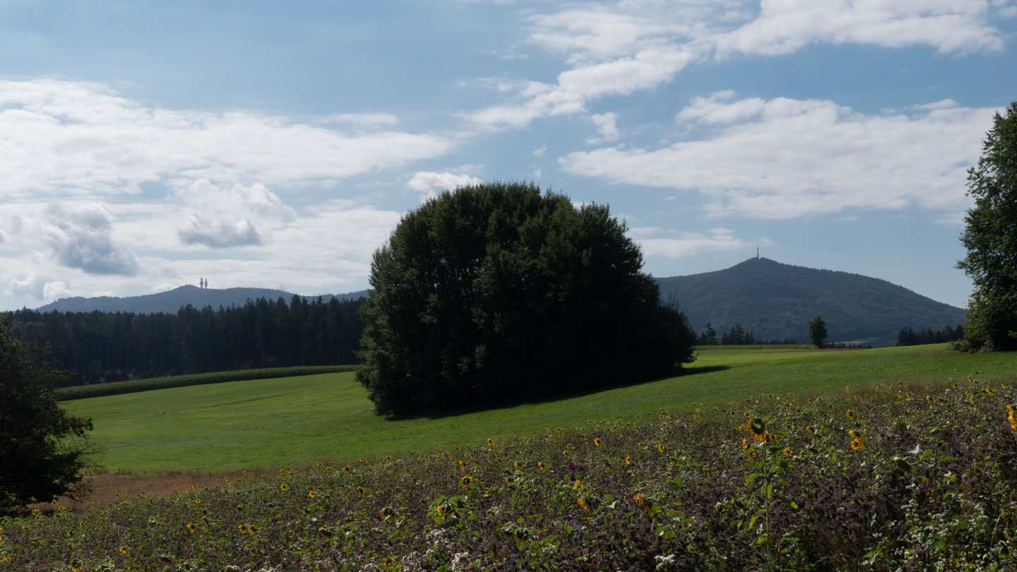 Um es kurz zusammenzufassen: Der Tag war nach dem sechsten Foto unkaputtbar als genial gelaufen. Das war nämlich das erste von gefühlt fünfzig vom Čerchov. Ich hätte locker eine eigene Čerchovgalerie in diesen Bericht stellen können, aber das wäre bei aller Liebe zu diesem tollen Berg ein bisserl langweilig gewesen. Denn der Drachensee bietet neben seinen Naturschönheiten noch wunderbare Blicke auf diverse andere Bergprominenz, insbesondere den Osser und den Hohen Bogen. Aber auch Arber und Gibacht können bewundert werden, da habe ich den Dieberg jetzt gar nicht genannt, obwohl er den Blick vom Südwestufer total dominiert. Nachgeholt. Überhaupt ist des Südwestufer um einiges aussichtsreicher als die andere Seite, dafür ist dort die Pflanzenwelt etwas vielfältiger. Etwas oberhalb von Kleinaign gibt es auch einen Aussichtsturm, der zeigt, dass vier Meter Plattformhöhe oft ausreichen, um über den Mais drüberzusehen und die wichtigen Sachen genießen zu können. Das geht natürlich nur, wenn rundherum Äcker sind und kein Holz. Damit wären wir beim zweiten Aussichtsturm des Tages, der Bayernwarte. Er ist hoch genug, um noch über die Bäume hinauszuragen, hat aber das gleiche Handicap wie der Böhmerwaldturm: dreckige Scheiben. Ich kann zwar mit CameraRAW (einem Hilfsprogramm von PhotoShop) da einiges korrigieren, aber es ist um einiges mühsamer als wenn die Scheiben sauber oder gar nichtexistent wären. Ist aber so wie es ist, also lasse ich es bei dieser Bemerkung. Der Weg hinauf ist um einiges weniger anstrengend als erwartet, aber auch wenig spektakulär. Ausnahmen sind eigentlicher die Überquerung des Tunnelportals unserer geliebten Bahnstrecke von Schwandorf nach Pilsen und die Kapelle ein paar Meter oberhalb. Die Bergwachthütte am Nordhang ist hübsch, das Denkmal davor angemessen, aber leider nur unregelmäßig geöffnet. War aber egal, weil ich ja die Brauereiwirtschaft testen wollte.