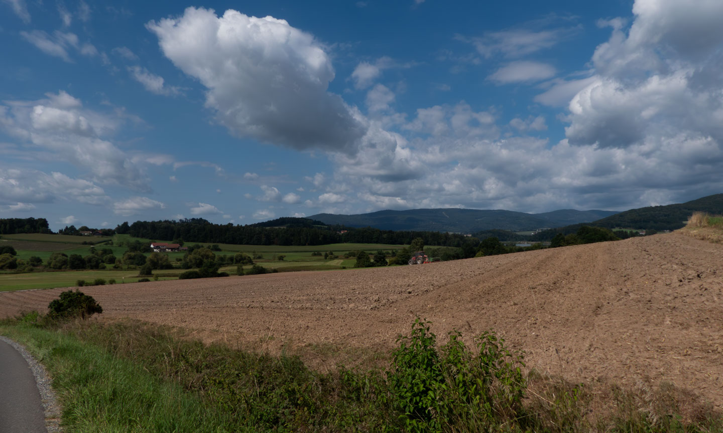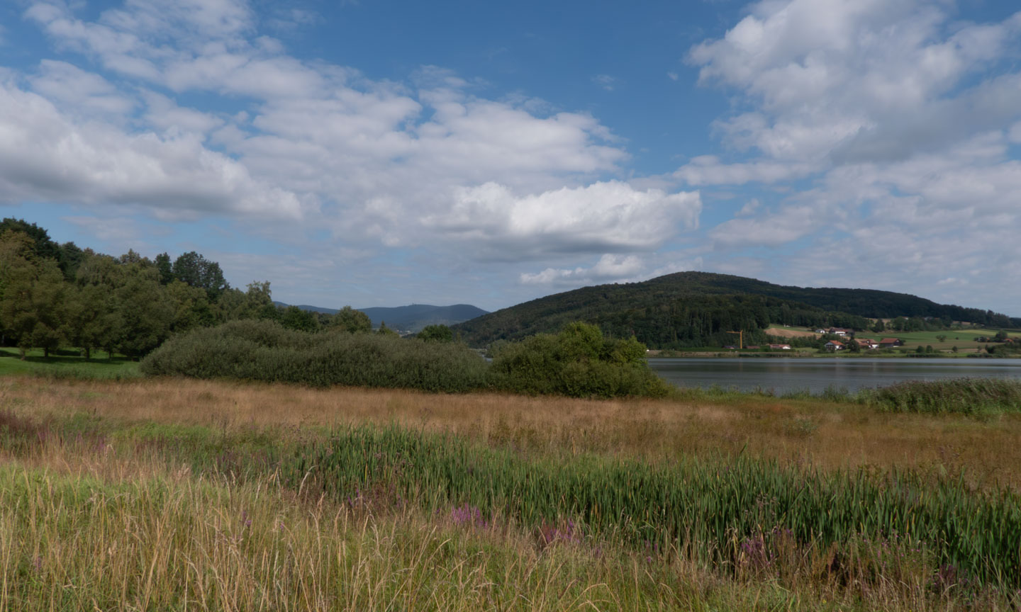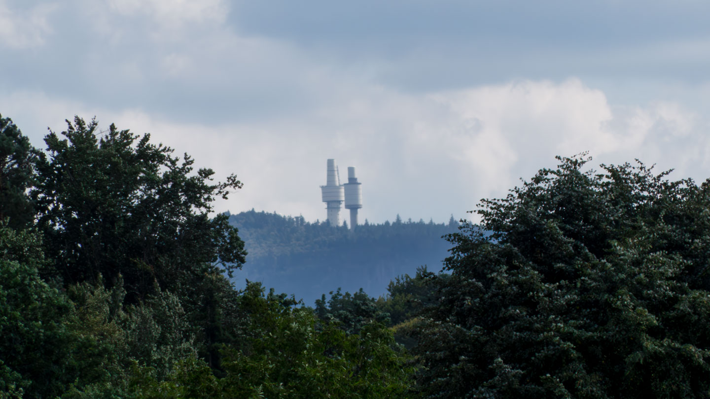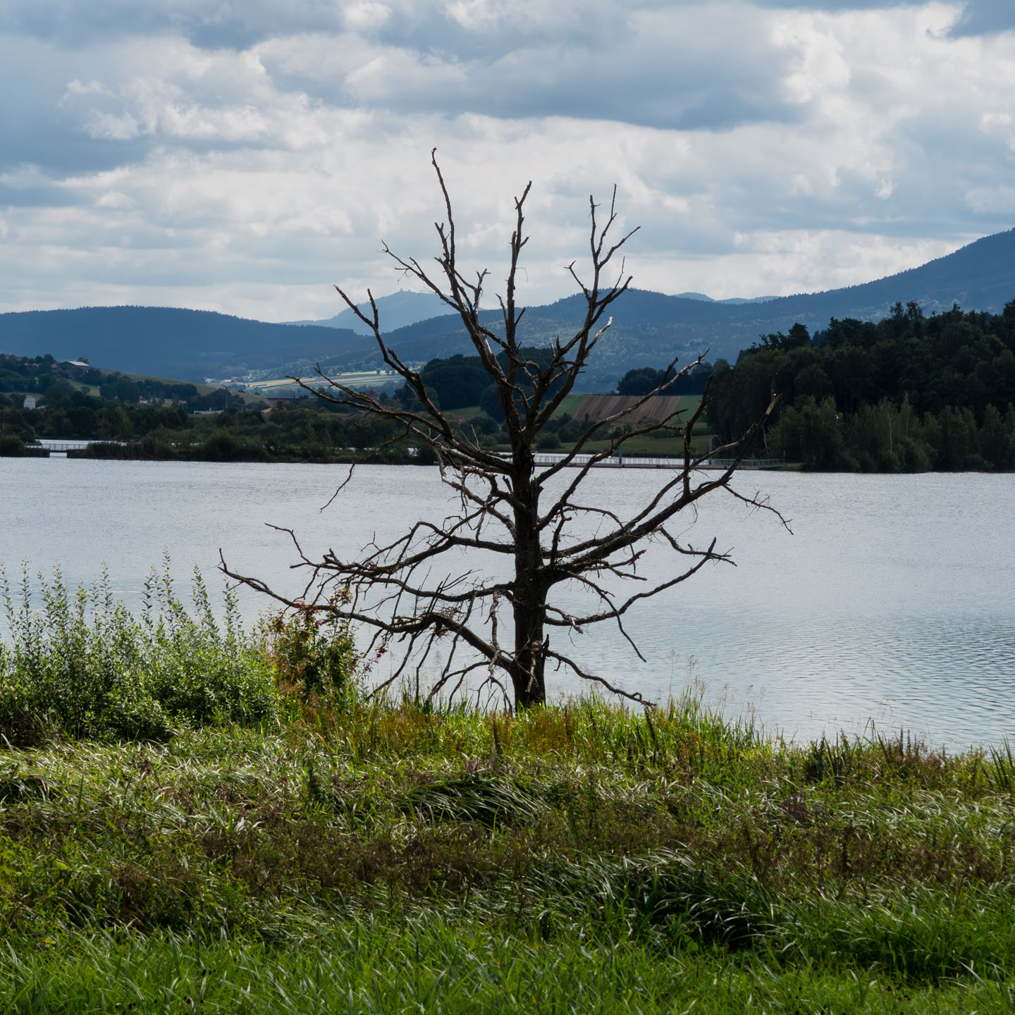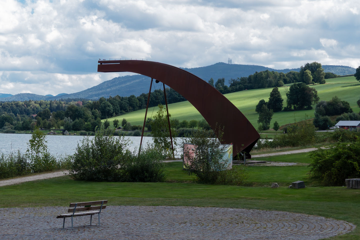 Um es kurz zusammenzufassen: Der Tag war nach dem sechsten Foto unkaputtbar als genial gelaufen. Das war nämlich das erste von gefühlt fünfzig vom Čerchov. Ich hätte locker eine eigene Čerchovgalerie in diesen Bericht stellen können, aber das wäre bei aller Liebe zu diesem tollen Berg ein bisserl langweilig gewesen. Denn der Drachensee bietet neben seinen Naturschönheiten noch wunderbare Blicke auf diverse andere Bergprominenz, insbesondere den Osser und den Hohen Bogen. Aber auch Arber und Gibacht können bewundert werden, da habe ich den Dieberg jetzt gar nicht genannt, obwohl er den Blick vom Südwestufer total dominiert. Nachgeholt. Überhaupt ist des Südwestufer um einiges aussichtsreicher als die andere Seite, dafür ist dort die Pflanzenwelt etwas vielfältiger. Etwas oberhalb von Kleinaign gibt es auch einen Aussichtsturm, der zeigt, dass vier Meter Plattformhöhe oft ausreichen, um über den Mais drüberzusehen und die wichtigen Sachen genießen zu können. Das geht natürlich nur, wenn rundherum Äcker sind und kein Holz. Damit wären wir beim zweiten Aussichtsturm des Tages, der Bayernwarte. Er ist hoch genug, um noch über die Bäume hinauszuragen, hat aber das gleiche Handicap wie der Böhmerwaldturm: dreckige Scheiben. Ich kann zwar mit CameraRAW (einem Hilfsprogramm von PhotoShop) da einiges korrigieren, aber es ist um einiges mühsamer als wenn die Scheiben sauber oder gar nichtexistent wären. Ist aber so wie es ist, also lasse ich es bei dieser Bemerkung. Der Weg hinauf ist um einiges weniger anstrengend als erwartet, aber auch wenig spektakulär. Ausnahmen sind eigentlicher die Überquerung des Tunnelportals unserer geliebten Bahnstrecke von Schwandorf nach Pilsen und die Kapelle ein paar Meter oberhalb. Die Bergwachthütte am Nordhang ist hübsch, das Denkmal davor angemessen, aber leider nur unregelmäßig geöffnet. War aber egal, weil ich ja die Brauereiwirtschaft testen wollte.