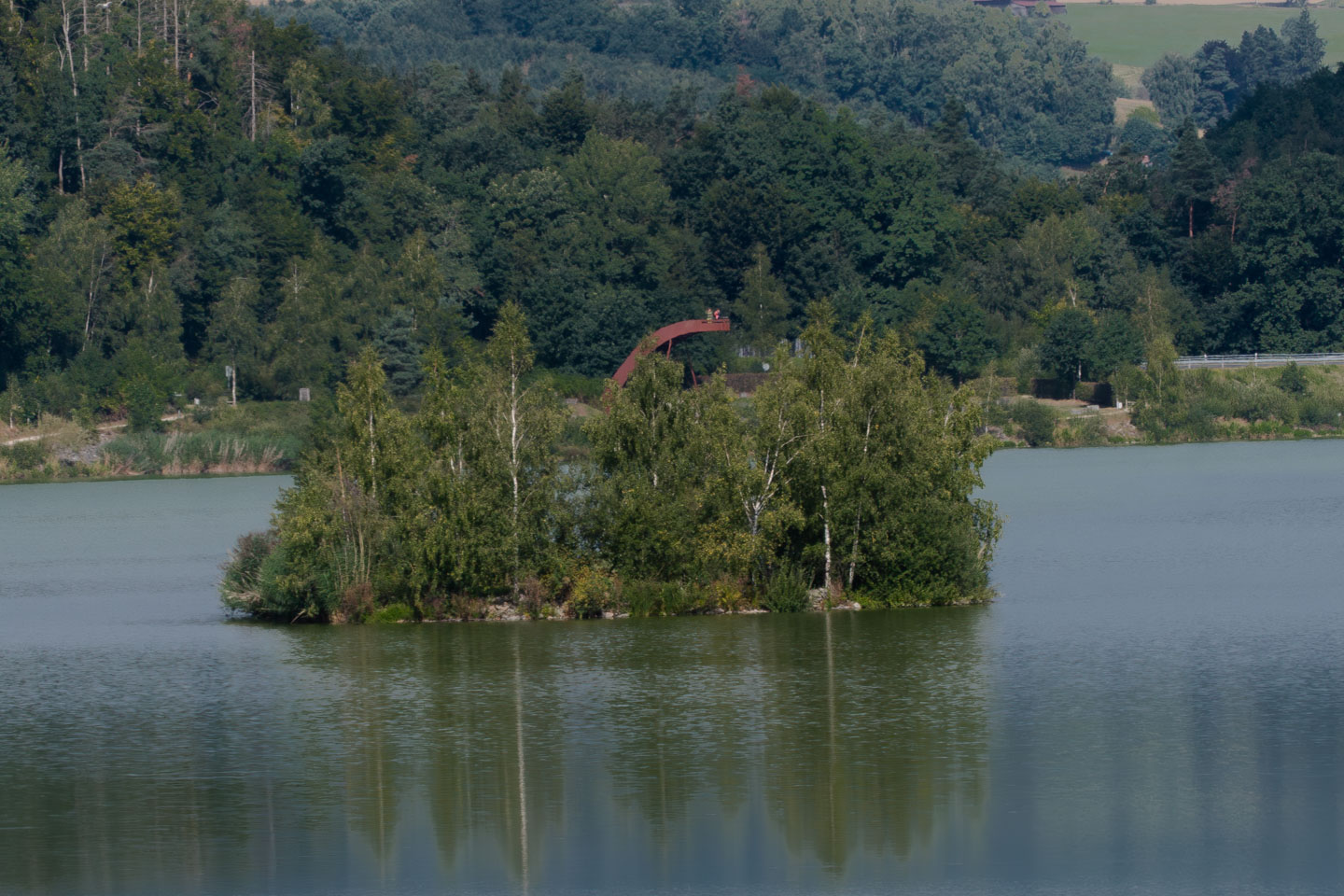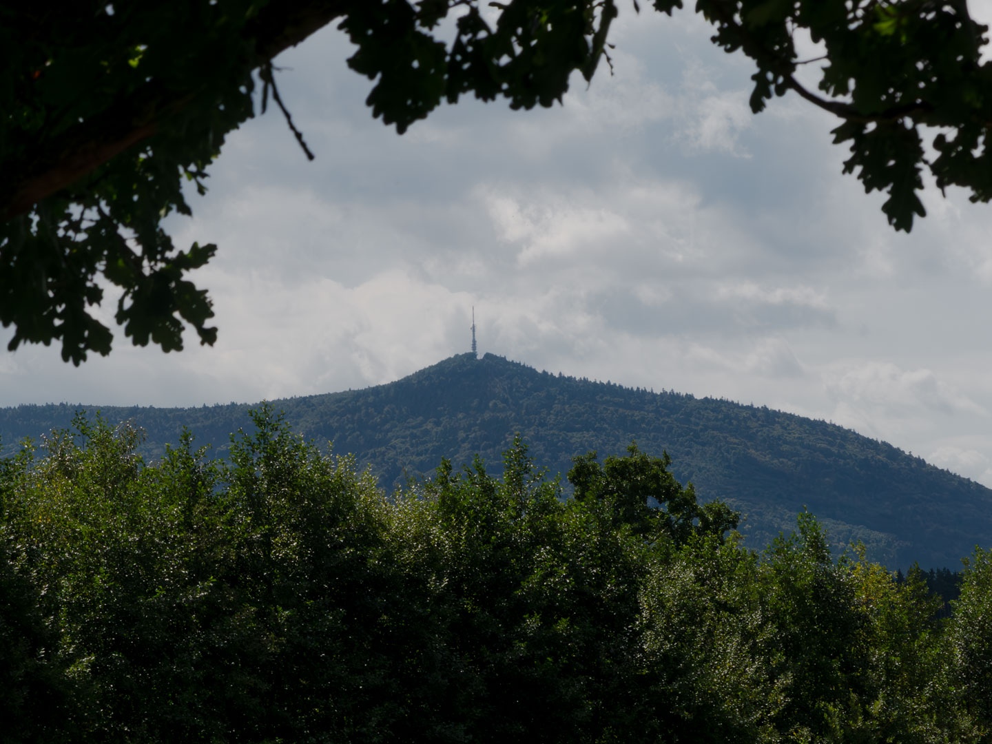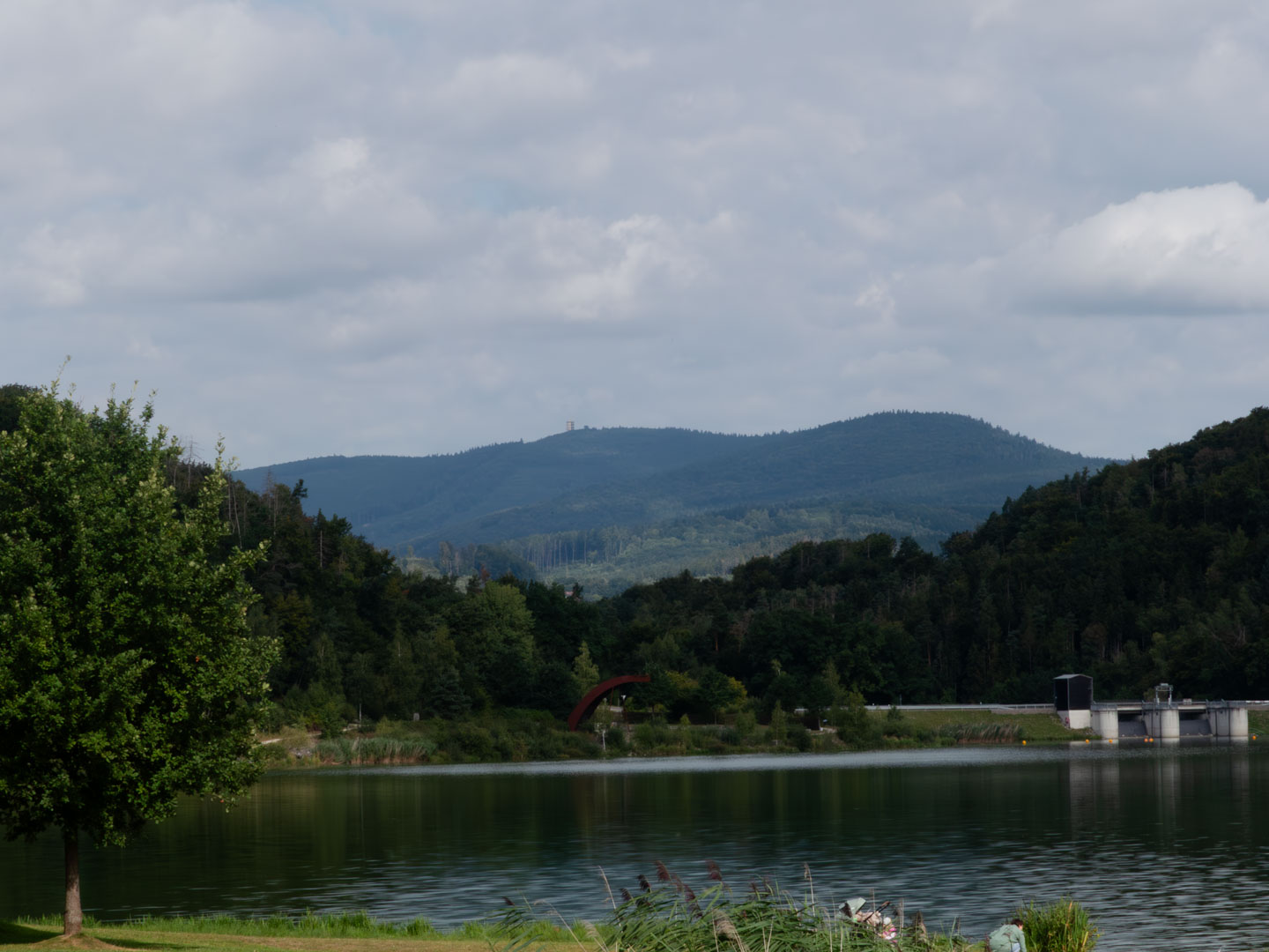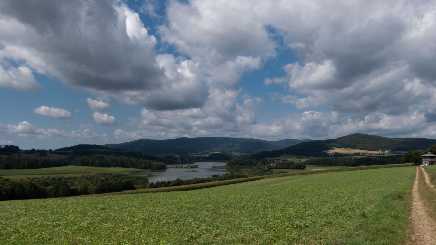 Um es kurz zusammenzufassen: Der Tag war nach dem sechsten Foto unkaputtbar als genial gelaufen. Das war nämlich das erste von gefühlt fünfzig vom Čerchov. Ich hätte locker eine eigene Čerchovgalerie in diesen Bericht stellen können, aber das wäre bei aller Liebe zu diesem tollen Berg ein bisserl langweilig gewesen. Denn der Drachensee bietet neben seinen Naturschönheiten noch wunderbare Blicke auf diverse andere Bergprominenz, insbesondere den Osser und den Hohen Bogen. Aber auch Arber und Gibacht können bewundert werden, da habe ich den Dieberg jetzt gar nicht genannt, obwohl er den Blick vom Südwestufer total dominiert. Nachgeholt. Überhaupt ist des Südwestufer um einiges aussichtsreicher als die andere Seite, dafür ist dort die Pflanzenwelt etwas vielfältiger. Etwas oberhalb von Kleinaign gibt es auch einen Aussichtsturm, der zeigt, dass vier Meter Plattformhöhe oft ausreichen, um über den Mais drüberzusehen und die wichtigen Sachen genießen zu können. Das geht natürlich nur, wenn rundherum Äcker sind und kein Holz. Damit wären wir beim zweiten Aussichtsturm des Tages, der Bayernwarte. Er ist hoch genug, um noch über die Bäume hinauszuragen, hat aber das gleiche Handicap wie der Böhmerwaldturm: dreckige Scheiben. Ich kann zwar mit CameraRAW (einem Hilfsprogramm von PhotoShop) da einiges korrigieren, aber es ist um einiges mühsamer als wenn die Scheiben sauber oder gar nichtexistent wären. Ist aber so wie es ist, also lasse ich es bei dieser Bemerkung. Der Weg hinauf ist um einiges weniger anstrengend als erwartet, aber auch wenig spektakulär. Ausnahmen sind eigentlicher die Überquerung des Tunnelportals unserer geliebten Bahnstrecke von Schwandorf nach Pilsen und die Kapelle ein paar Meter oberhalb. Die Bergwachthütte am Nordhang ist hübsch, das Denkmal davor angemessen, aber leider nur unregelmäßig geöffnet. War aber egal, weil ich ja die Brauereiwirtschaft testen wollte.