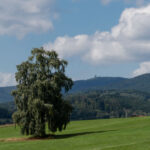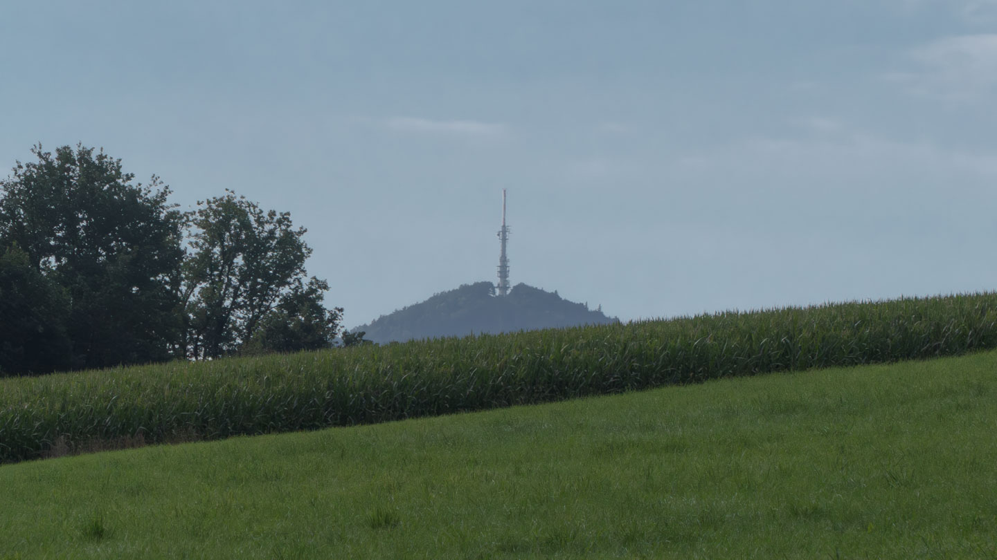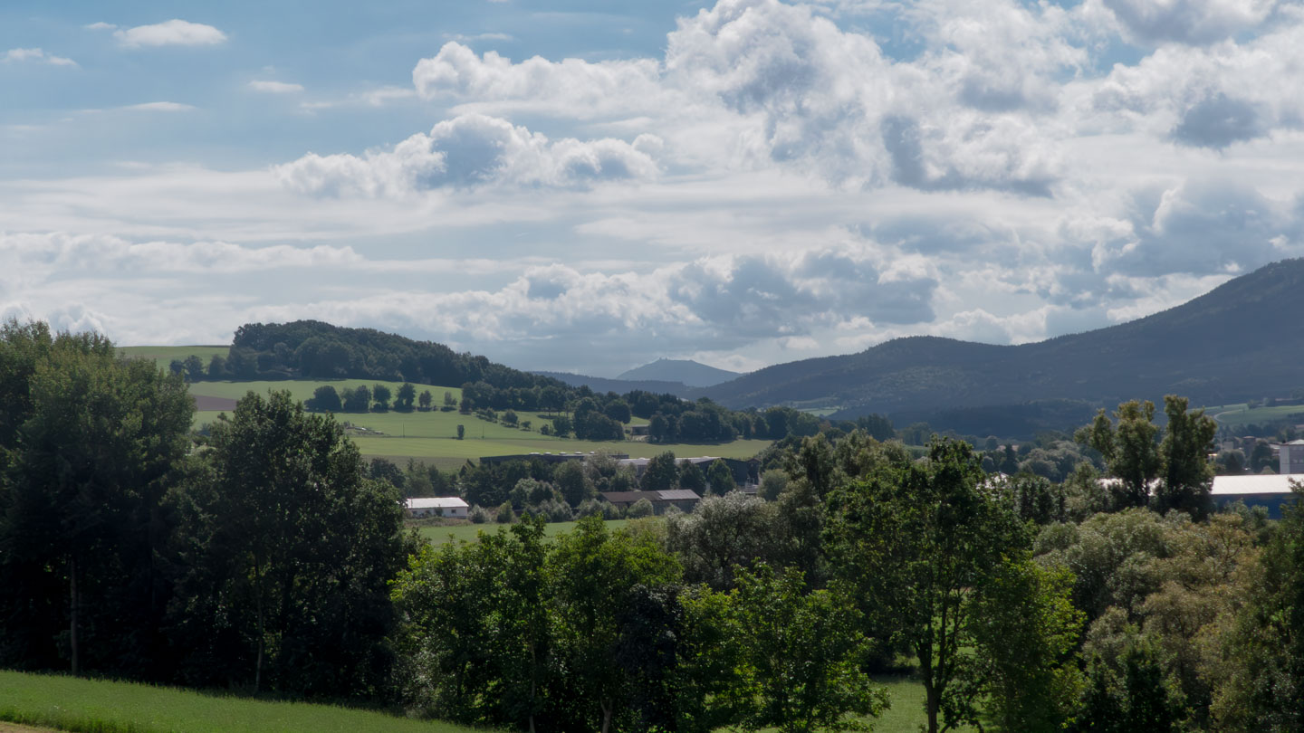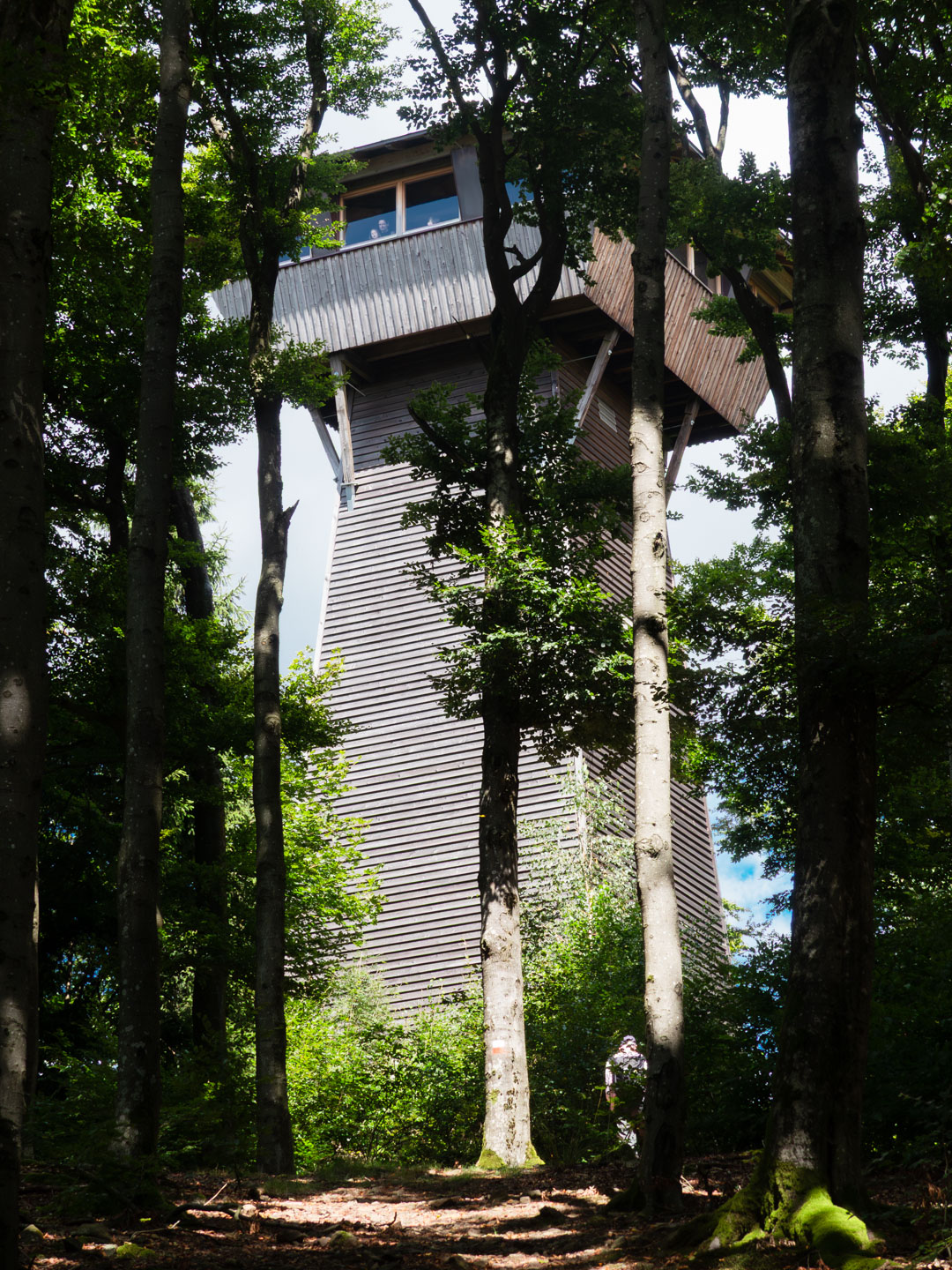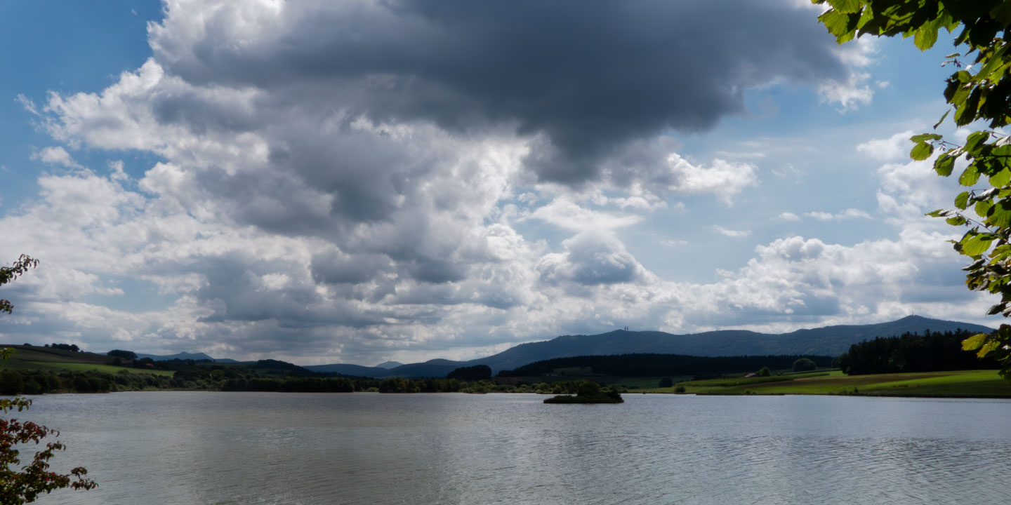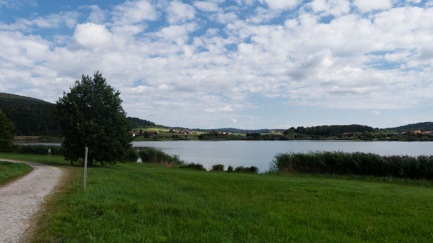 Um es kurz zusammenzufassen: Der Tag war nach dem sechsten Foto unkaputtbar als genial gelaufen. Das war nämlich das erste von gefühlt fünfzig vom Čerchov. Ich hätte locker eine eigene Čerchovgalerie in diesen Bericht stellen können, aber das wäre bei aller Liebe zu diesem tollen Berg ein bisserl langweilig gewesen. Denn der Drachensee bietet neben seinen Naturschönheiten noch wunderbare Blicke auf diverse andere Bergprominenz, insbesondere den Osser und den Hohen Bogen. Aber auch Arber und Gibacht können bewundert werden, da habe ich den Dieberg jetzt gar nicht genannt, obwohl er den Blick vom Südwestufer total dominiert. Nachgeholt. Überhaupt ist des Südwestufer um einiges aussichtsreicher als die andere Seite, dafür ist dort die Pflanzenwelt etwas vielfältiger. Etwas oberhalb von Kleinaign gibt es auch einen Aussichtsturm, der zeigt, dass vier Meter Plattformhöhe oft ausreichen, um über den Mais drüberzusehen und die wichtigen Sachen genießen zu können. Das geht natürlich nur, wenn rundherum Äcker sind und kein Holz. Damit wären wir beim zweiten Aussichtsturm des Tages, der Bayernwarte. Er ist hoch genug, um noch über die Bäume hinauszuragen, hat aber das gleiche Handicap wie der Böhmerwaldturm: dreckige Scheiben. Ich kann zwar mit CameraRAW (einem Hilfsprogramm von PhotoShop) da einiges korrigieren, aber es ist um einiges mühsamer als wenn die Scheiben sauber oder gar nichtexistent wären. Ist aber so wie es ist, also lasse ich es bei dieser Bemerkung. Der Weg hinauf ist um einiges weniger anstrengend als erwartet, aber auch wenig spektakulär. Ausnahmen sind eigentlicher die Überquerung des Tunnelportals unserer geliebten Bahnstrecke von Schwandorf nach Pilsen und die Kapelle ein paar Meter oberhalb. Die Bergwachthütte am Nordhang ist hübsch, das Denkmal davor angemessen, aber leider nur unregelmäßig geöffnet. War aber egal, weil ich ja die Brauereiwirtschaft testen wollte.