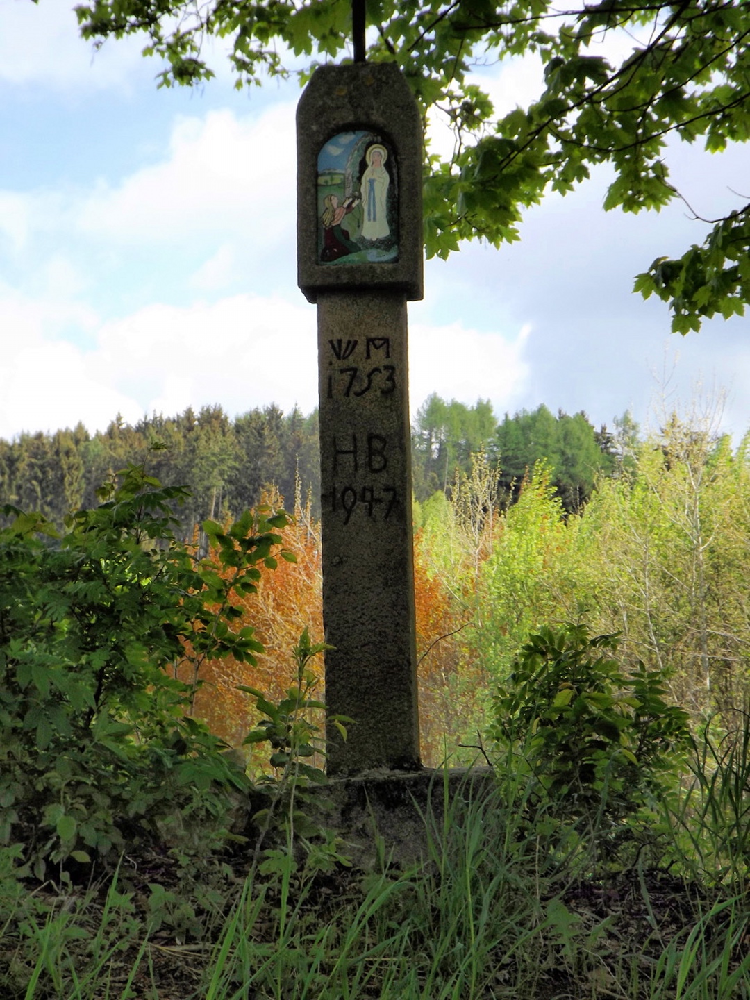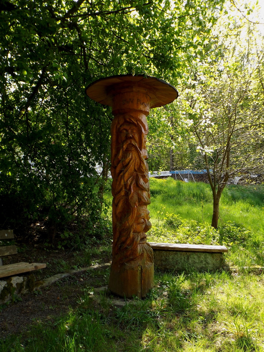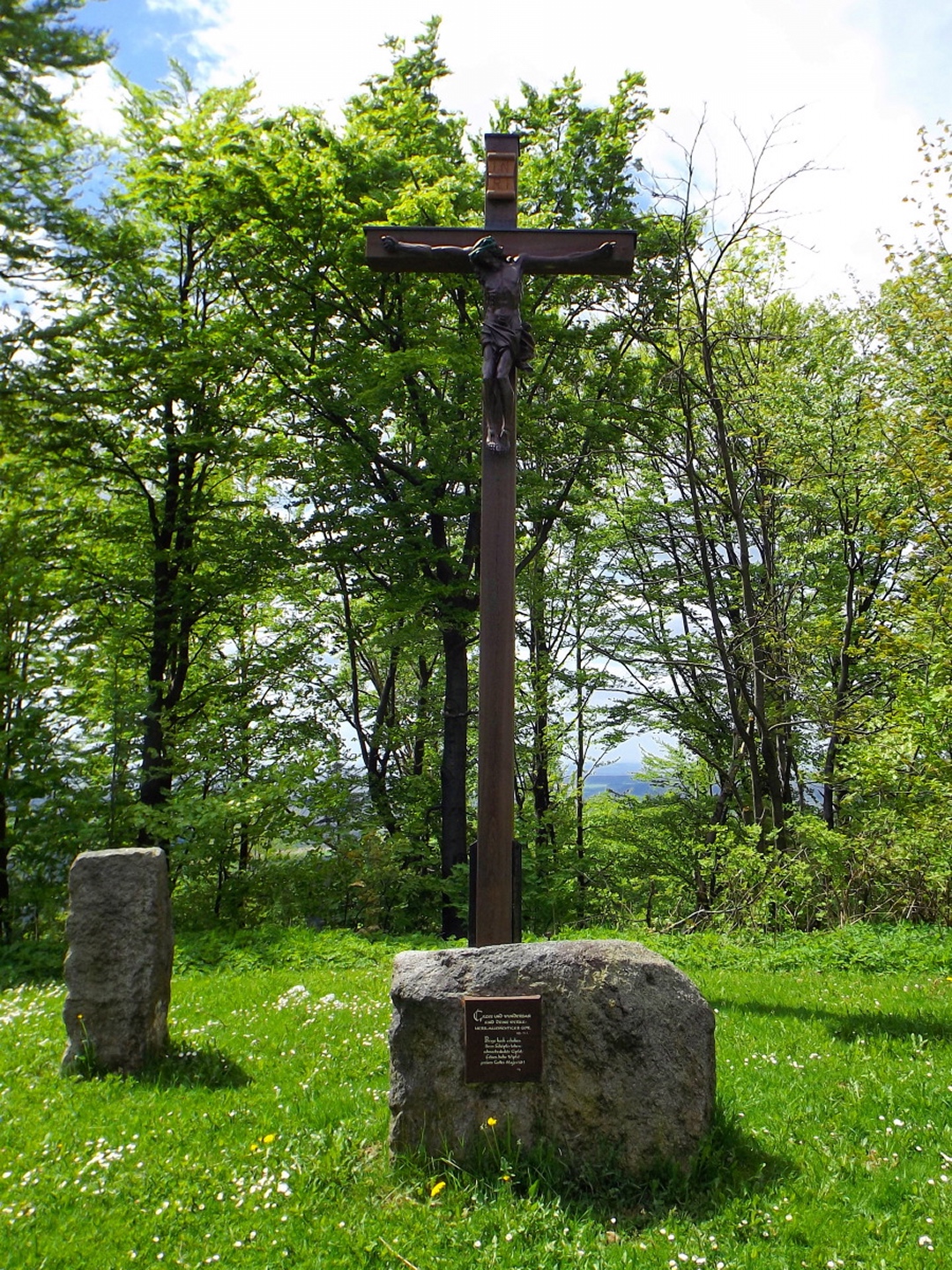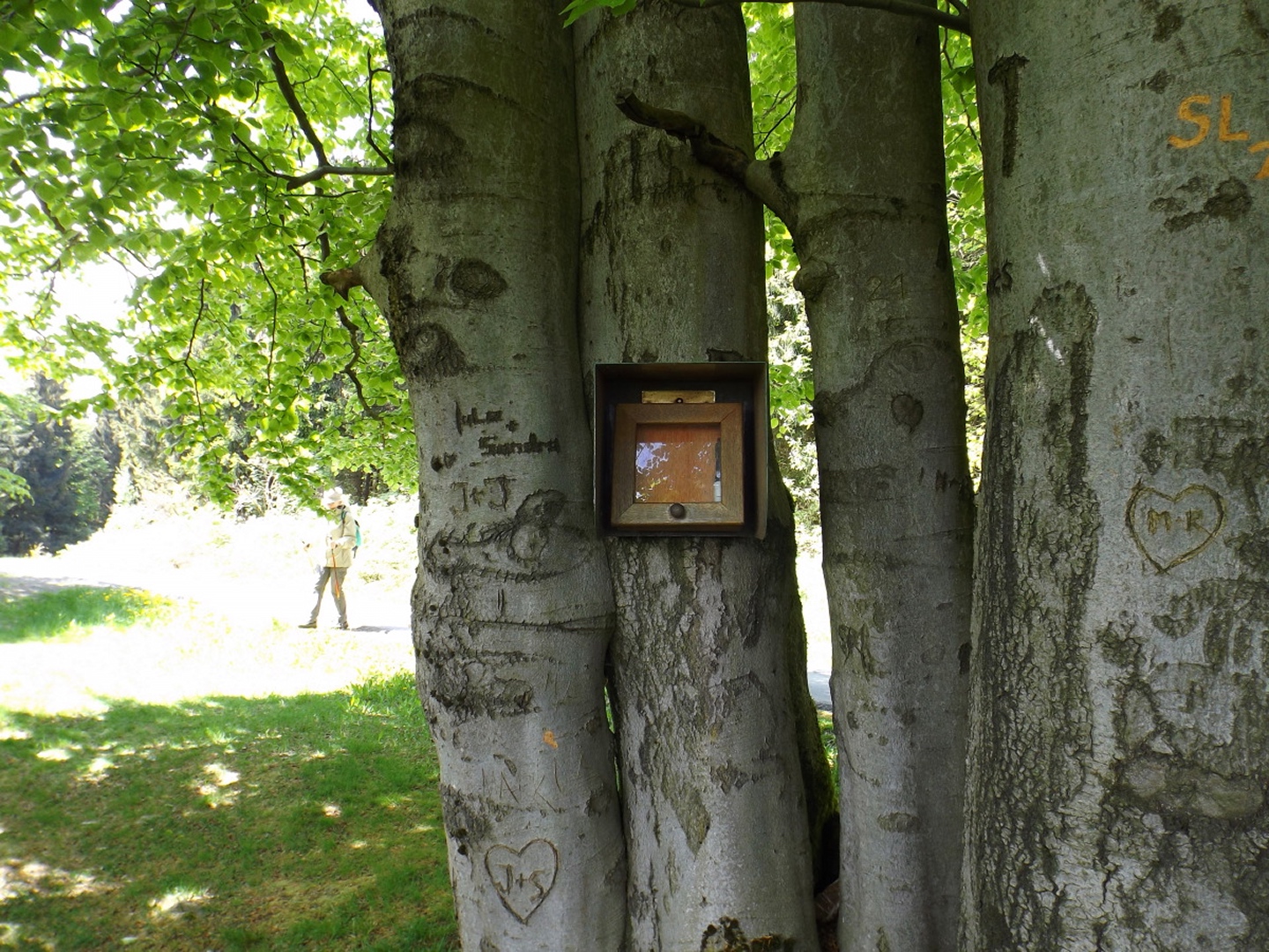 Vom Schwimmbadparkplatz aus überquerten wir gleich einmal die Straße und begannen mit dem Bildungselement der Wanderung, das so ganz nebenbei auch gleich den ersten Gipfel des Tages beinhaltete. Die Rede ist vom Pleysteinpfad, einem nicht nur geologischen Erlebnis- und Lehrpfad, der rund um und über den Hügel Gsteinach führt. Dessen Gipfel (zumindest interpretiere ich den Eintrag so) ist in der Liste der Naturdenkmäler als durchaus bedeutend gekennzeichnet. Aber der Lehrpfad hat einiges mehr zu bieten, wie zum Beispiel ein Baumtelefon, eine Lauschecke und eine Holzharfe. Von der Nordseite aus konnten wir auch einen ersten Blick auf das Tagesziel ergattern, bevor wir bei einem Gebäudekomplex, der Schule oder Schullandheim sein könnte, aber leer aussieht, wieder herunter kamen und Richtung Waldthurn abbogen. Nach etwa 500 Metern auf Asphalt kommt ein Sperrschild, welches sich selbst widerspricht, und der Übergang zur Schotterstraße. Dieser folgten wir auf der Markierung Blaues Dreieck vorbei an mehreren Abzweigungen und mindestens einer Teichanlage, bis wir kurz nach einem Baum mit Gedenktaferl rechts abbogen und einer roten Markierung folgten. Bei einem Marterl, das an einen Ochsenkarrenunfall im Jahre 1860 erinnert, verließen wir den markierten Weg und starteten den Abenteuerteil. Ich hatte die Runde im Bayernatlas vorgeplant und festgestellt, dass zwischen zwei Forstwegen ein kleiner wegloser Abschnitt im Wald überwunden werden muss, um keinen relativ uninteressanten Umweg gehen zu müssen. In der Realität erwies sich dieser kleine Abschnitt als eingezäuntes Wasserschutzgebiet. Der Weg, auf dem wir ankamen, führte zwar zu einem lediglich per Lasche abgeschlossenen und nicht versperrten Tor, uns wurde aber gleich nach zehn Metern nach einem Blick auf mein Garmin klar, dass das nicht der gewünschte Weg war. War aber im Endeffekt auch kein Problem, weil ich beim Verlassen des Geländes den richtigen Weg entdeckte: Einfach am Zaun entlang nach Norden und oben am Eck nach Osten, und schwuppdiwupp zeigte sich die Schotterstraße, die ich anvisiert hatte. Auf dieser gingen wir mit einigen schönen Aussichtsstellen nach Westen, unter anderem zum Monte Kaolino, zur Verbindungsstraße von Waldthurn nach Bibershof, auf dieser 50 Meter Richtung Waldthurn und waren am Einstieg zum Kreuzweg angelangt. Das Besondere an diesem Kreuzweg ist, dass die Stationen nicht einheitlich sind, sondern in mindestens drei verschiedenen Stilen errichtet wurden. So wurde uns dabei nicht langweilig und wir kamen kurz nach halb eins oben am Fahrenberg an. Hier hatte ich eigentlich eine Besichtigung der Wallfahrtskirche geplant, die aber leider ausfallen musste, weil die Kirche 2015 innenrenoviert wird und deshalb geschlossen ist. Hätte ich früher als Samstagabend auf die Internetseite der Pfarrei Waldthurn geschaut, hätte ich wohl ein anderes Ziel gewählt. Habe ich aber nicht, also beschränkten wir uns auf ein Getränk auf der Terrasse des Berggasthofes Weig und einen kurzen Blick in die Dreifaltigkeitskapelle. Den höchsten Punkt auf dem Wasserspeicherbunker bestieg ich alleine und ließ mich dabei von Christa fotografieren, das Bild ist aber nur in der Galerie des OWV zu bewundern. Anschließend ging es „schnell“ weiter zum Abstiegsweg, ein Auge immer auf dem Garmin, da ich mich nicht an einen Abzweig zum zweiten Naturdenkmal der Runde, dem Feneis(en)stein erinnern konnte. Der Grund hierfür ist, dass es dorthin keinen markierten Weg gibt, obwohl im Bayernatlas ein Pfad eingezeichnet ist. Dieser ist sehr undeutlich und nur zu finden, wenn man weiß, wo man suchen muss. Der Feneis(en)stein selbst ist eher unscheinbar, man könnte auch auf den Abstecher verzichten, aber ich hatte Erwin ziemlich bezüglich Infomaterial dazu genervt, also gingen wir hin, Peter testete die Festigkeit und Tragfähigkeit des Gesteins und ich erzählte der Gruppe ein bisserl davon. Währenddessen lieh sich Winfried meine Kamera aus und fotografierte Peter und mich auf dem Felsen, während die Damen zuhörten. Bald waren wir fertig, gingen zurück zum Abstiegsweg und verließen an der bereits erwähnten Straße sowohl den Wanderweg nach Pleystein als auch die Route, die ich mit Coco gegangen war, indem wir links abbogen. Es dauerte nicht lange, bis wir unvermittelt an einer Gruppe von mindestens 15 miteinander verwachsenen Buchen vorbei kamen, auf deren Rückseite ein Rastbankerl mit Infotischerl zur herrlichen Aussicht und eine mit Baumbuch gefüllten Schatulle zu finden sind. Wir waren nicht auf der Flucht und uns von Anfang an einig, dass es nicht um Rekordzeiten ging, also genossen wir die Aussicht bis zum Čerchov und ganz rechts ganz schemenhaft zum St. Englmarer Predigtstuhl und der Elisabethszeller Hadriwa und trugen uns auch brav ins Buch ein. Auf dem Weiterweg stießen wir bald auf den Oberpfalzweg, der links vom Berg herunterkam und nach rechts weiterging und gingen auf ihm nach rechts weiter. Auf ihm blieben wir bis zum Ortsende von Pfifferlingstiel, wobei dazwischen schon einige Abzweige, Untergrundänderungen und leider auch kleine Sumpfgebiete liegen. An diesem Ortsende hätten wir geradeaus weitergehen und etwa einen halben Kilometer abkürzen können, nach Konsultation mit einem entgegenkommenden Wandererpaar entschieden wir uns aber dafür, links abzubiegen und etwas mehr vom Zottbachtal zu haben. Unten angekommen, stießen wir auf den Hinweis, dass der Glasschleifer(er)weg derzeit gesperrt sei. Da es bachabwärts Richtung Pleystein bis auf ein paar Brandspuren an hangabwärts gelegenen Baumstumpfen ganz ok aussah, ignorierten wir den Hinweis und machten uns auf den letzten Abschnitt des heutigen Ausfluges, die Flusswanderung. Zunächst durften wir drei oder vier Furten im Wald queren und uns über Christa und Winfried auf einem Rastbankerl amüsieren, später, als der Weg, der übrigens wie der Oberpfalzweg vom OWV markiert wird (herzlichen Dank an Erwin für den Hinweis), den Talboden und (fast) da
