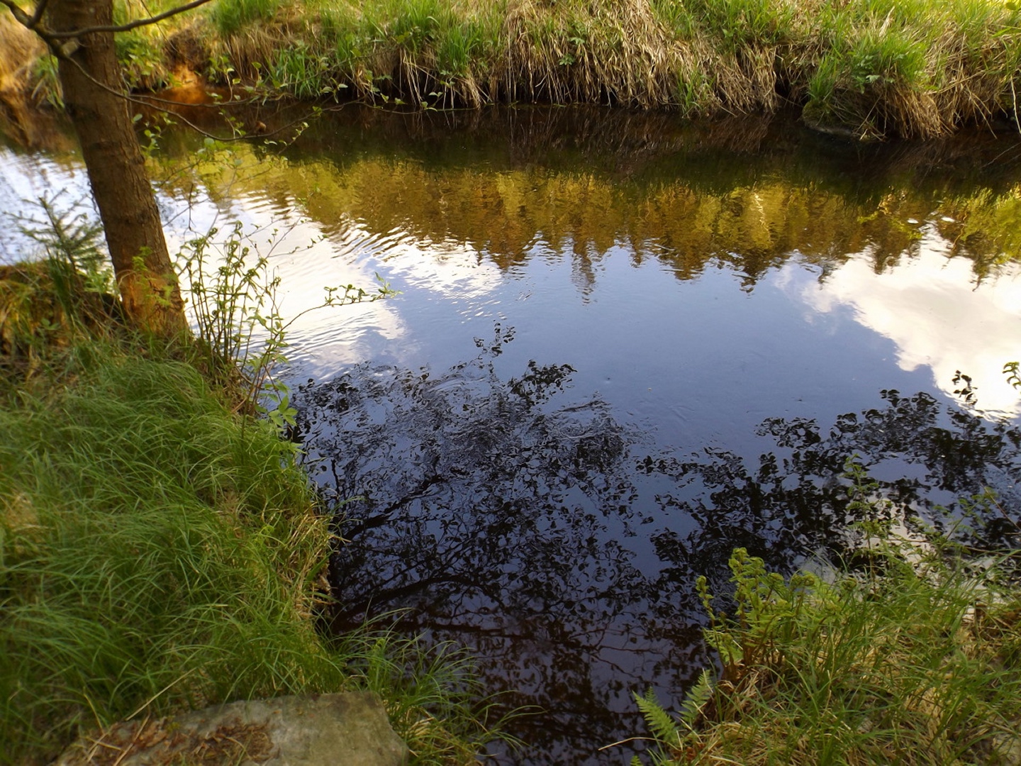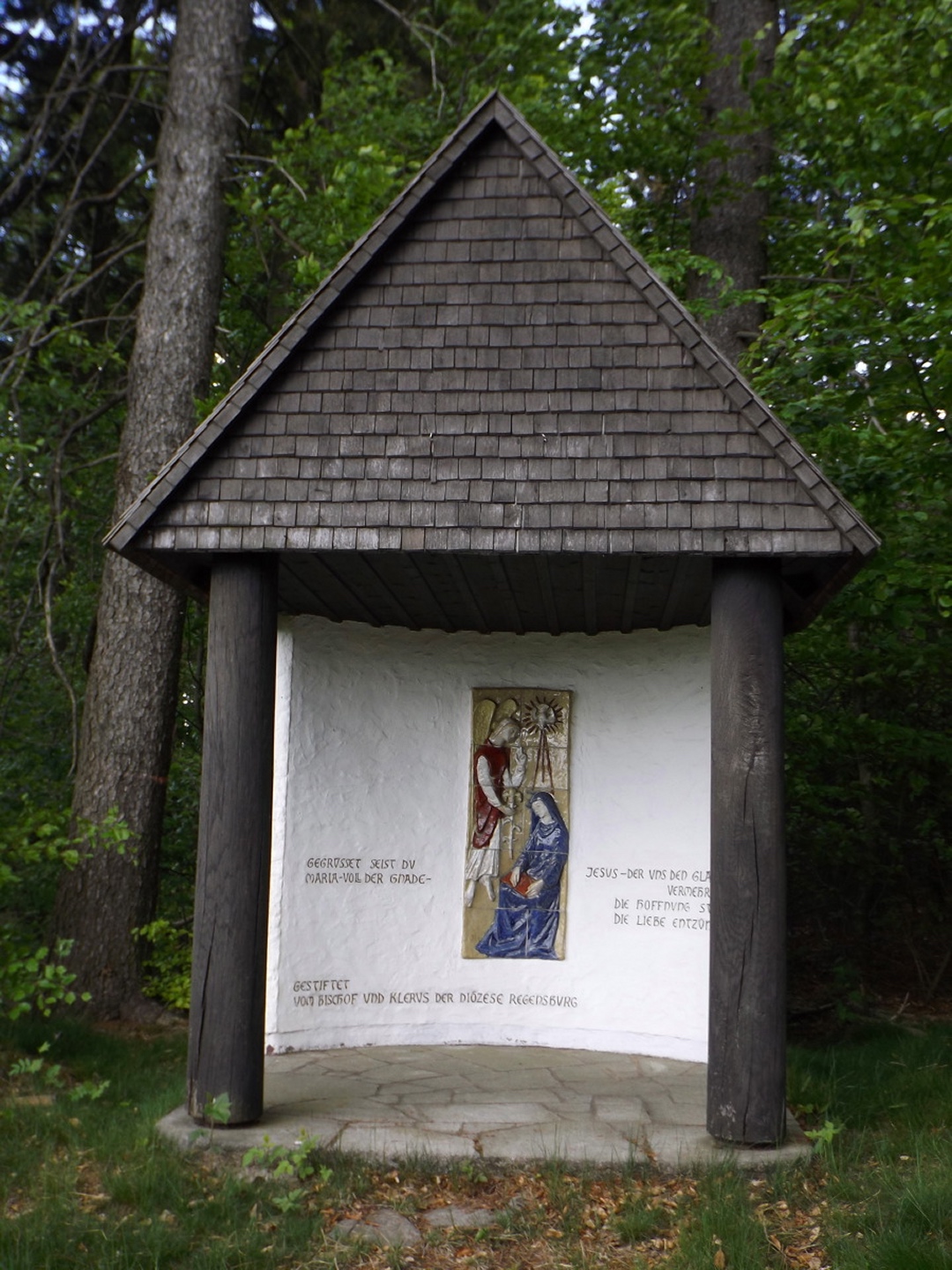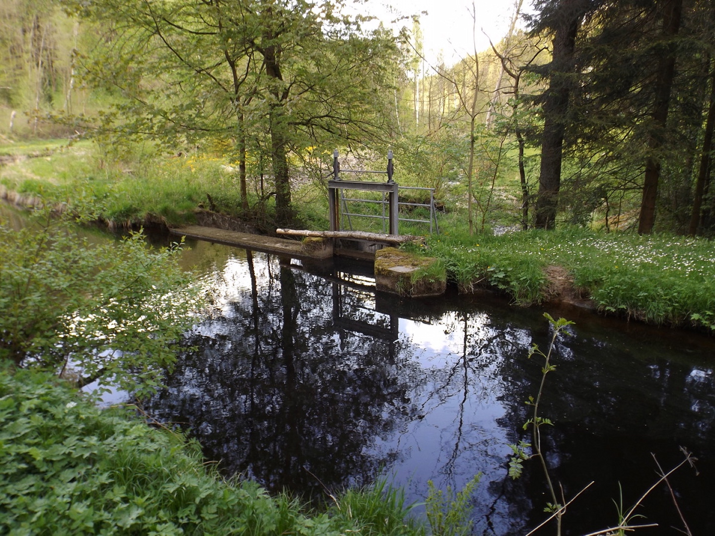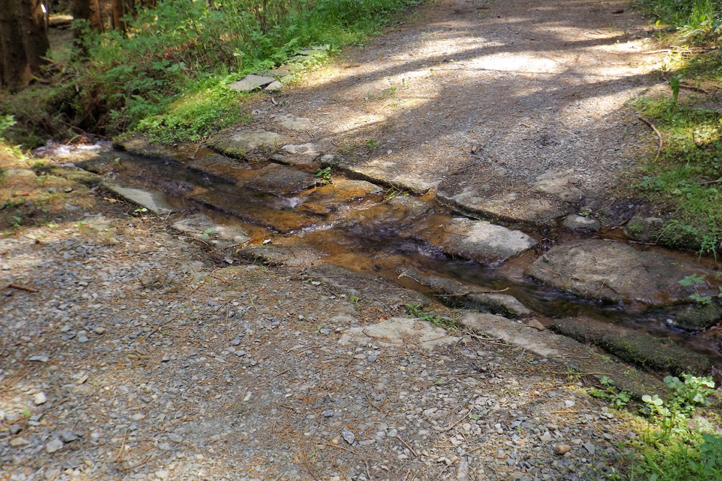 Vom Schwimmbadparkplatz aus überquerten wir gleich einmal die Straße und begannen mit dem Bildungselement der Wanderung, das so ganz nebenbei auch gleich den ersten Gipfel des Tages beinhaltete. Die Rede ist vom Pleysteinpfad, einem nicht nur geologischen Erlebnis- und Lehrpfad, der rund um und über den Hügel Gsteinach führt. Dessen Gipfel (zumindest interpretiere ich den Eintrag so) ist in der Liste der Naturdenkmäler als durchaus bedeutend gekennzeichnet. Aber der Lehrpfad hat einiges mehr zu bieten, wie zum Beispiel ein Baumtelefon, eine Lauschecke und eine Holzharfe. Von der Nordseite aus konnten wir auch einen ersten Blick auf das Tagesziel ergattern, bevor wir bei einem Gebäudekomplex, der Schule oder Schullandheim sein könnte, aber leer aussieht, wieder herunter kamen und Richtung Waldthurn abbogen. Nach etwa 500 Metern auf Asphalt kommt ein Sperrschild, welches sich selbst widerspricht, und der Übergang zur Schotterstraße. Dieser folgten wir auf der Markierung Blaues Dreieck vorbei an mehreren Abzweigungen und mindestens einer Teichanlage, bis wir kurz nach einem Baum mit Gedenktaferl rechts abbogen und einer roten Markierung folgten. Bei einem Marterl, das an einen Ochsenkarrenunfall im Jahre 1860 erinnert, verließen wir den markierten Weg und starteten den Abenteuerteil. Ich hatte die Runde im Bayernatlas vorgeplant und festgestellt, dass zwischen zwei Forstwegen ein kleiner wegloser Abschnitt im Wald überwunden werden muss, um keinen relativ uninteressanten Umweg gehen zu müssen. In der Realität erwies sich dieser kleine Abschnitt als eingezäuntes Wasserschutzgebiet. Der Weg, auf dem wir ankamen, führte zwar zu einem lediglich per Lasche abgeschlossenen und nicht versperrten Tor, uns wurde aber gleich nach zehn Metern nach einem Blick auf mein Garmin klar, dass das nicht der gewünschte Weg war. War aber im Endeffekt auch kein Problem, weil ich beim Verlassen des Geländes den richtigen Weg entdeckte: Einfach am Zaun entlang nach Norden und oben am Eck nach Osten, und schwuppdiwupp zeigte sich die Schotterstraße, die ich anvisiert hatte. Auf dieser gingen wir mit einigen schönen Aussichtsstellen nach Westen, unter anderem zum Monte Kaolino, zur Verbindungsstraße von Waldthurn nach Bibershof, auf dieser 50 Meter Richtung Waldthurn und waren am Einstieg zum Kreuzweg angelangt. Das Besondere an diesem Kreuzweg ist, dass die Stationen nicht einheitlich sind, sondern in mindestens drei verschiedenen Stilen errichtet wurden. So wurde uns dabei nicht langweilig und wir kamen kurz nach halb eins oben am Fahrenberg an. Hier hatte ich eigentlich eine Besichtigung der Wallfahrtskirche geplant, die aber leider ausfallen musste, weil die Kirche 2015 innenrenoviert wird und deshalb geschlossen ist. Hätte ich früher als Samstagabend auf die Internetseite der Pfarrei Waldthurn geschaut, hätte ich wohl ein anderes Ziel gewählt. Habe ich aber nicht, also beschränkten wir uns auf ein Getränk auf der Terrasse des Berggasthofes Weig und einen kurzen Blick in die Dreifaltigkeitskapelle. Den höchsten Punkt auf dem Wasserspeicherbunker bestieg ich alleine und ließ mich dabei von Christa fotografieren, das Bild ist aber nur in der Galerie des OWV zu bewundern. Anschließend ging es „schnell“ weiter zum Abstiegsweg, ein Auge immer auf dem Garmin, da ich mich nicht an einen Abzweig zum zweiten Naturdenkmal der Runde, dem Feneis(en)stein erinnern konnte. Der Grund hierfür ist, dass es dorthin keinen markierten Weg gibt, obwohl im Bayernatlas ein Pfad eingezeichnet ist. Dieser ist sehr undeutlich und nur zu finden, wenn man weiß, wo man suchen muss. Der Feneis(en)stein selbst ist eher unscheinbar, man könnte auch auf den Abstecher verzichten, aber ich hatte Erwin ziemlich bezüglich Infomaterial dazu genervt, also gingen wir hin, Peter testete die Festigkeit und Tragfähigkeit des Gesteins und ich erzählte der Gruppe ein bisserl davon. Währenddessen lieh sich Winfried meine Kamera aus und fotografierte Peter und mich auf dem Felsen, während die Damen zuhörten. Bald waren wir fertig, gingen zurück zum Abstiegsweg und verließen an der bereits erwähnten Straße sowohl den Wanderweg nach Pleystein als auch die Route, die ich mit Coco gegangen war, indem wir links abbogen. Es dauerte nicht lange, bis wir unvermittelt an einer Gruppe von mindestens 15 miteinander verwachsenen Buchen vorbei kamen, auf deren Rückseite ein Rastbankerl mit Infotischerl zur herrlichen Aussicht und eine mit Baumbuch gefüllten Schatulle zu finden sind. Wir waren nicht auf der Flucht und uns von Anfang an einig, dass es nicht um Rekordzeiten ging, also genossen wir die Aussicht bis zum Čerchov und ganz rechts ganz schemenhaft zum St. Englmarer Predigtstuhl und der Elisabethszeller Hadriwa und trugen uns auch brav ins Buch ein. Auf dem Weiterweg stießen wir bald auf den Oberpfalzweg, der links vom Berg herunterkam und nach rechts weiterging und gingen auf ihm nach rechts weiter. Auf ihm blieben wir bis zum Ortsende von Pfifferlingstiel, wobei dazwischen schon einige Abzweige, Untergrundänderungen und leider auch kleine Sumpfgebiete liegen. An diesem Ortsende hätten wir geradeaus weitergehen und etwa einen halben Kilometer abkürzen können, nach Konsultation mit einem entgegenkommenden Wandererpaar entschieden wir uns aber dafür, links abzubiegen und etwas mehr vom Zottbachtal zu haben. Unten angekommen, stießen wir auf den Hinweis, dass der Glasschleifer(er)weg derzeit gesperrt sei. Da es bachabwärts Richtung Pleystein bis auf ein paar Brandspuren an hangabwärts gelegenen Baumstumpfen ganz ok aussah, ignorierten wir den Hinweis und machten uns auf den letzten Abschnitt des heutigen Ausfluges, die Flusswanderung. Zunächst durften wir drei oder vier Furten im Wald queren und uns über Christa und Winfried auf einem Rastbankerl amüsieren, später, als der Weg, der übrigens wie der Oberpfalzweg vom OWV markiert wird (herzlichen Dank an Erwin für den Hinweis), den Talboden und (fast) da